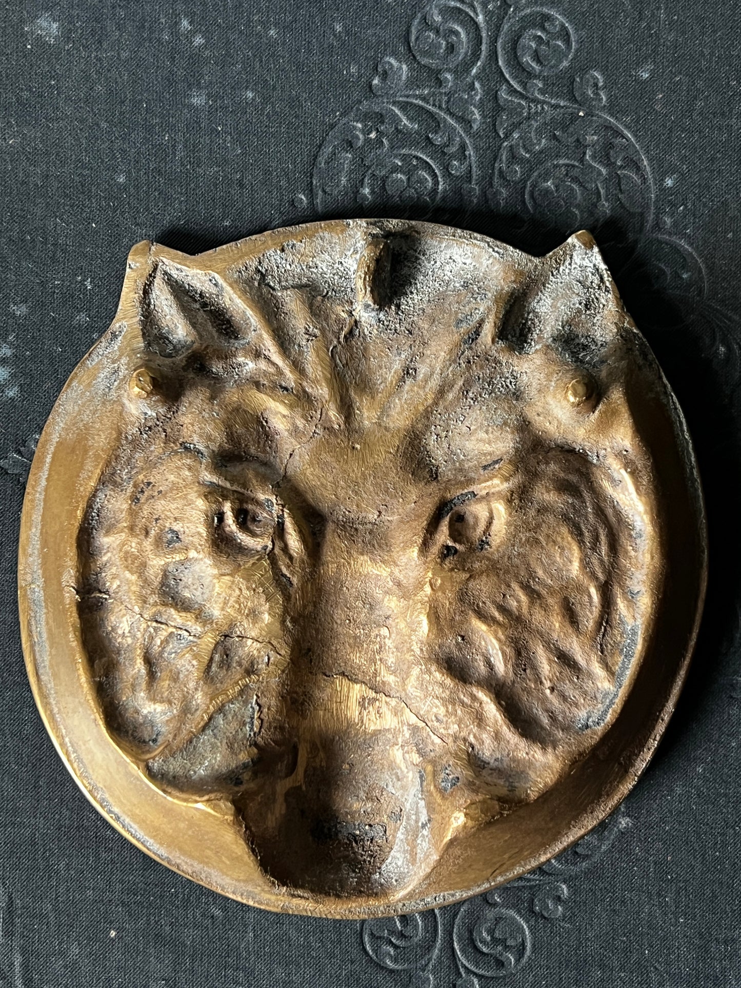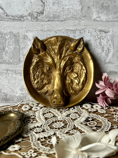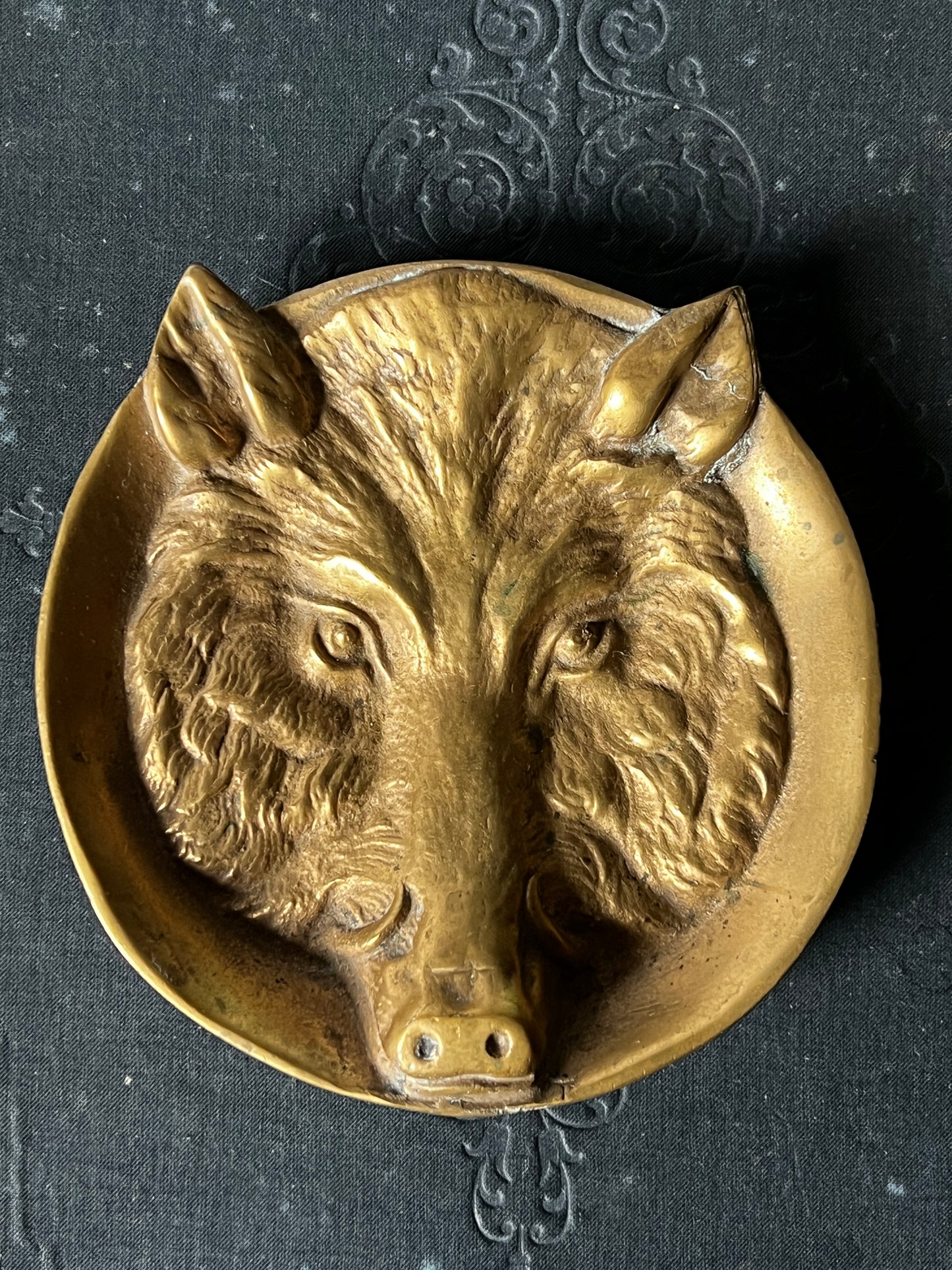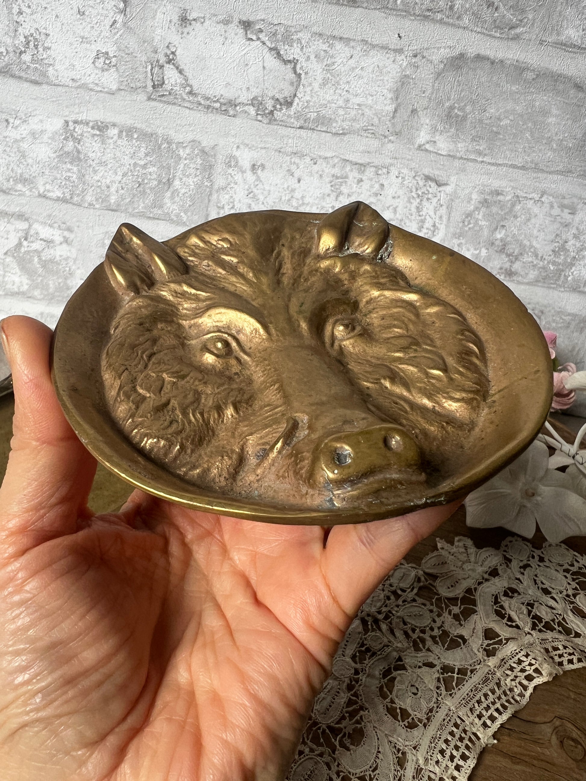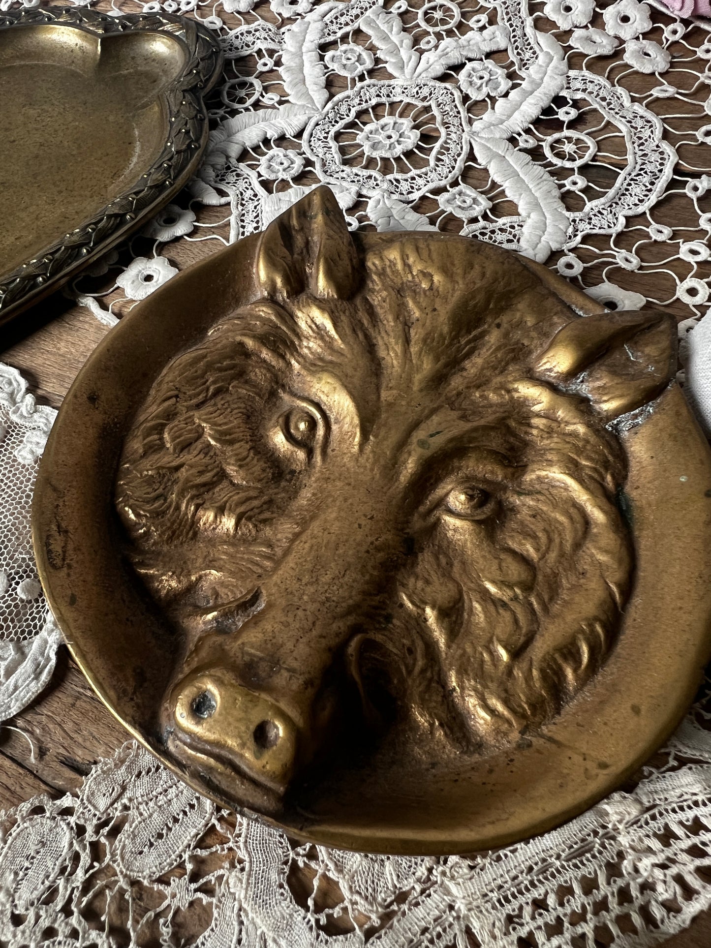 迫力満点、猪の顔が大胆にデザインされた真鍮製の小皿です