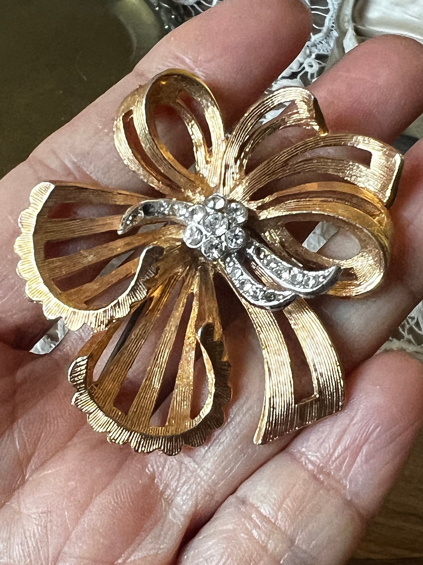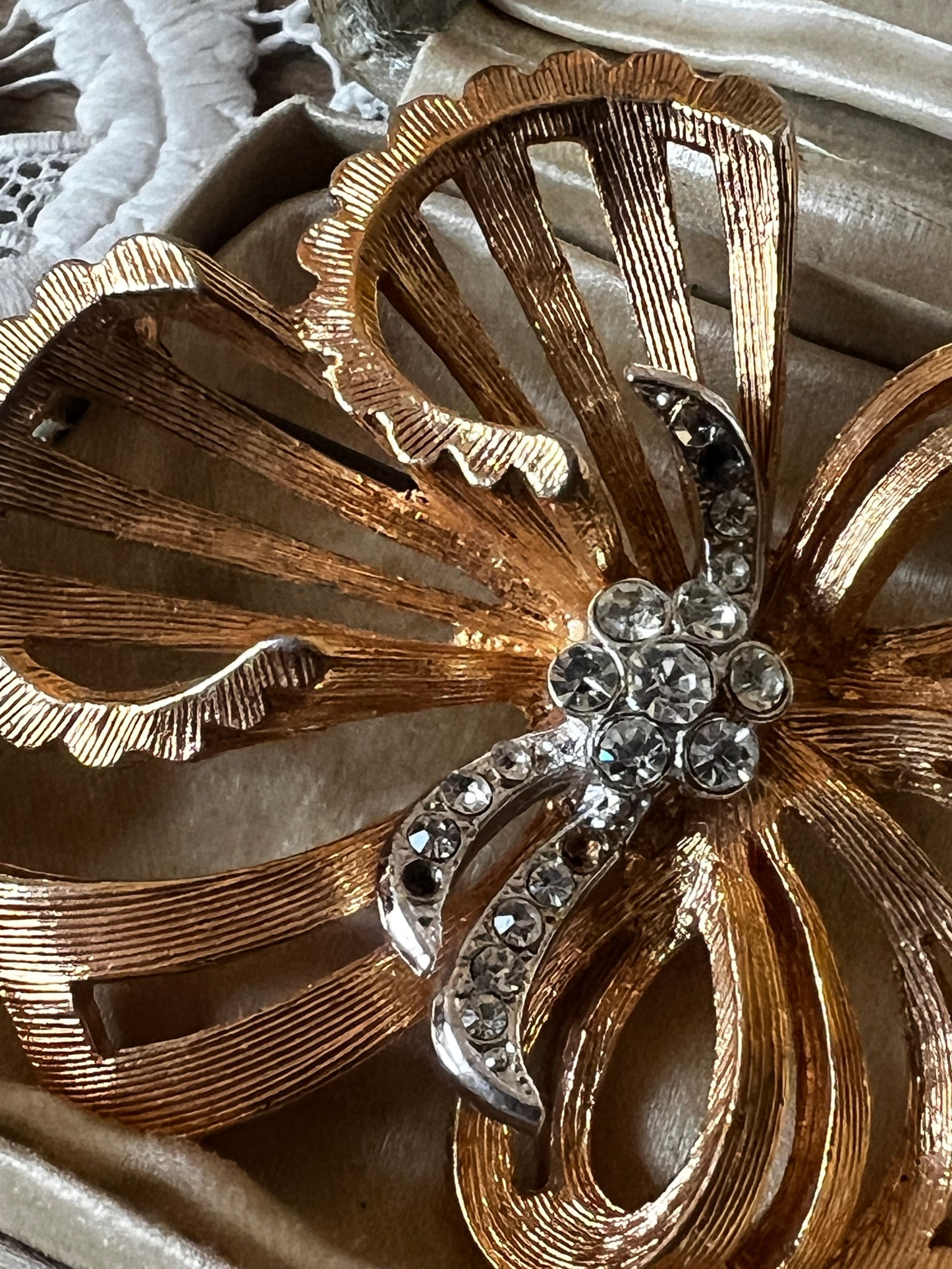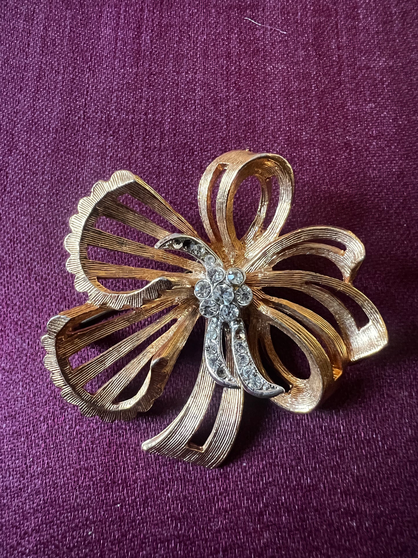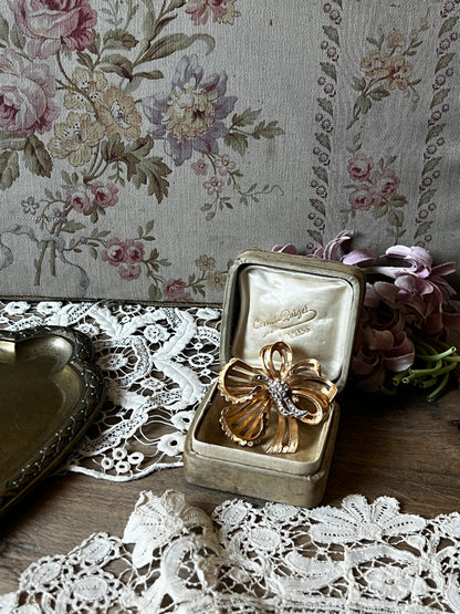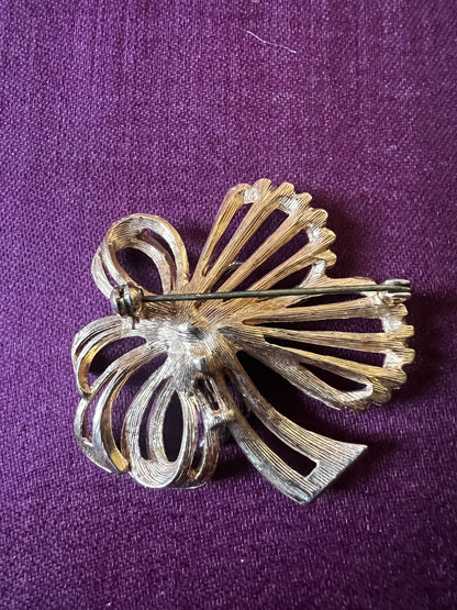 ゴールドカラーの台座にストラスが美しく配置された、やや大ぶりで存在感のあるヴィンテージブローチです