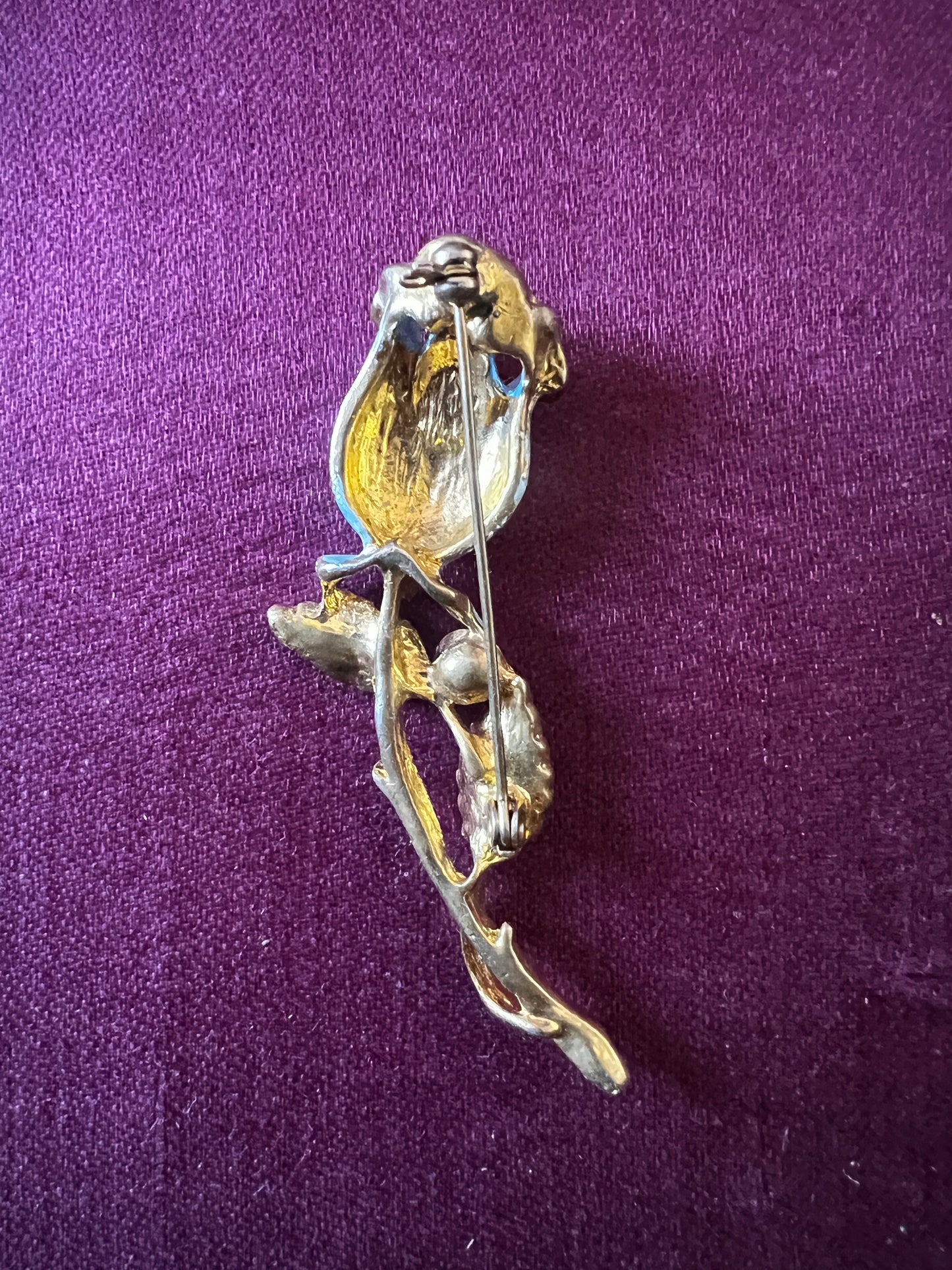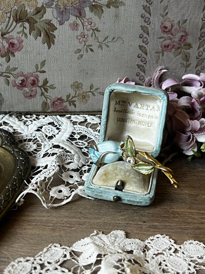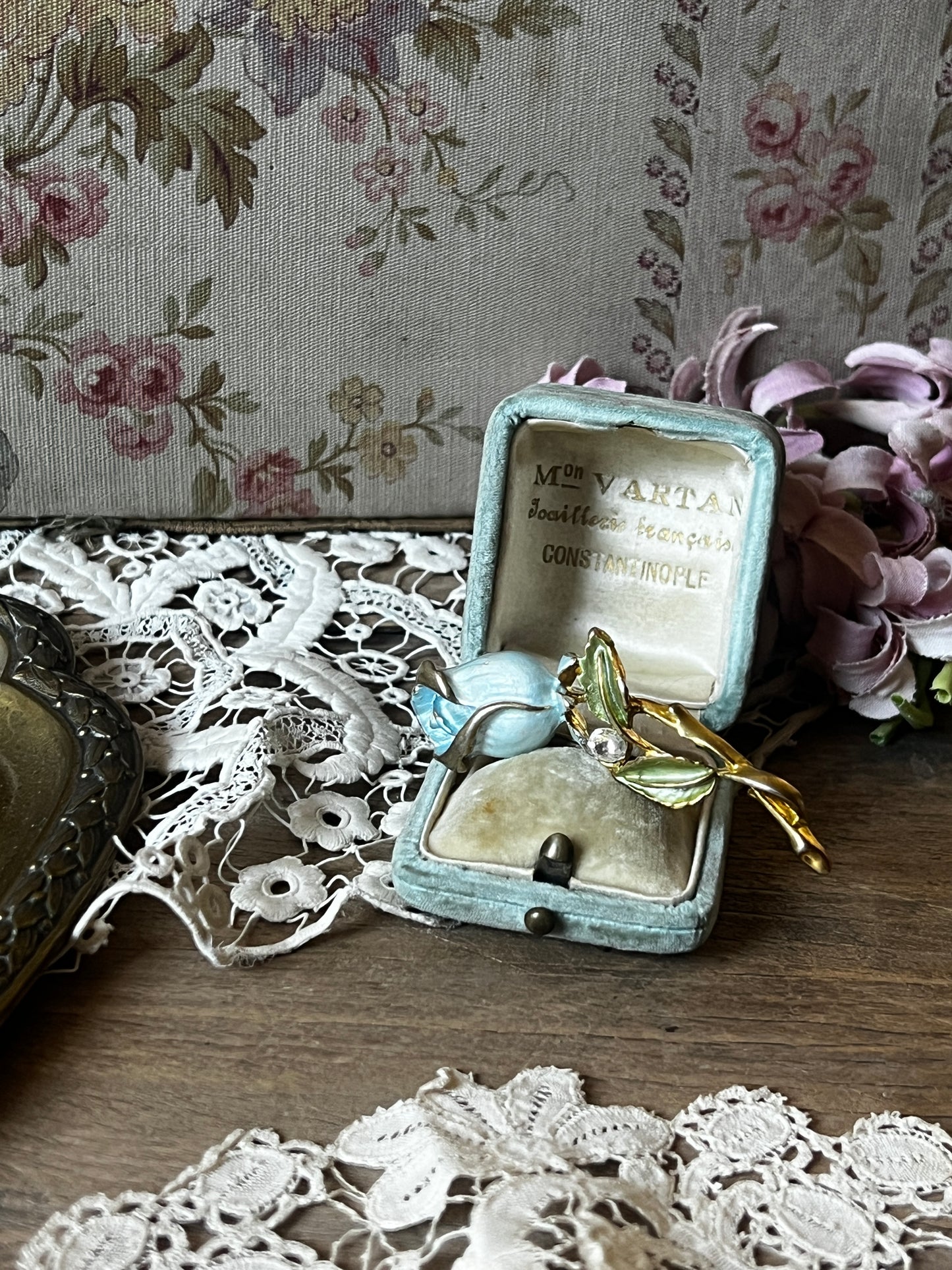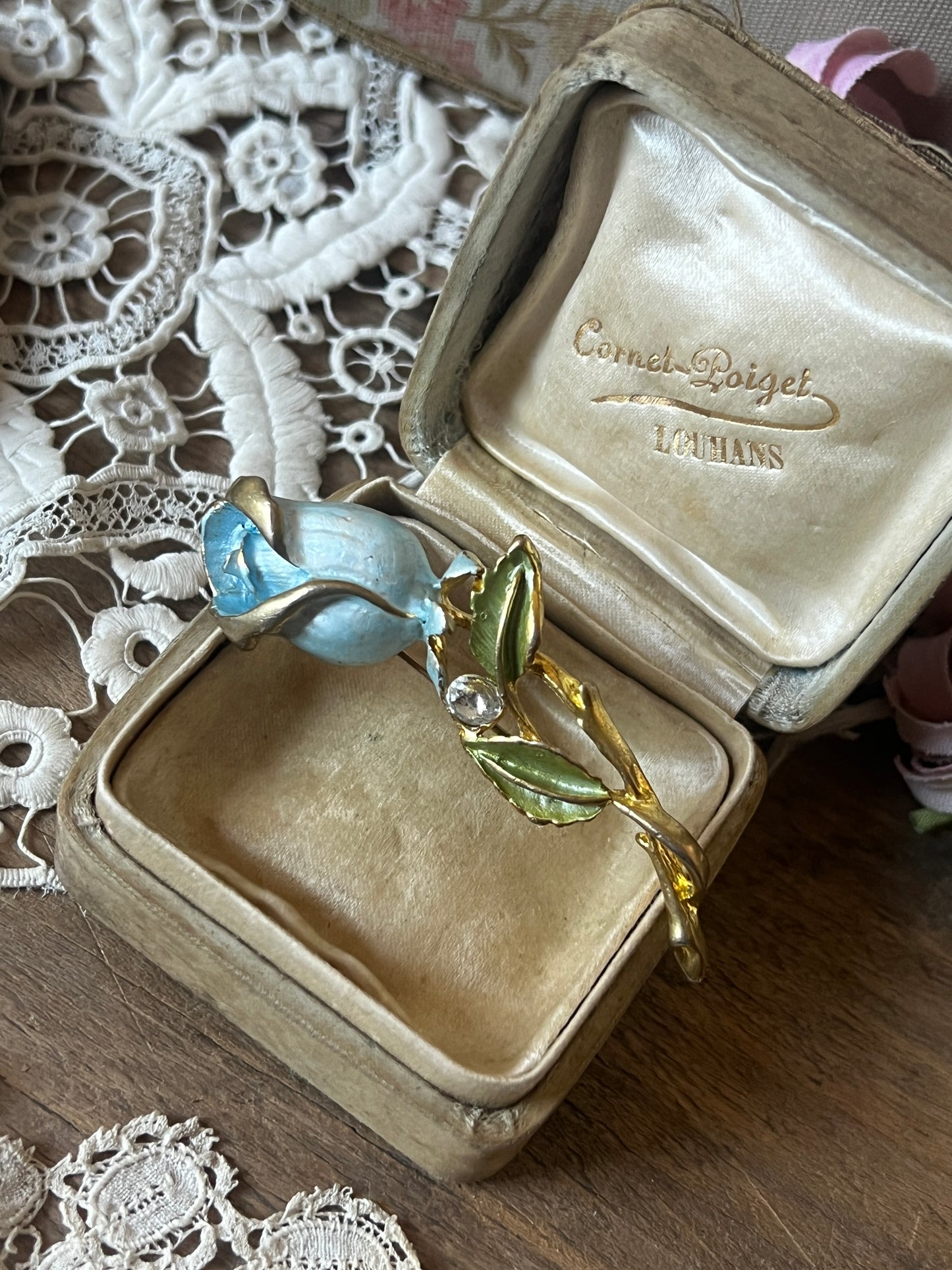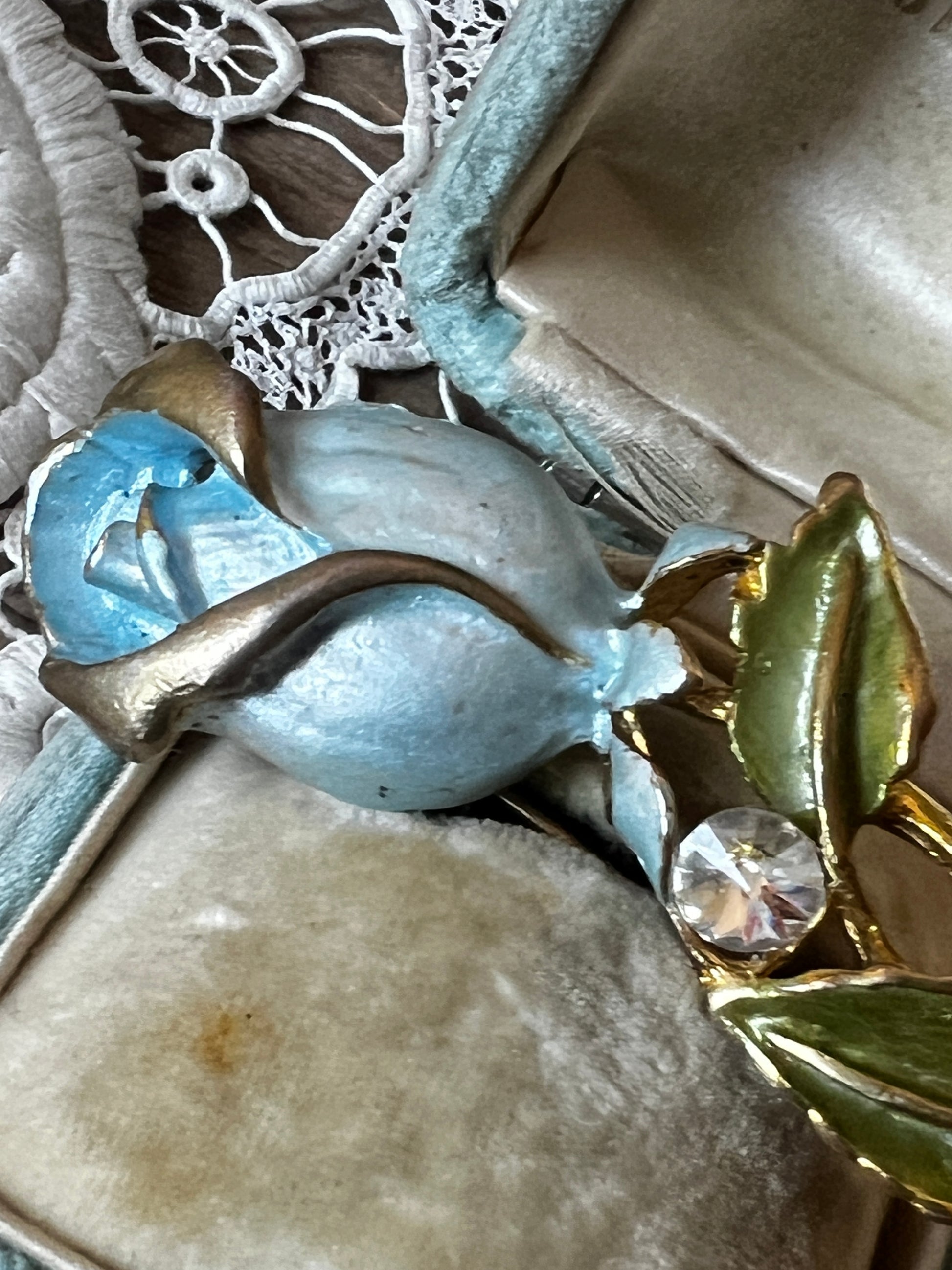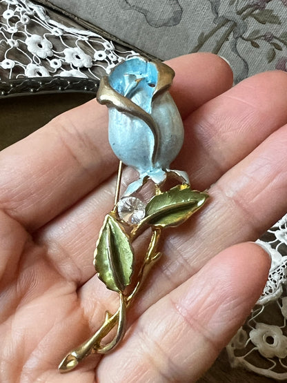 淡いブルーの色合いが美しい、咲きかけの薔薇を象ったヴィンテージブローチです