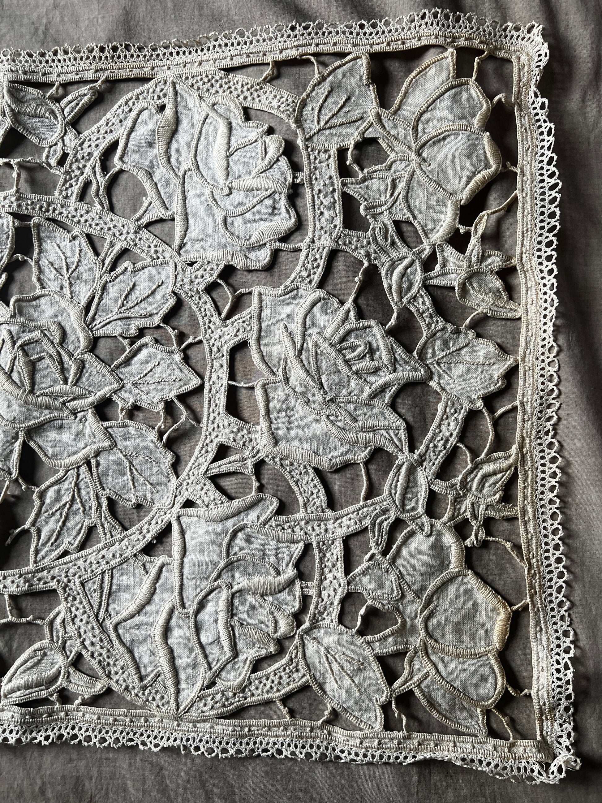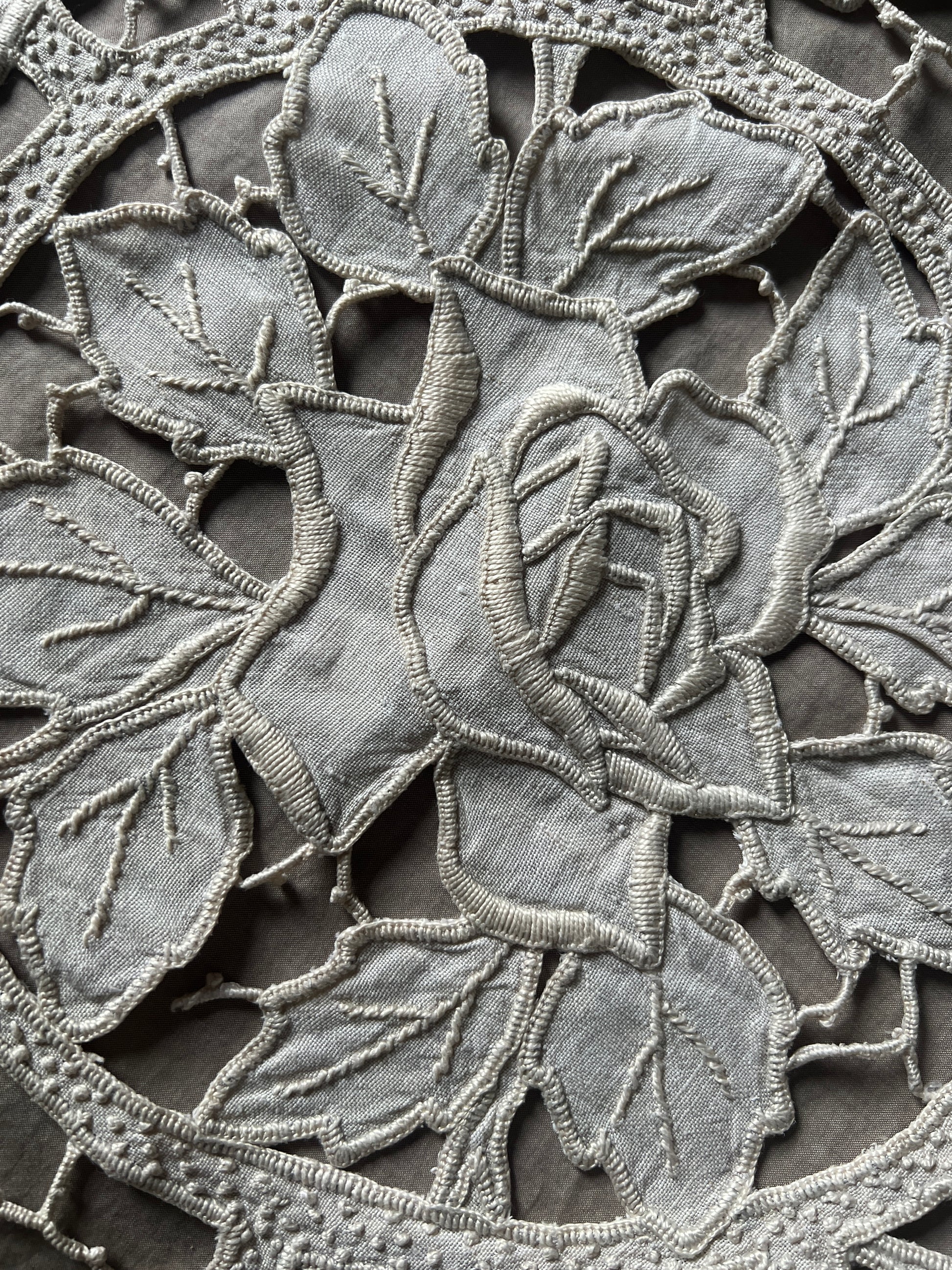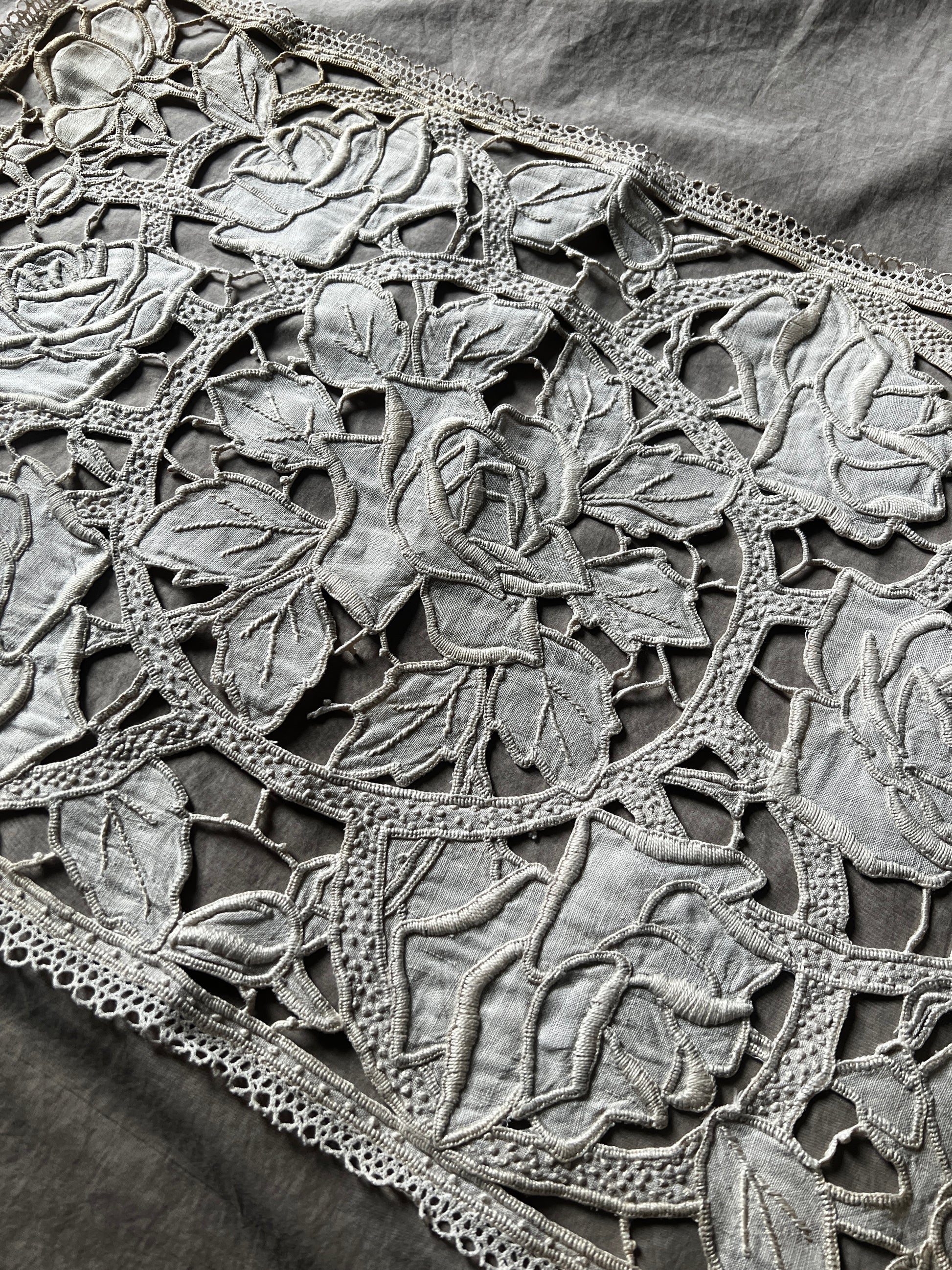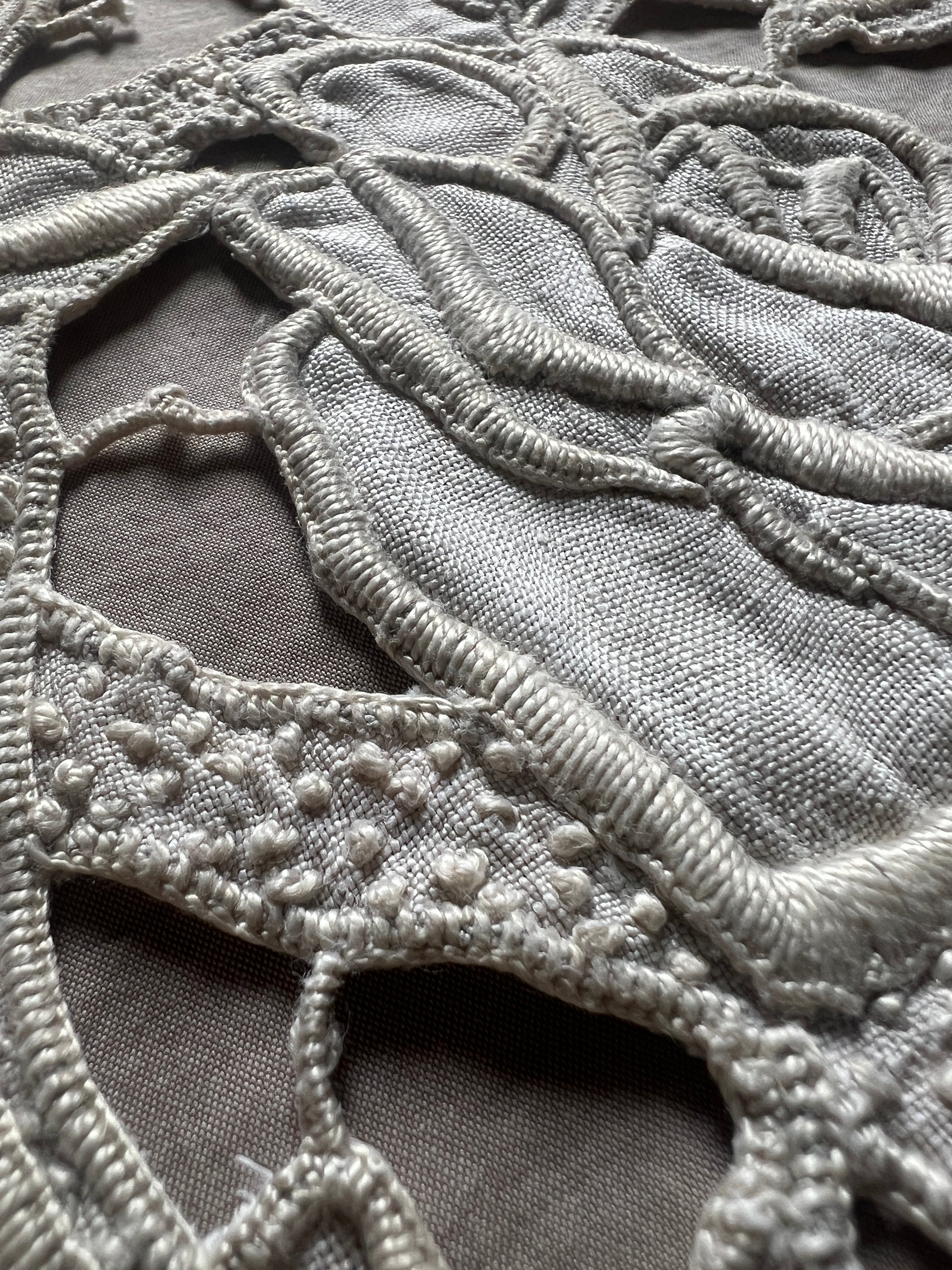 大輪の薔薇をモチーフにしたカットワーク刺繍は刺繍量が多く、手仕事の豊かさを感じさせる華やかな仕上がり