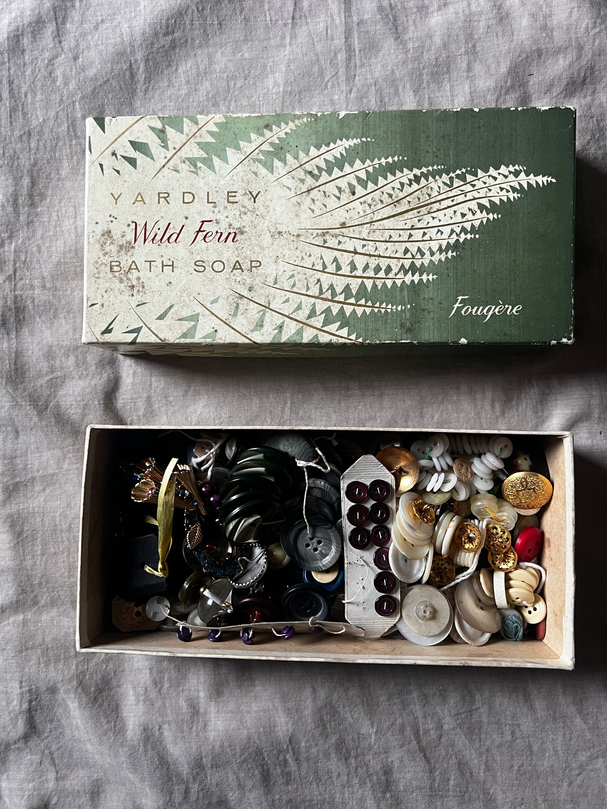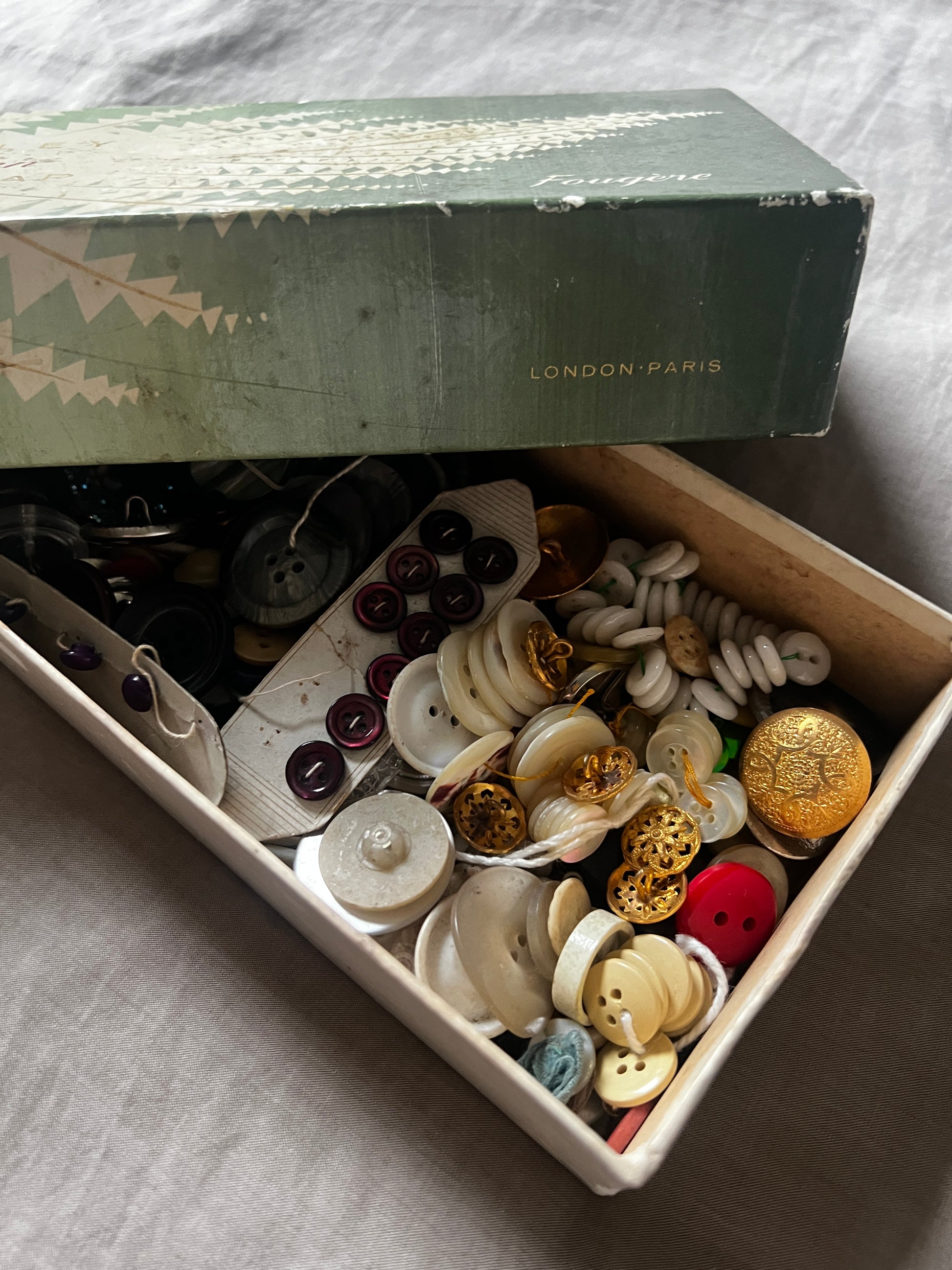 古びた紙箱にぎっしりと詰まった、アンティークボタンのセットです