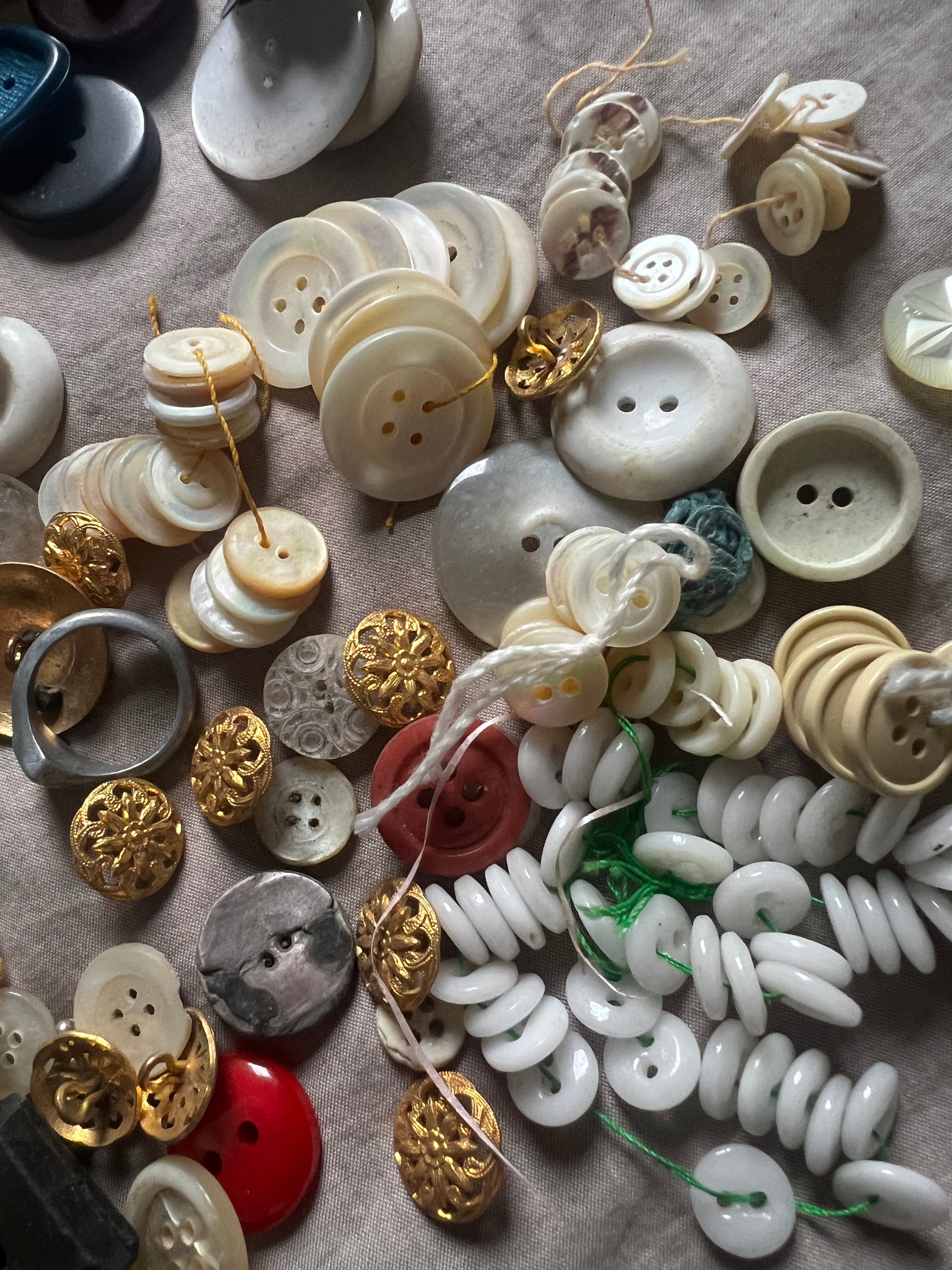 ミルクガラスや貝ボタンを中心に、樹脂、メタル、布包みボタンまで多彩に詰め合わされており、一つひとつに時の痕跡が感じられます