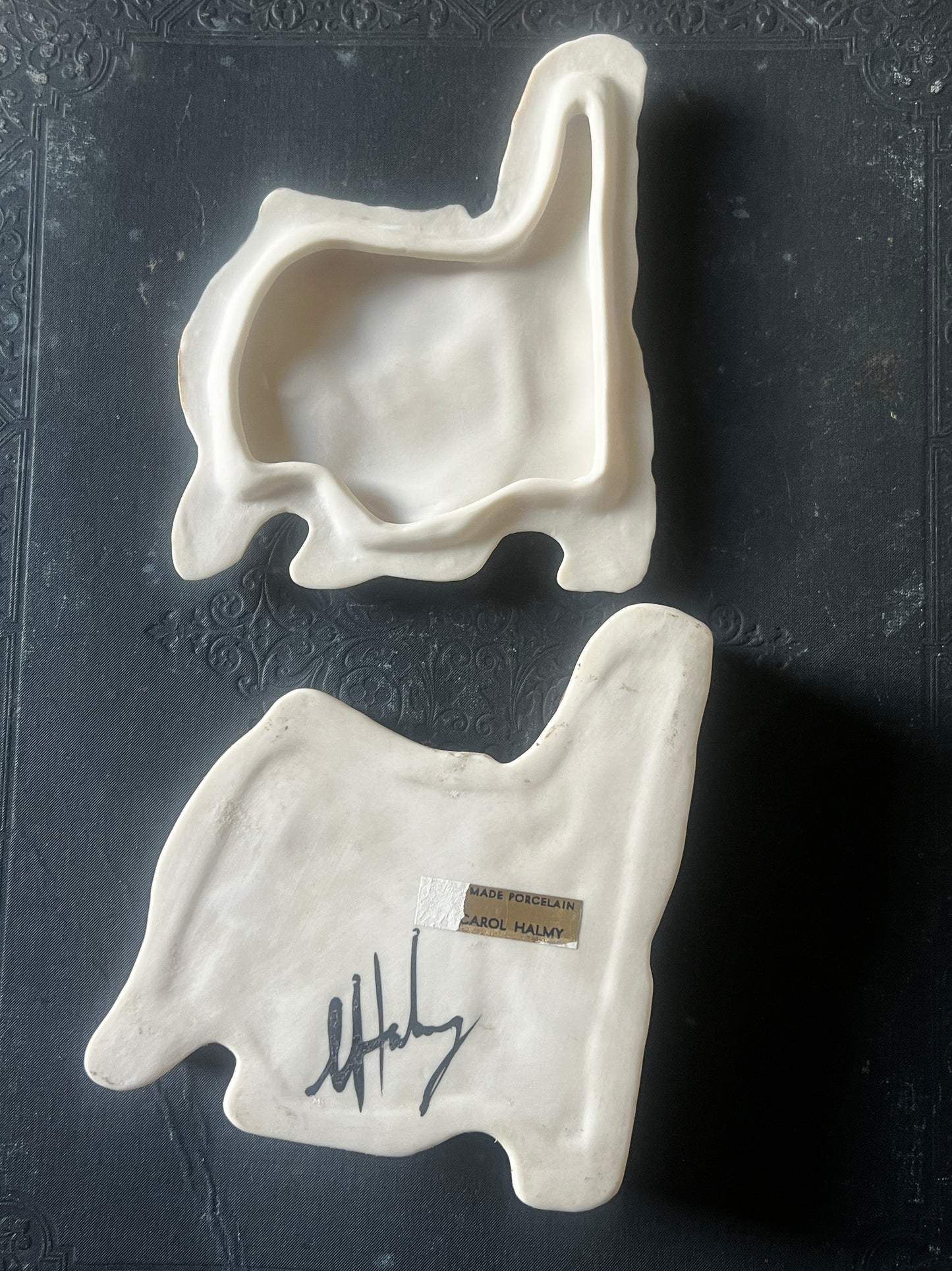 Carol Halmyのサインとラベル(※一部剥離あり)が底裏面にあります