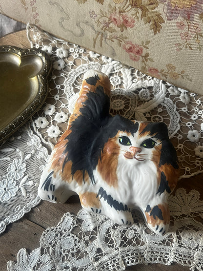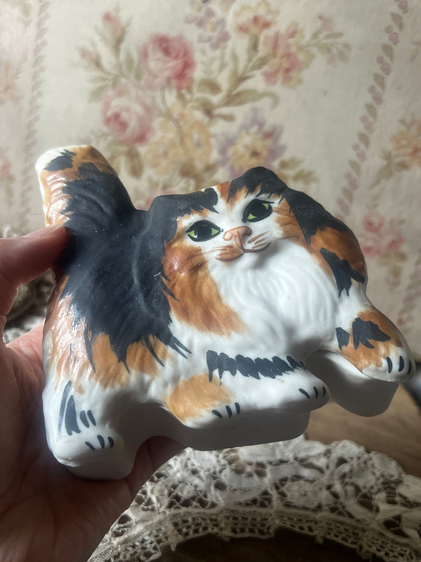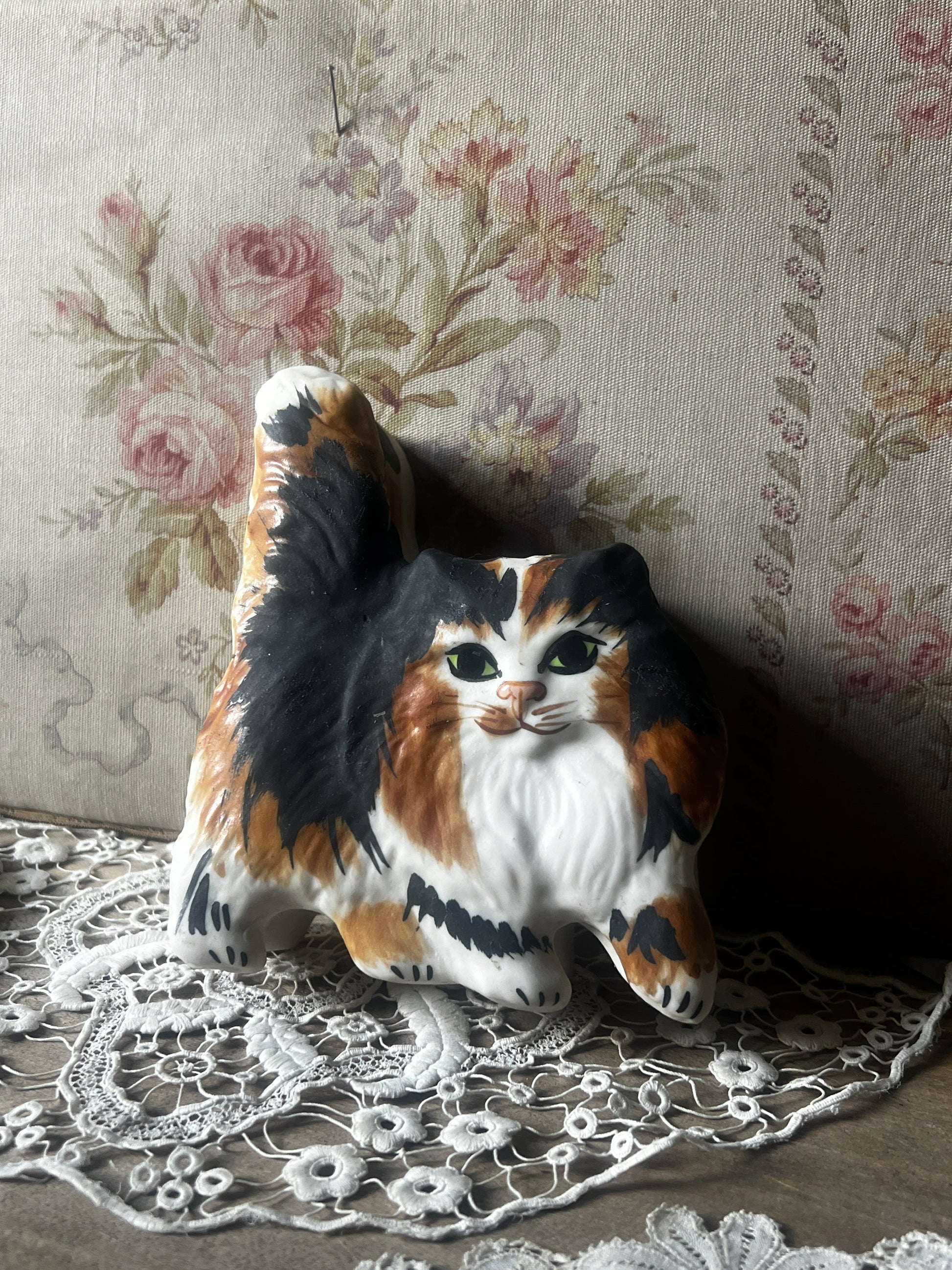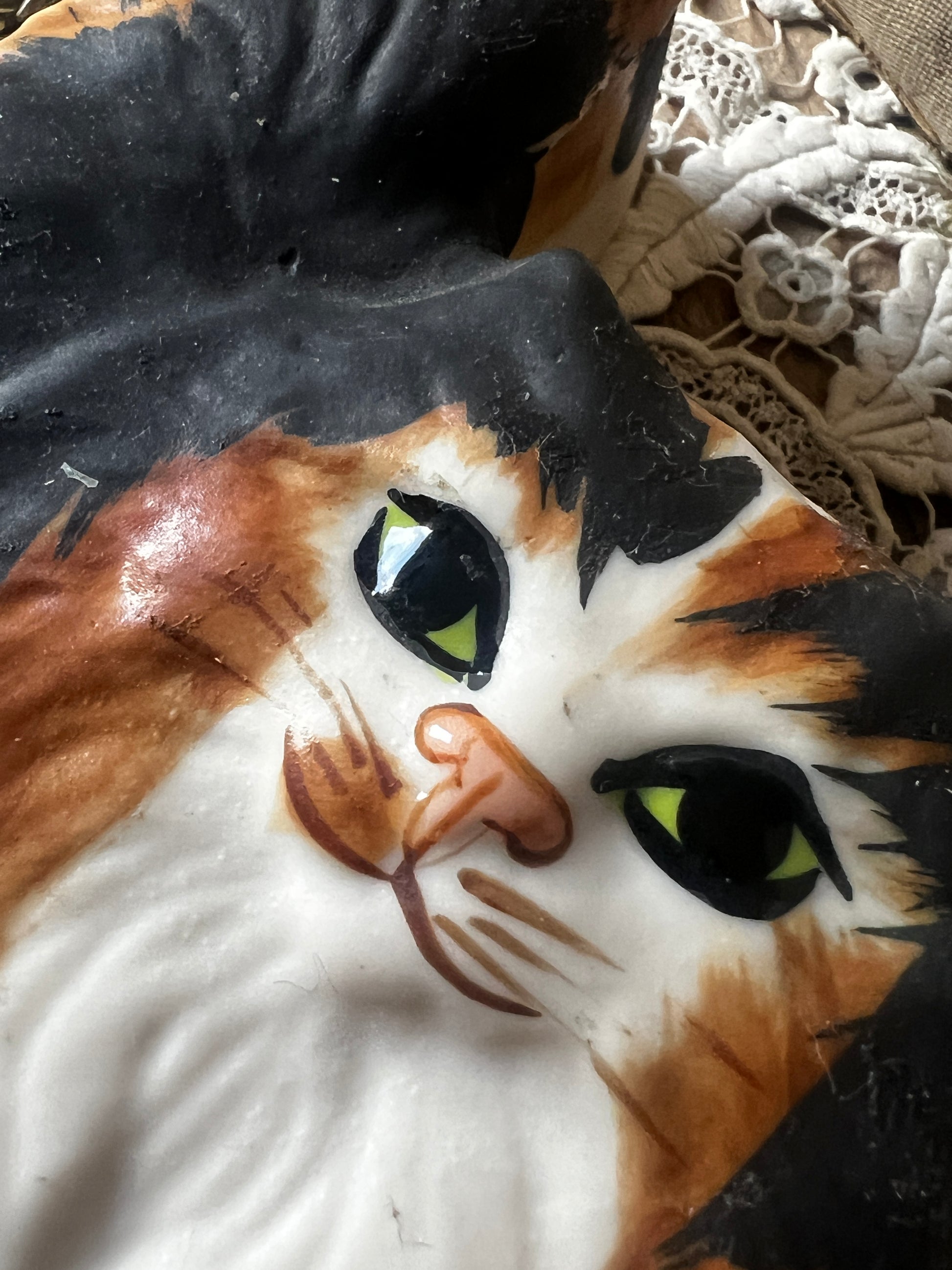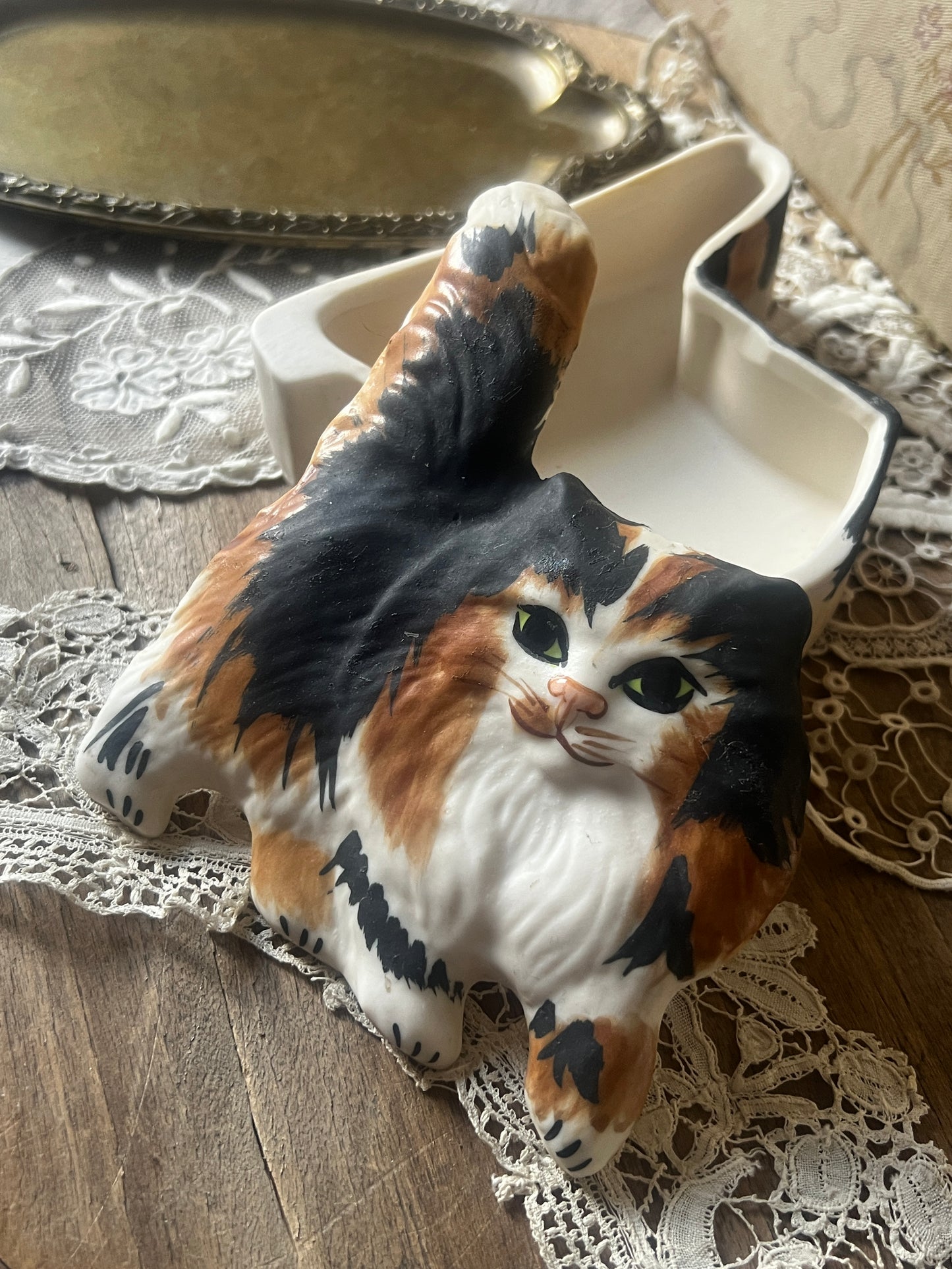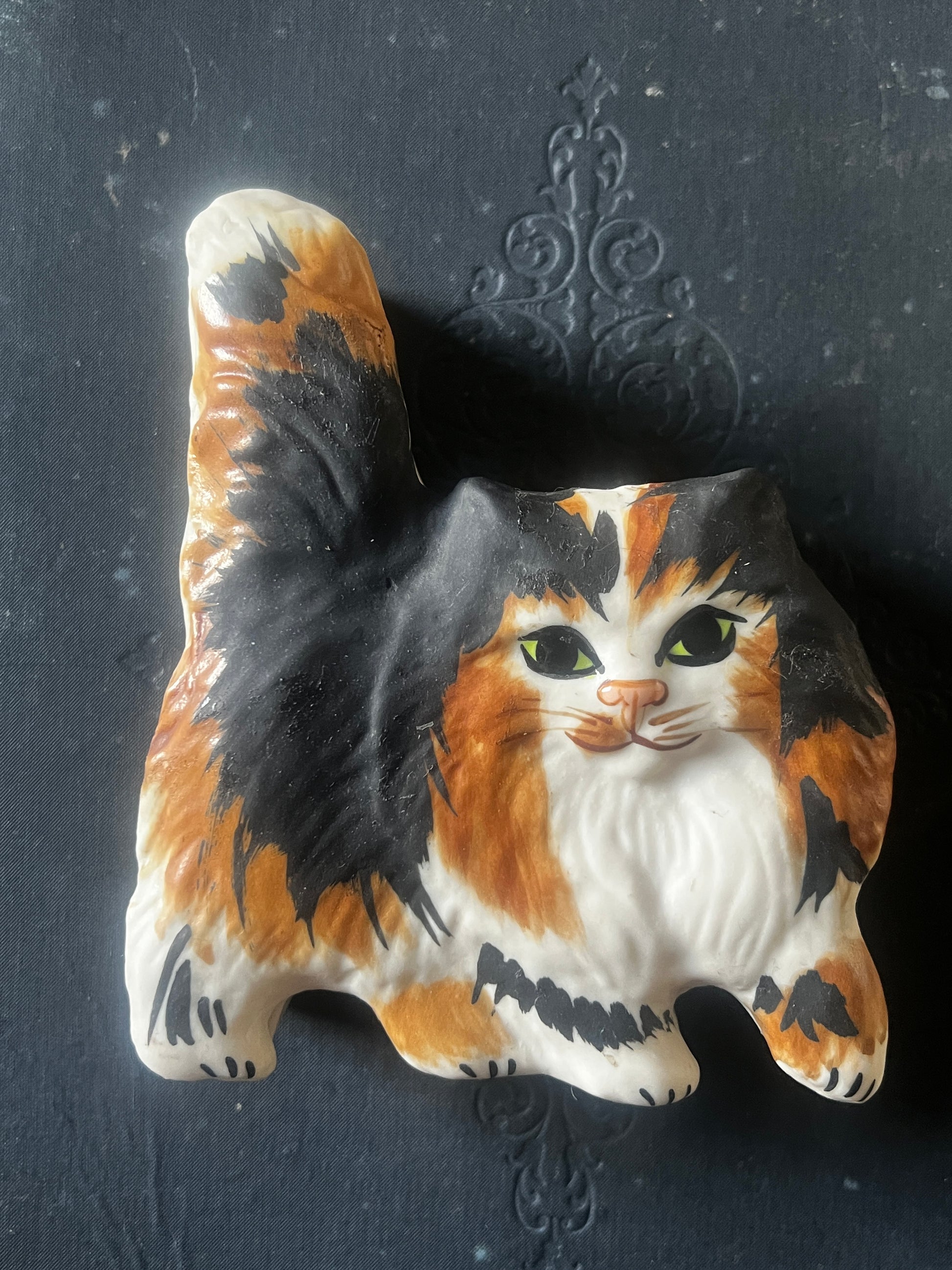 ハンドペイントの筆遣いとネコチャンのユーモラスな存在感が個性的なお品
