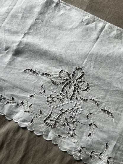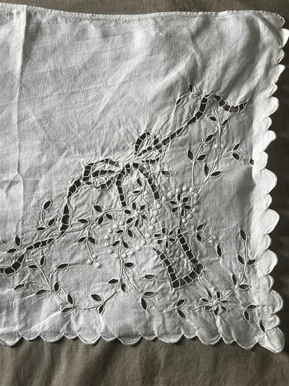 リボンと花かごの図案が繊細に描かれたカットワーク刺繍の飾り布です