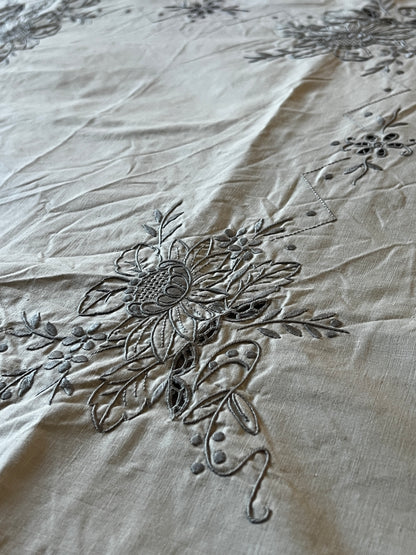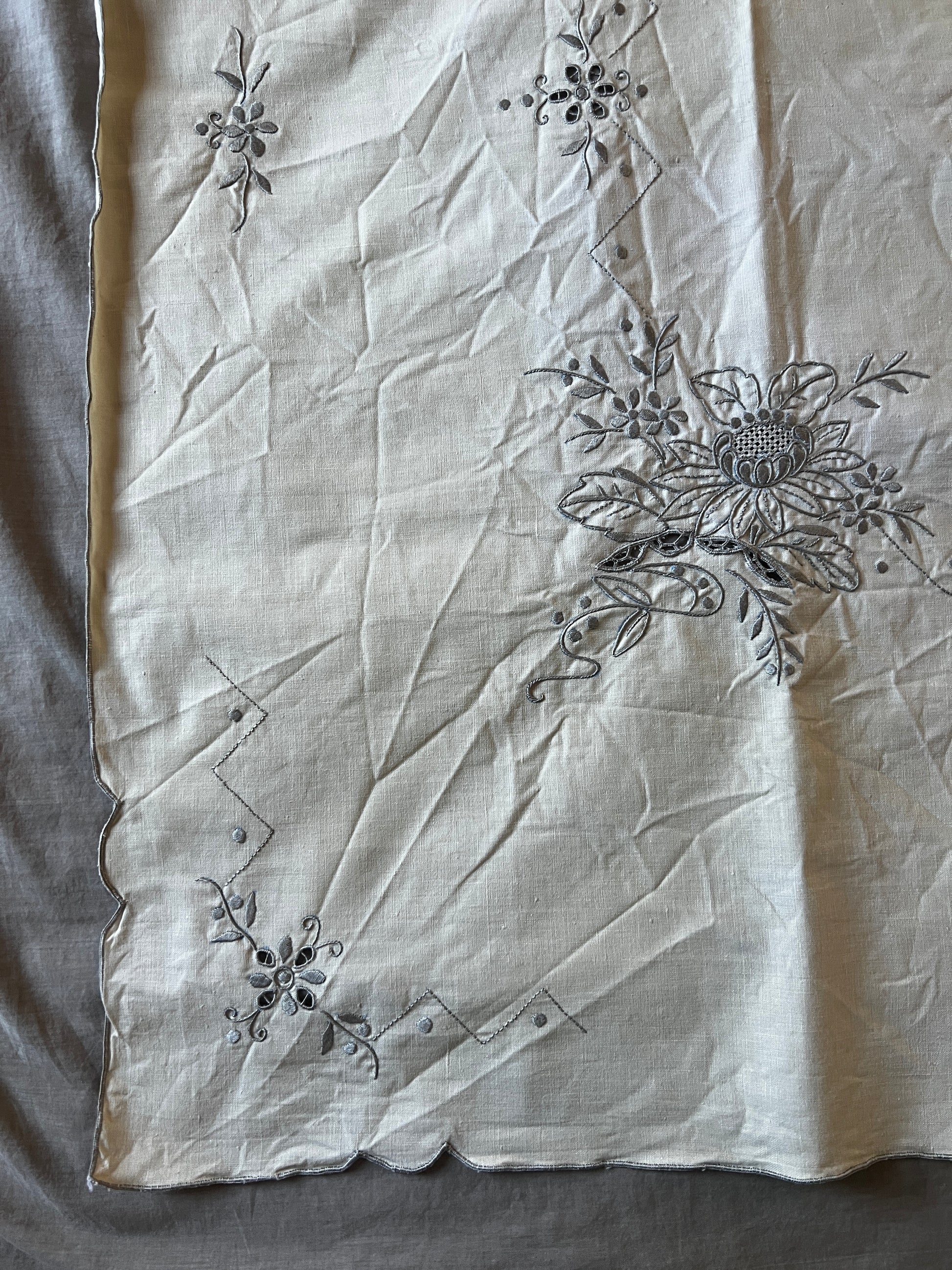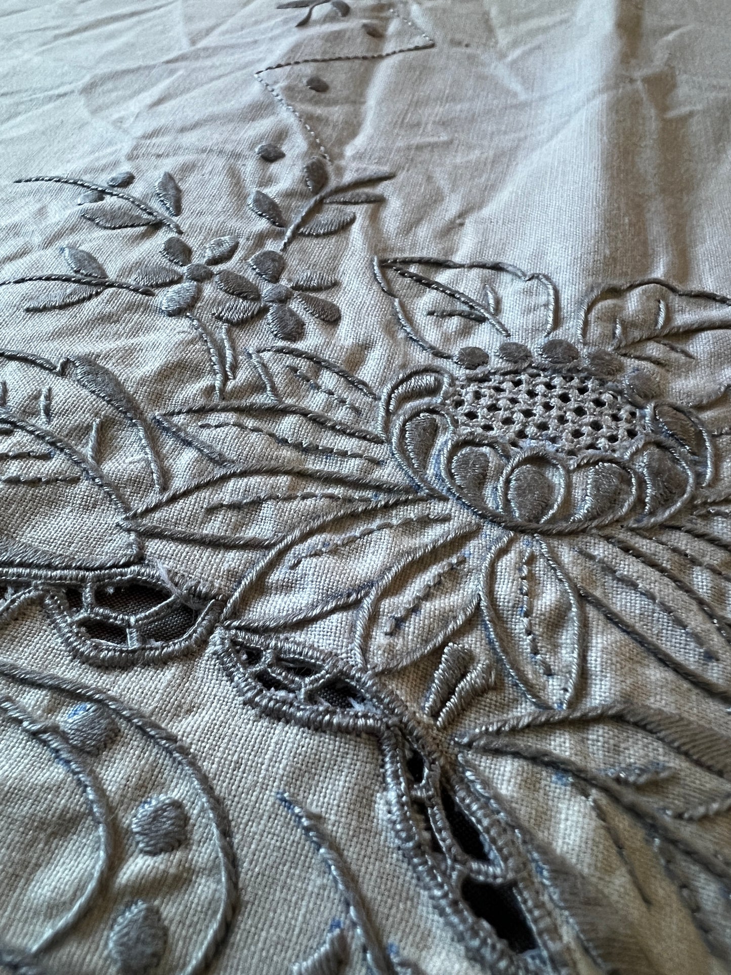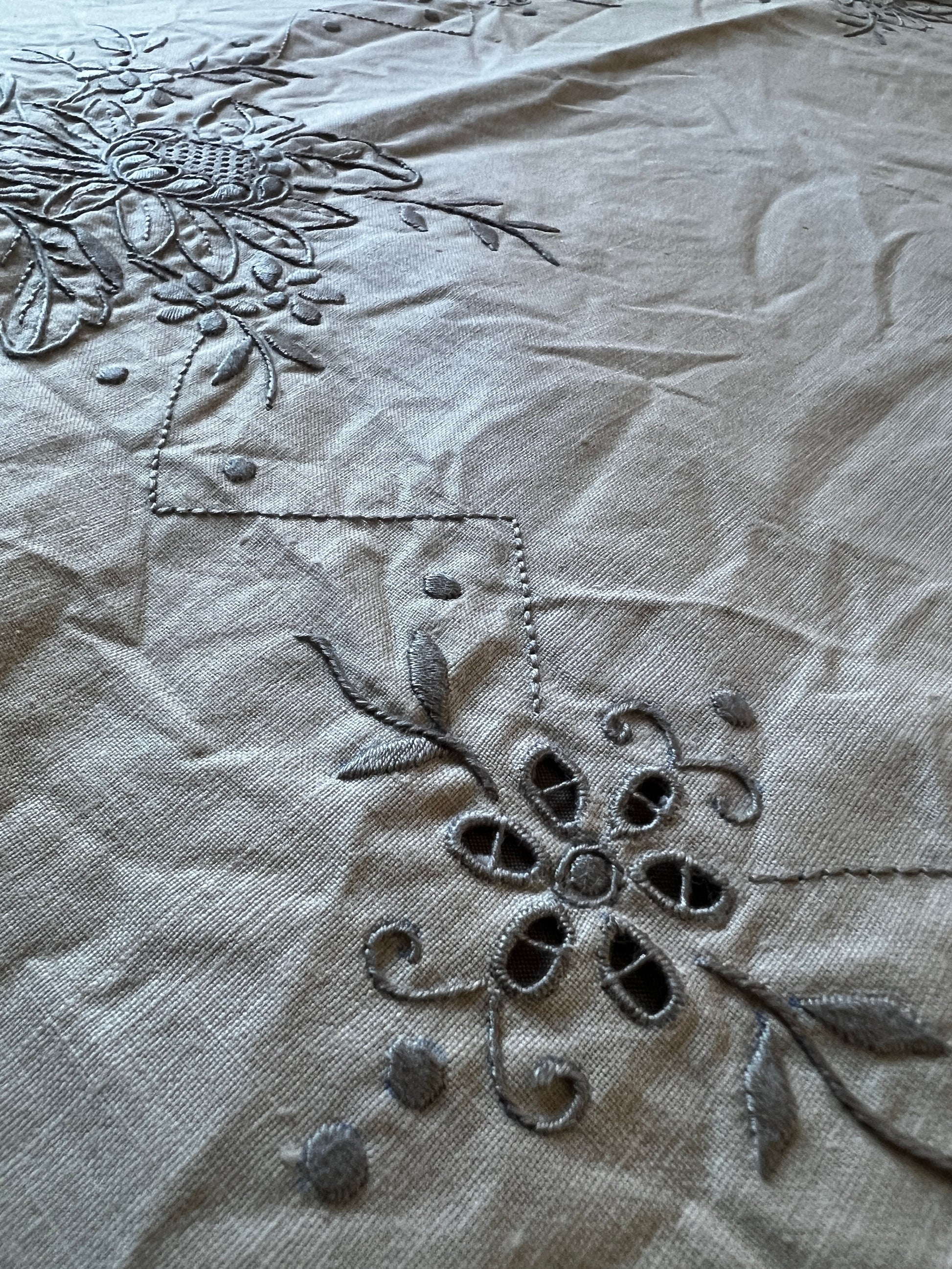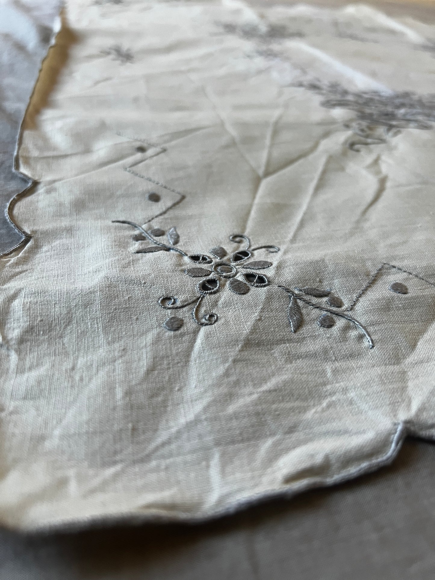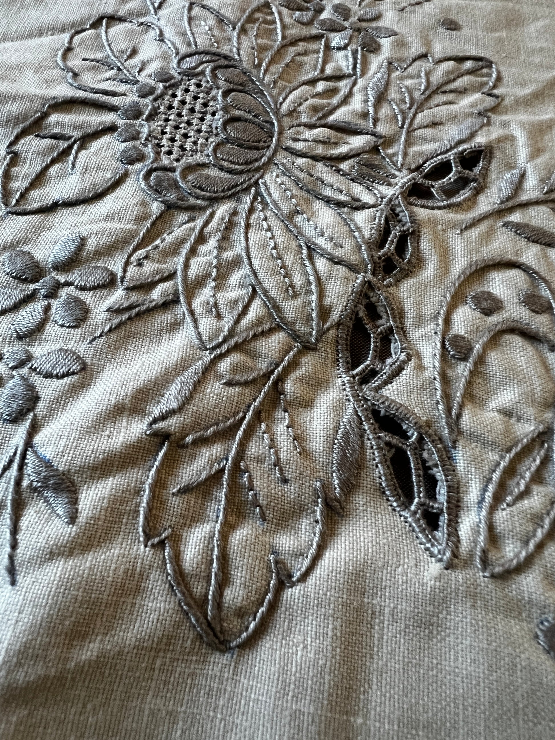 エクリュカラーの布地にグレージュの糸で丁寧にステッチされた、マデイラ刺繍のクロスです