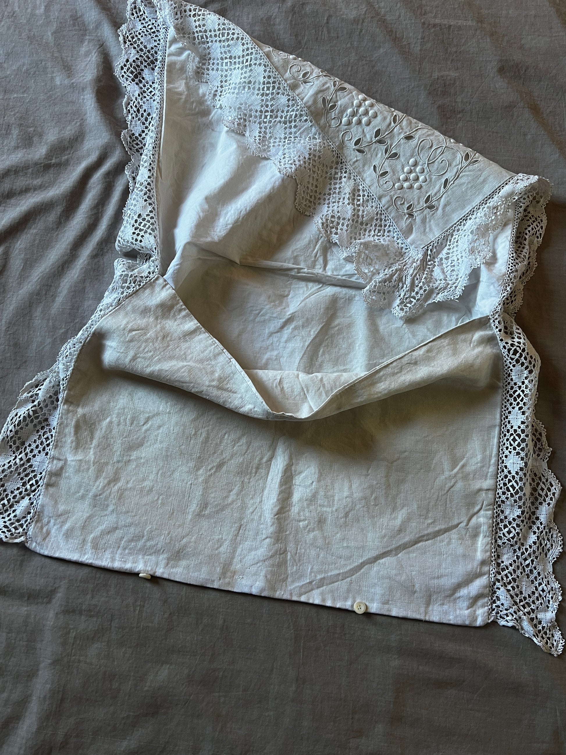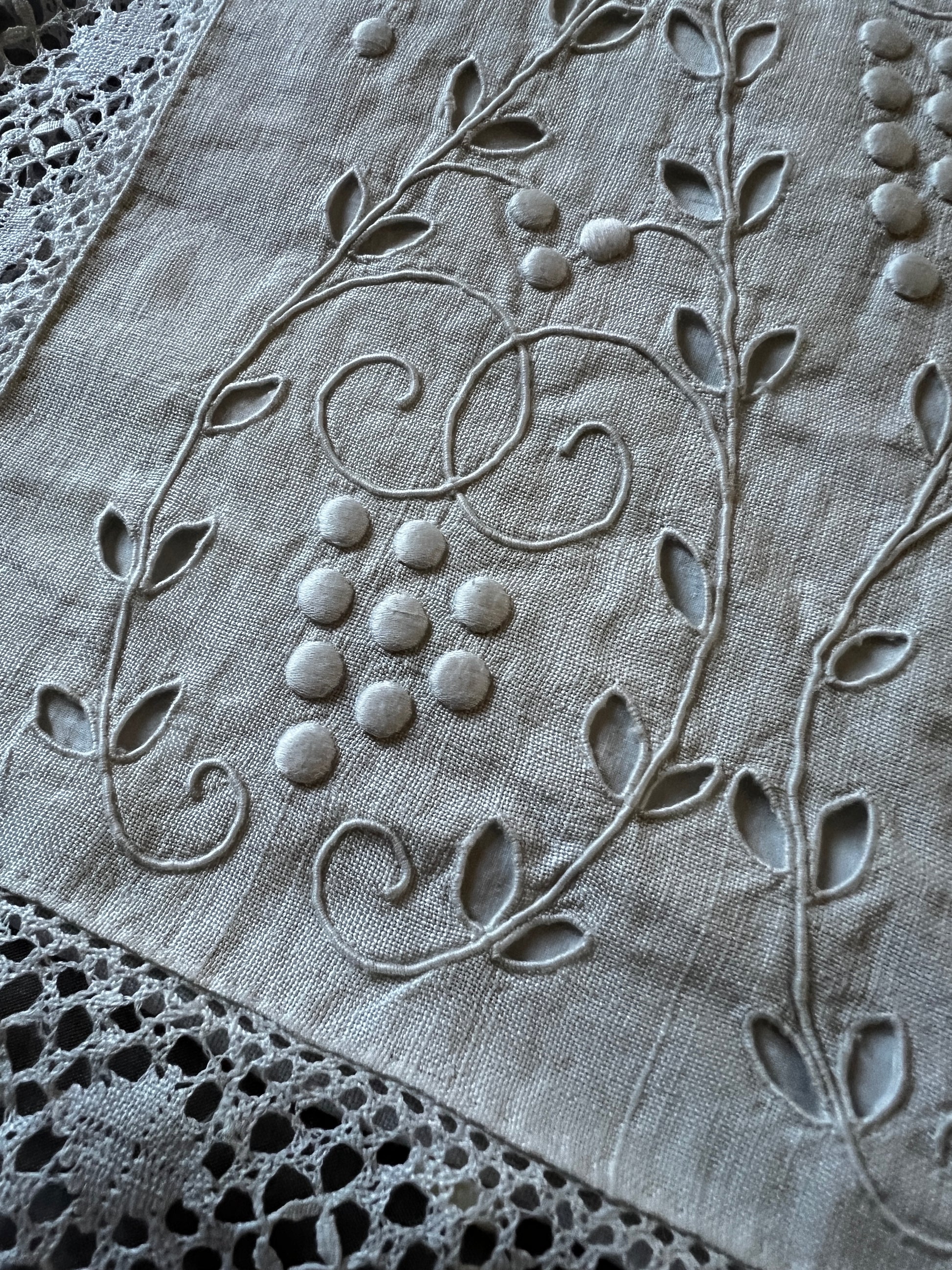 周囲は繊細なボビンレースで華やかに縁取られ、優しい雰囲気を添えています
