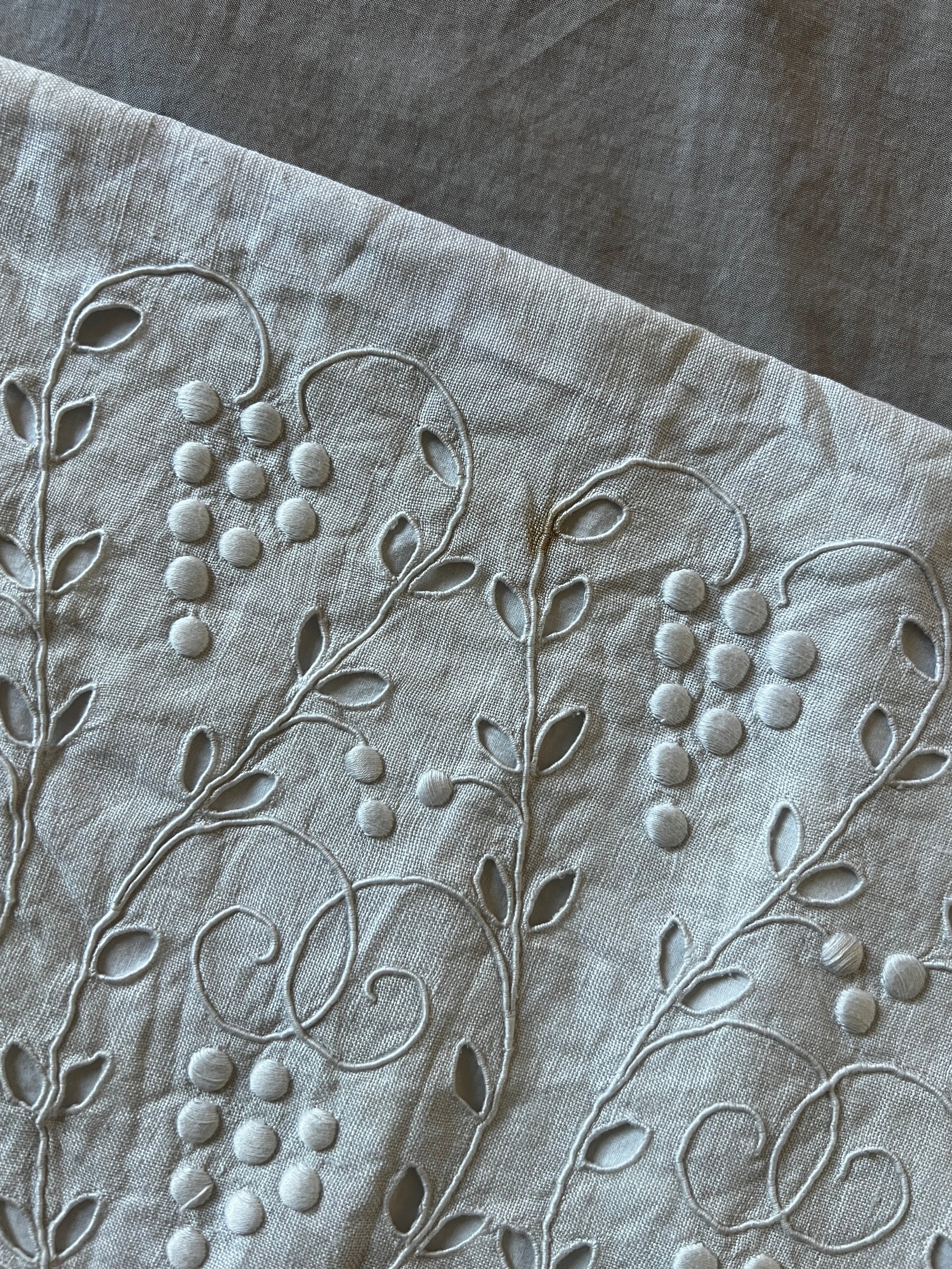 かわいらしい葡萄模様の白刺繍が施されたランジェリーサックです