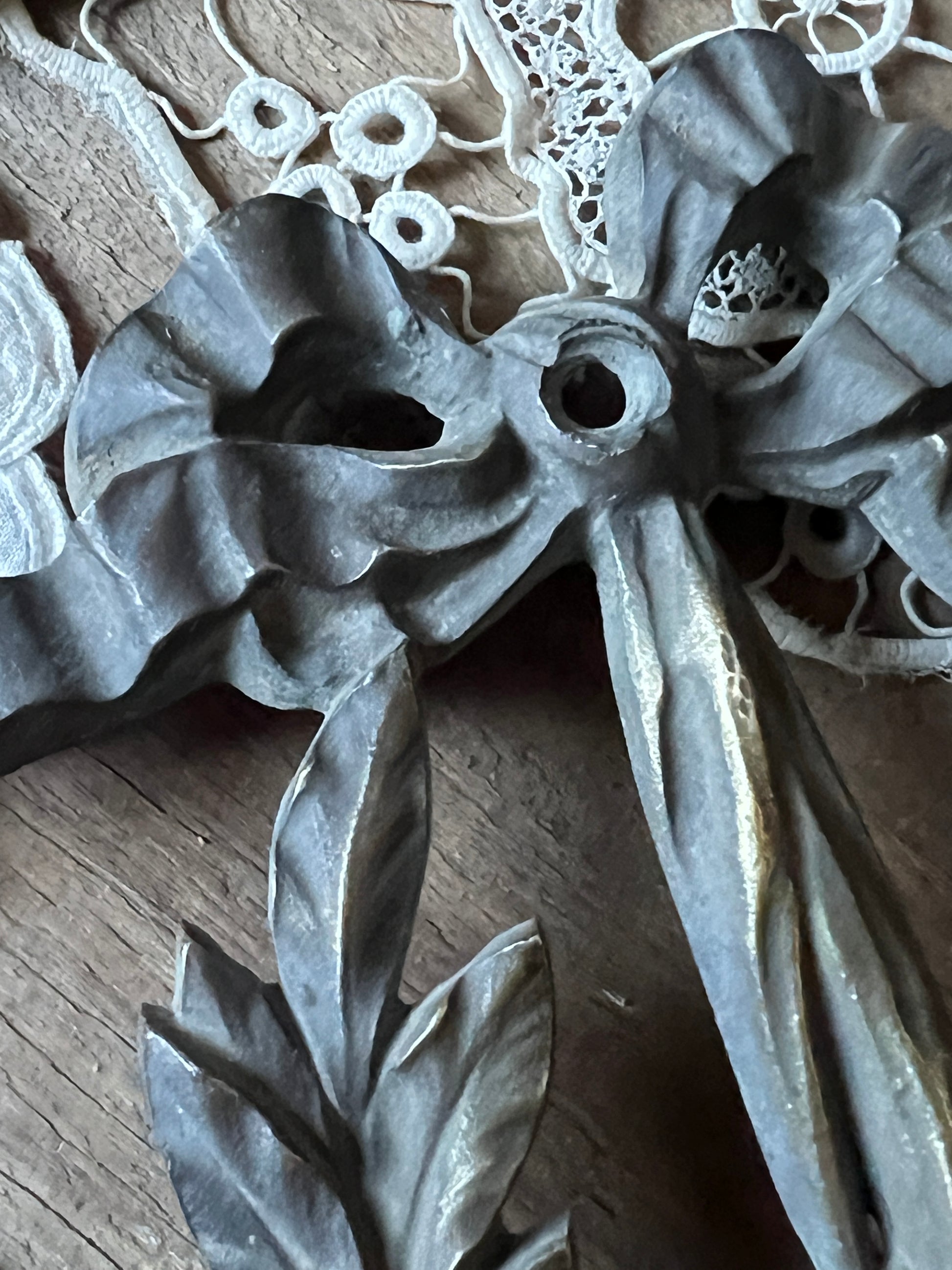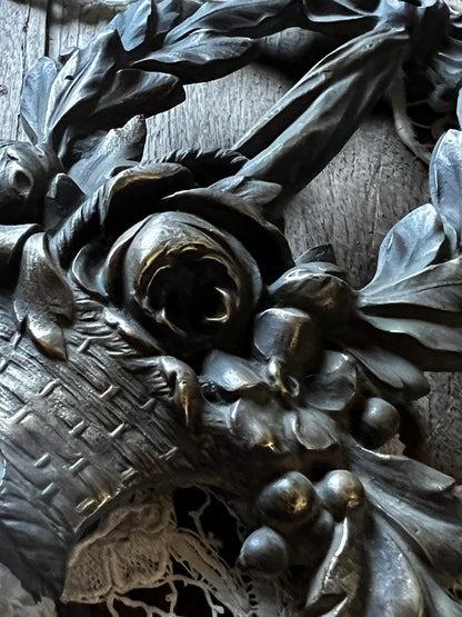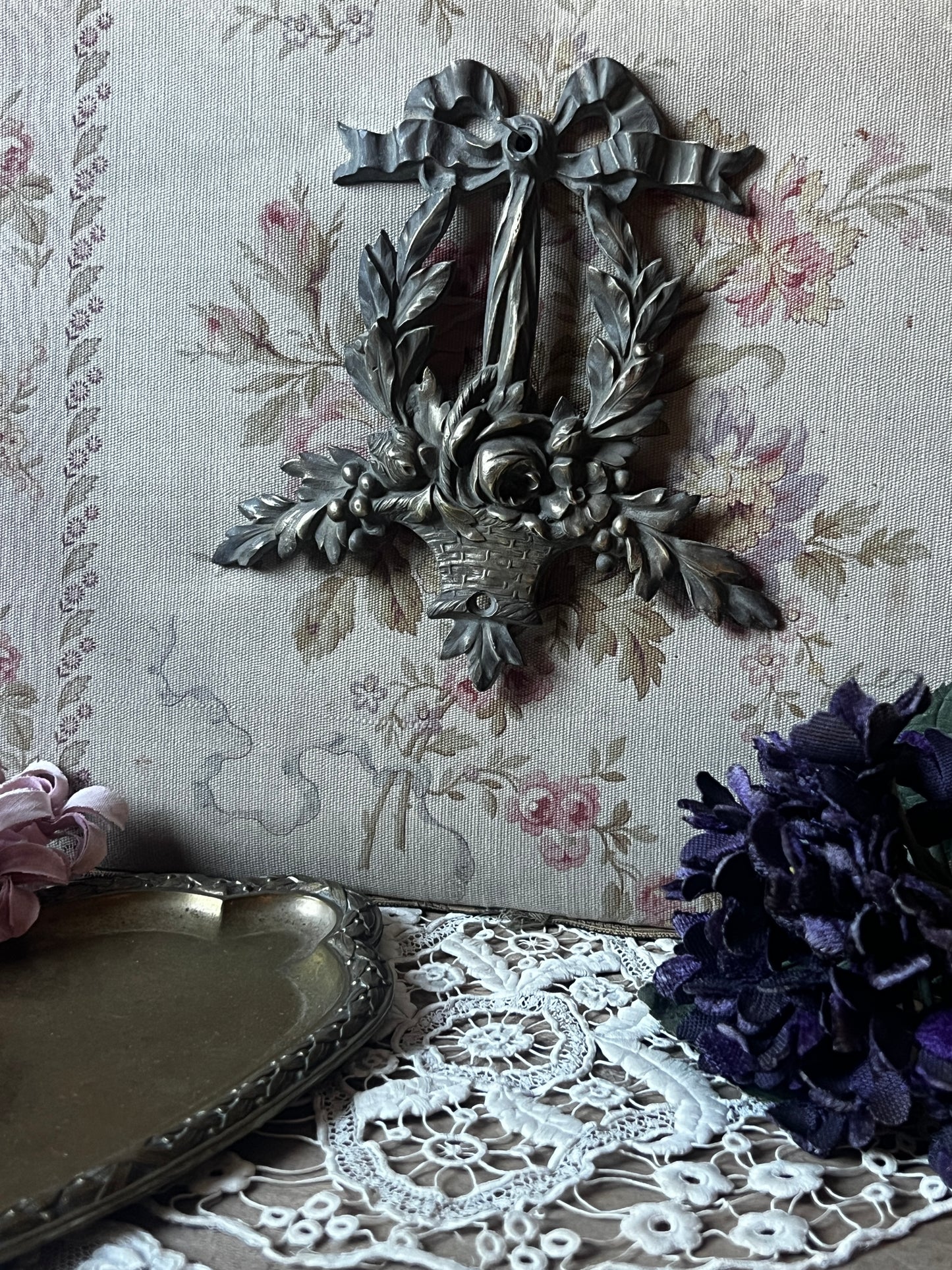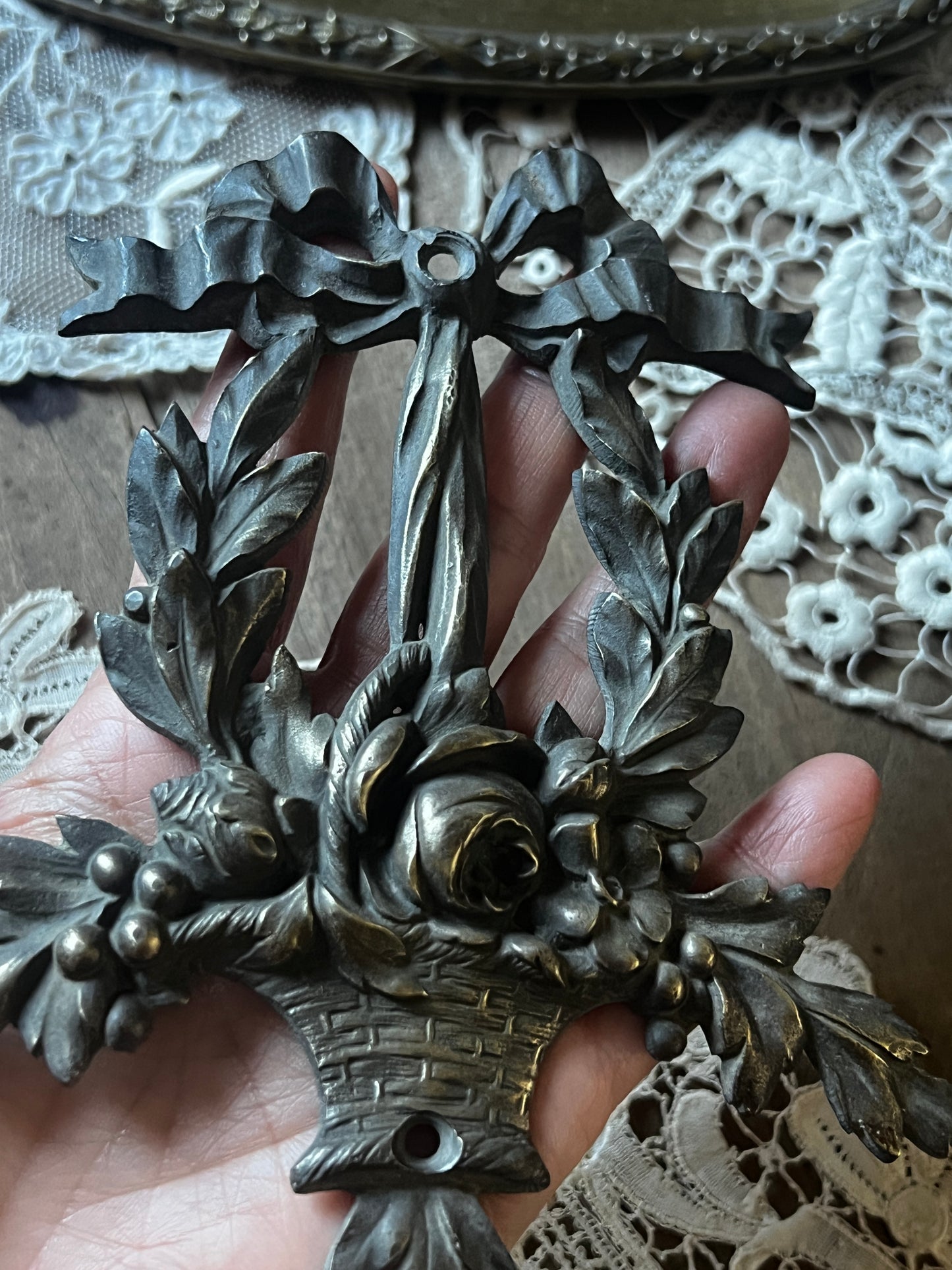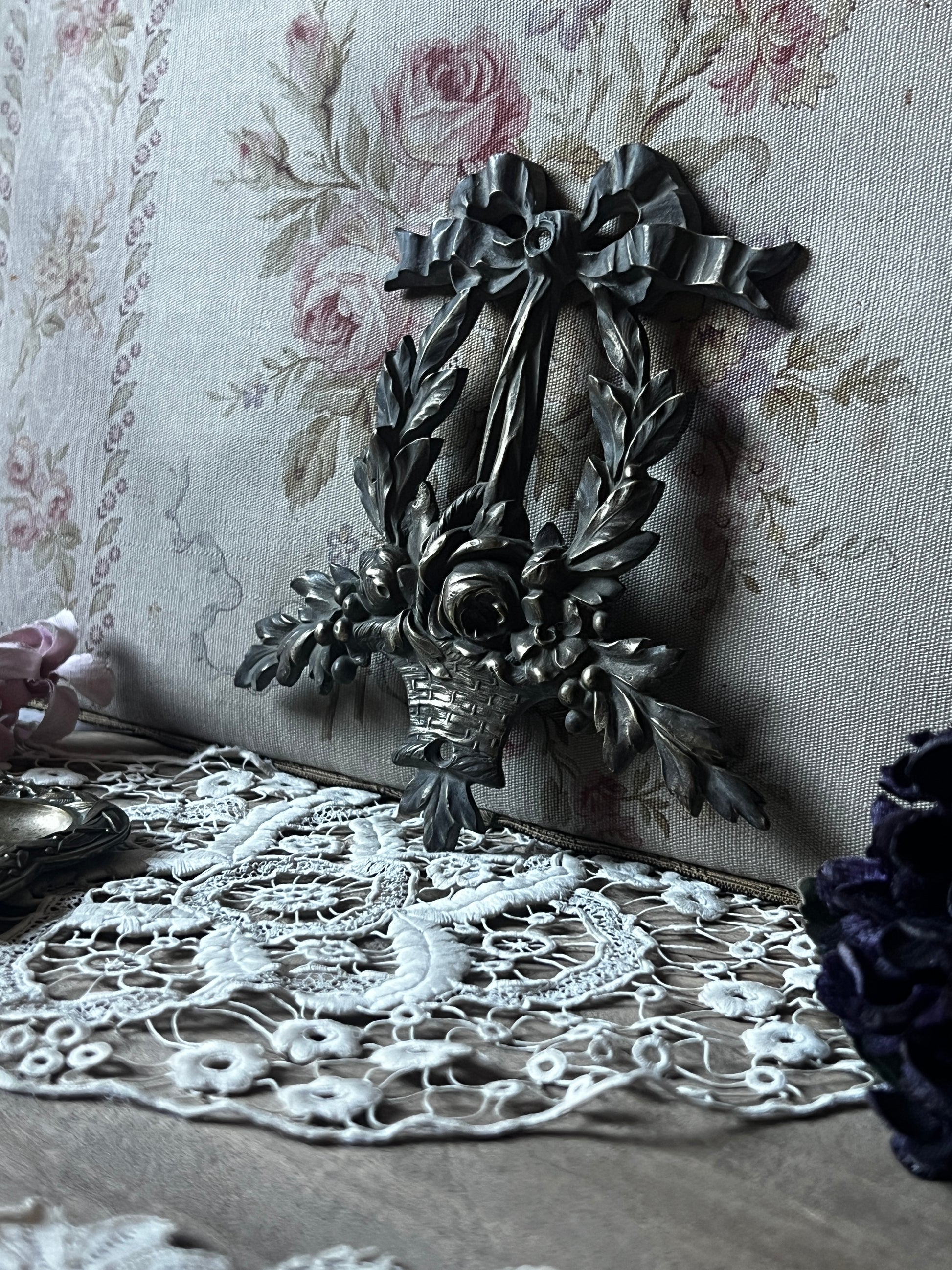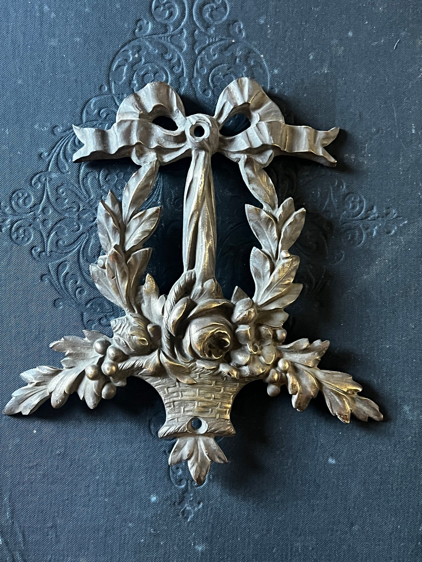 花かごとリボンのモチーフが美しい、メタル製の装飾パーツです