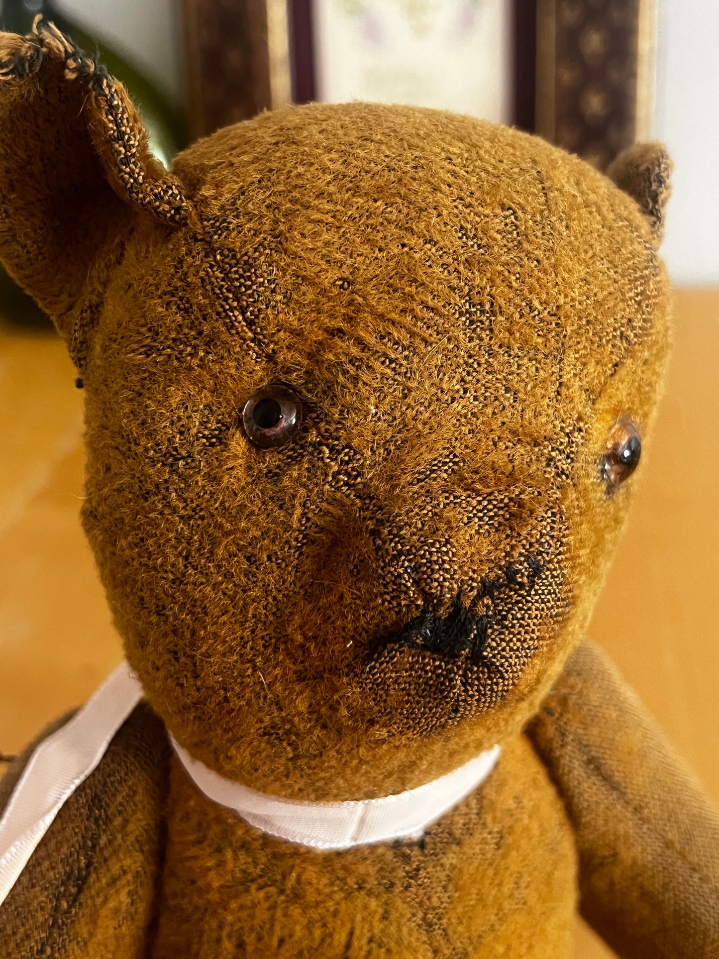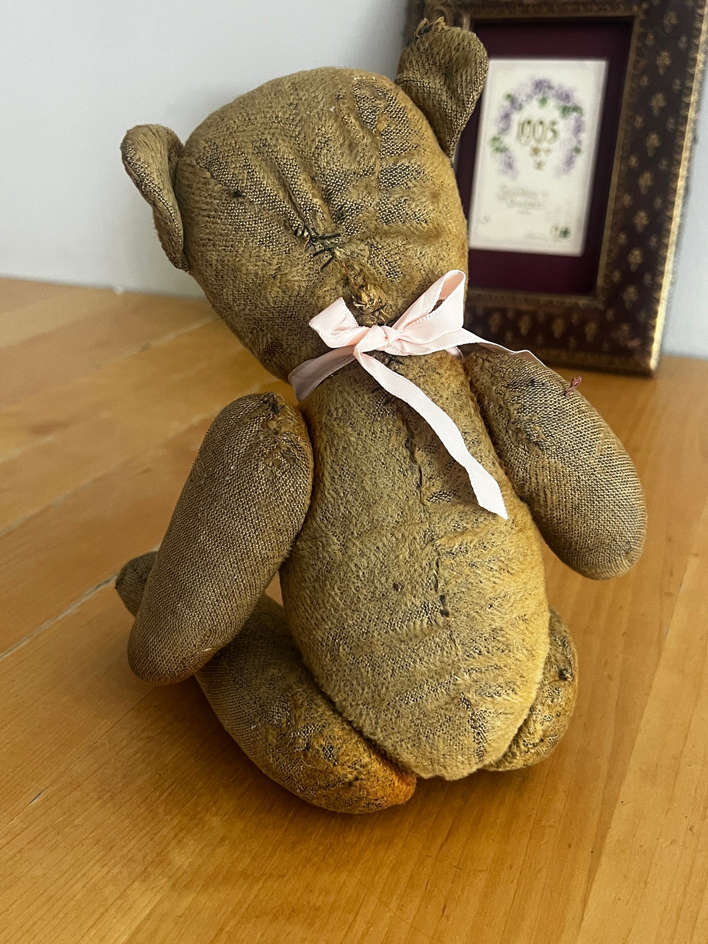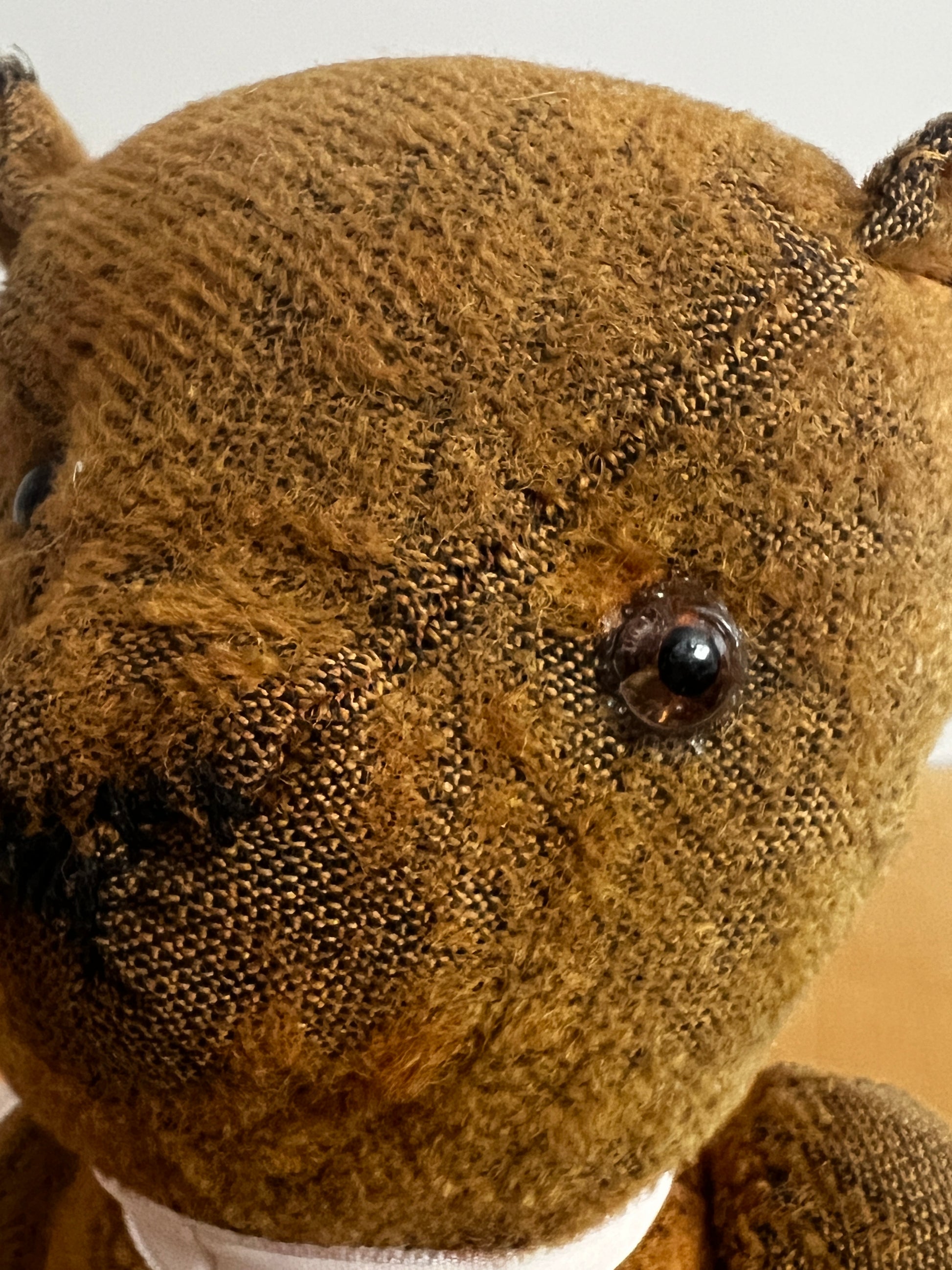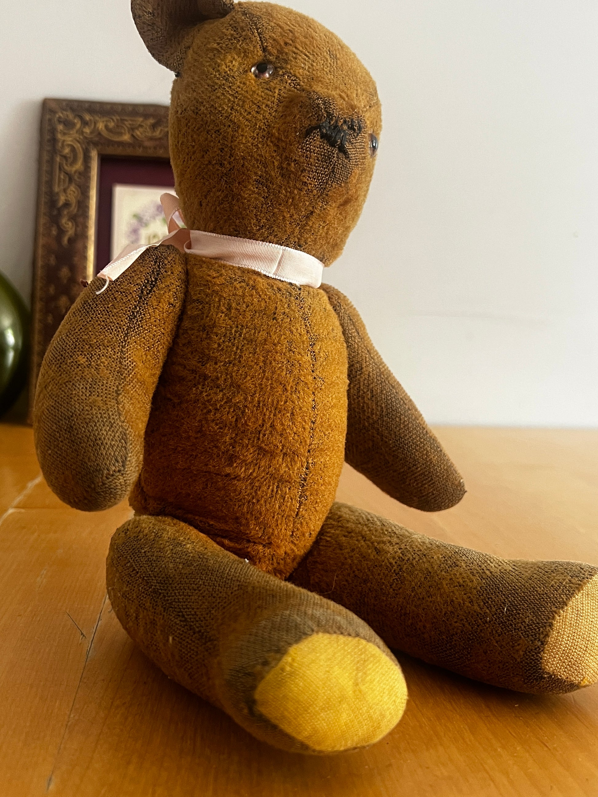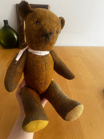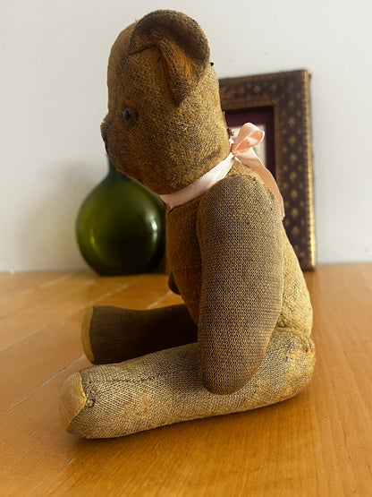 どこか愛嬌を感じさせる表情が魅力の、フランスのアンティークらしい風合いを持つクマのぬいぐるみです