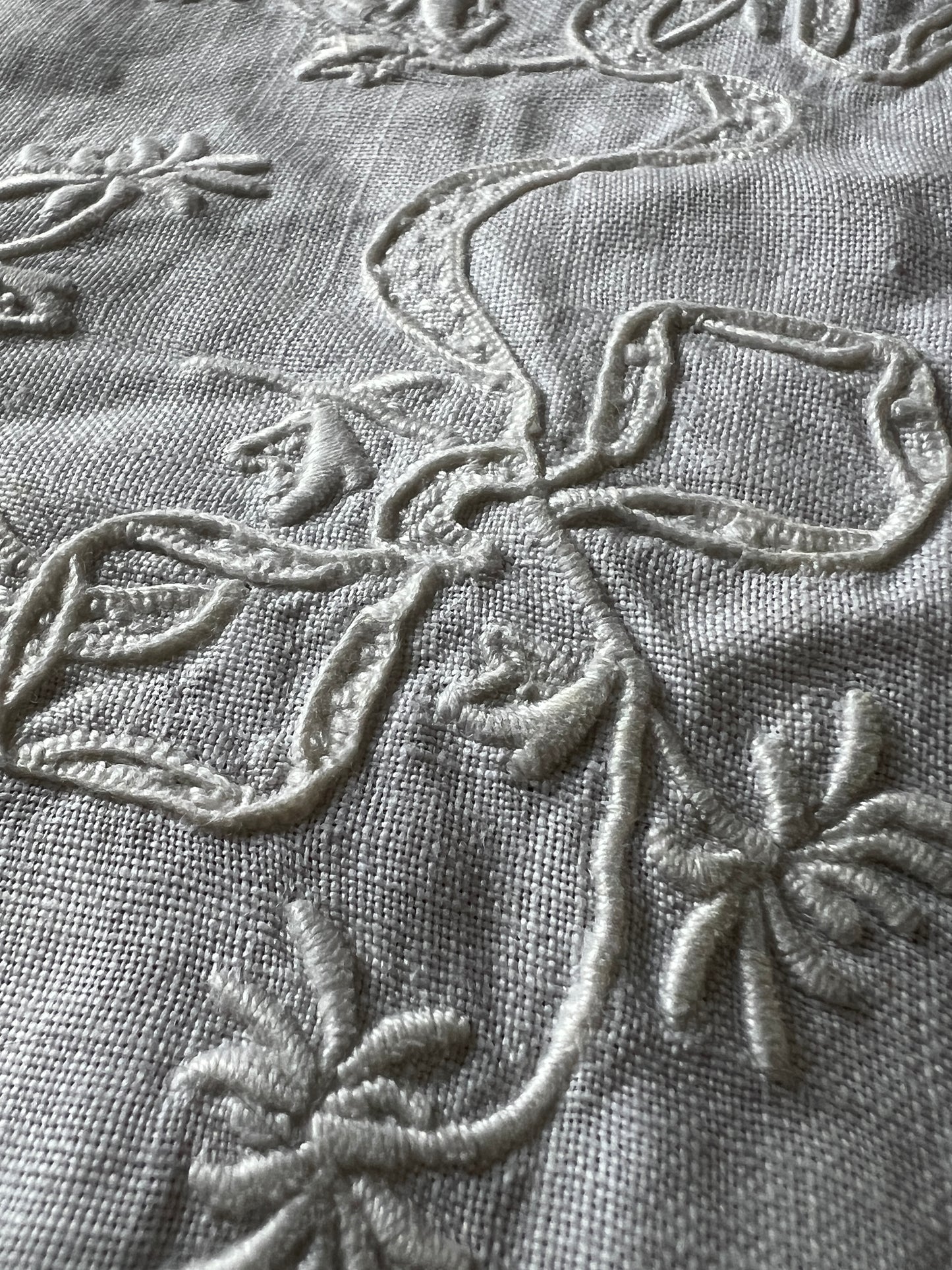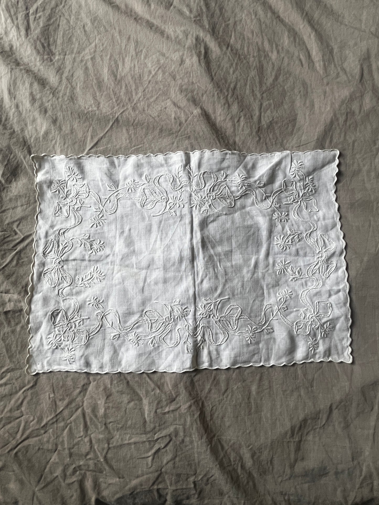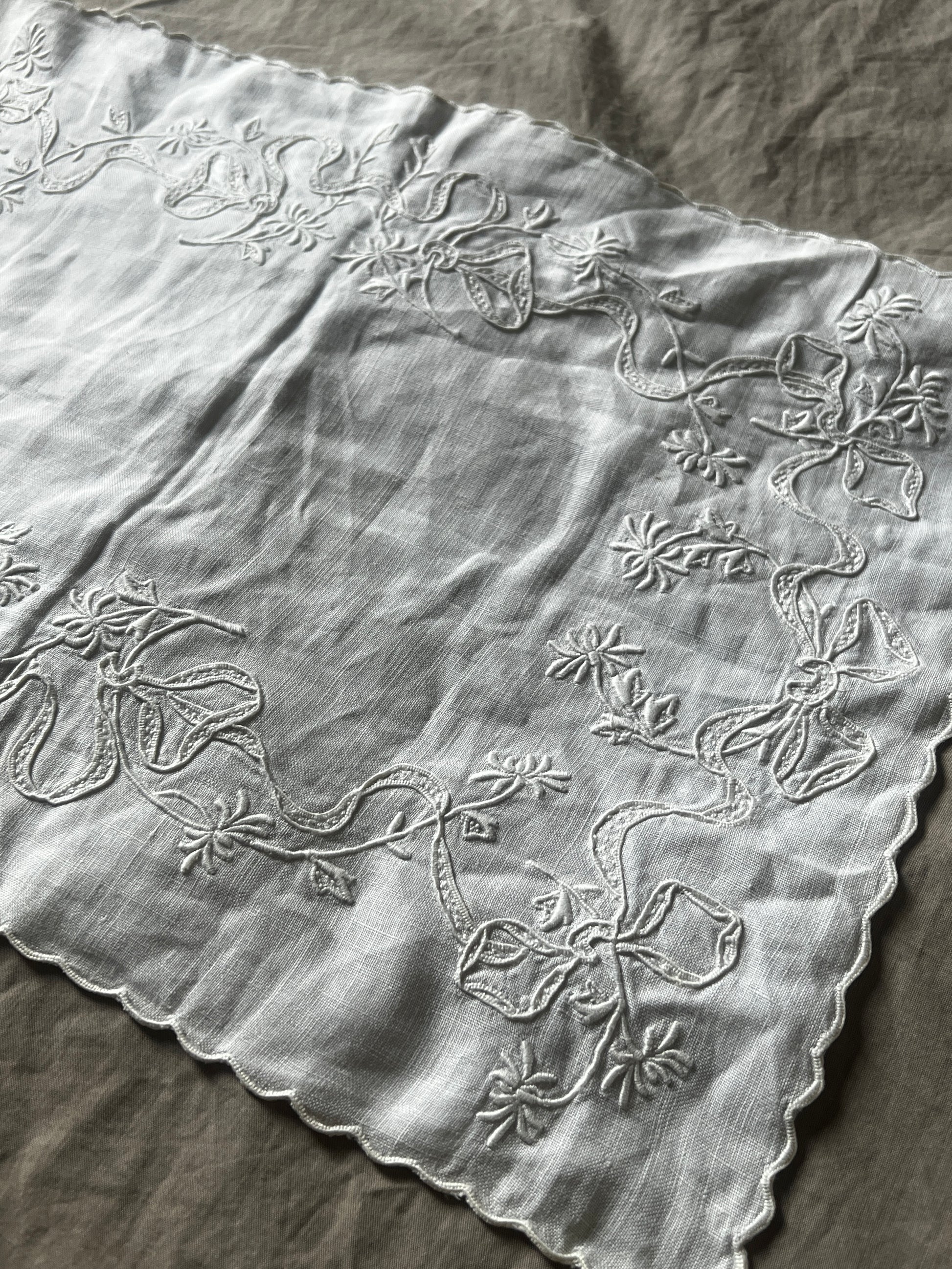 白刺繍でリボンと花が繊細に描かれた、エレガントな印象の長方形クロスです