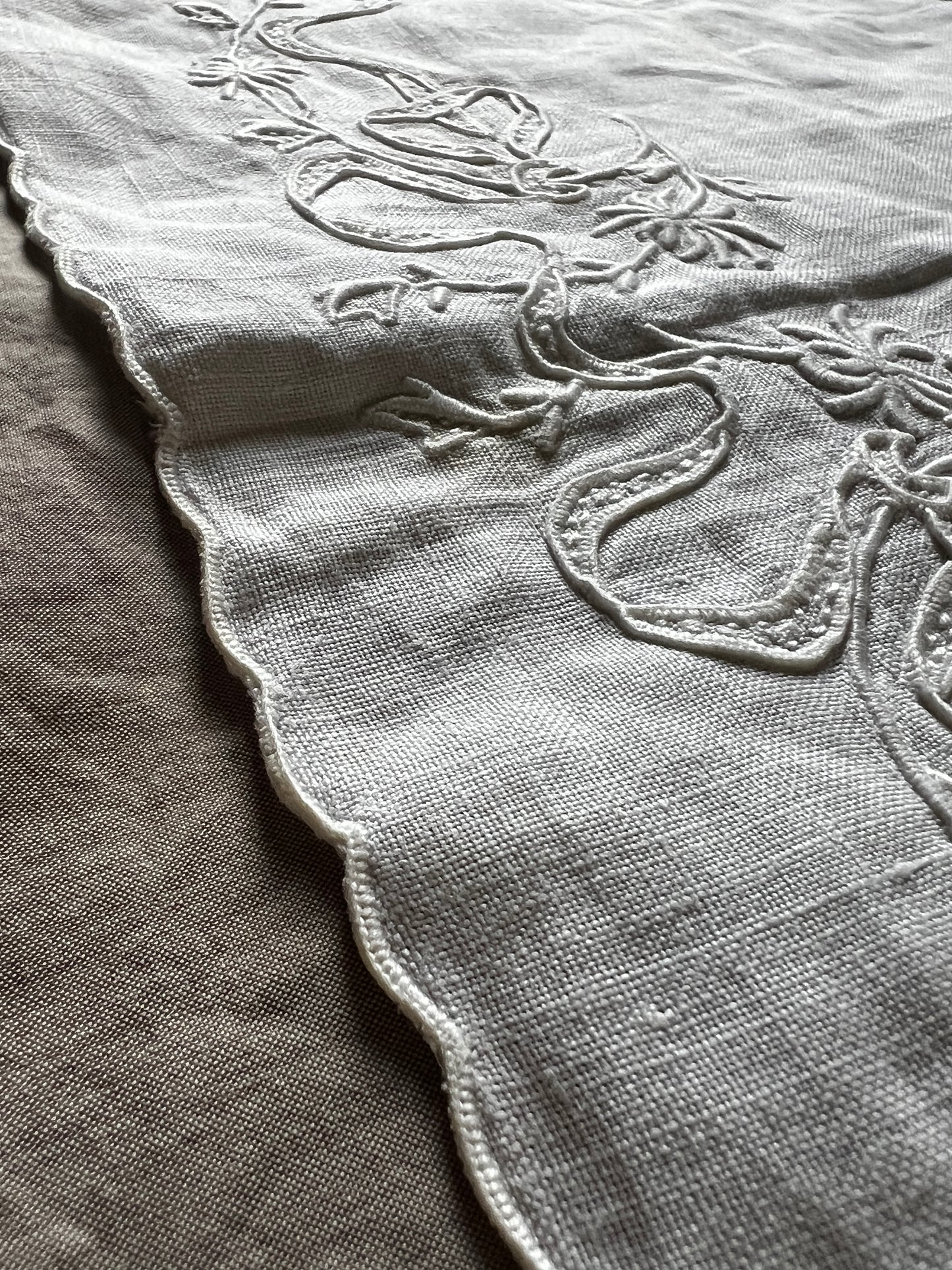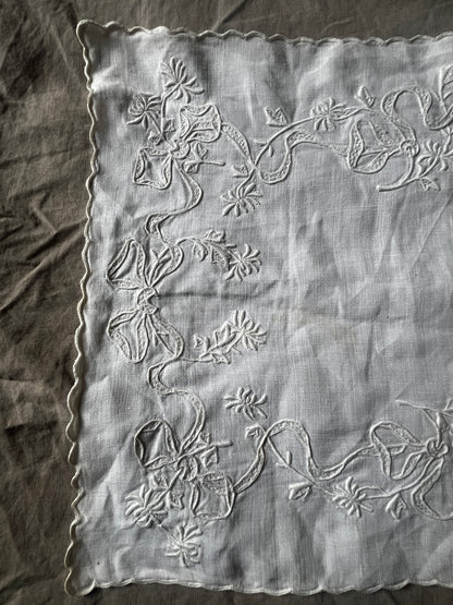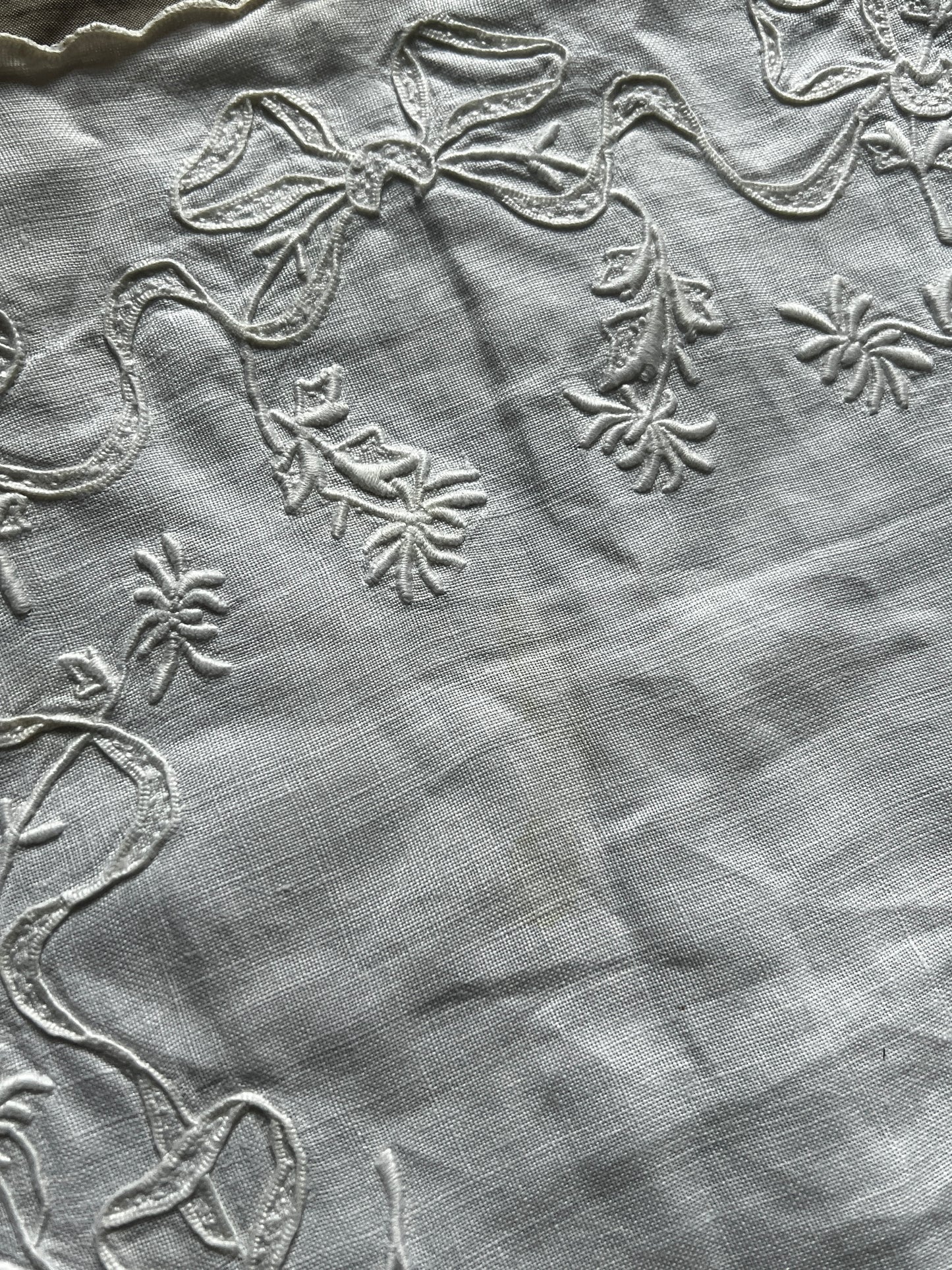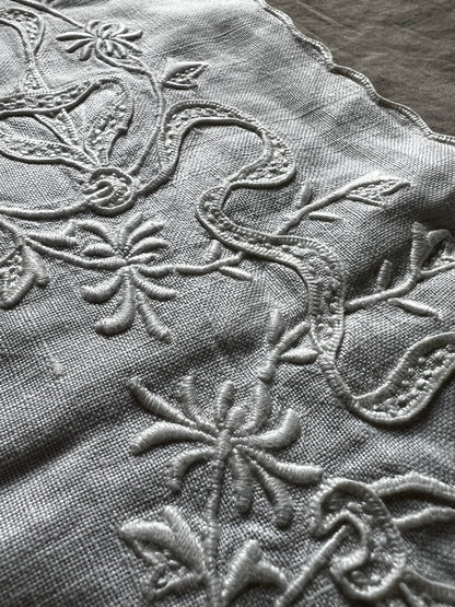 白刺繍でリボンと花が繊細に描かれた、エレガントな印象の長方形クロスです