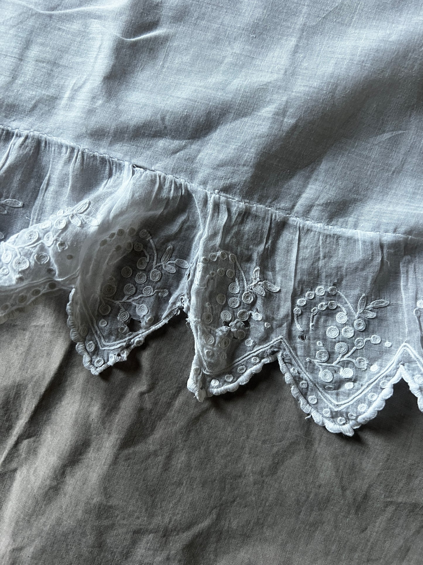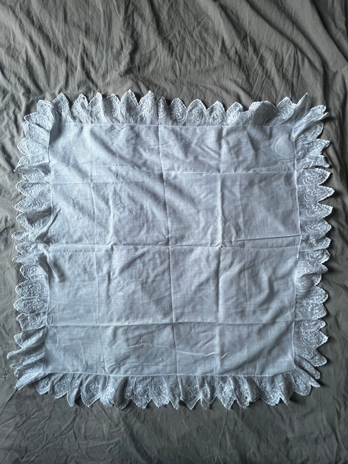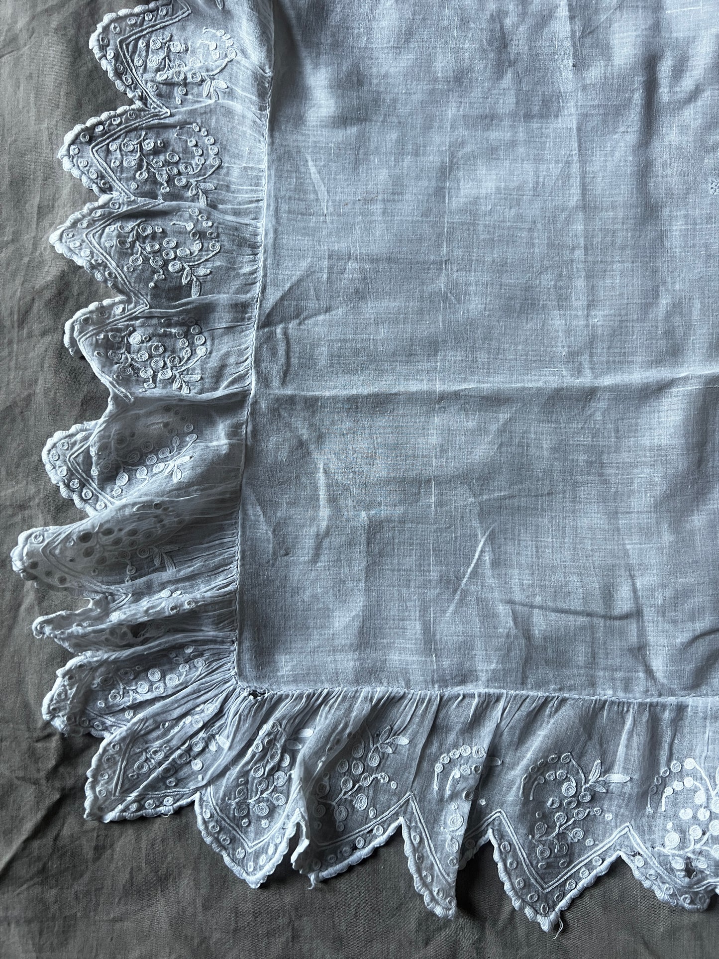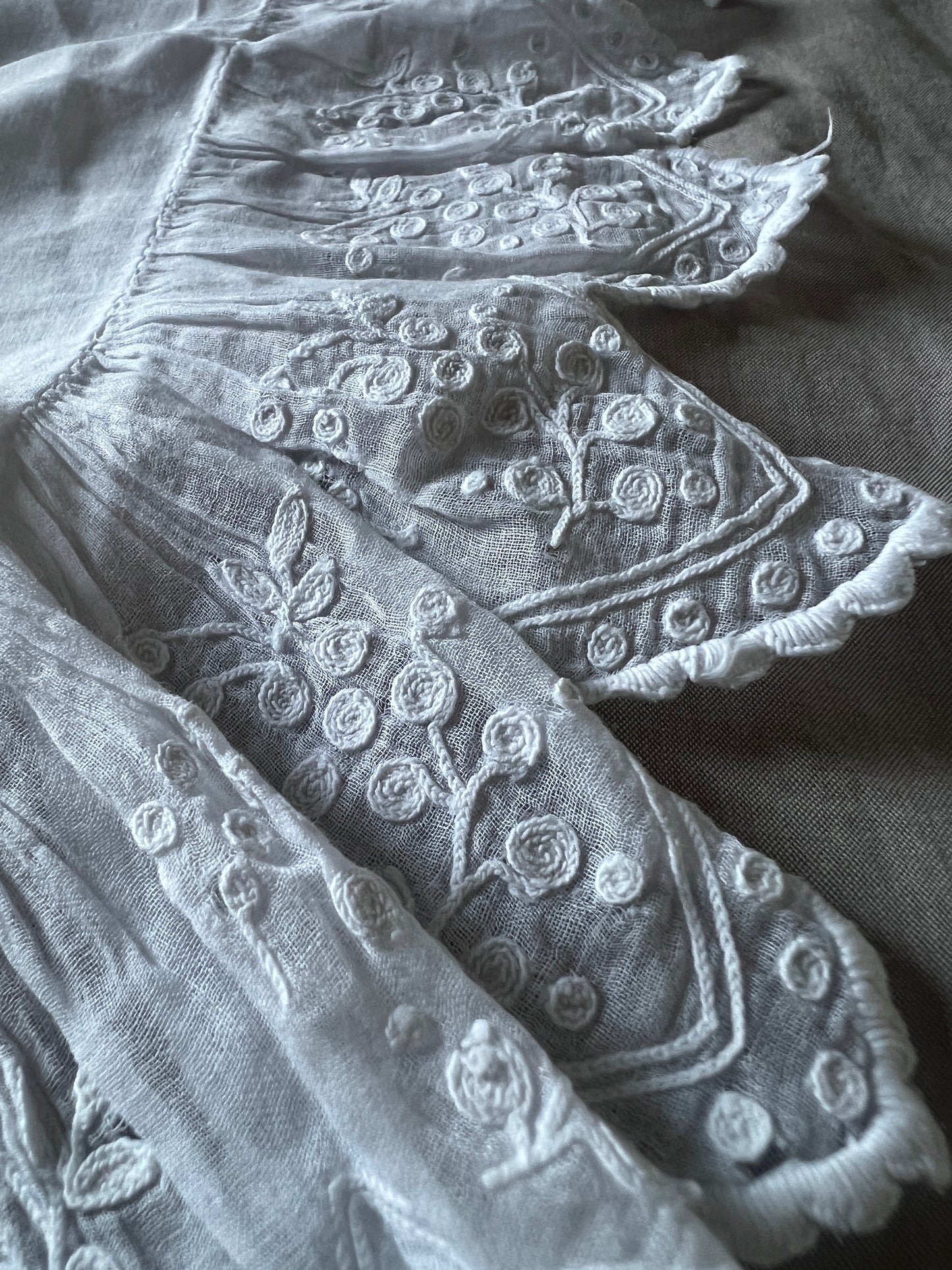 周囲にはスカラップの刺繍が施され、フリルのようにふんわりと縁取られた、可憐な印象の一枚