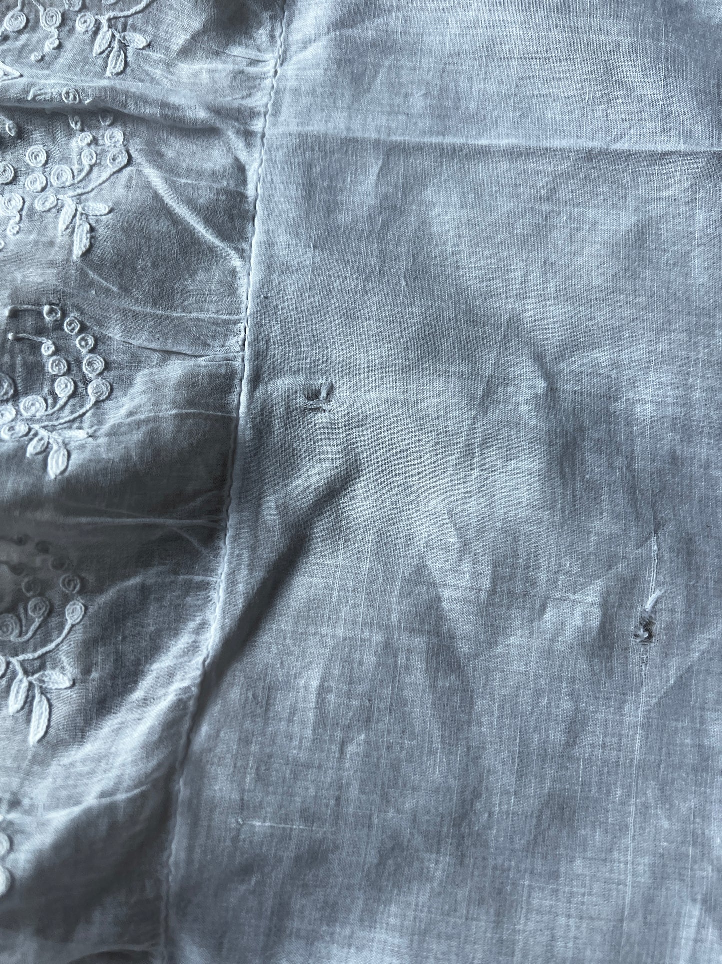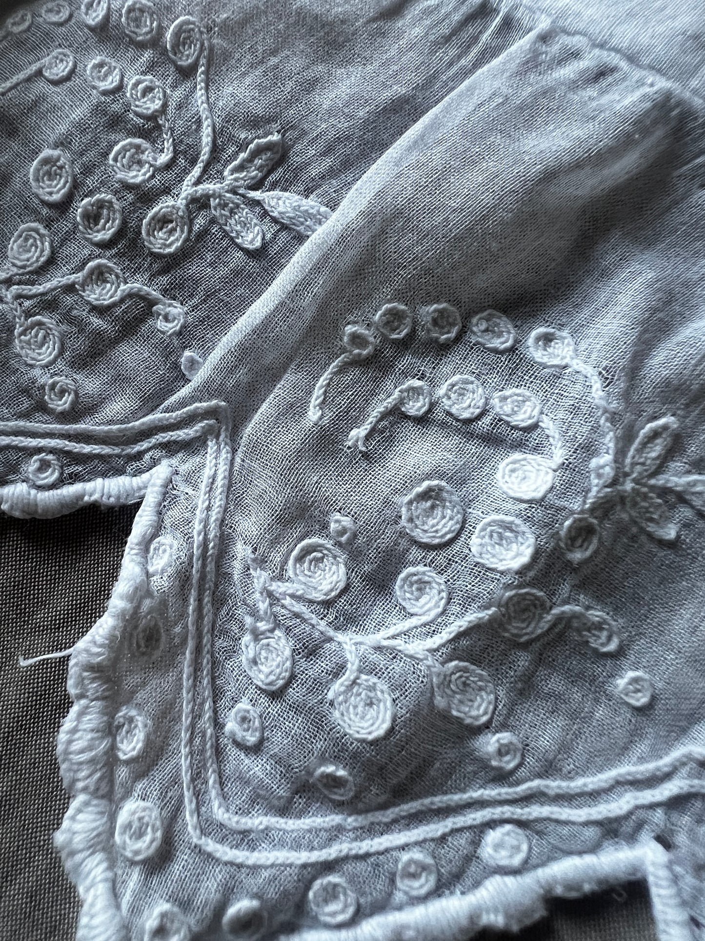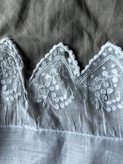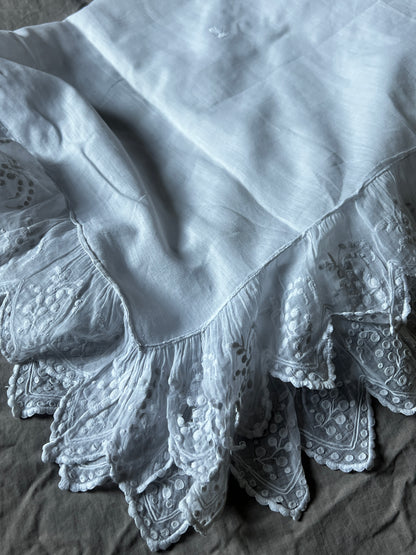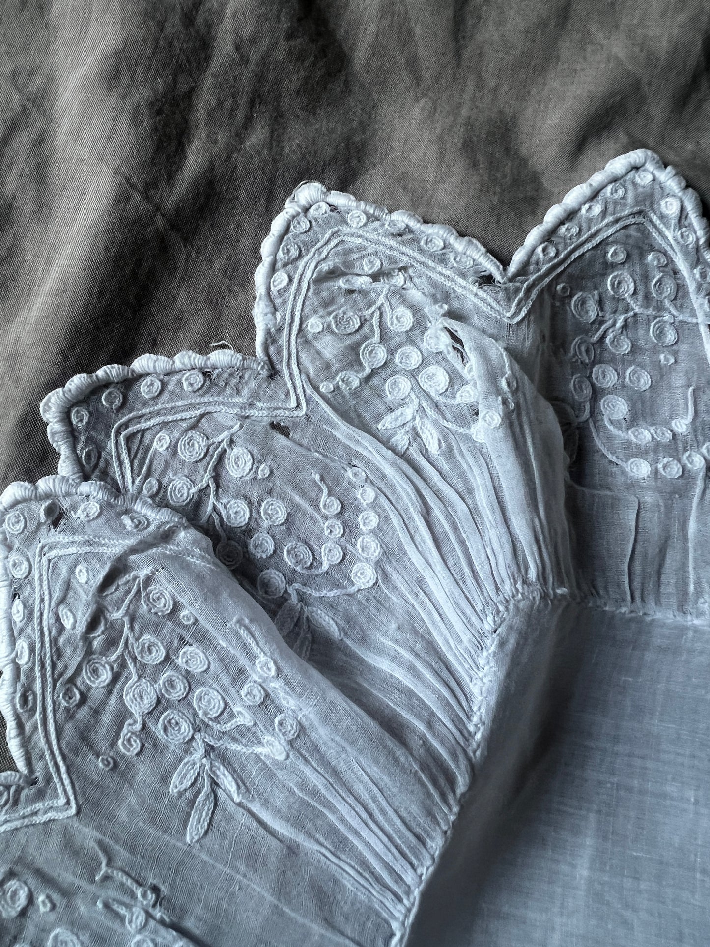 周囲にはスカラップの刺繍が施され、フリルのようにふんわりと縁取られた、可憐な印象の一枚
