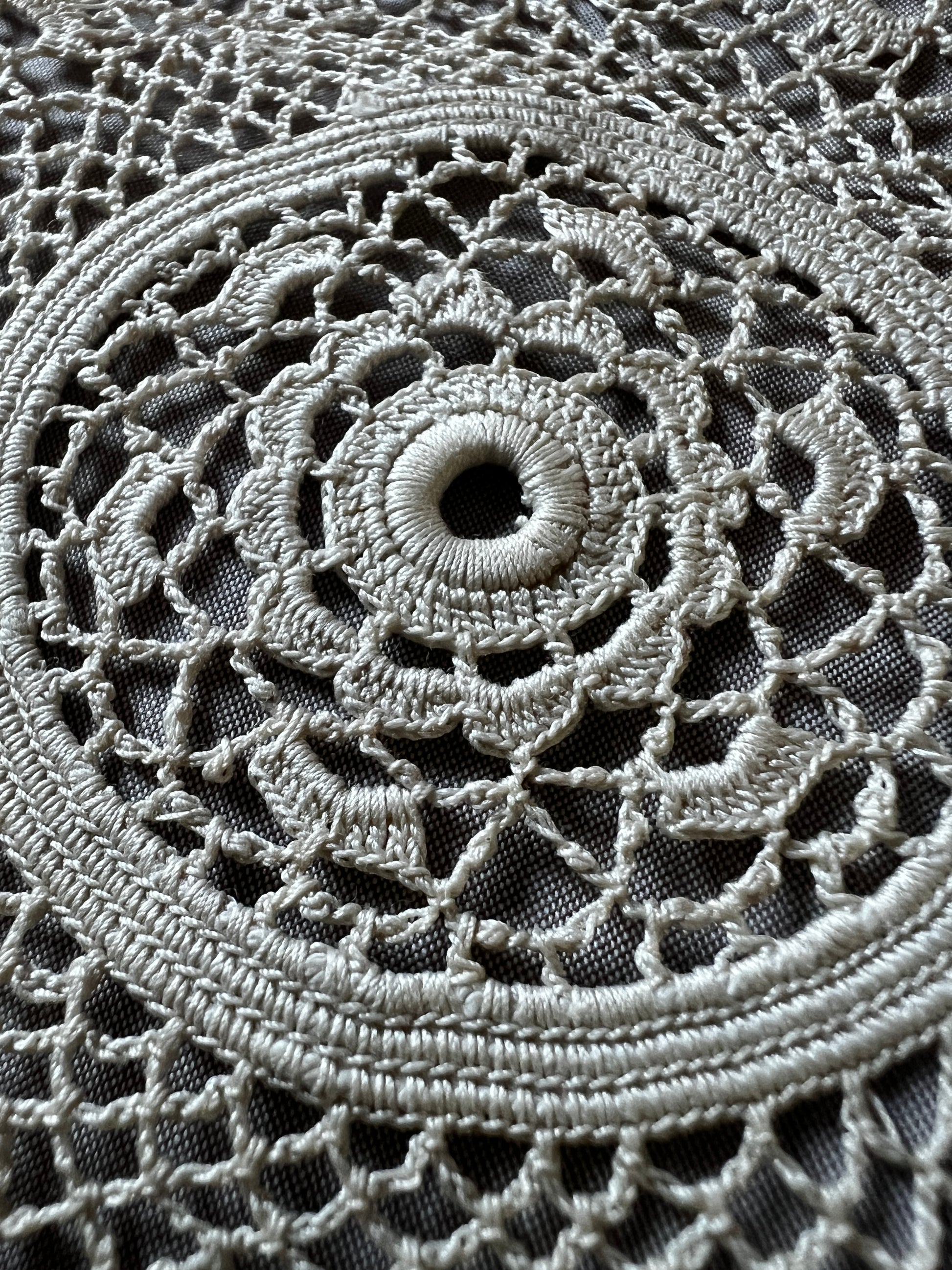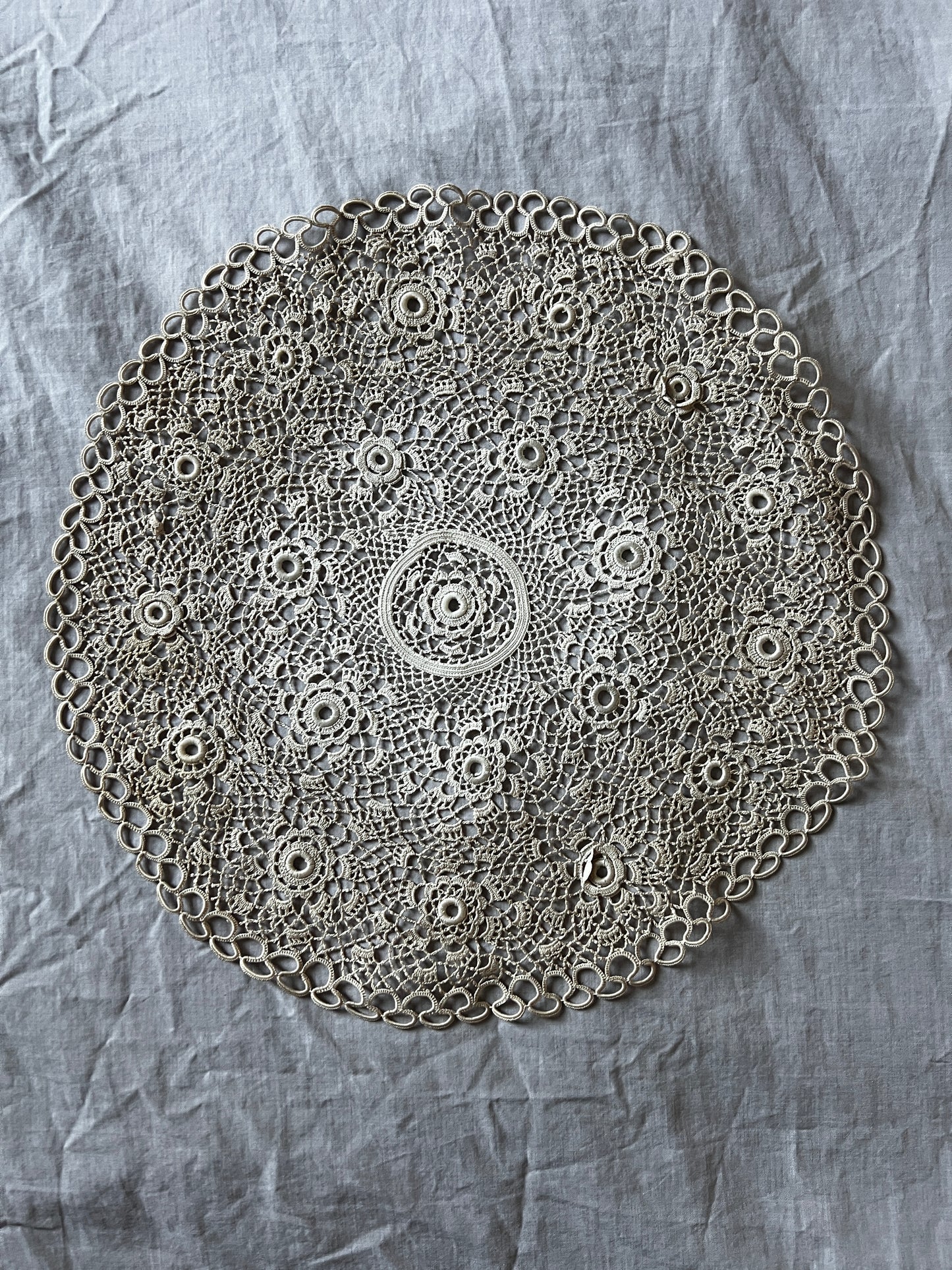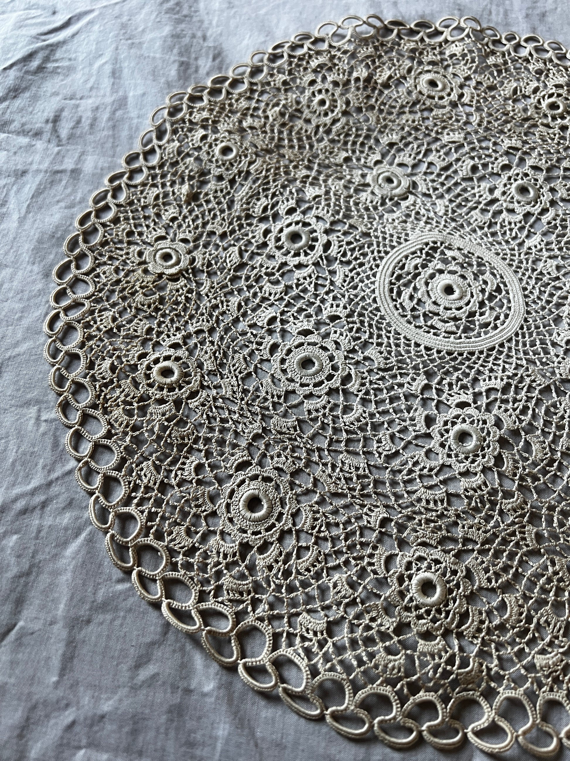 極細糸で丁寧に編まれたクロシェレースの円形ドイリーです