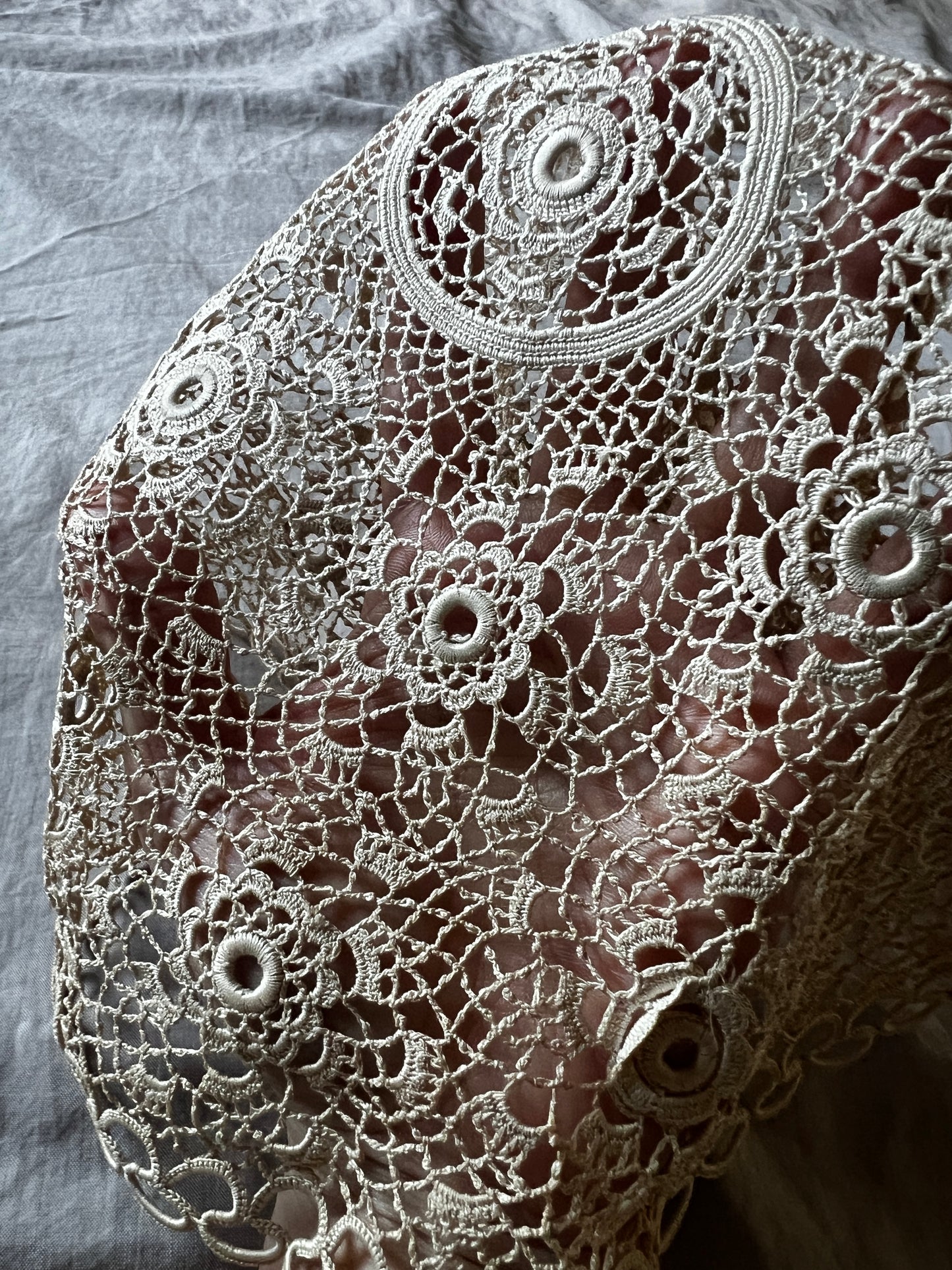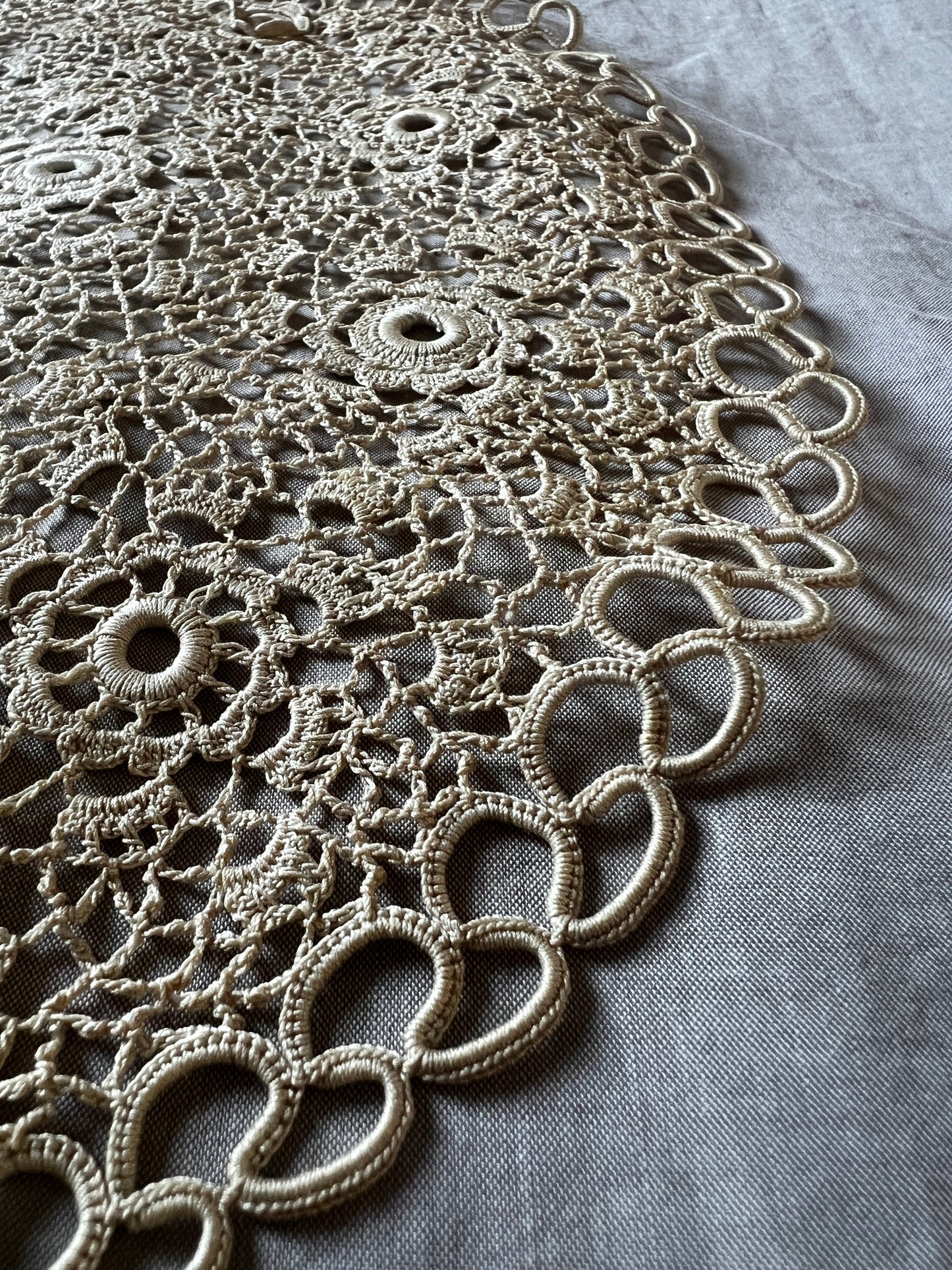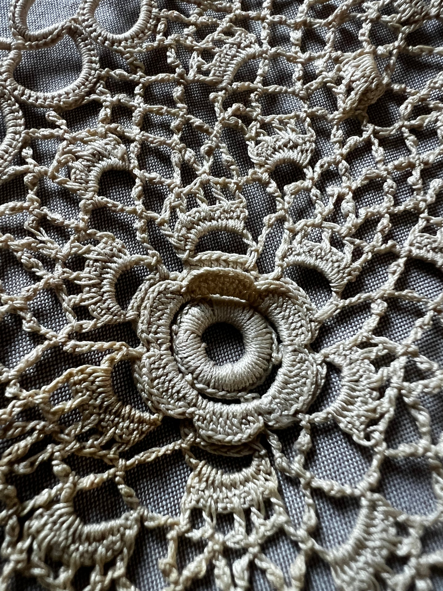 極細糸で丁寧に編まれたクロシェレースの円形ドイリーです