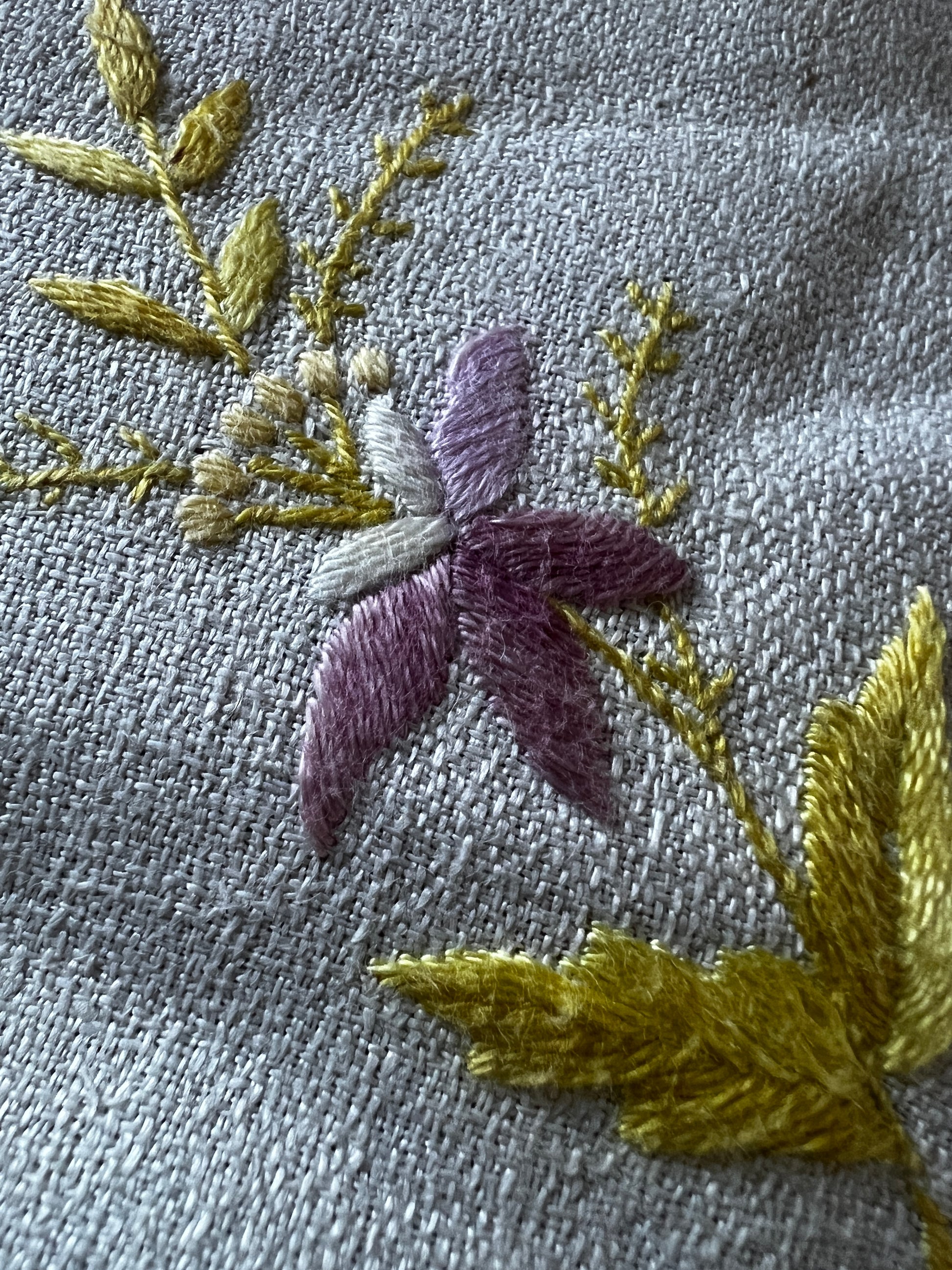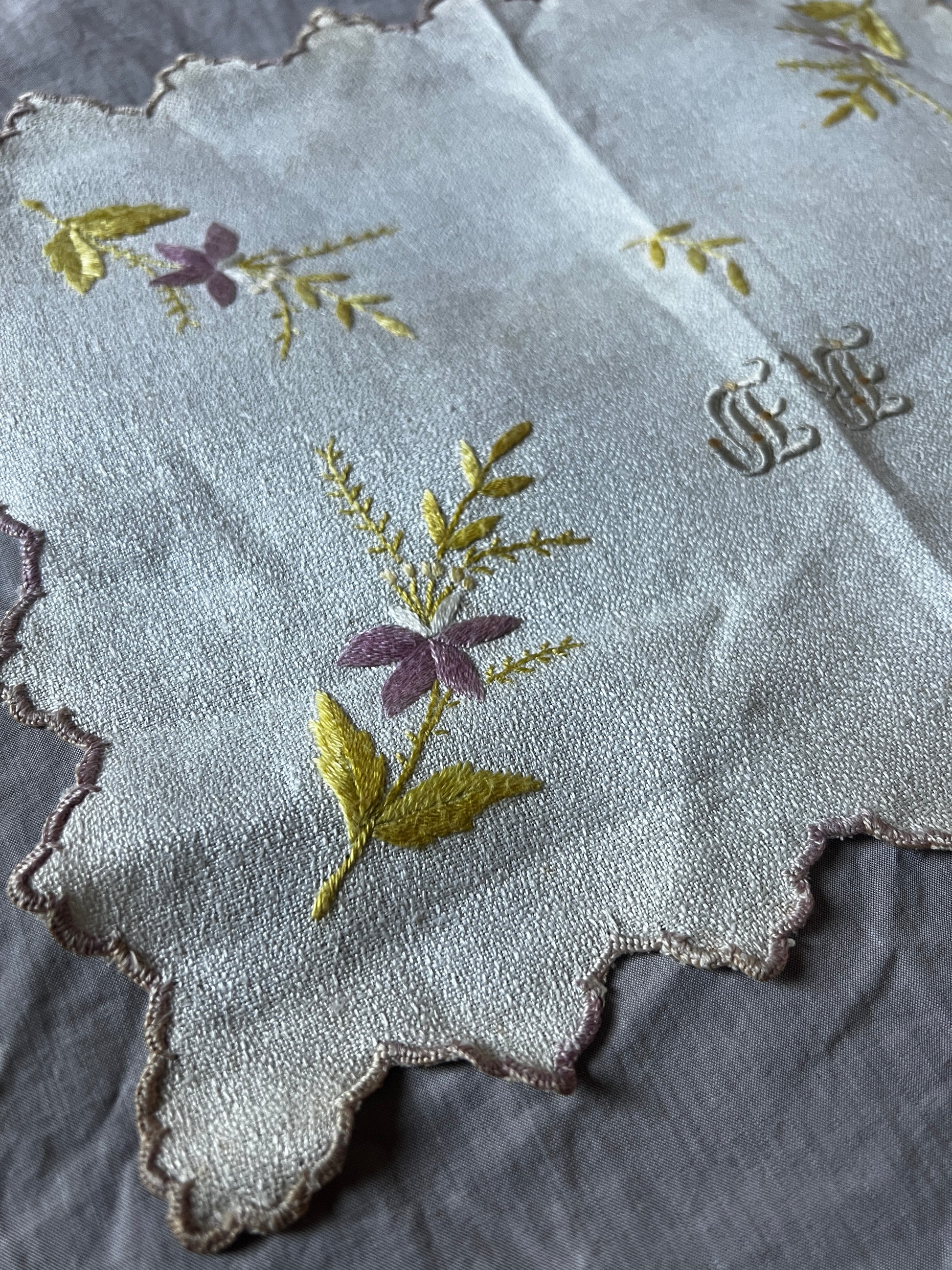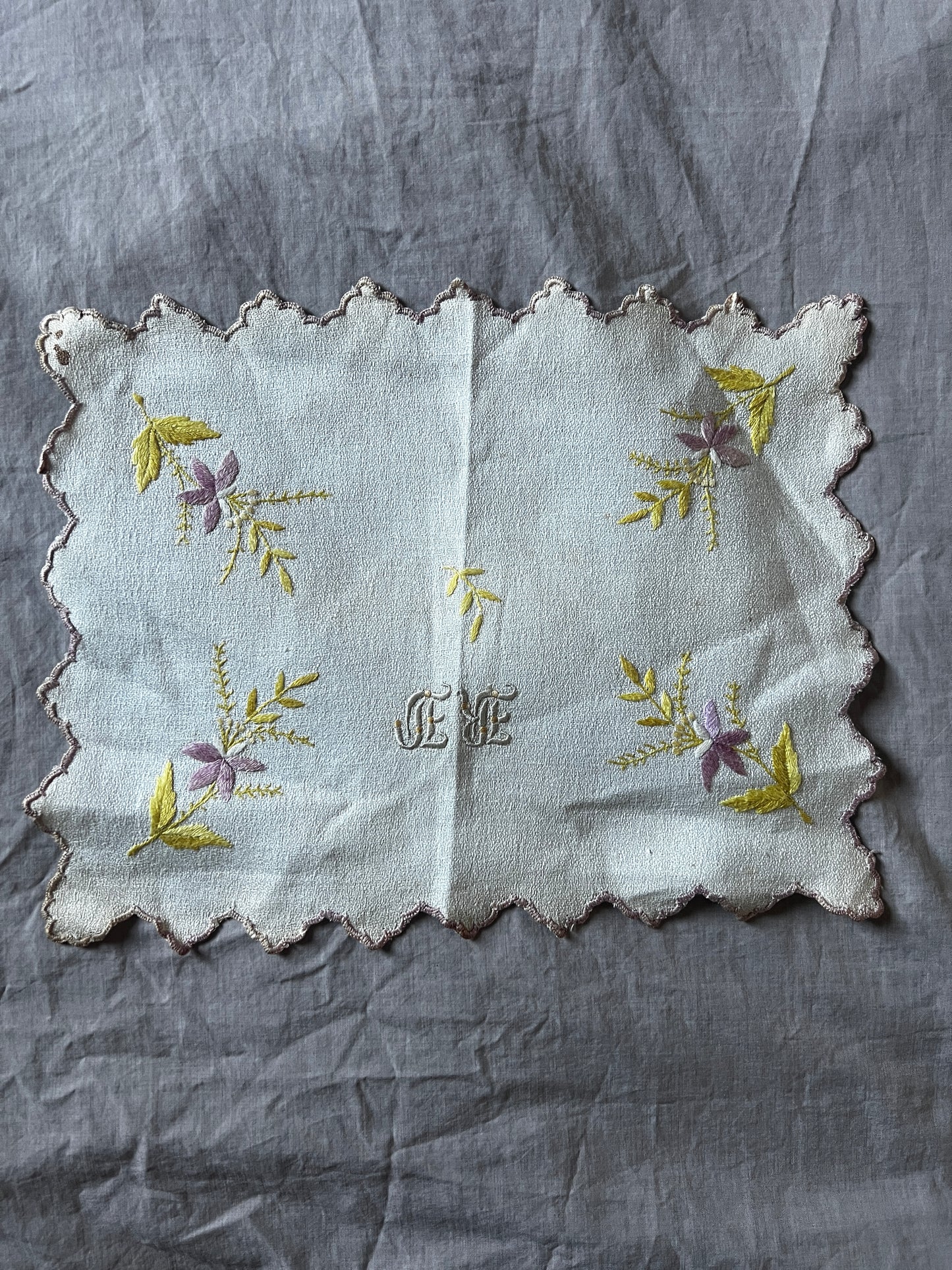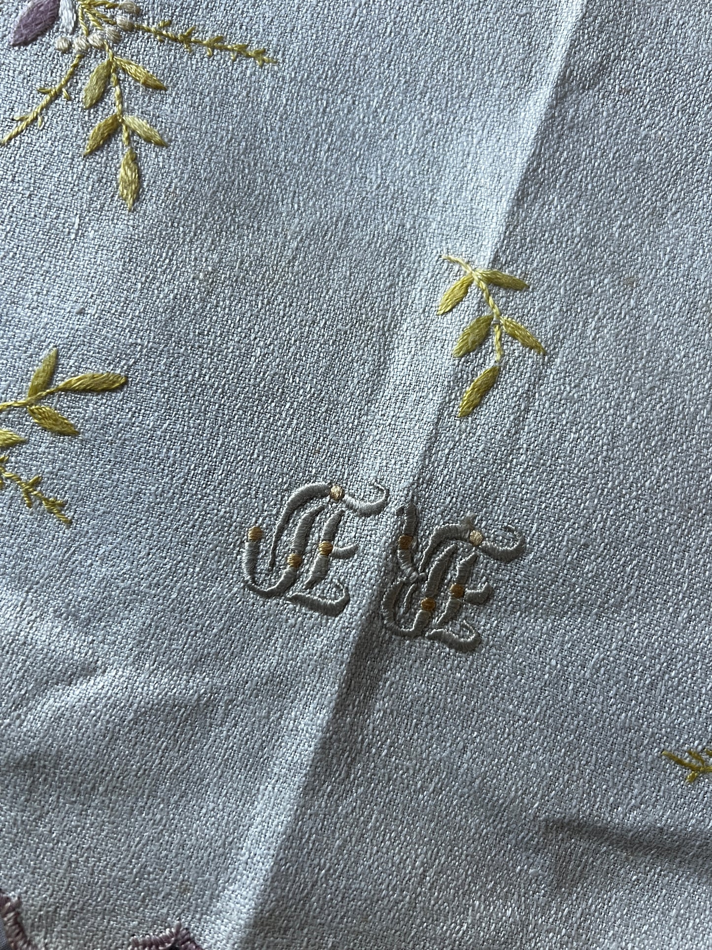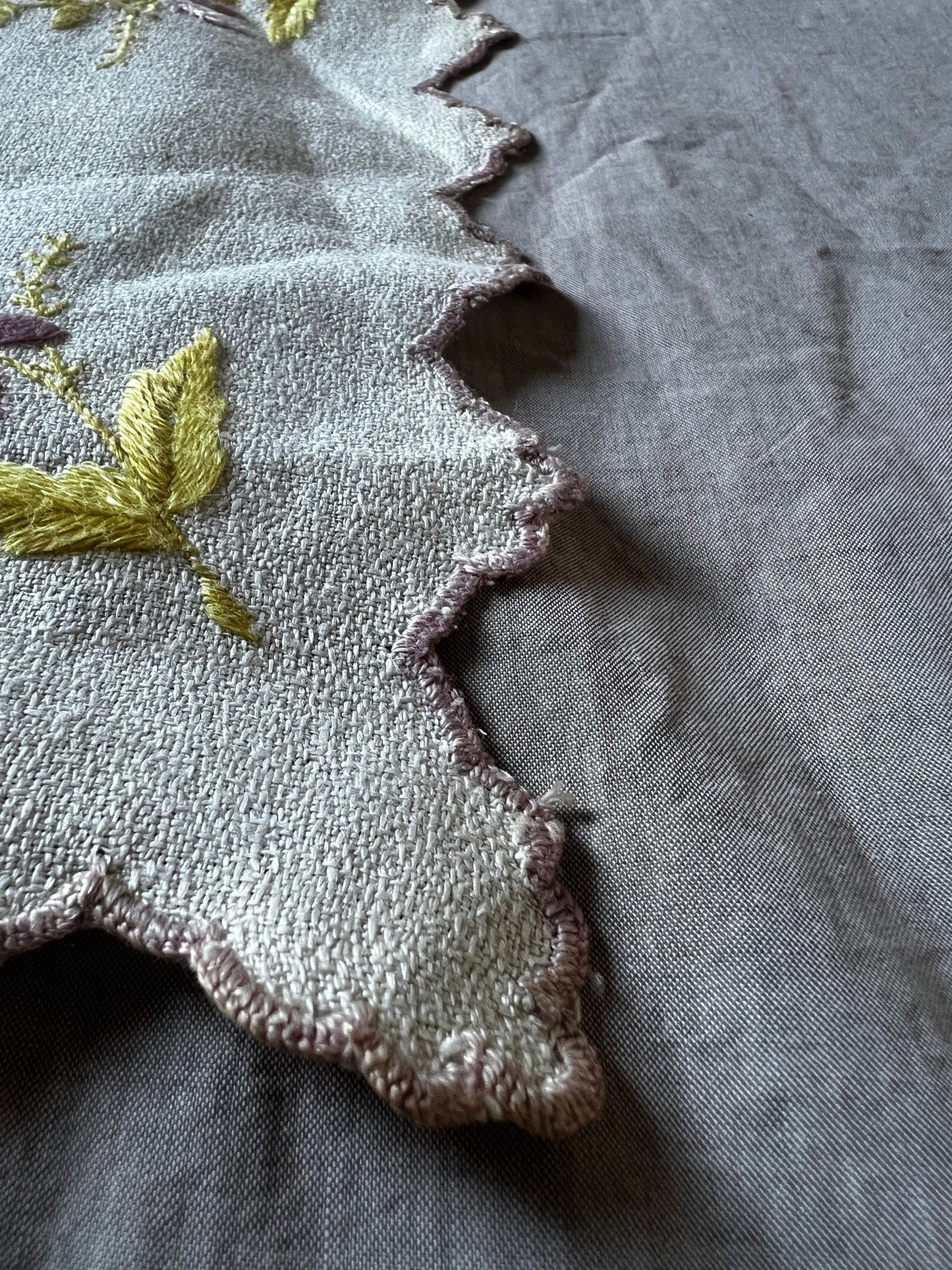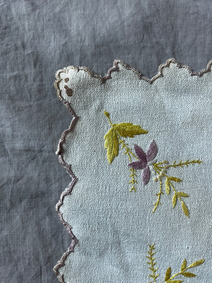 淡く優しい色合いの糸で花の刺繍が施された、愛らしい雰囲気の刺繍クロスです