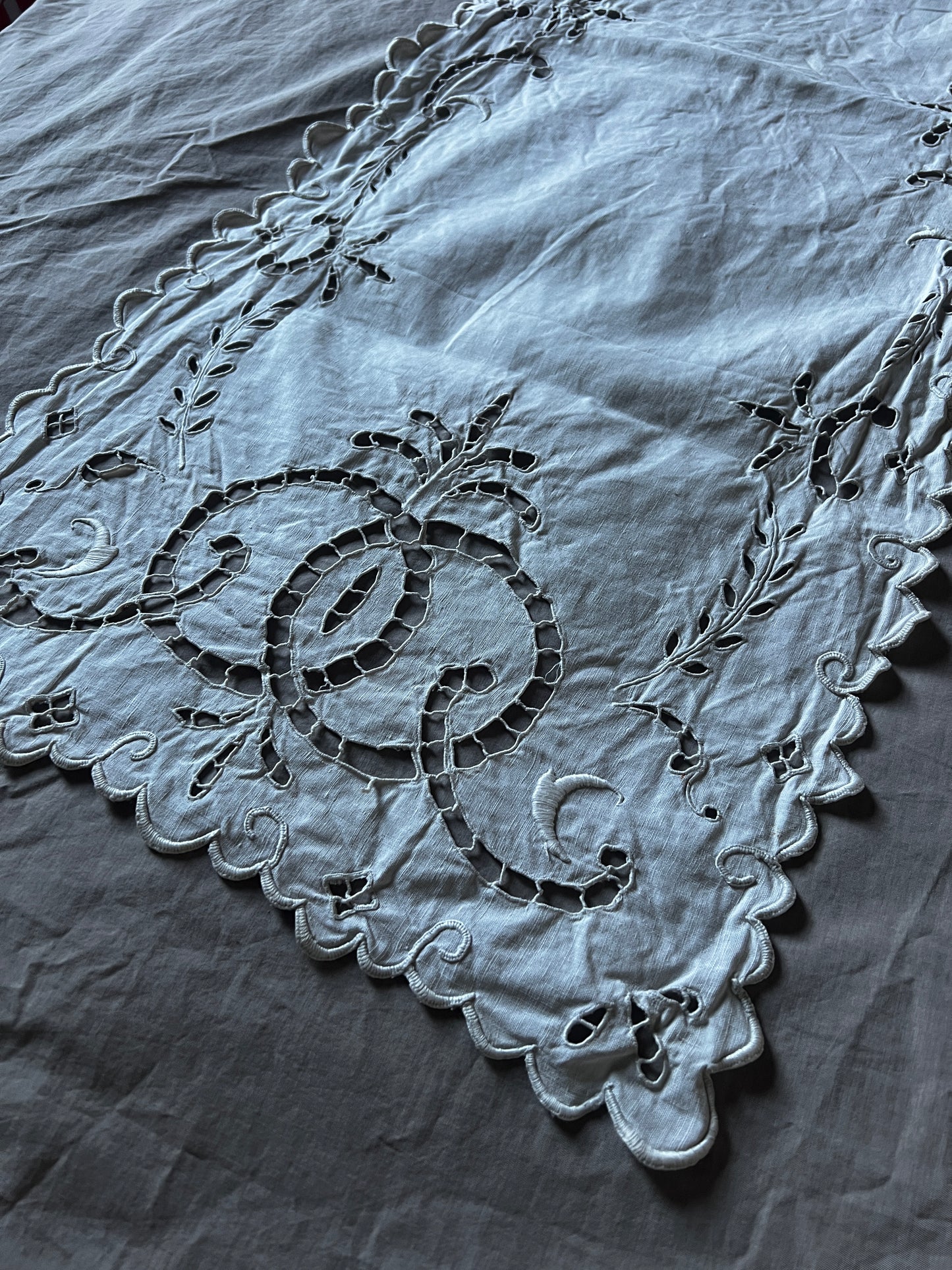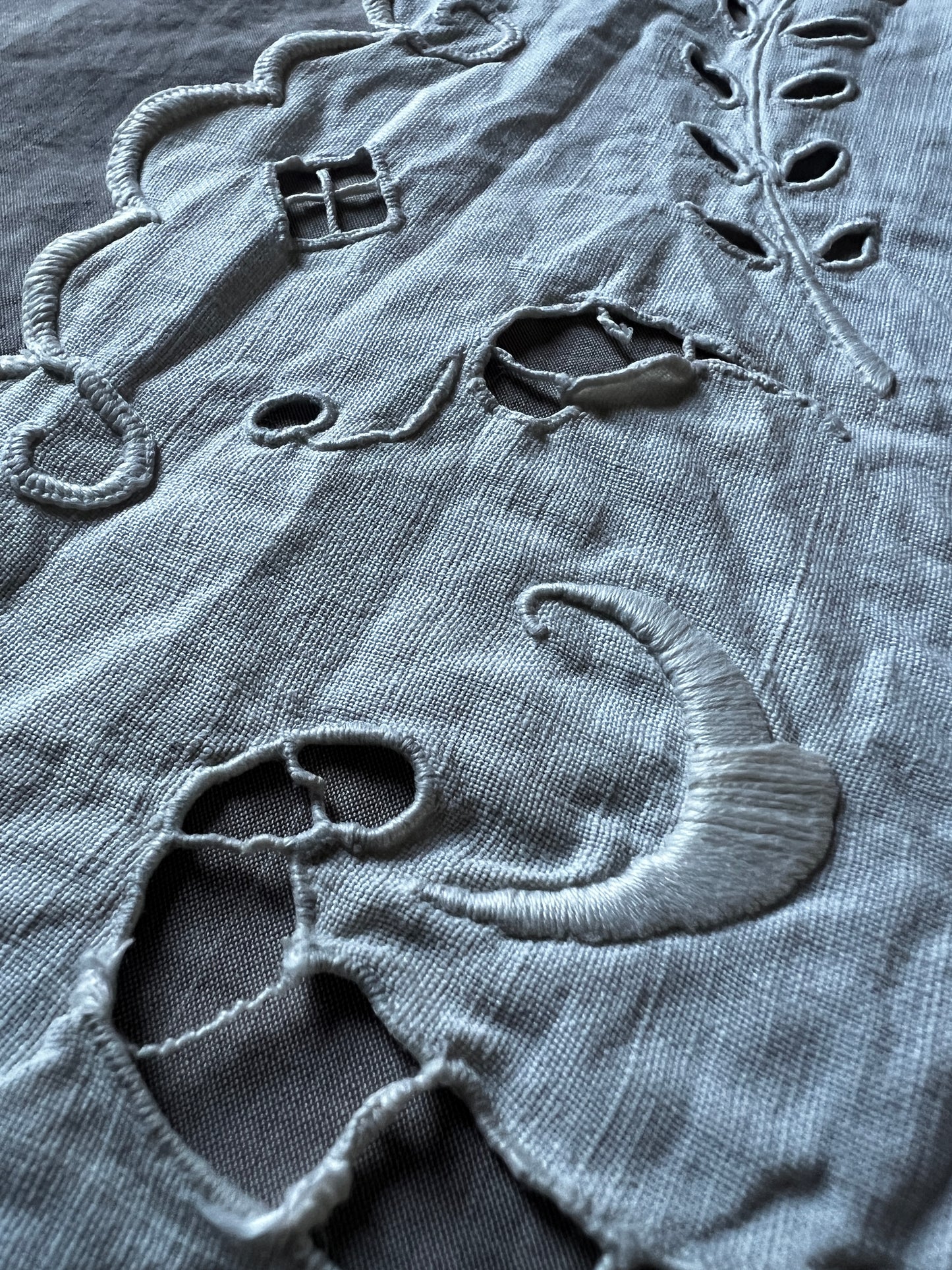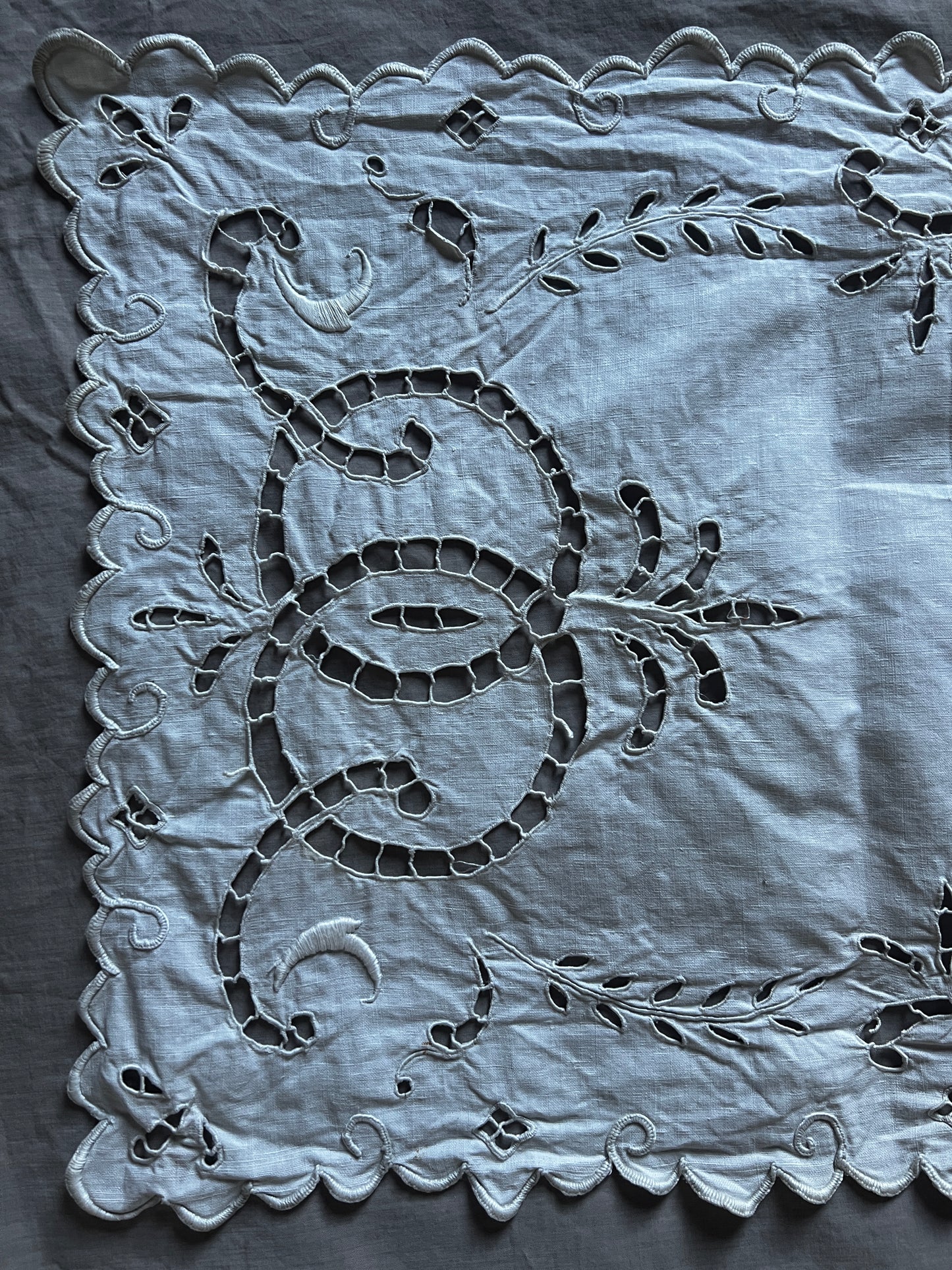 縁はスカラップに沿って刺繍で縁取られており、丁寧な手仕事の雰囲気が漂います