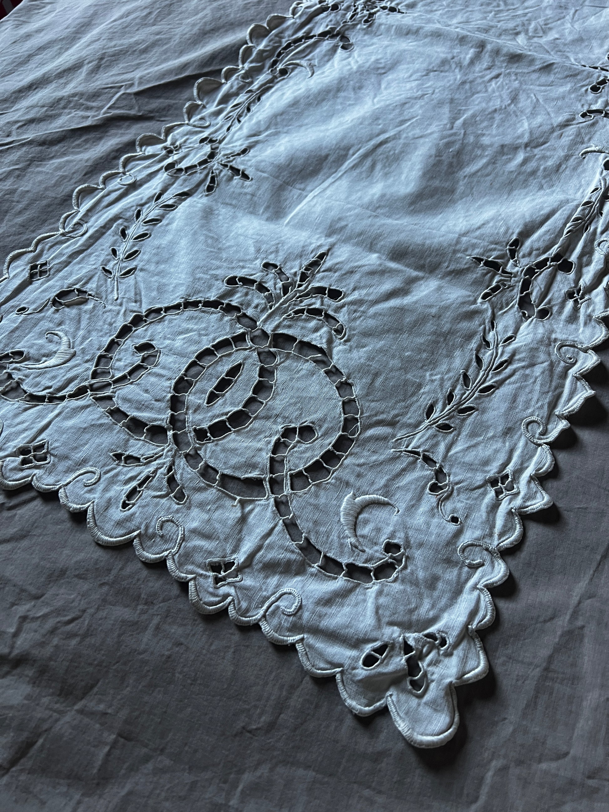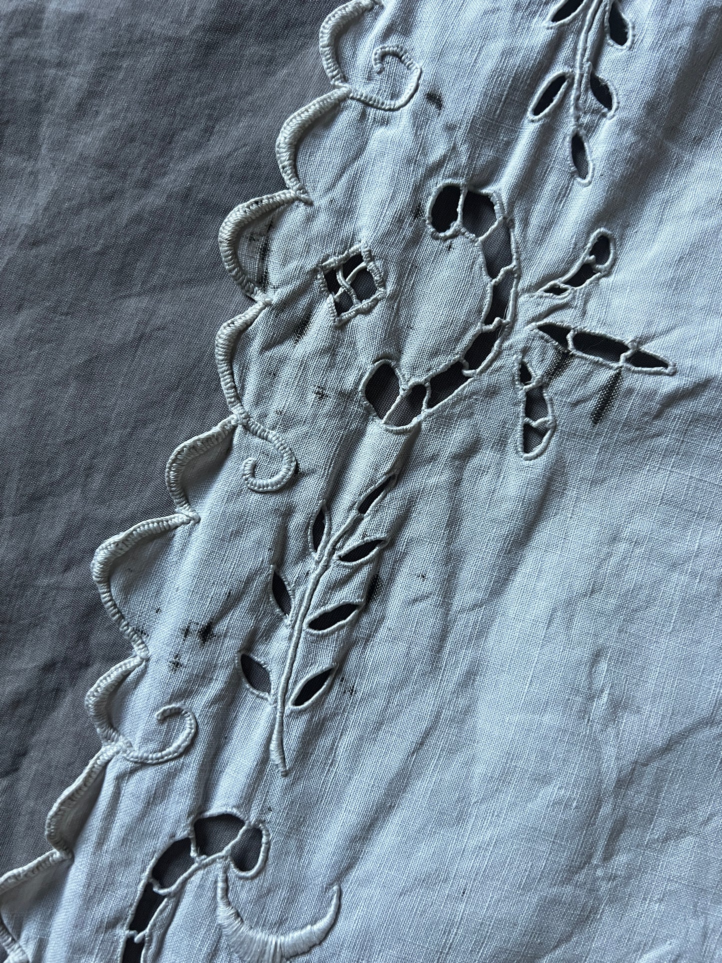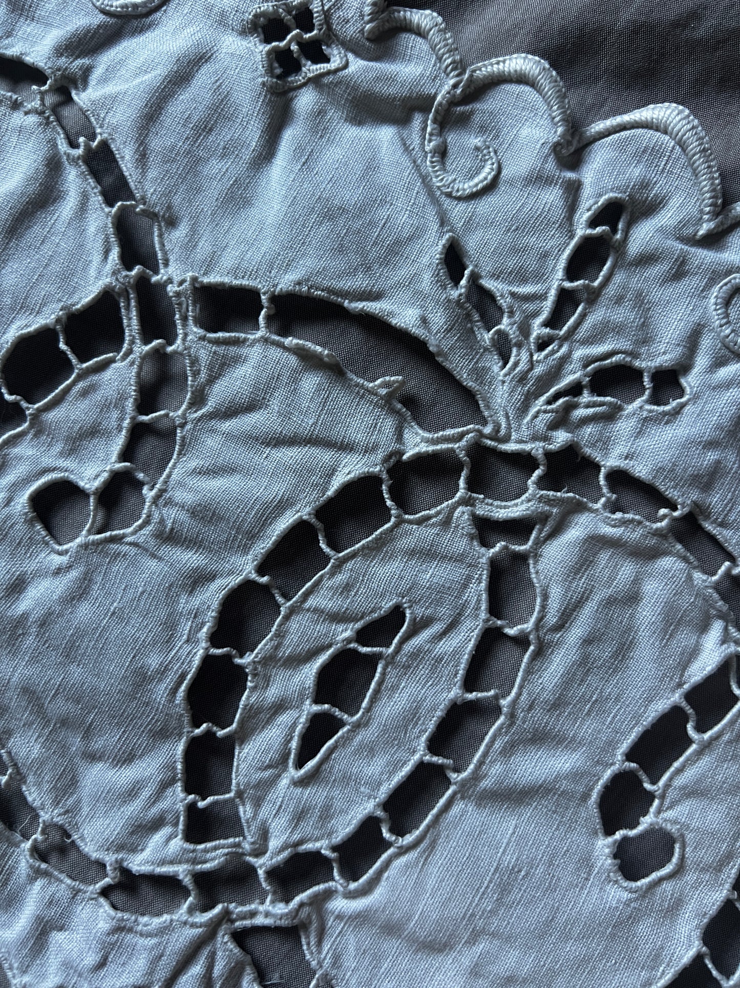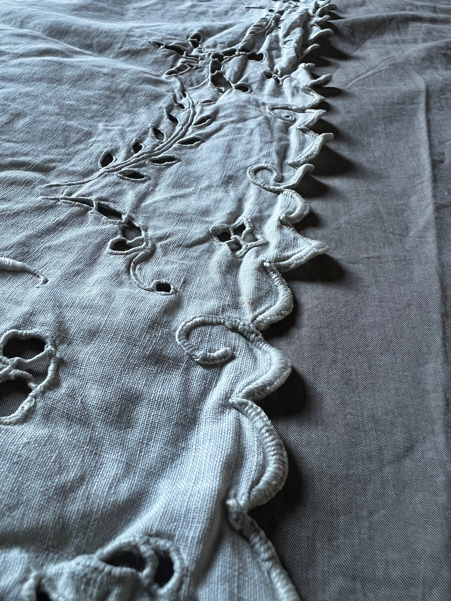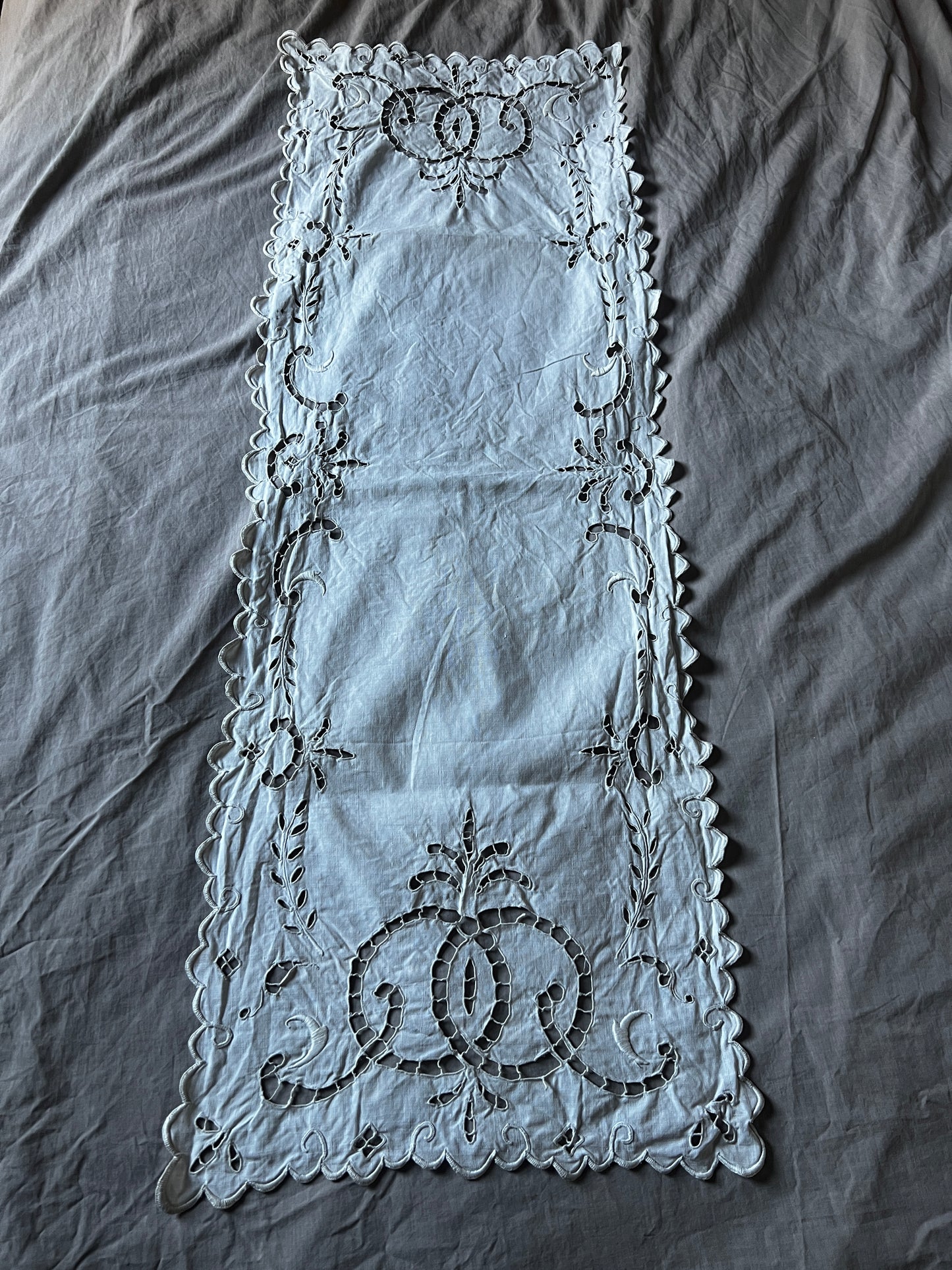 カットワーク刺繍が施された、細長い長方形のテーブルセンター風クロスです