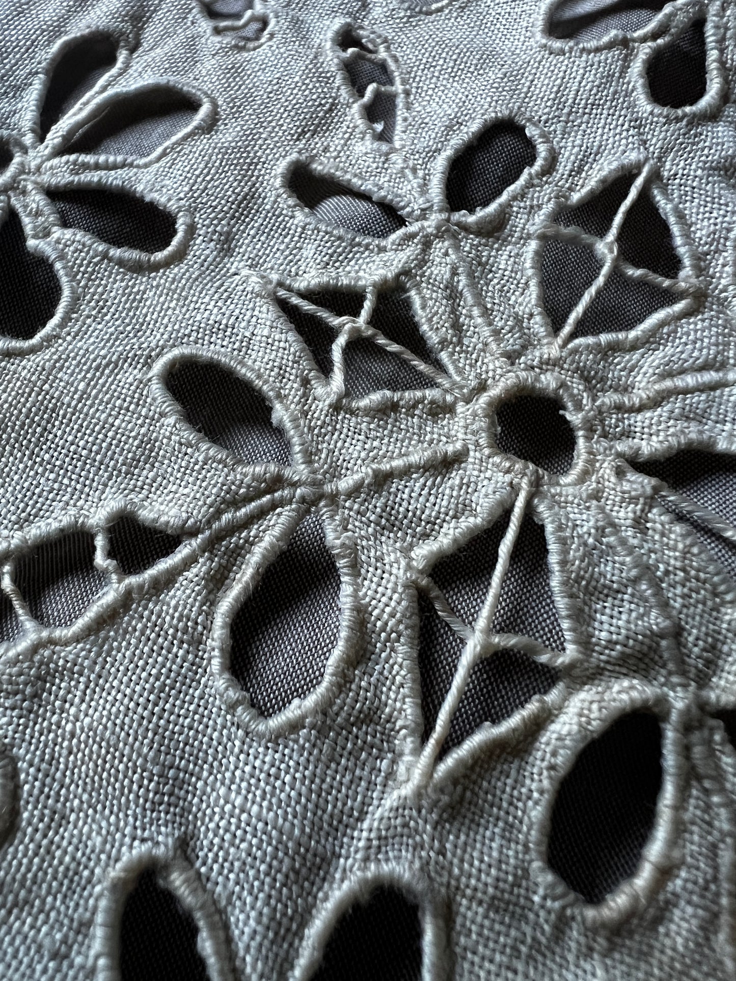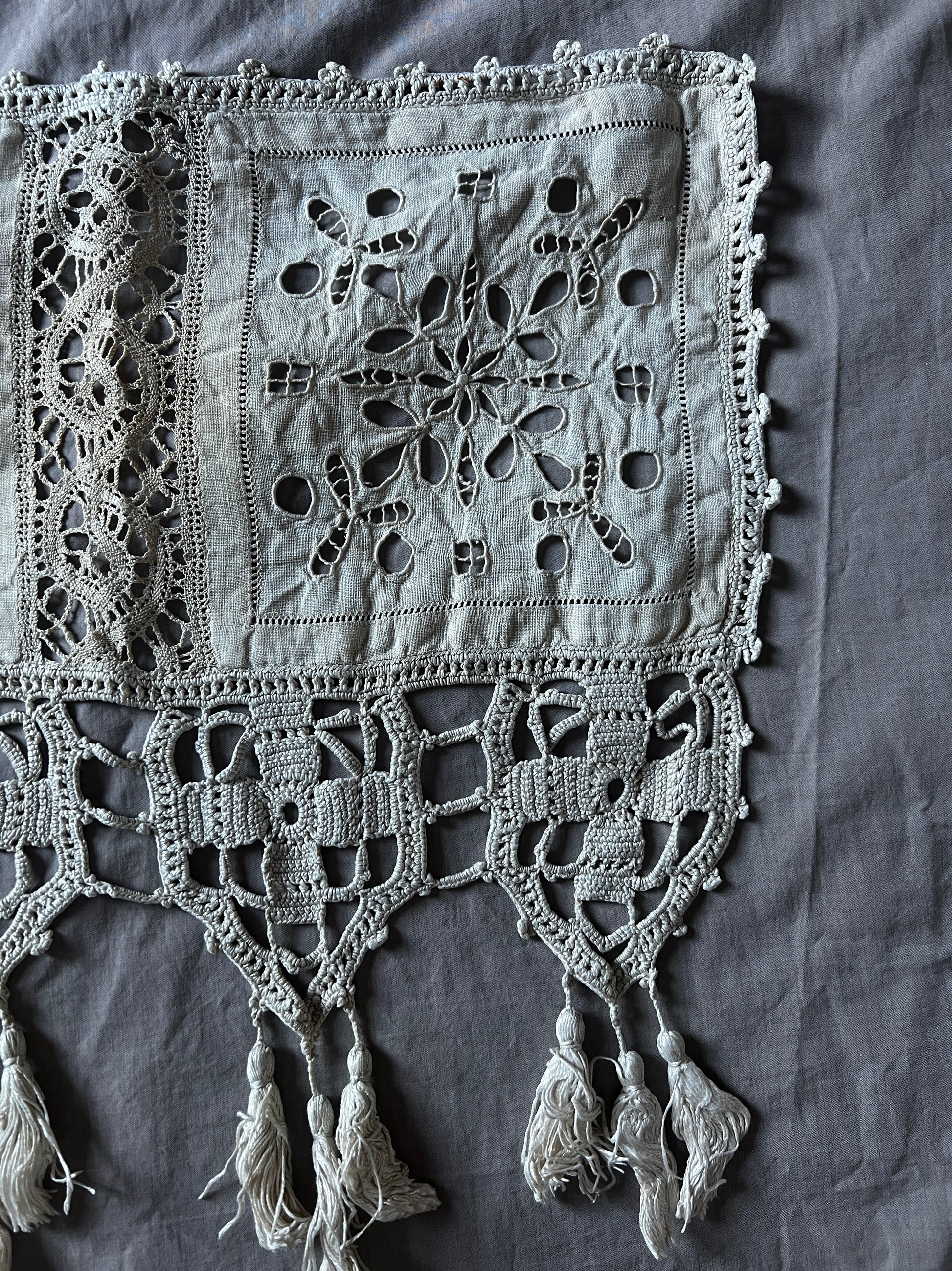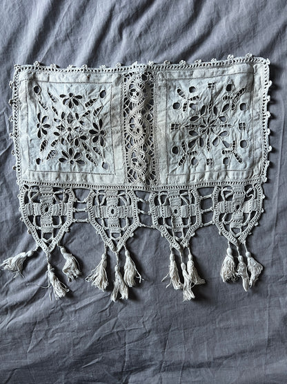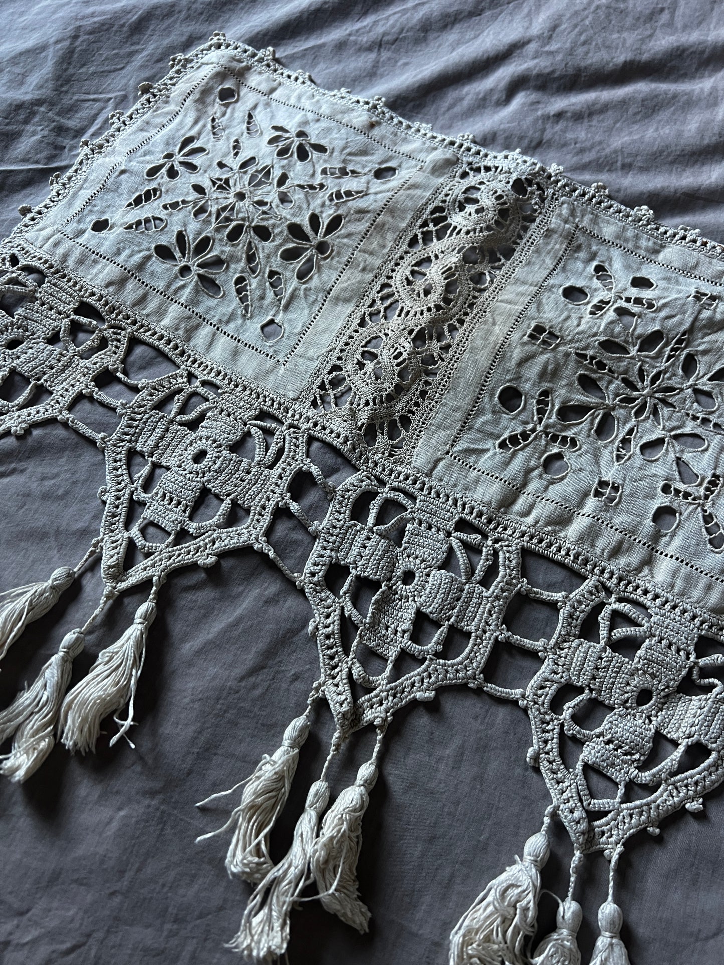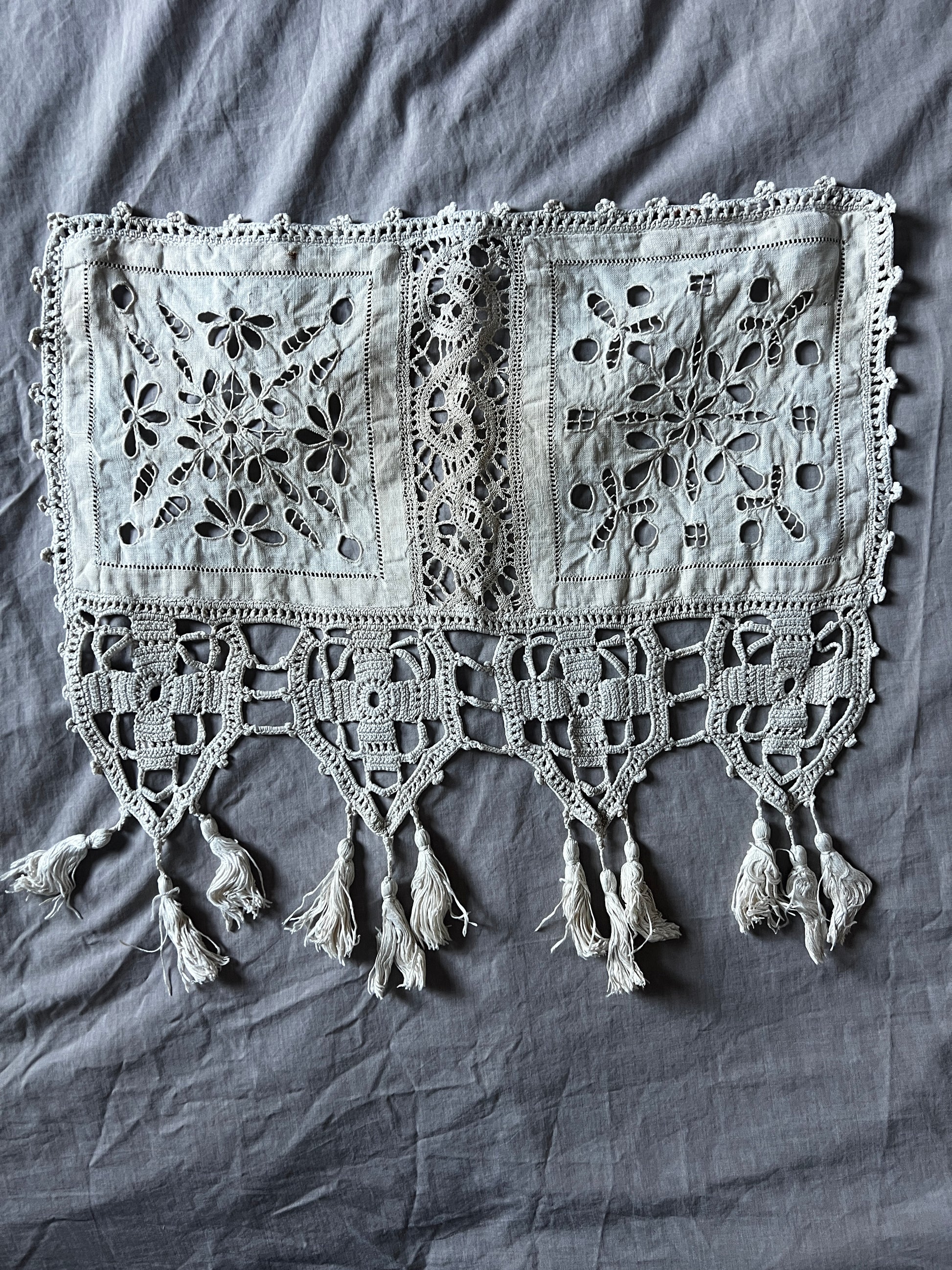 カットワーク刺繍、ボビンレース、クロシェレースが組み合わされたデザインのミニカーテンです