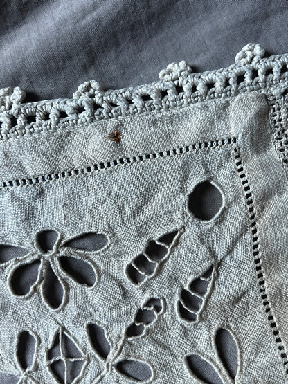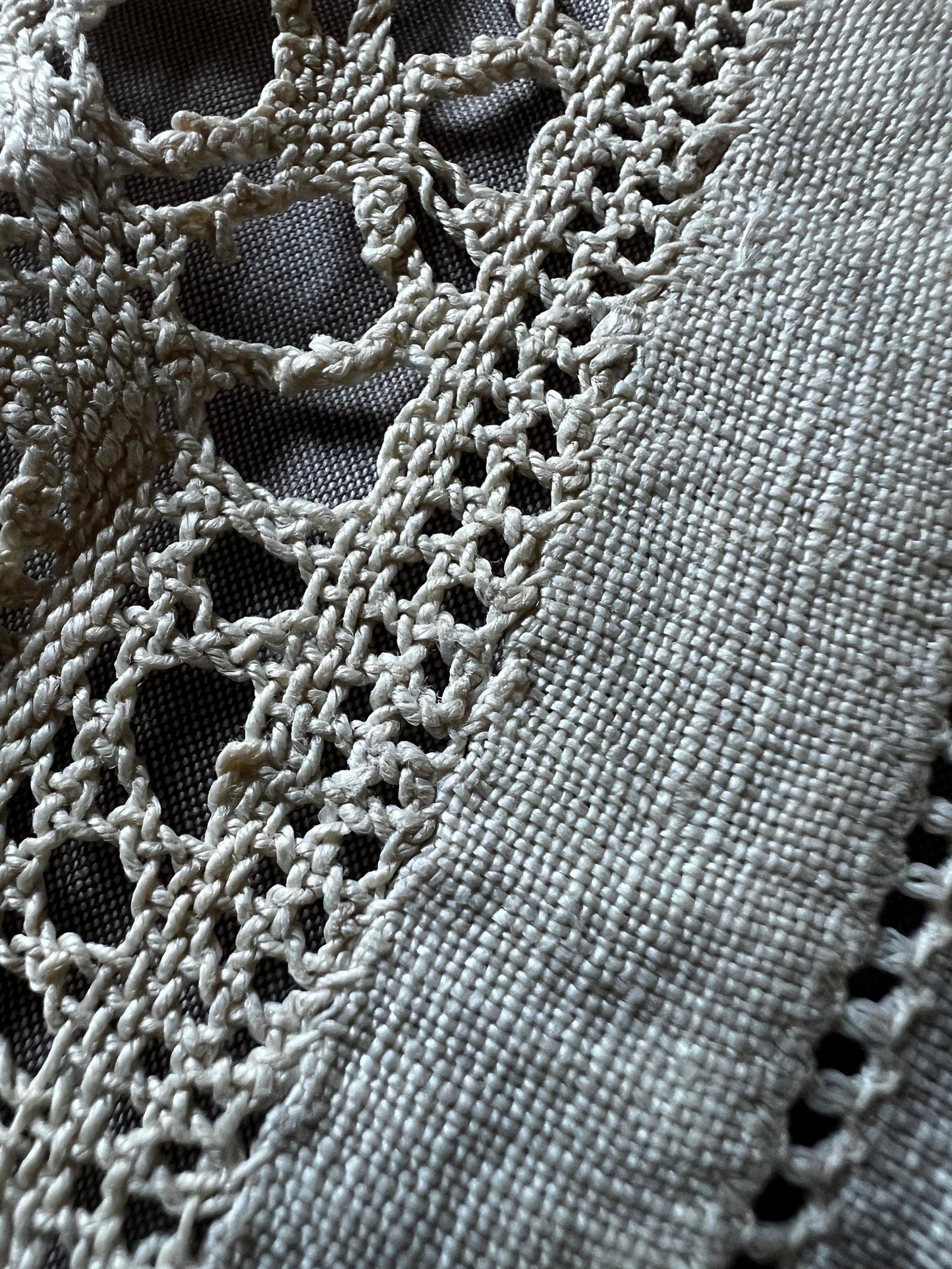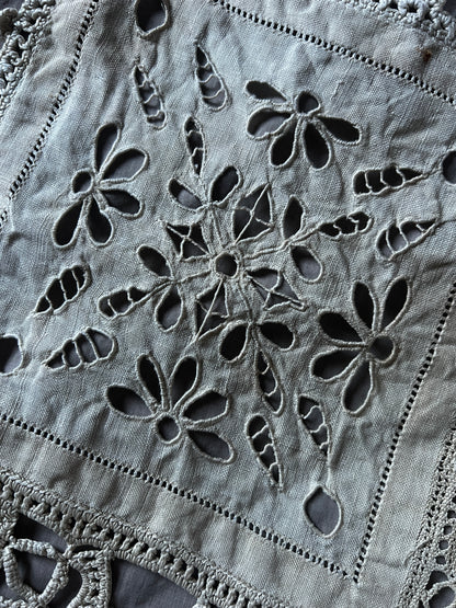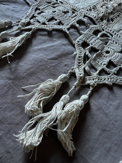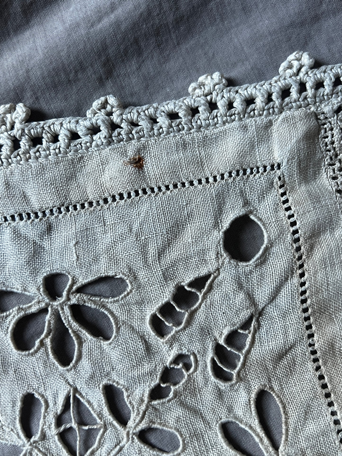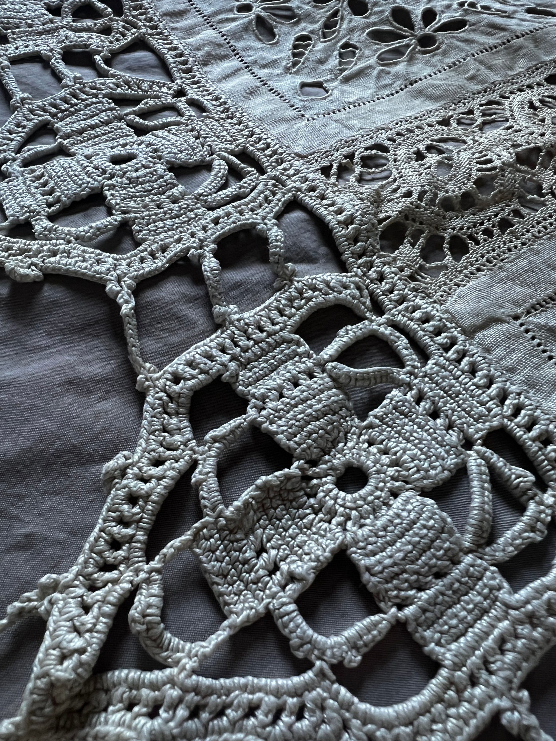 カットワーク刺繍、ボビンレース、クロシェレースが組み合わされたデザインのミニカーテンです