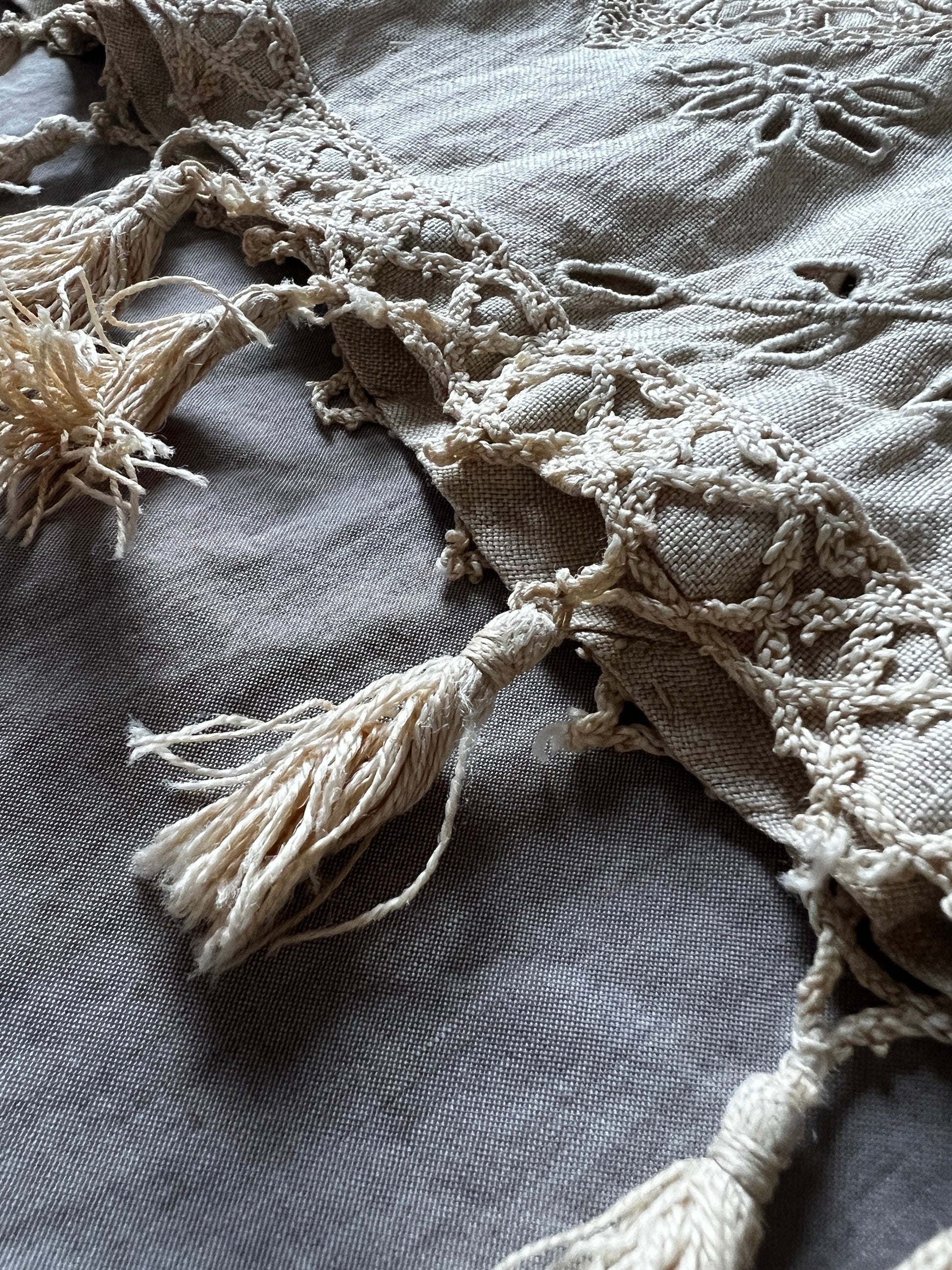房飾りはところどころ欠如しており、レース部分には糸切れや縫い目のほころびが見られます