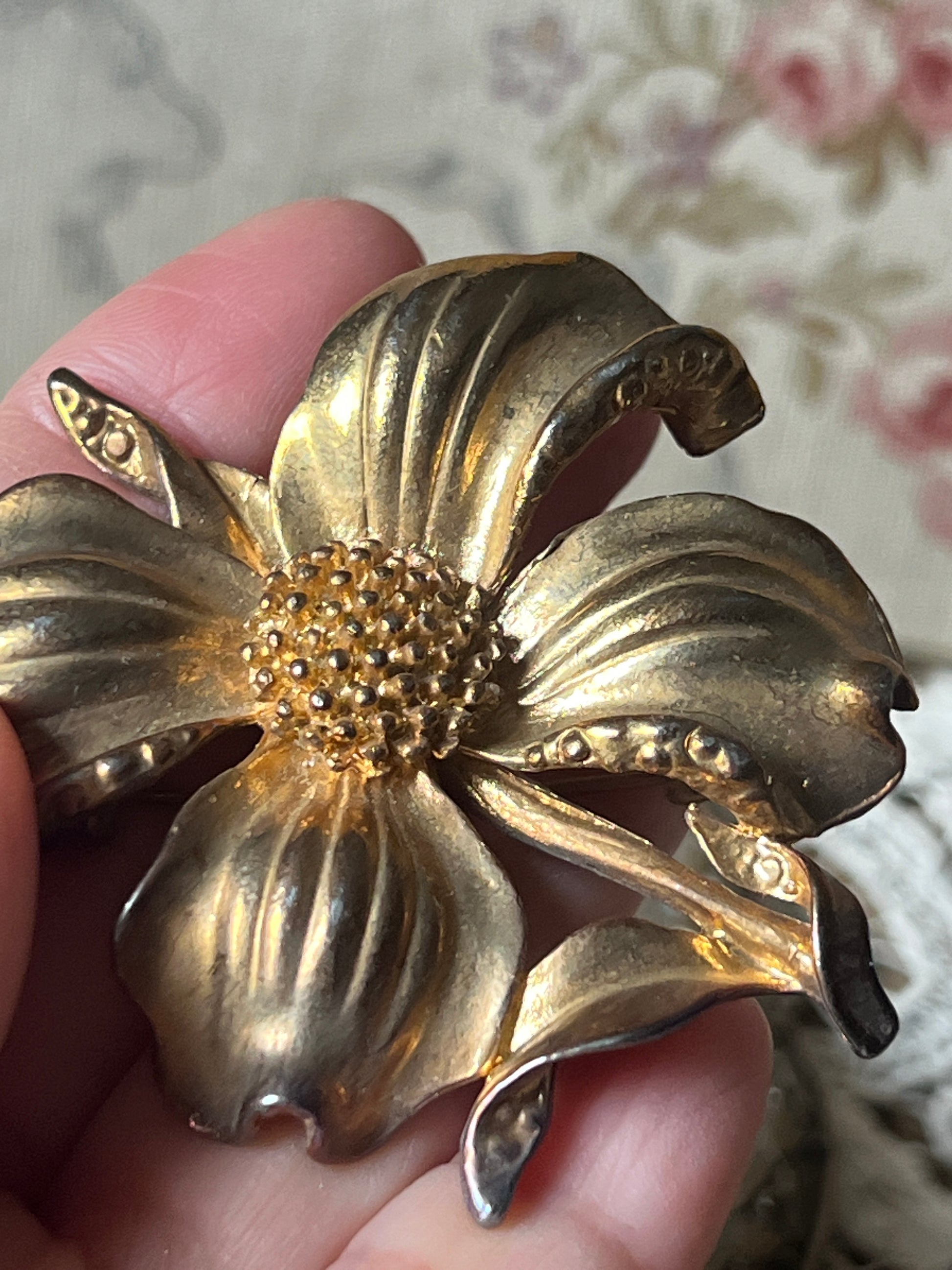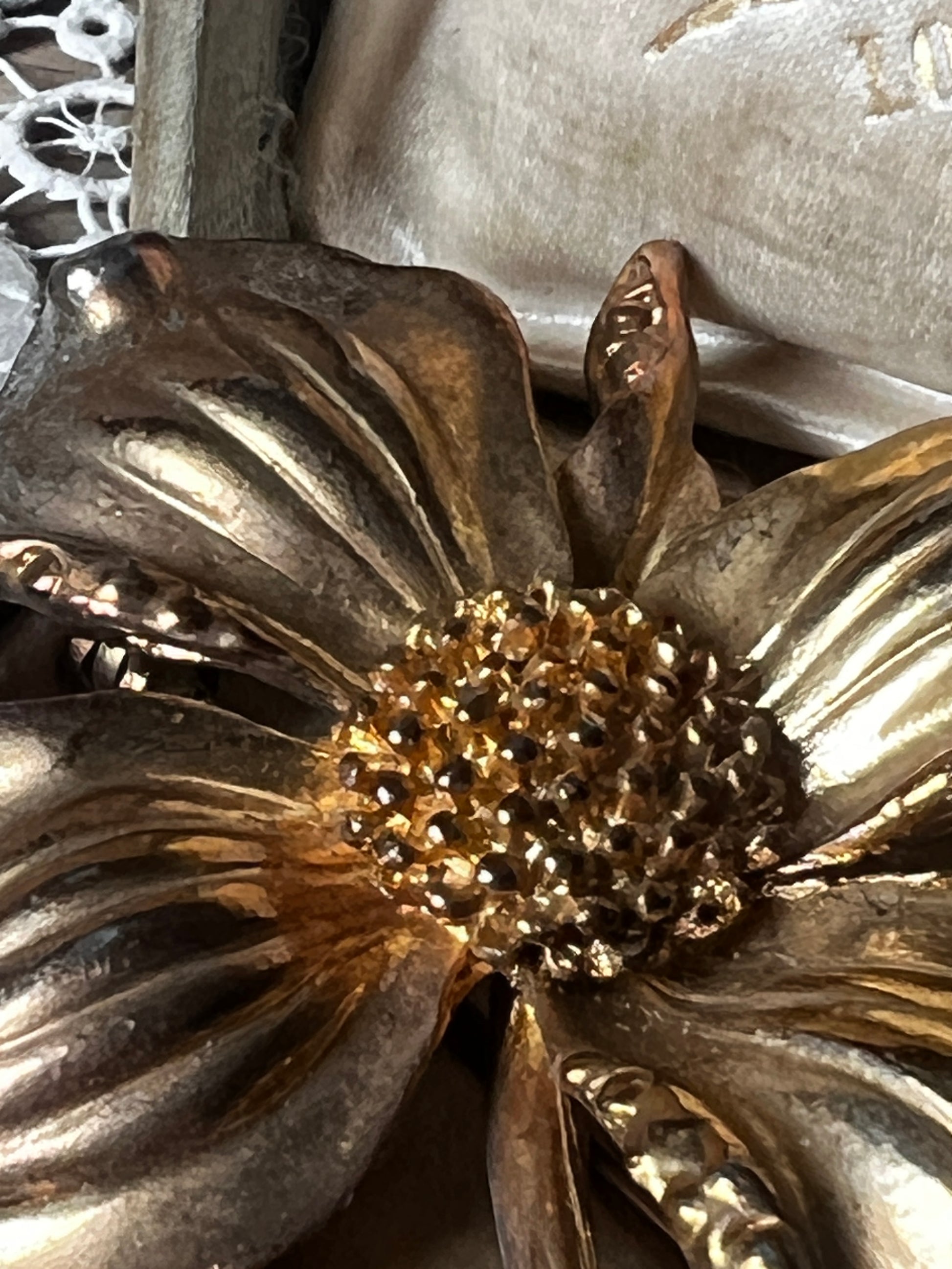 ゴールドカラーが華やかな印象を与える、大ぶりサイズのブローチです