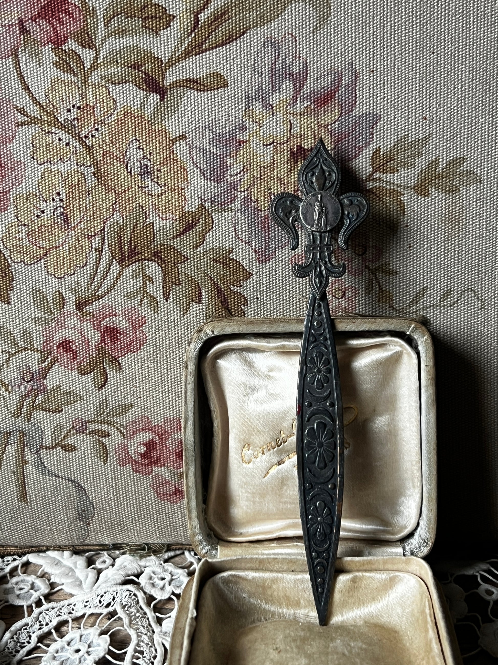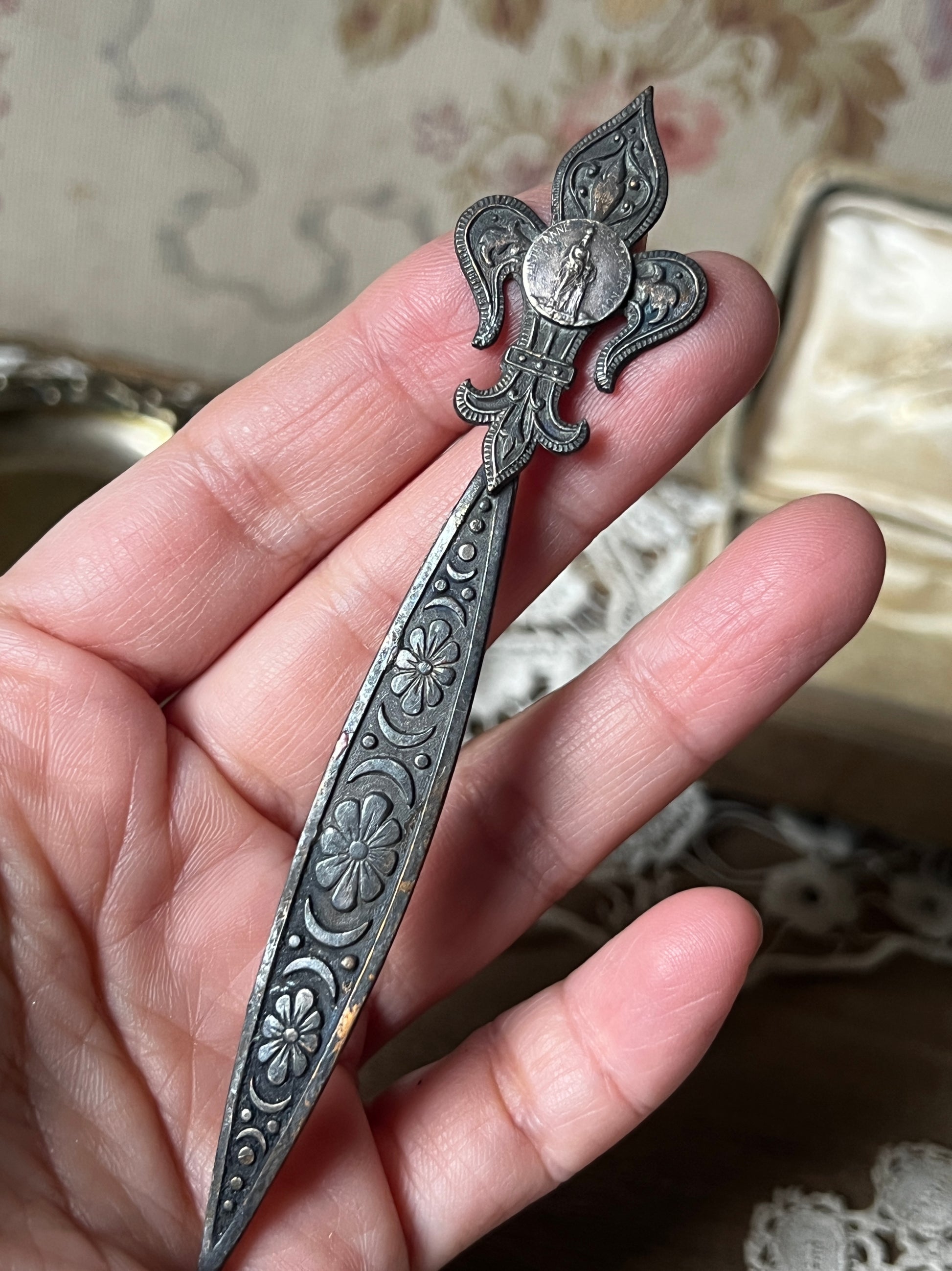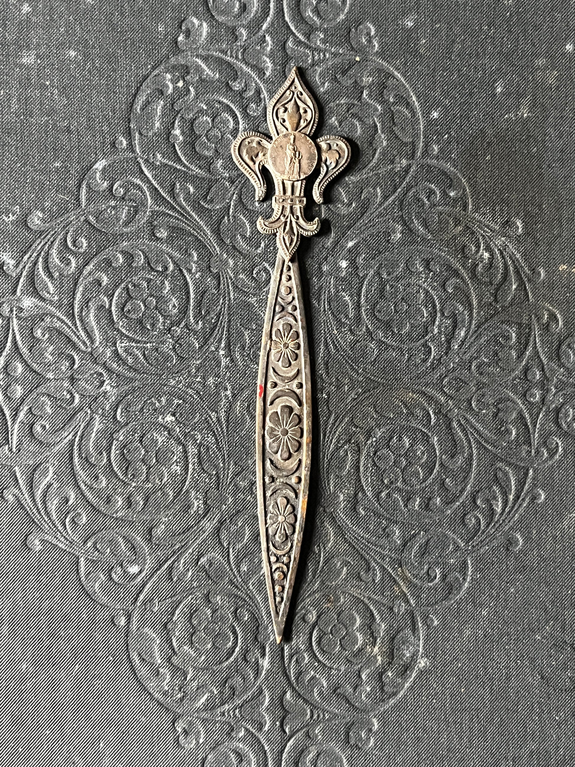 上部に百合の紋章をかたどった飾りが施された、ペーパーナイフのような形状のメタルパーツです