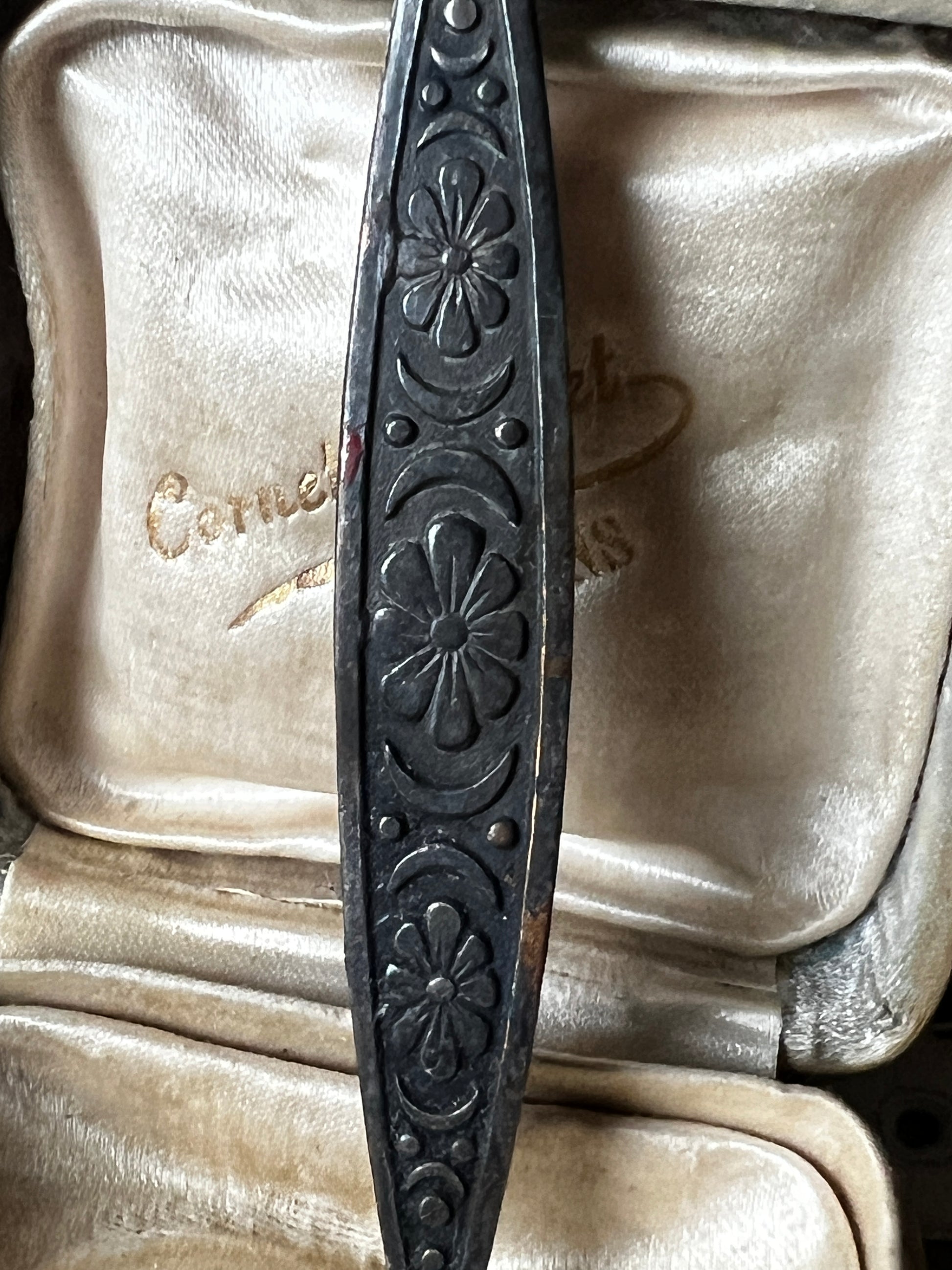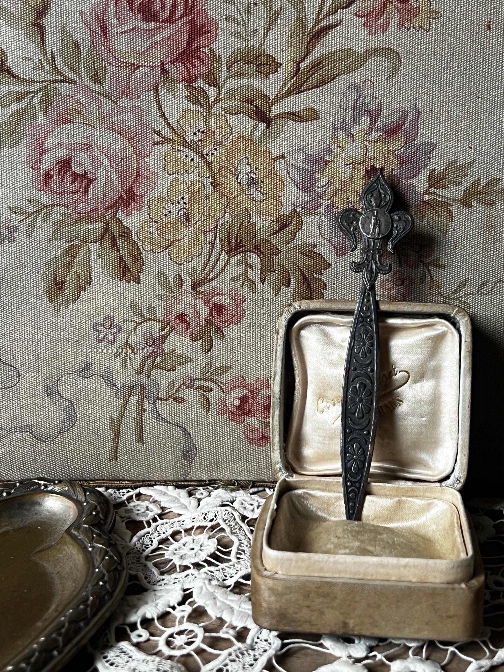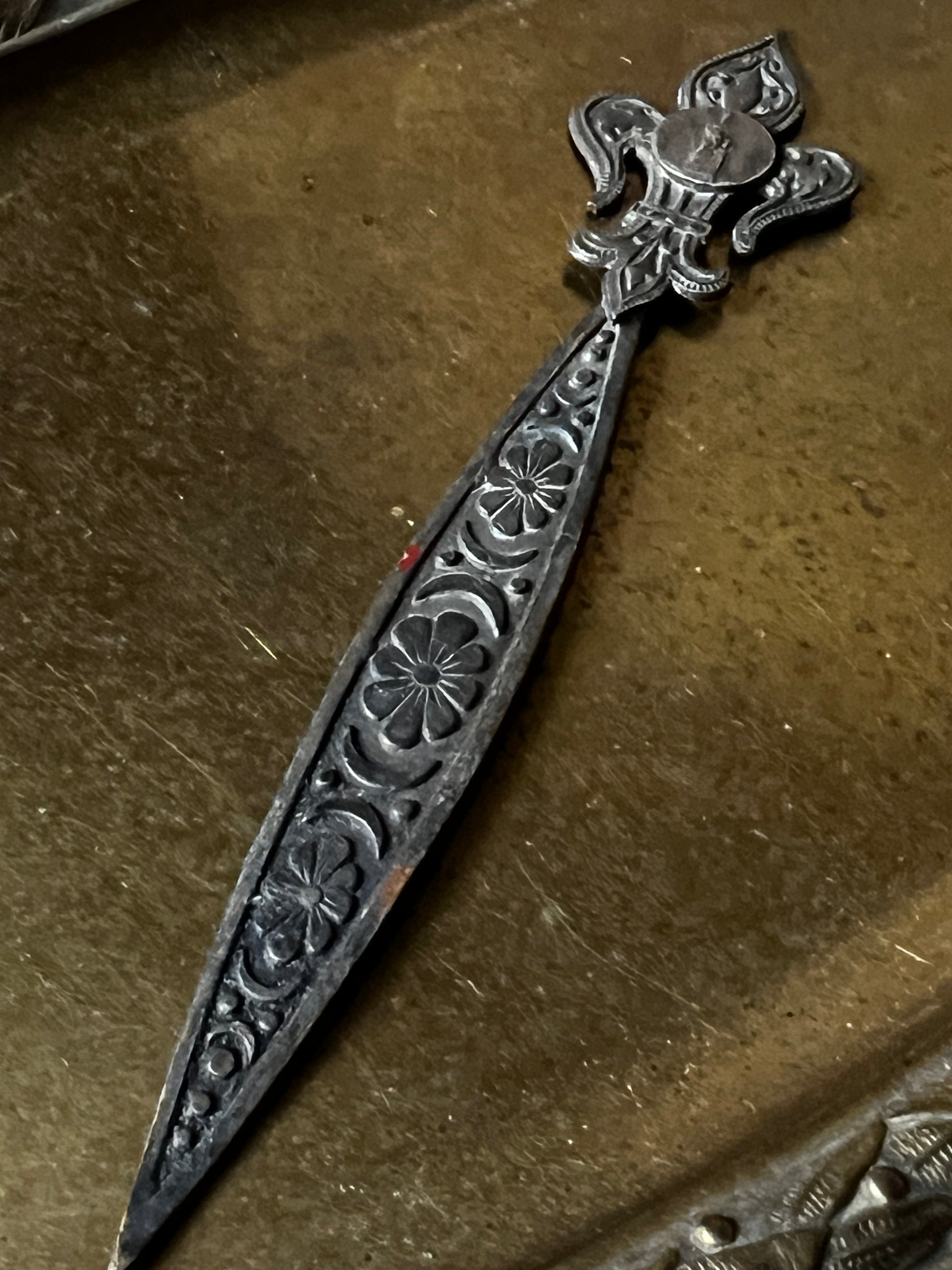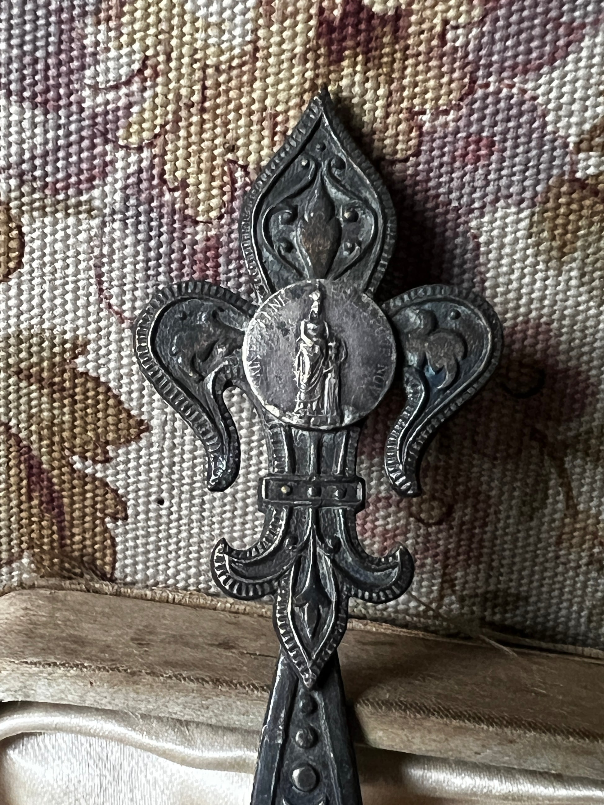 上部に百合の紋章をかたどった飾りが施された、ペーパーナイフのような形状のメタルパーツです