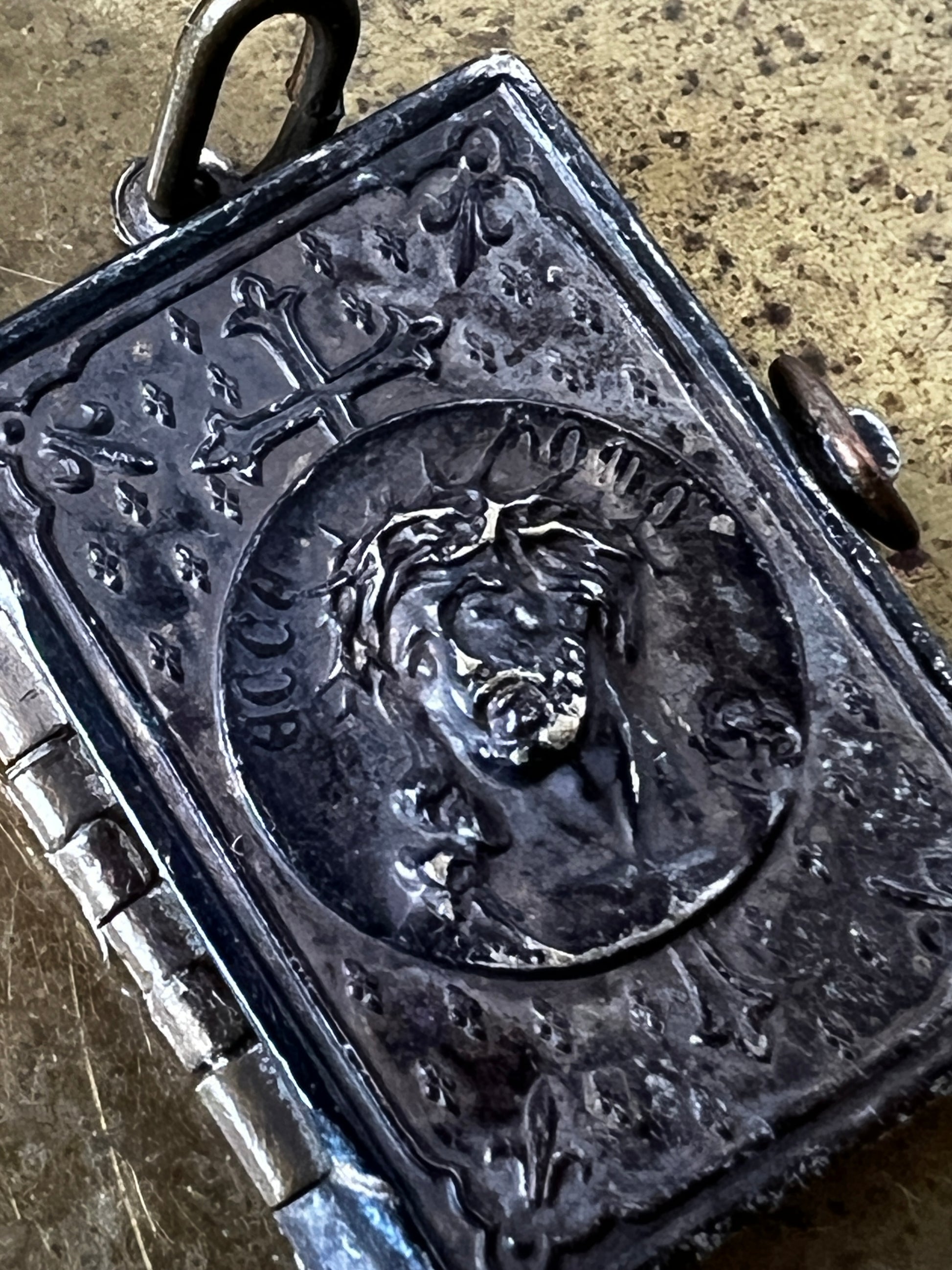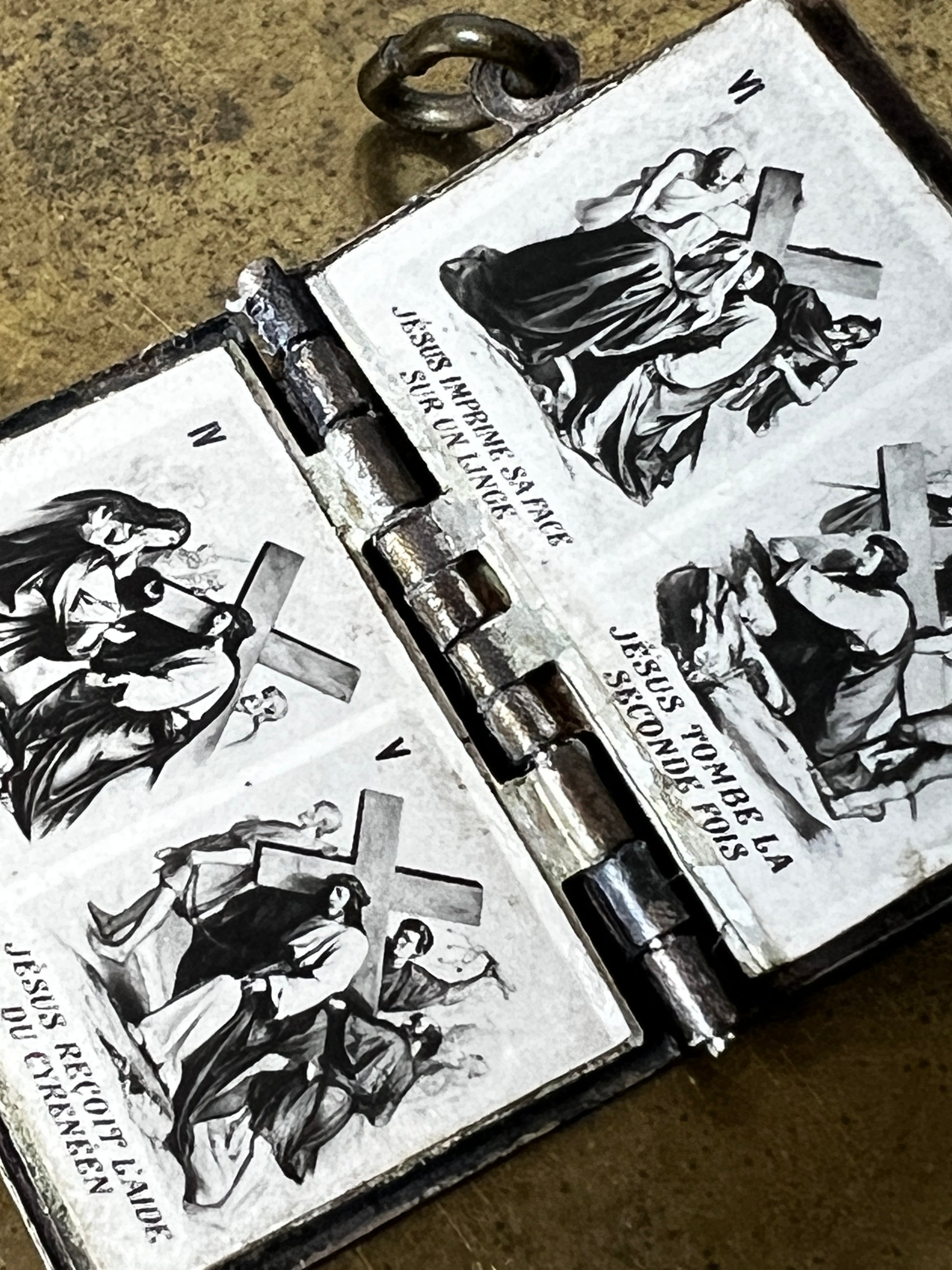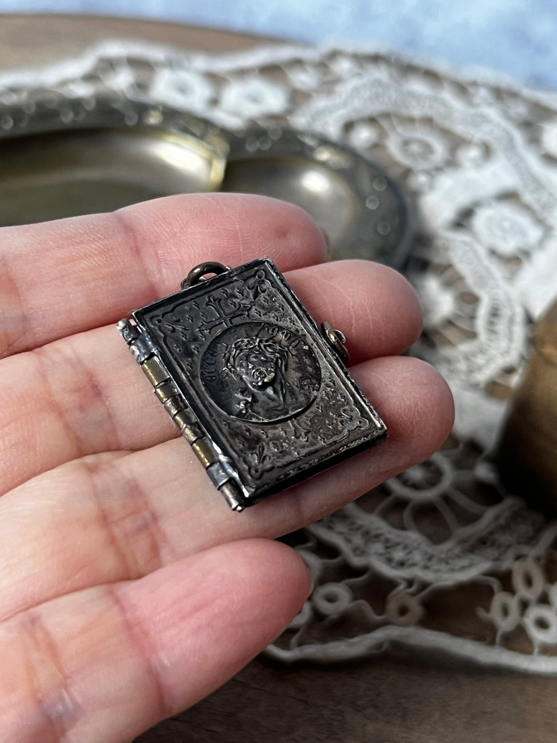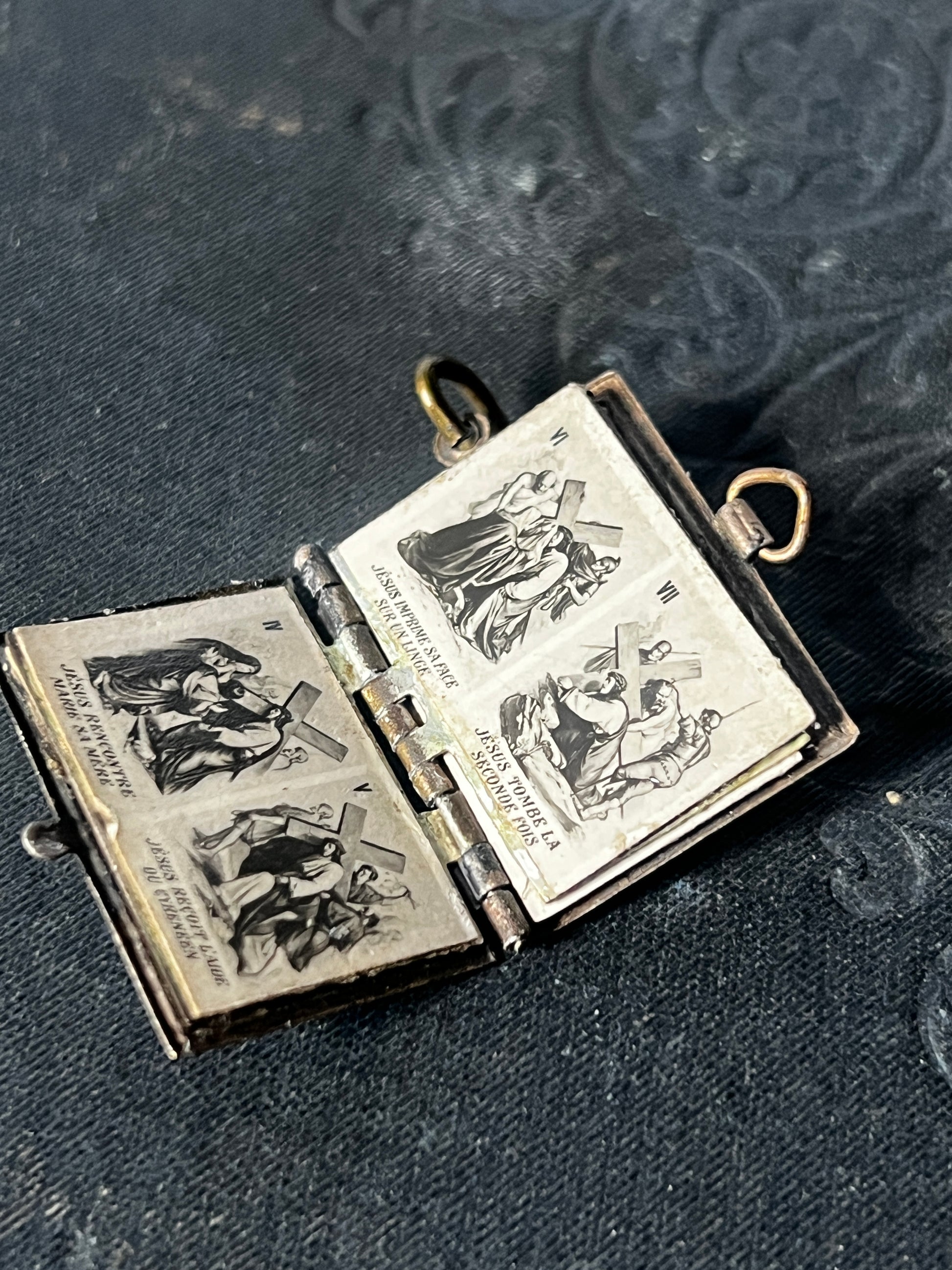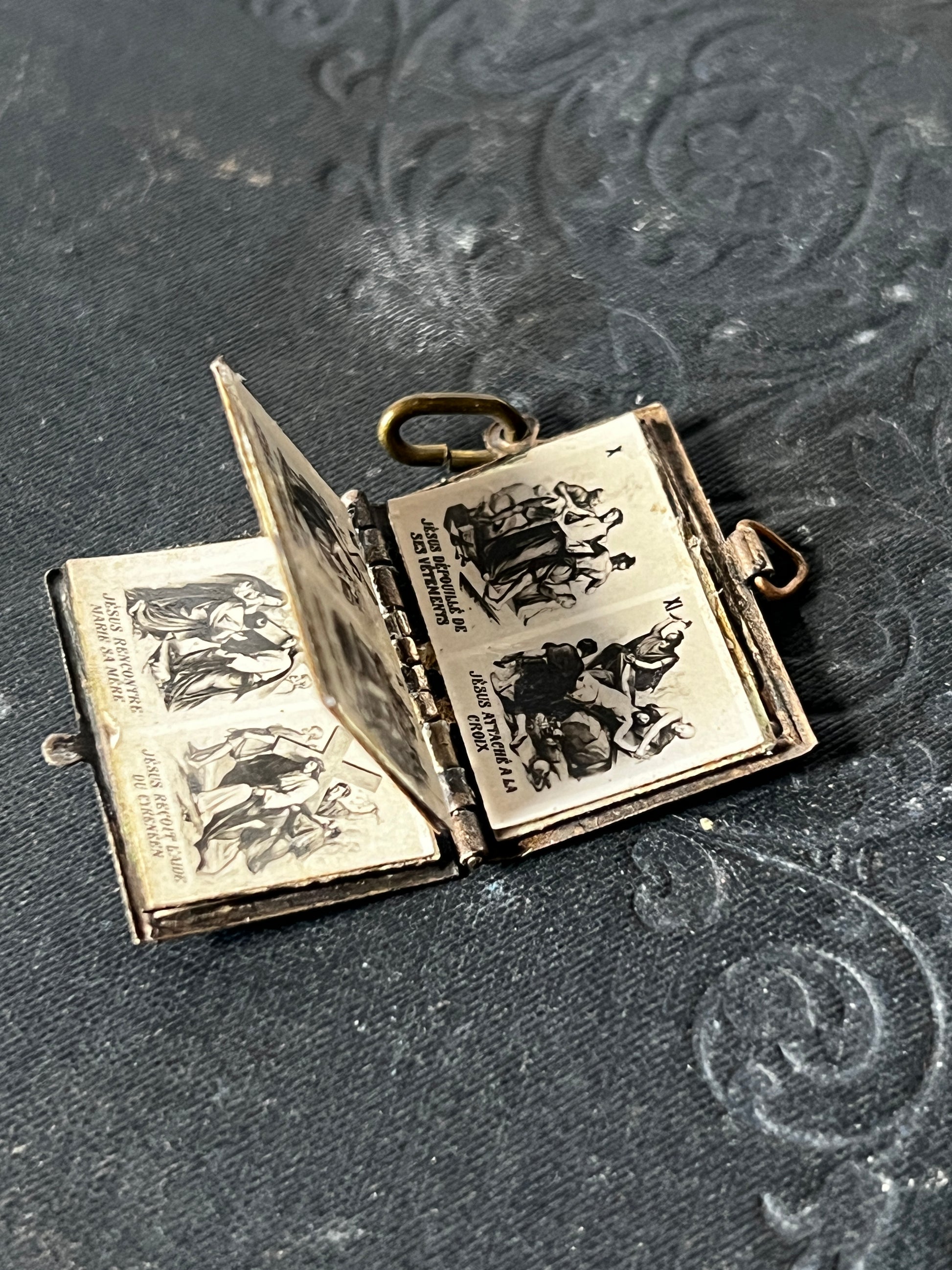 各ページには、聖書に基づいたキリストの姿が描かれた繊細なモチーフがあしらわれており、宗教的な敬虔さと美しさを兼ね備えたお品