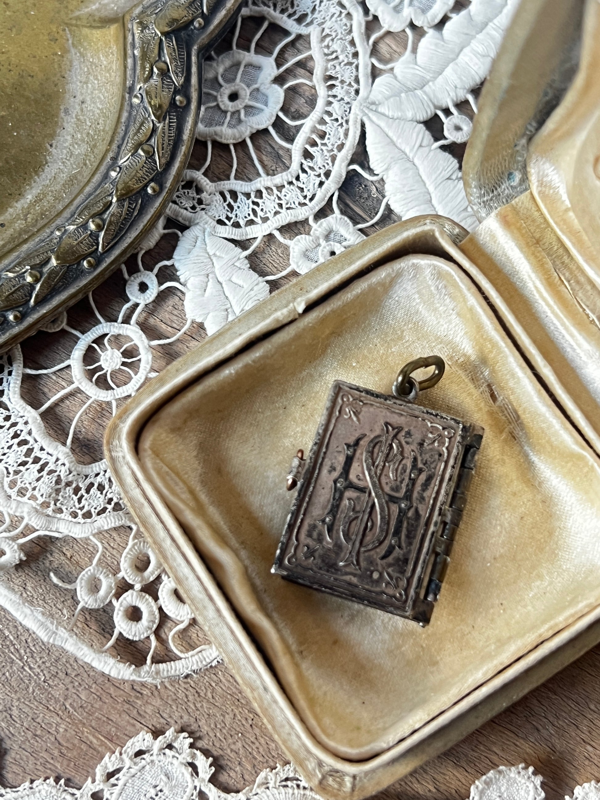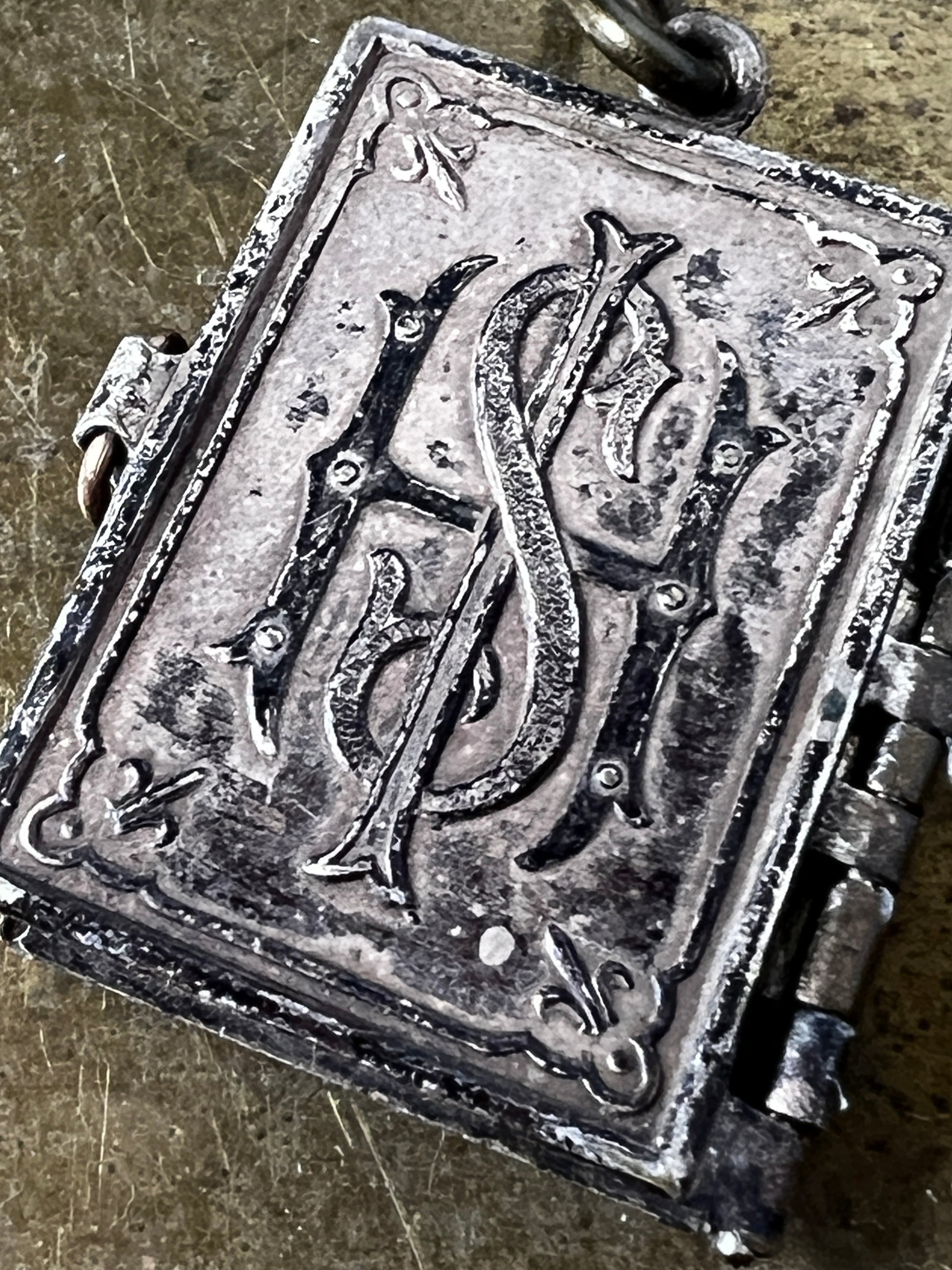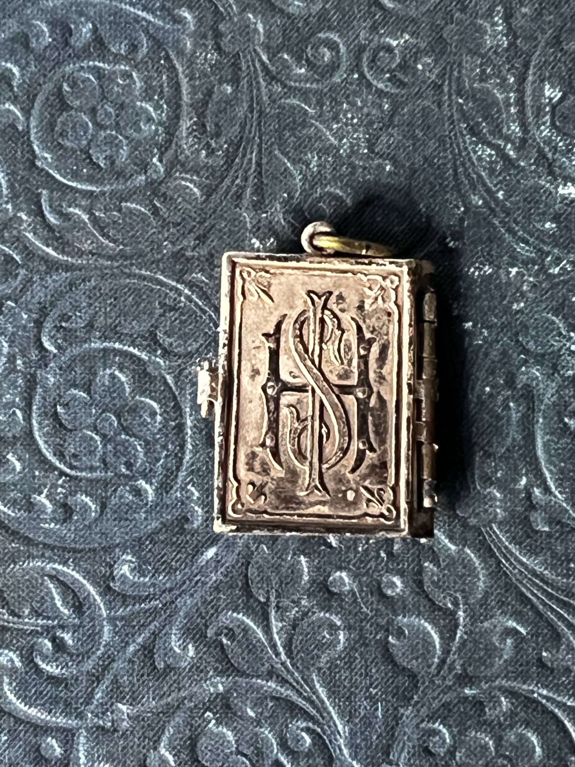 メタル製の小さなブック型チャームで、ページが3枚セッティングされたユニークなデザインです