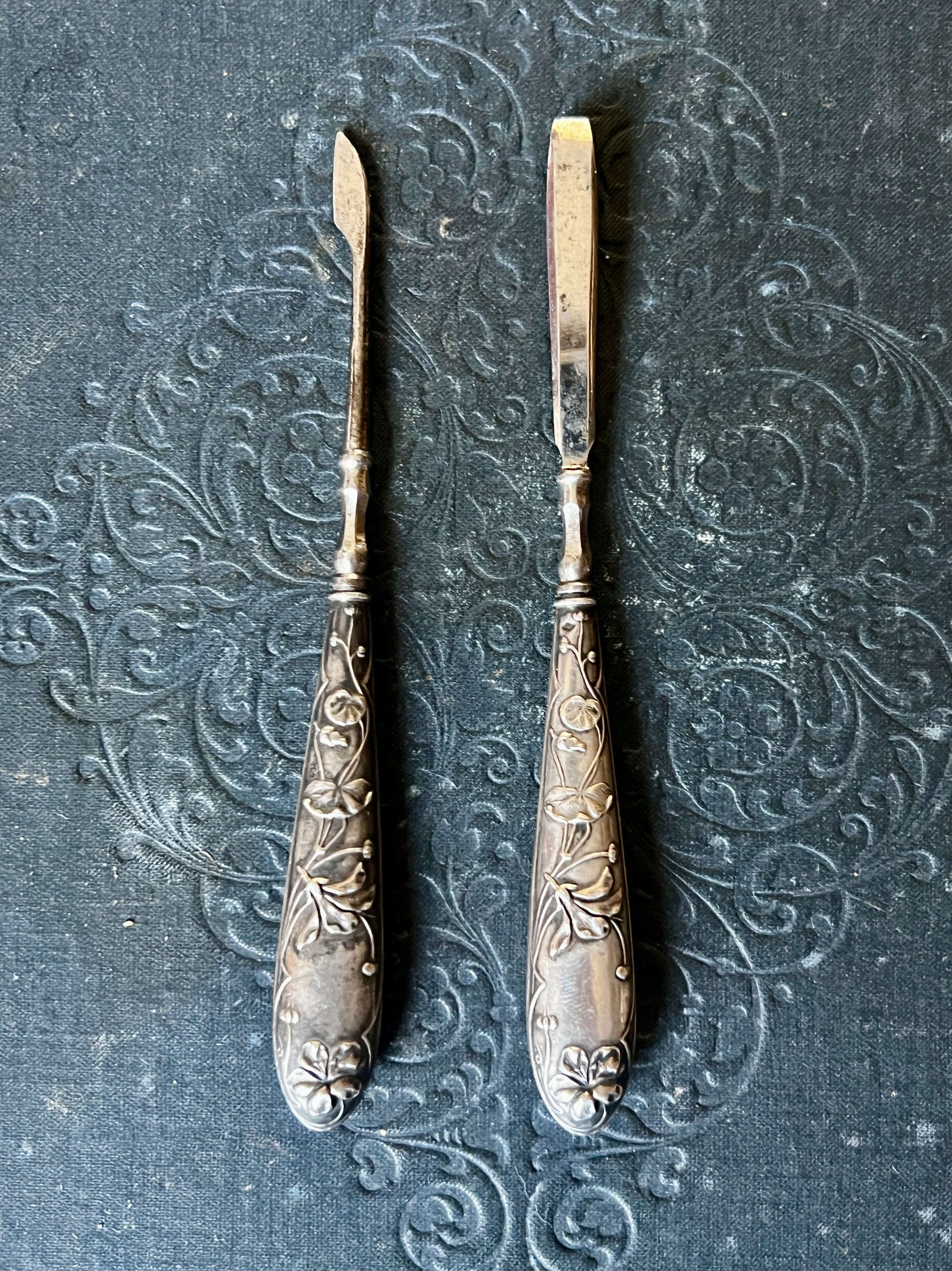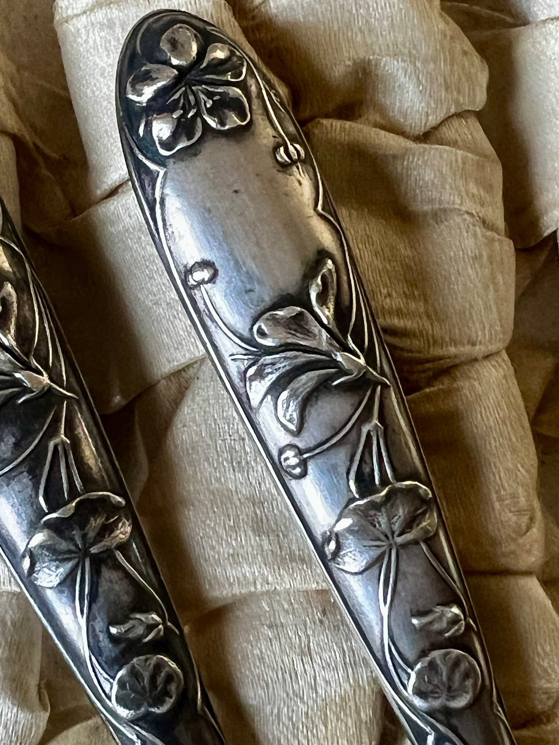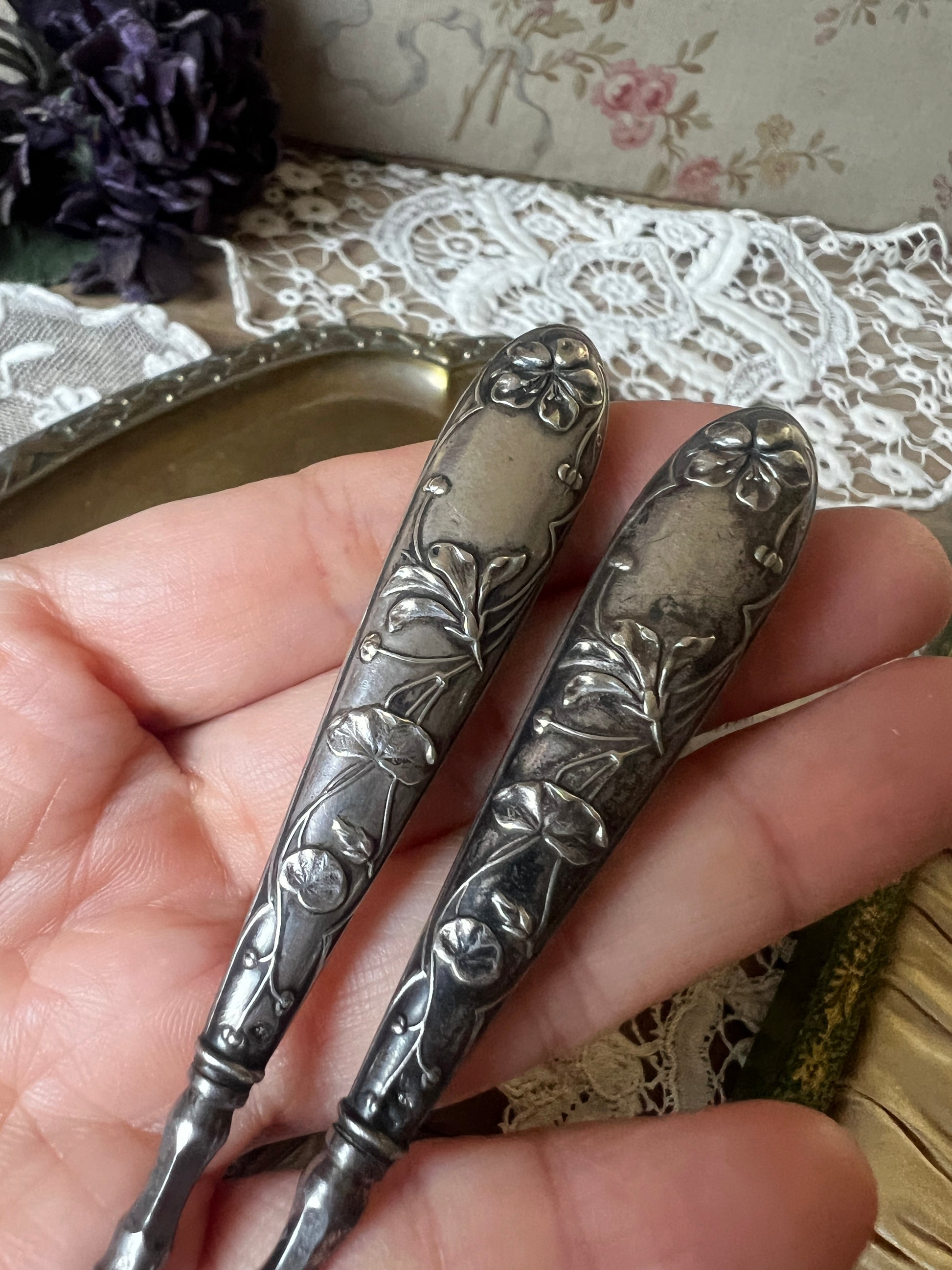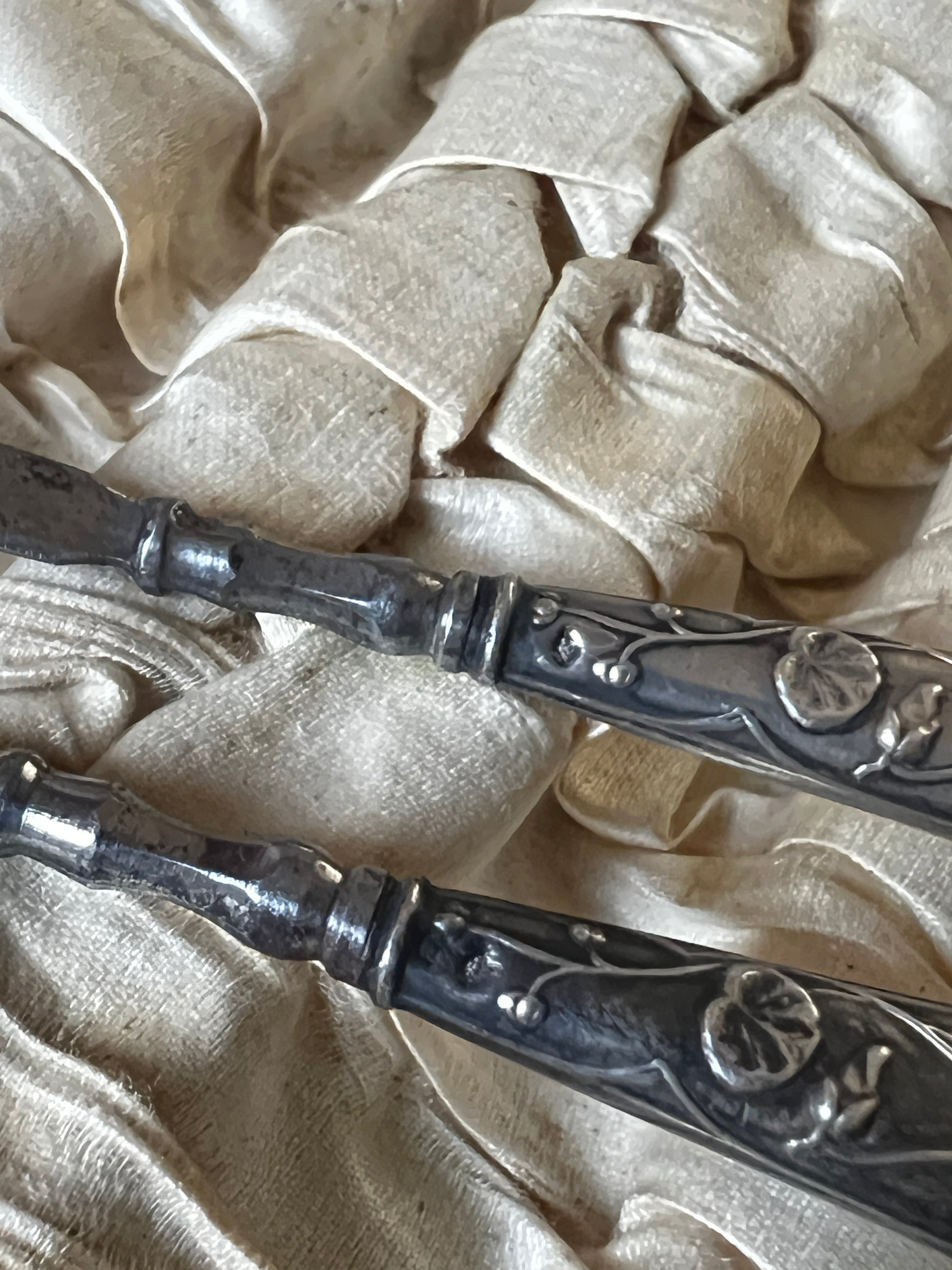 持ち手の部分には、銀製を示す刻印(やや不鮮明)が確認されており、控えめながらも上質な素材感が魅力です