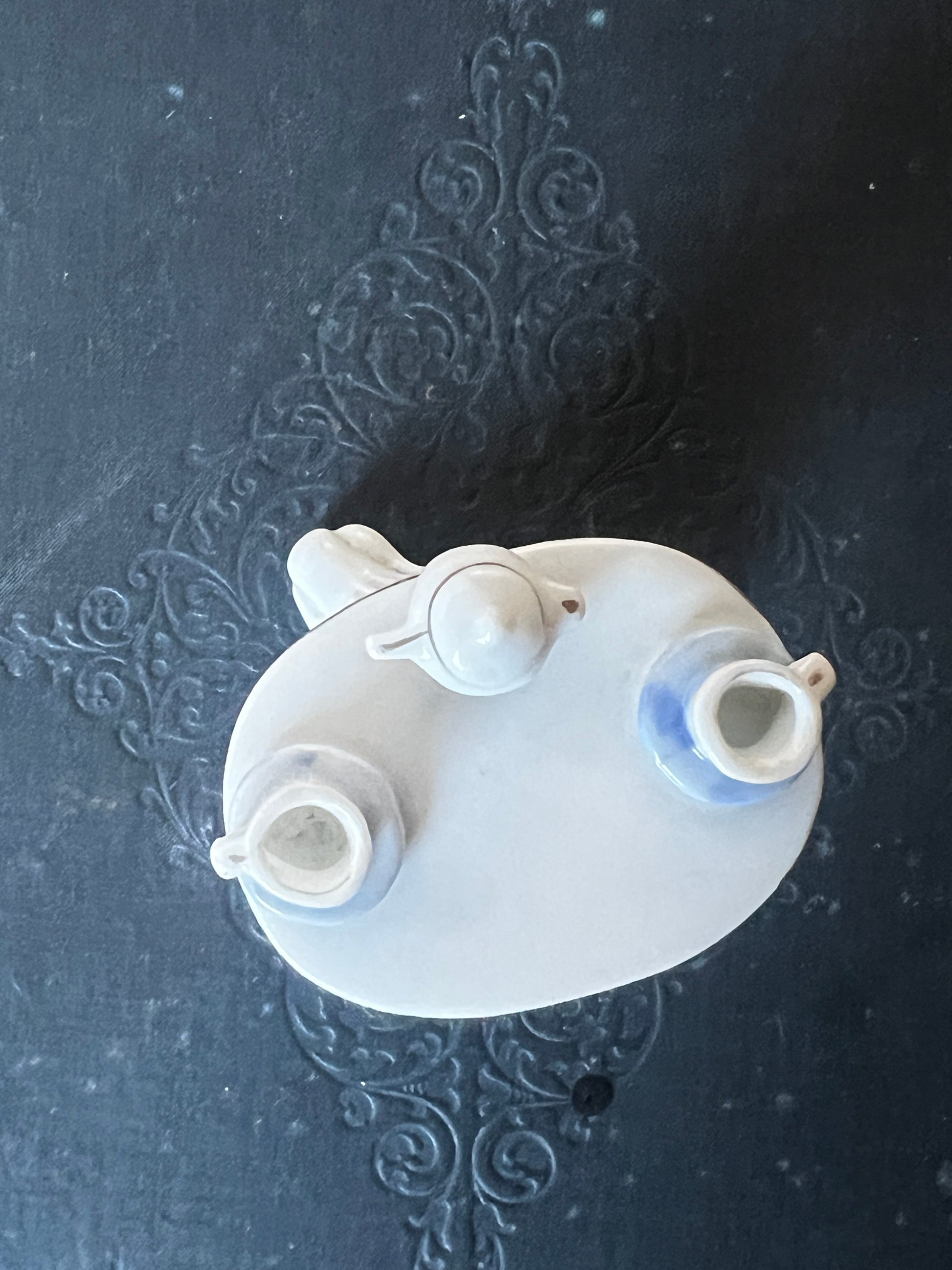 楕円形のテーブルの上には、小さなポットとカップ2客が固定されており、ティータイムの一場面を切り取ったような可愛らしいデザイン