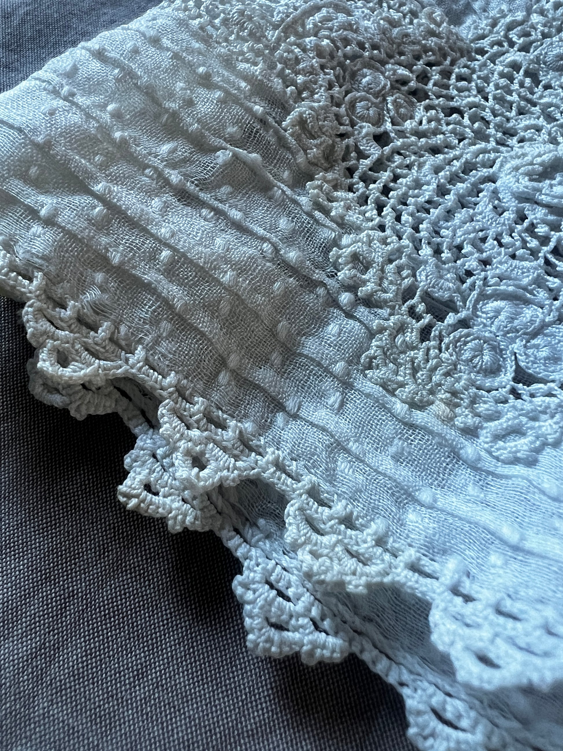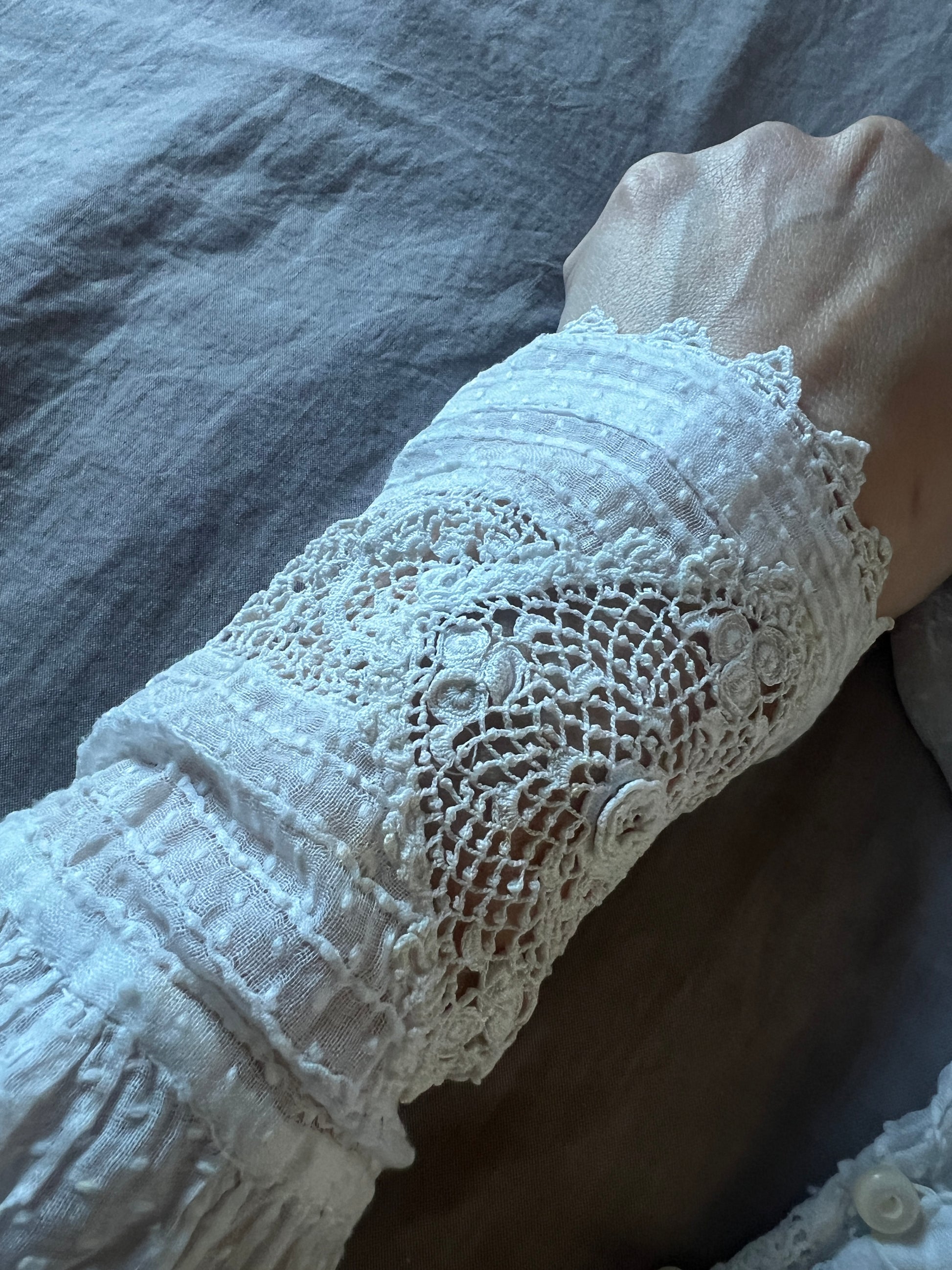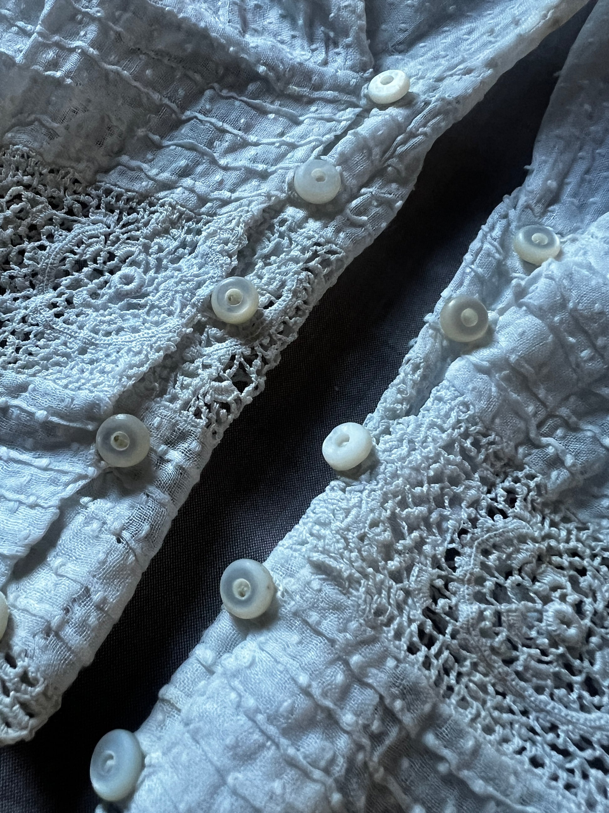 ドット模様の刺繍が施された軽やかな生地に、繊細なアイリッシュクロシェレースの飾りがあしらわれた袖のペアセットです