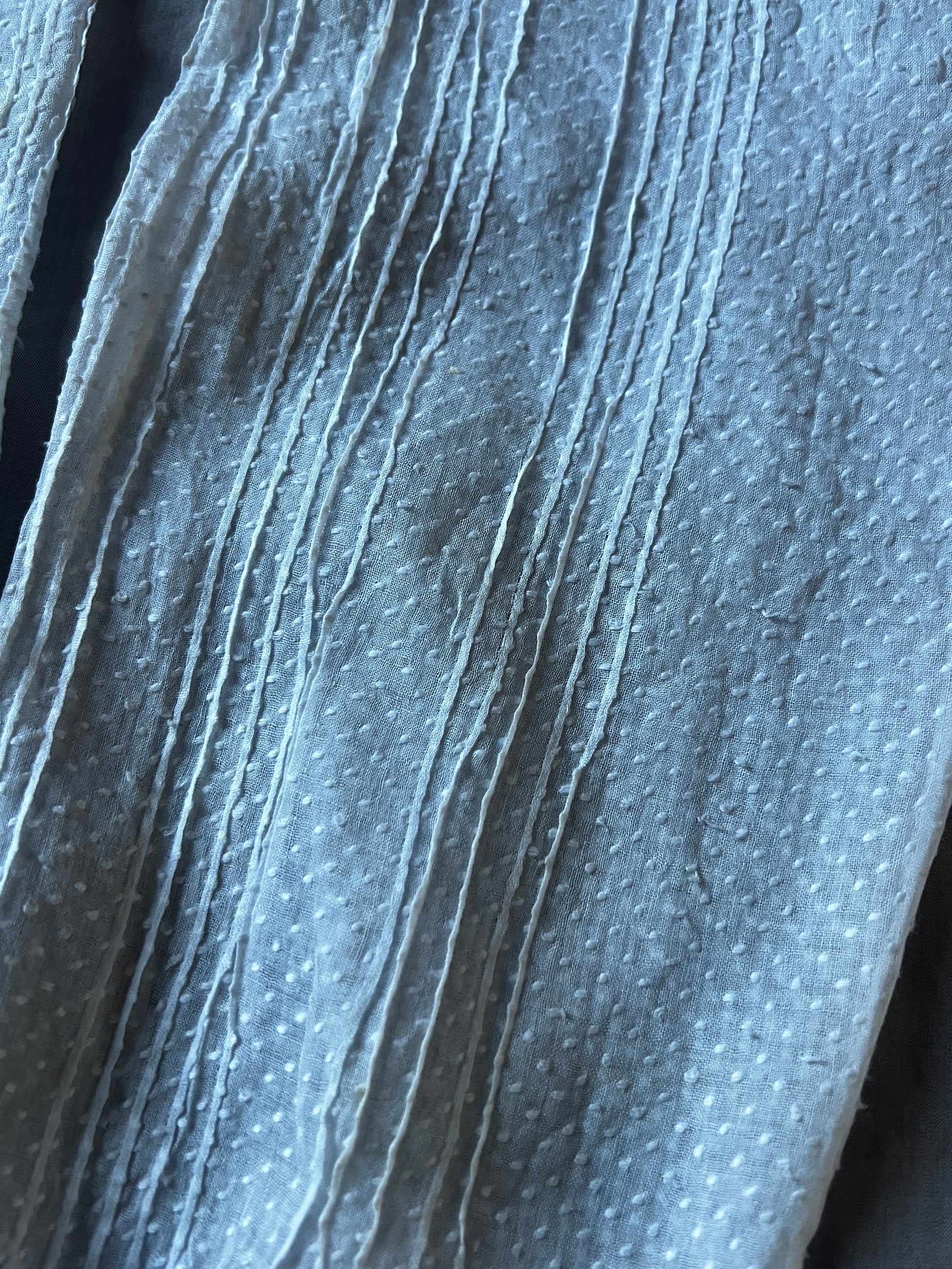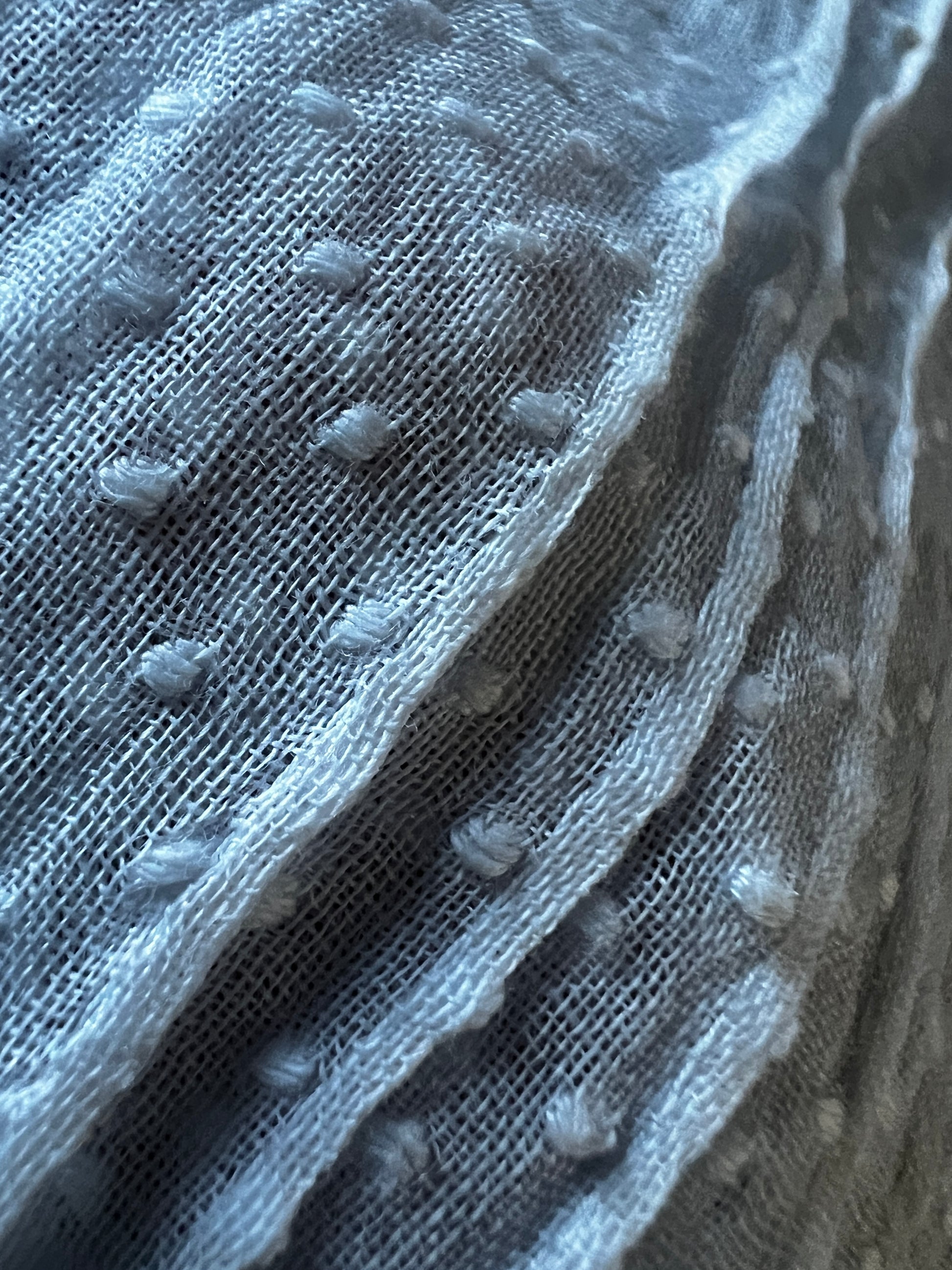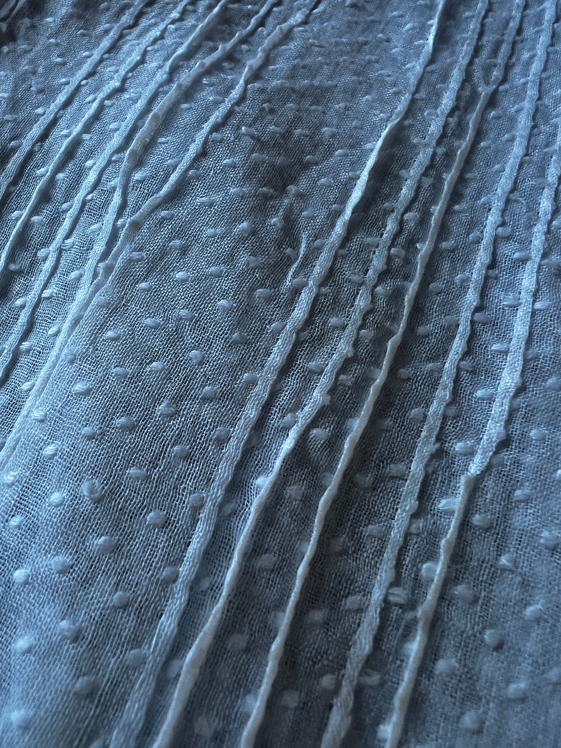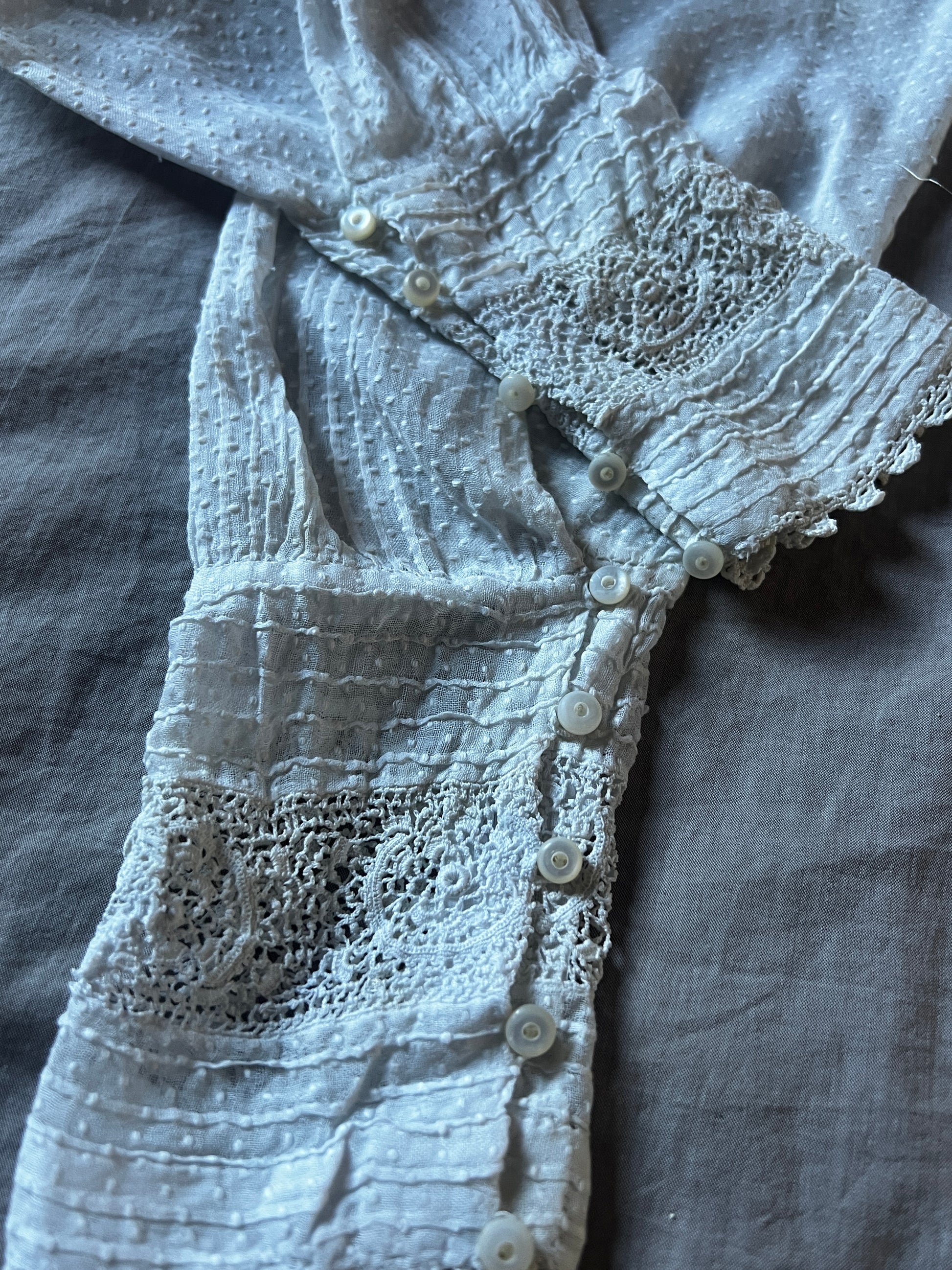 ドット模様の刺繍が施された軽やかな生地に、繊細なアイリッシュクロシェレースの飾りがあしらわれた袖のペアセットです