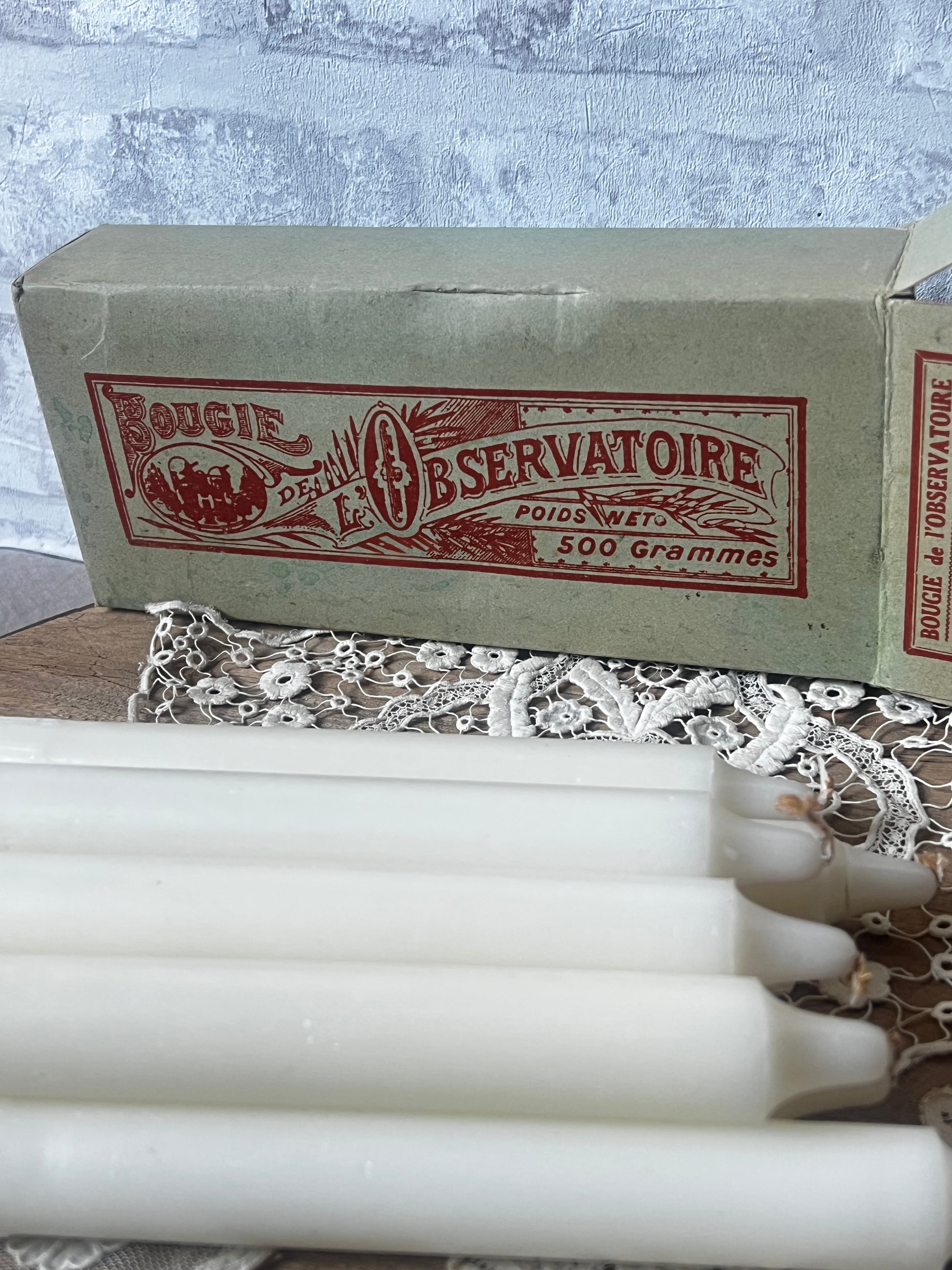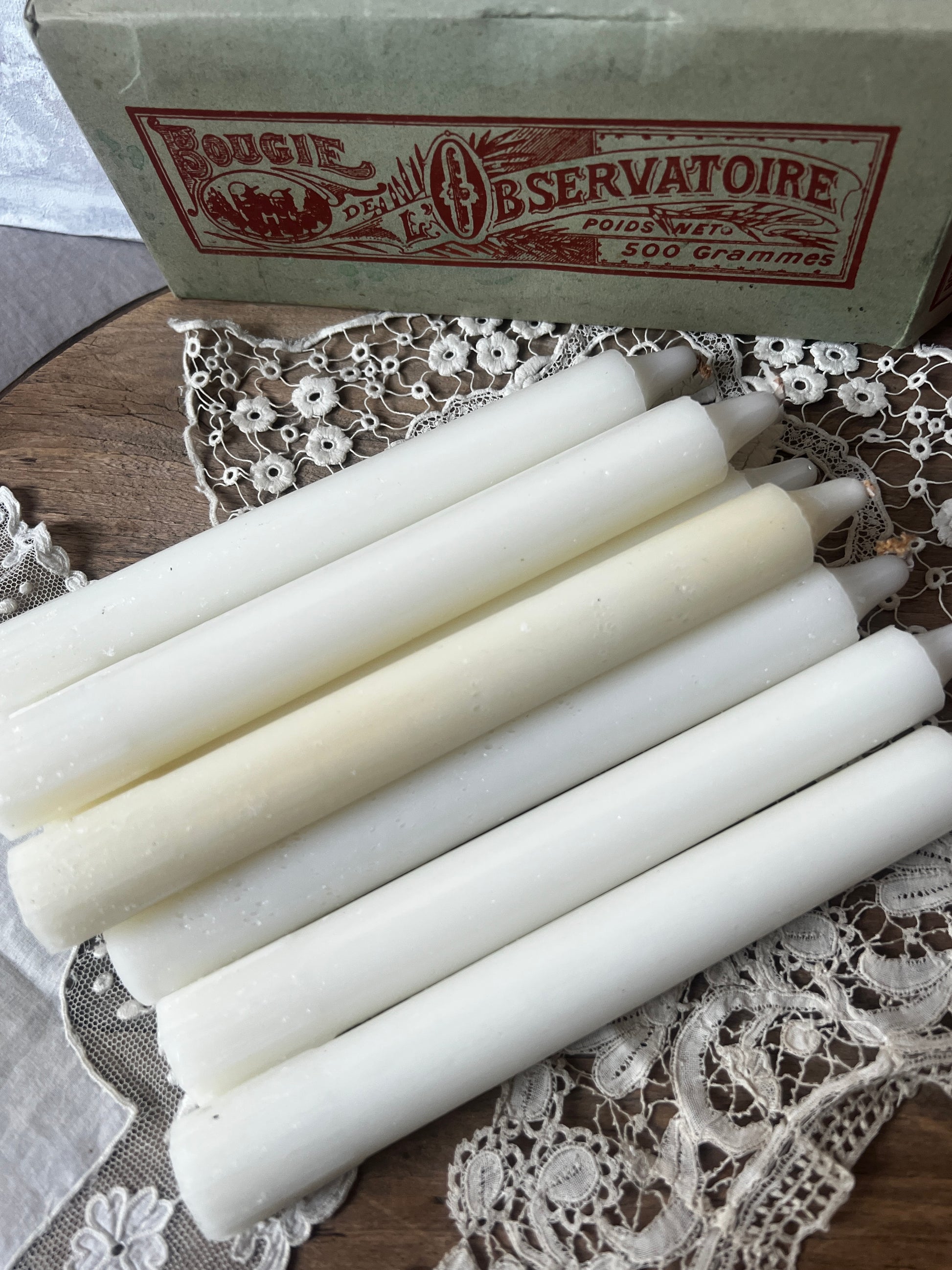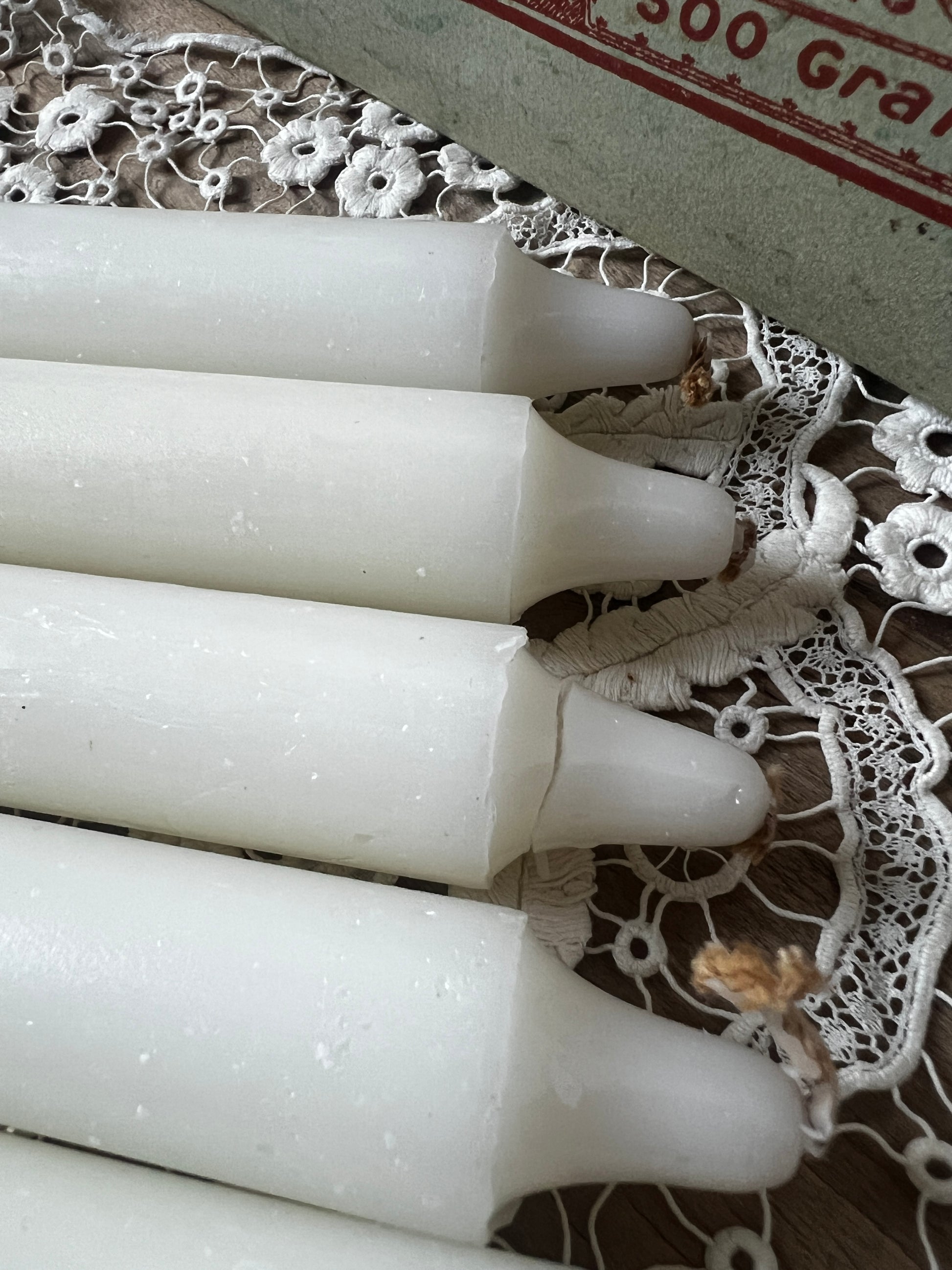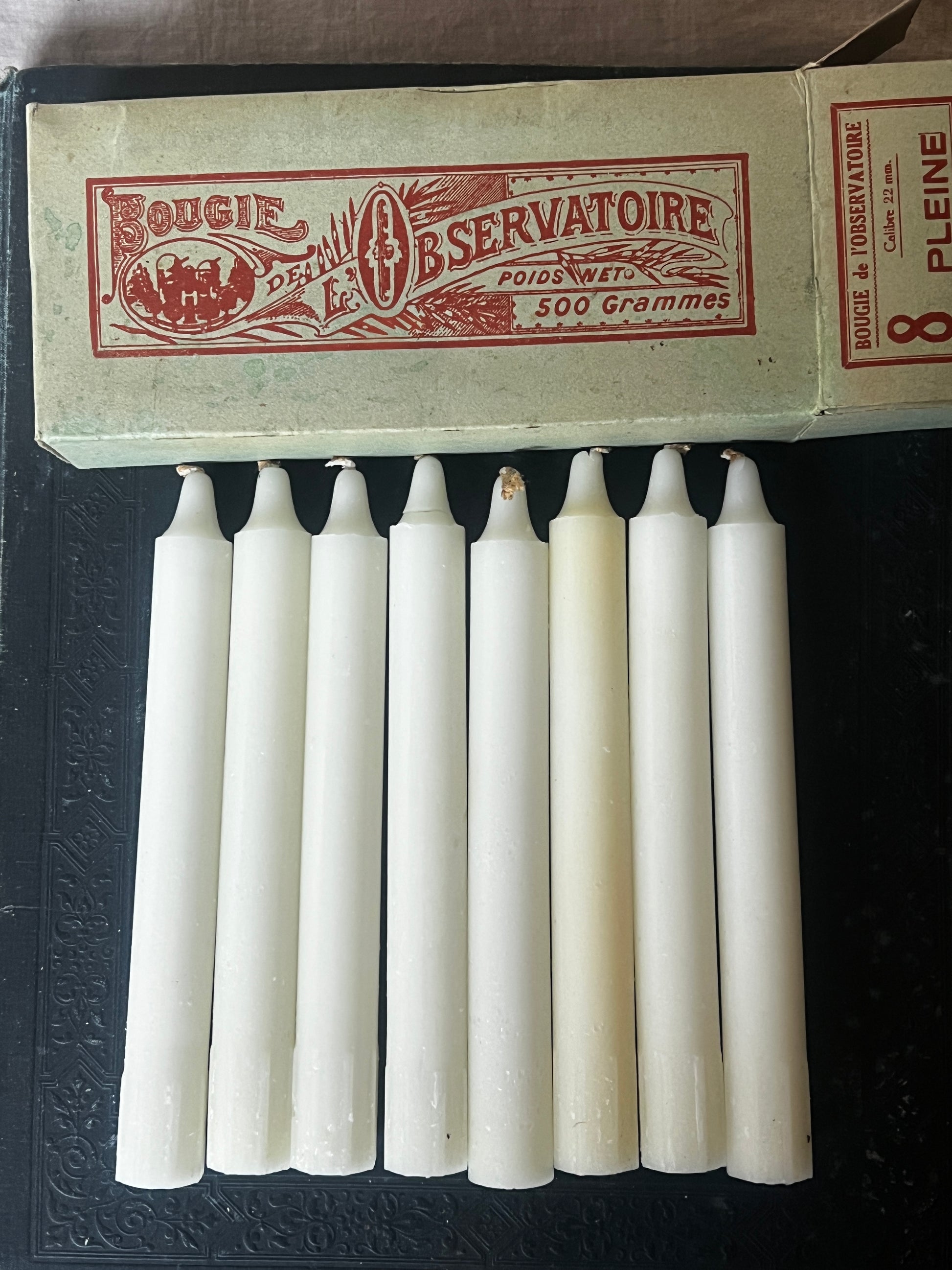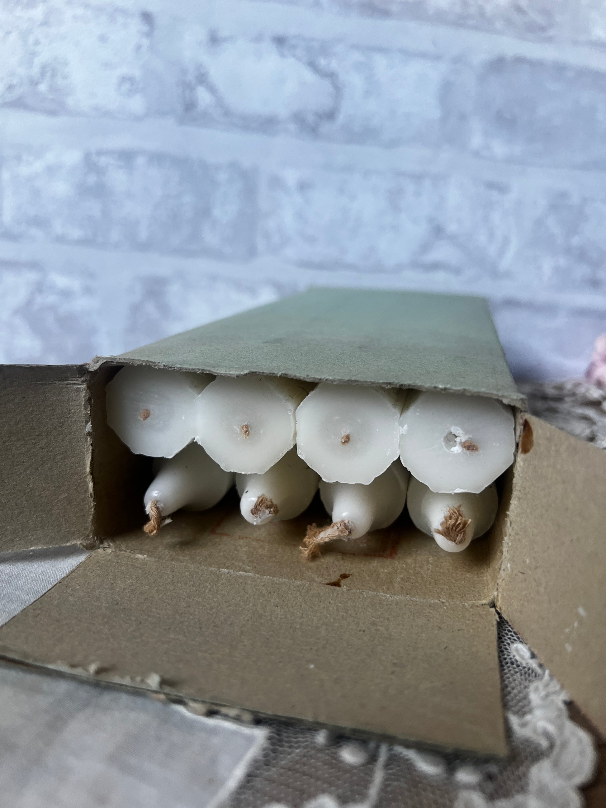 古びた紙箱に収められた、デッドストックのろうそく8本セットです