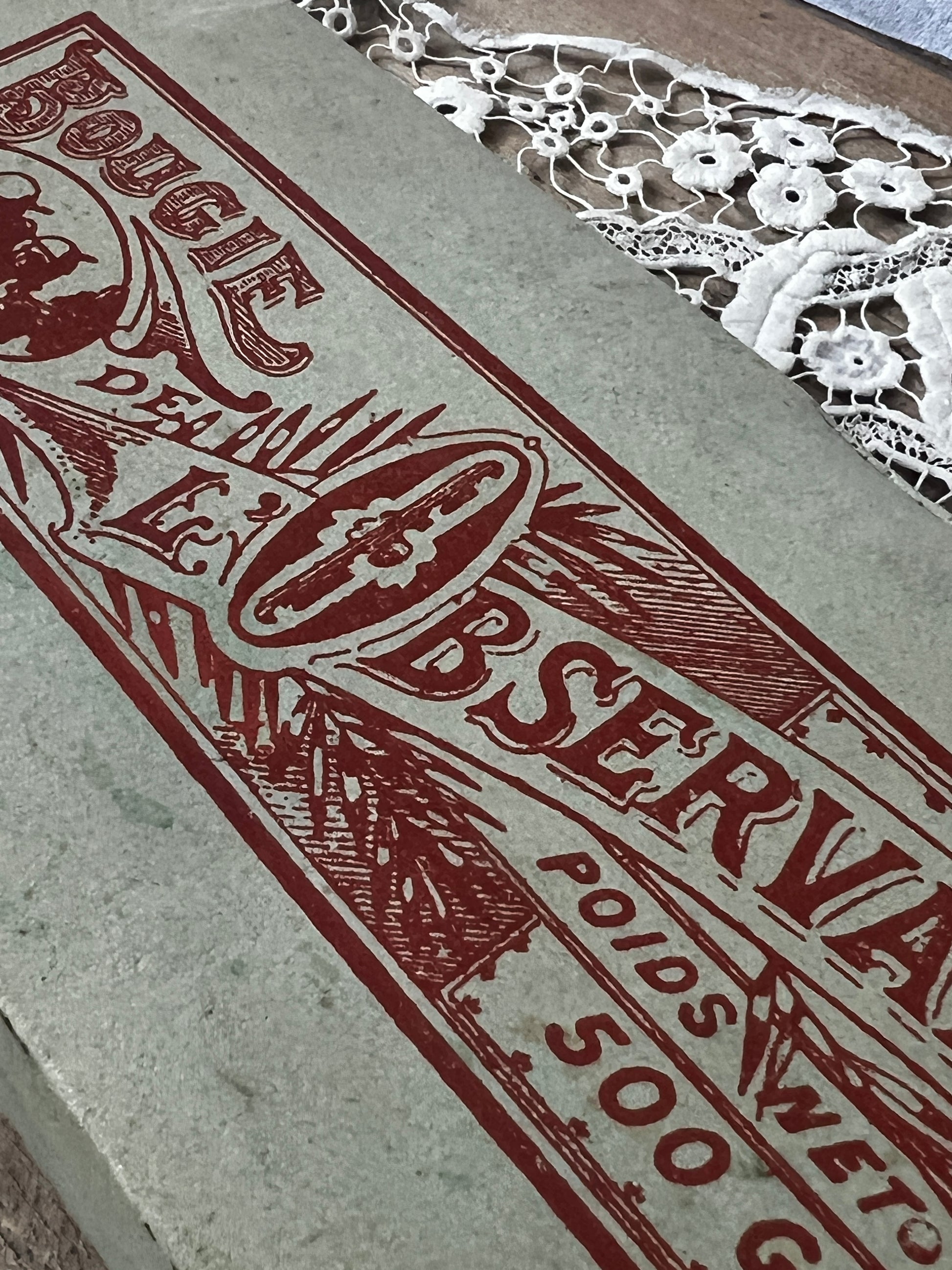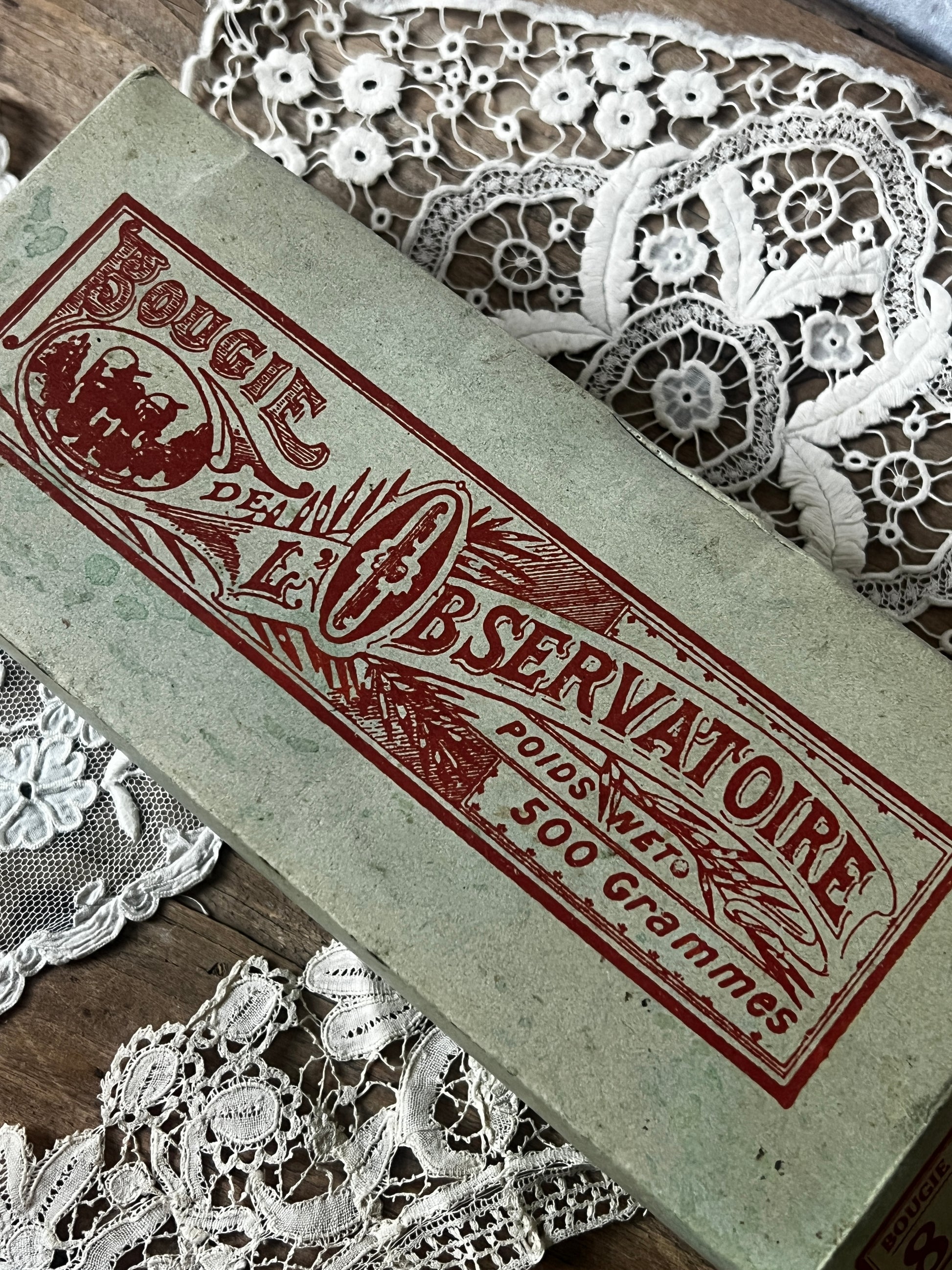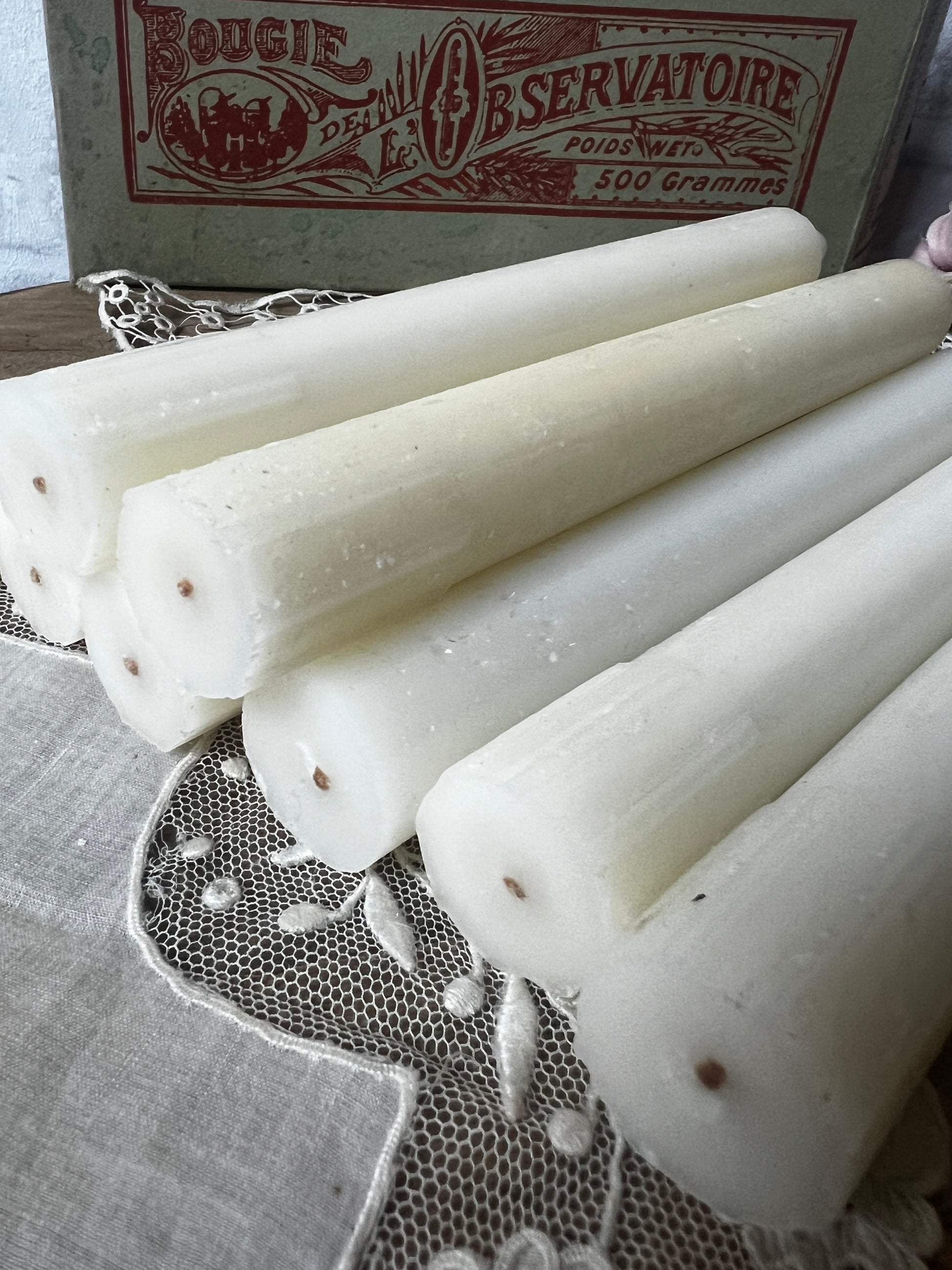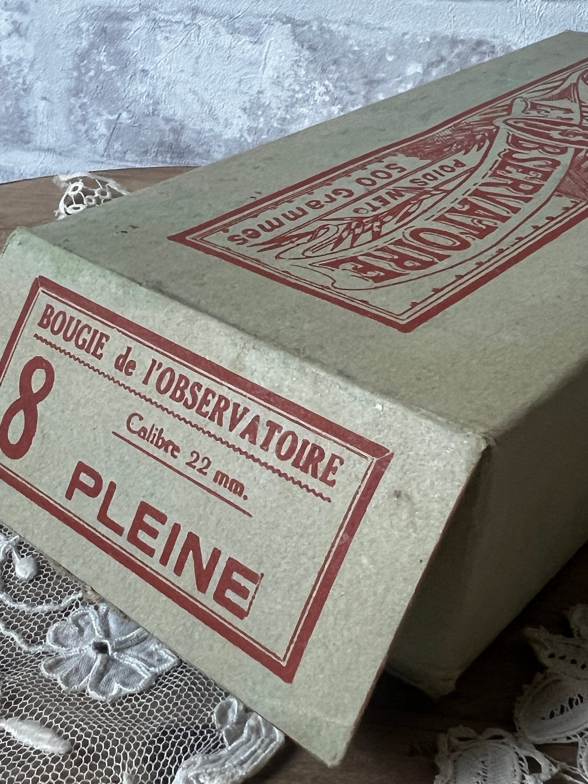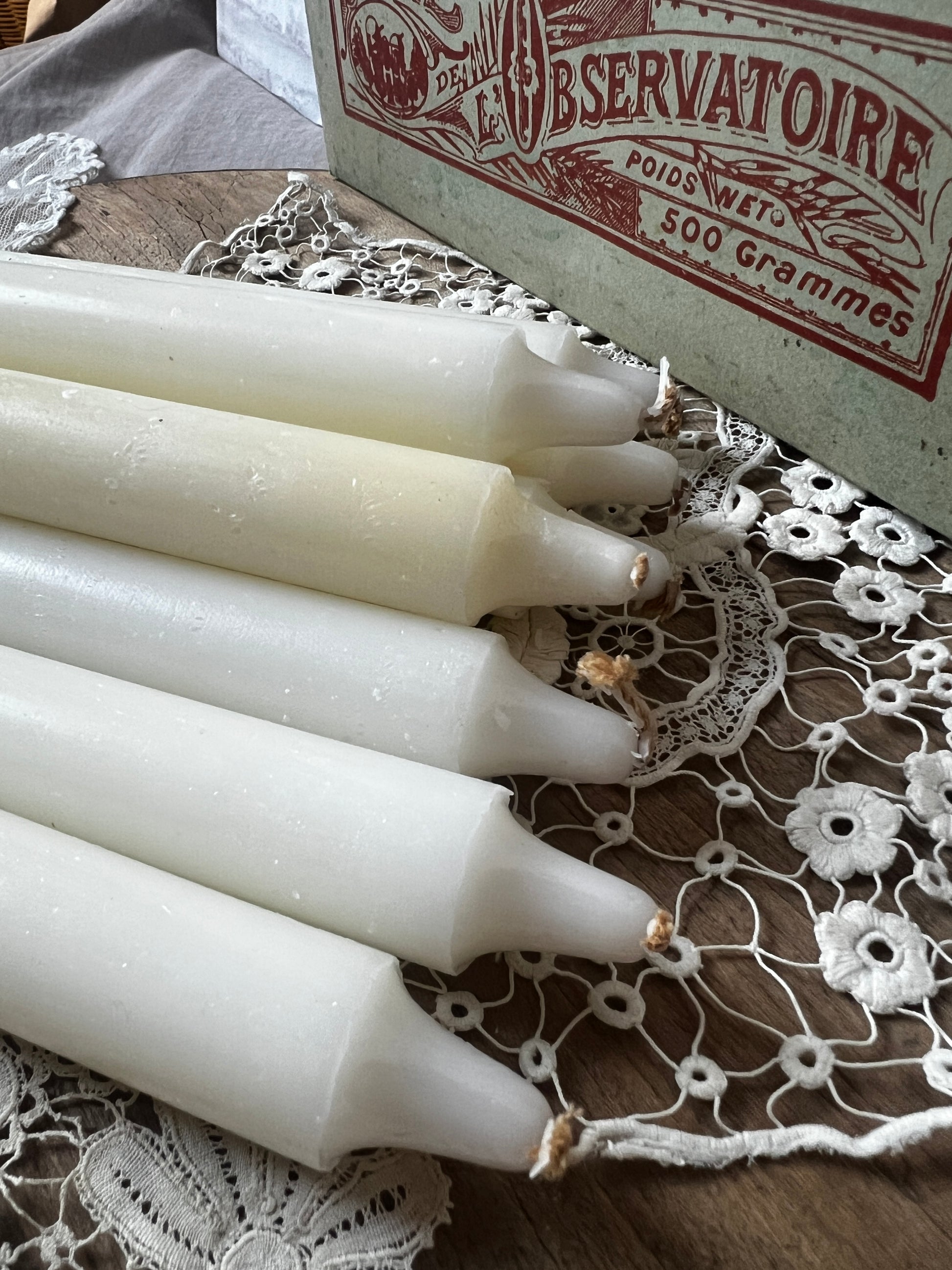 古びた紙箱に収められた、デッドストックのろうそく8本セットです