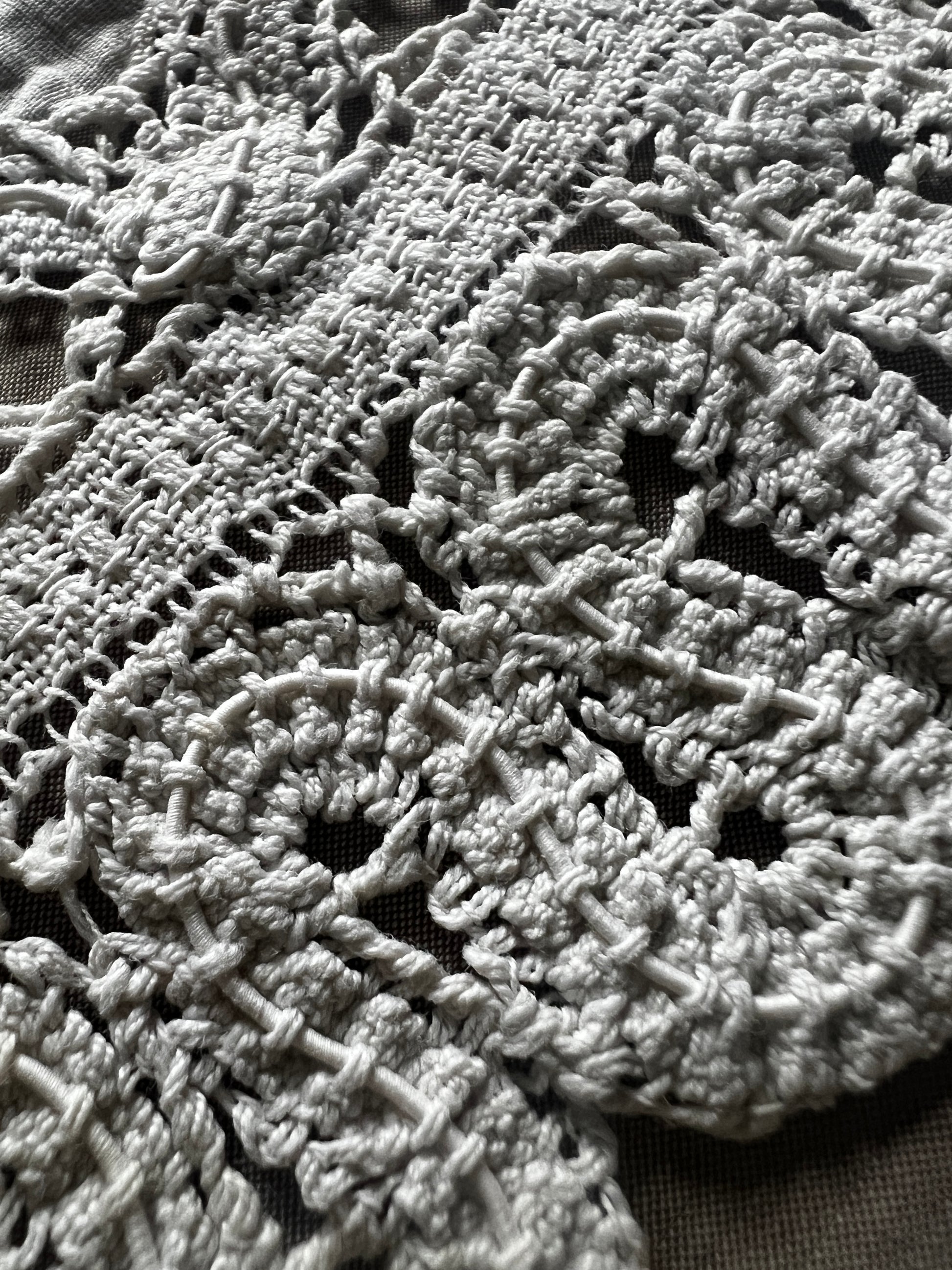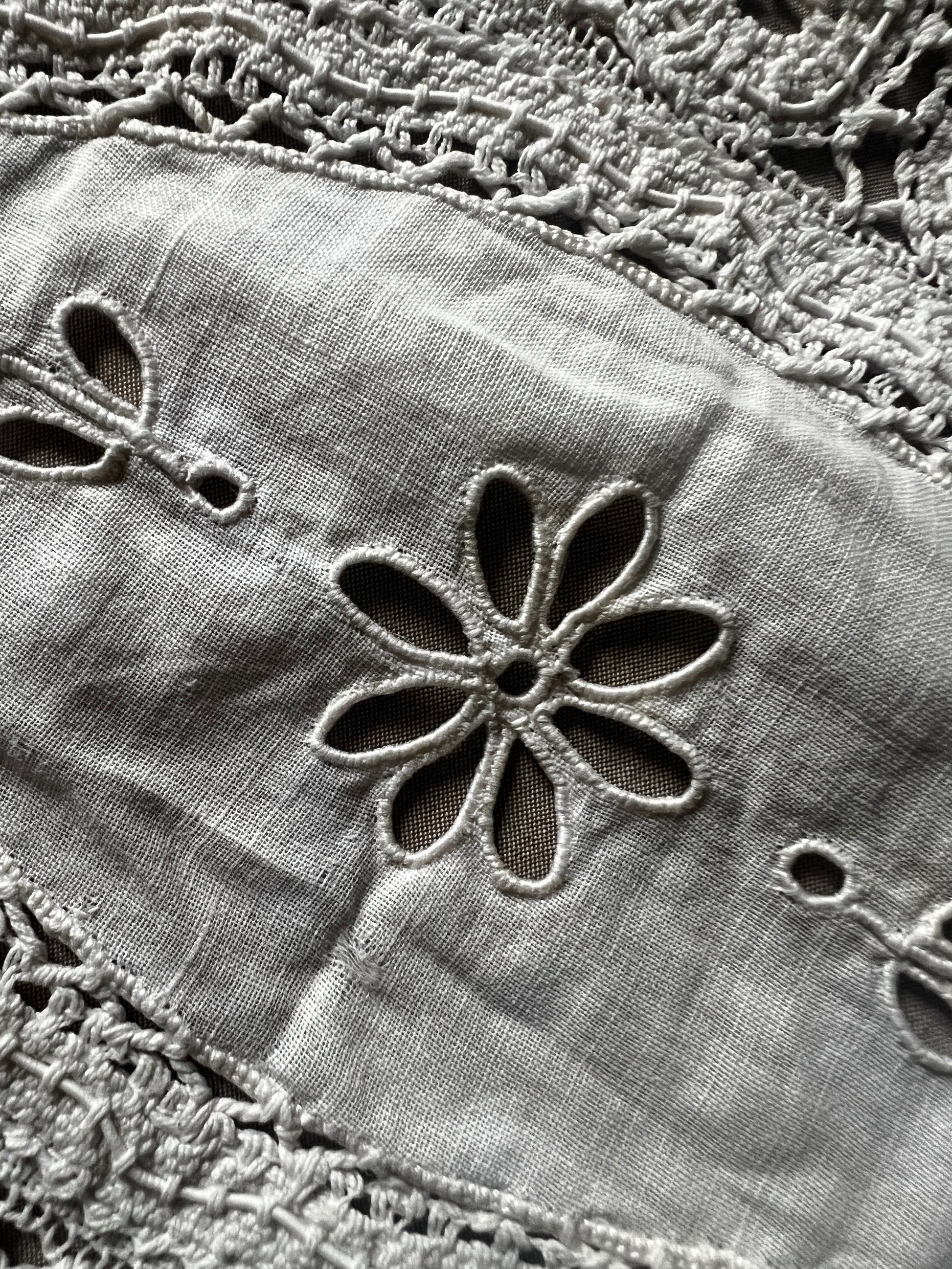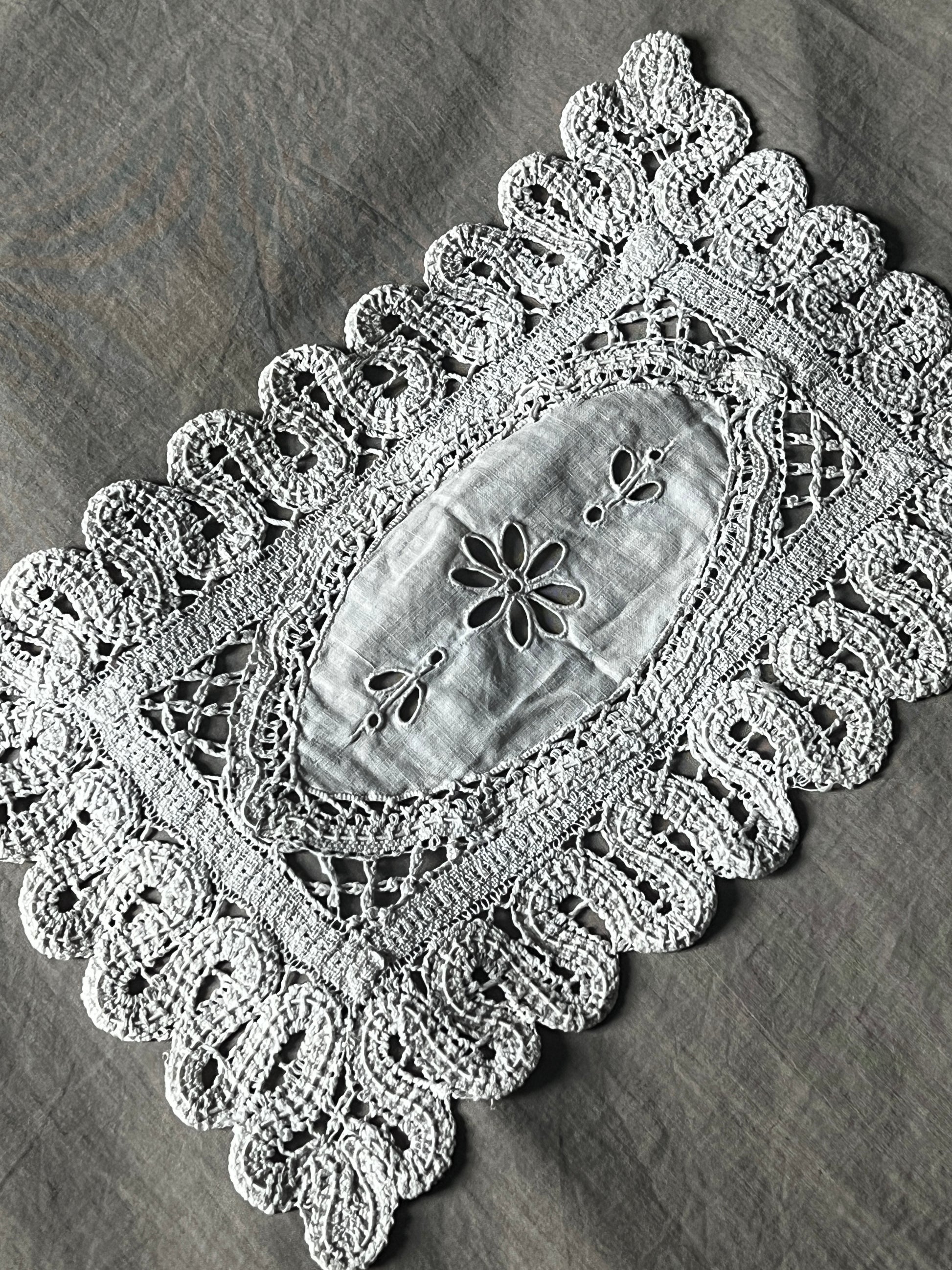 年月を経た布地とレースの色合いが調和した、穏やかな美しさを宿す一枚です