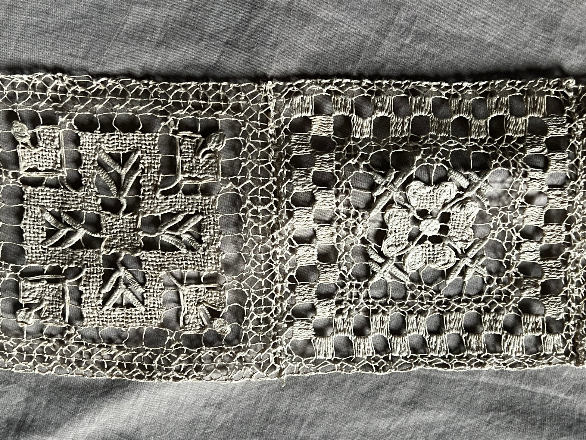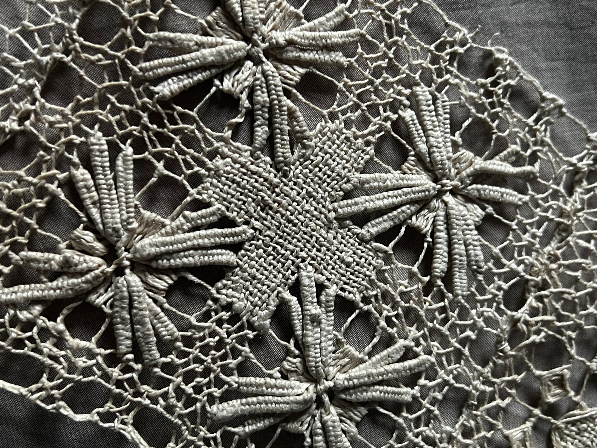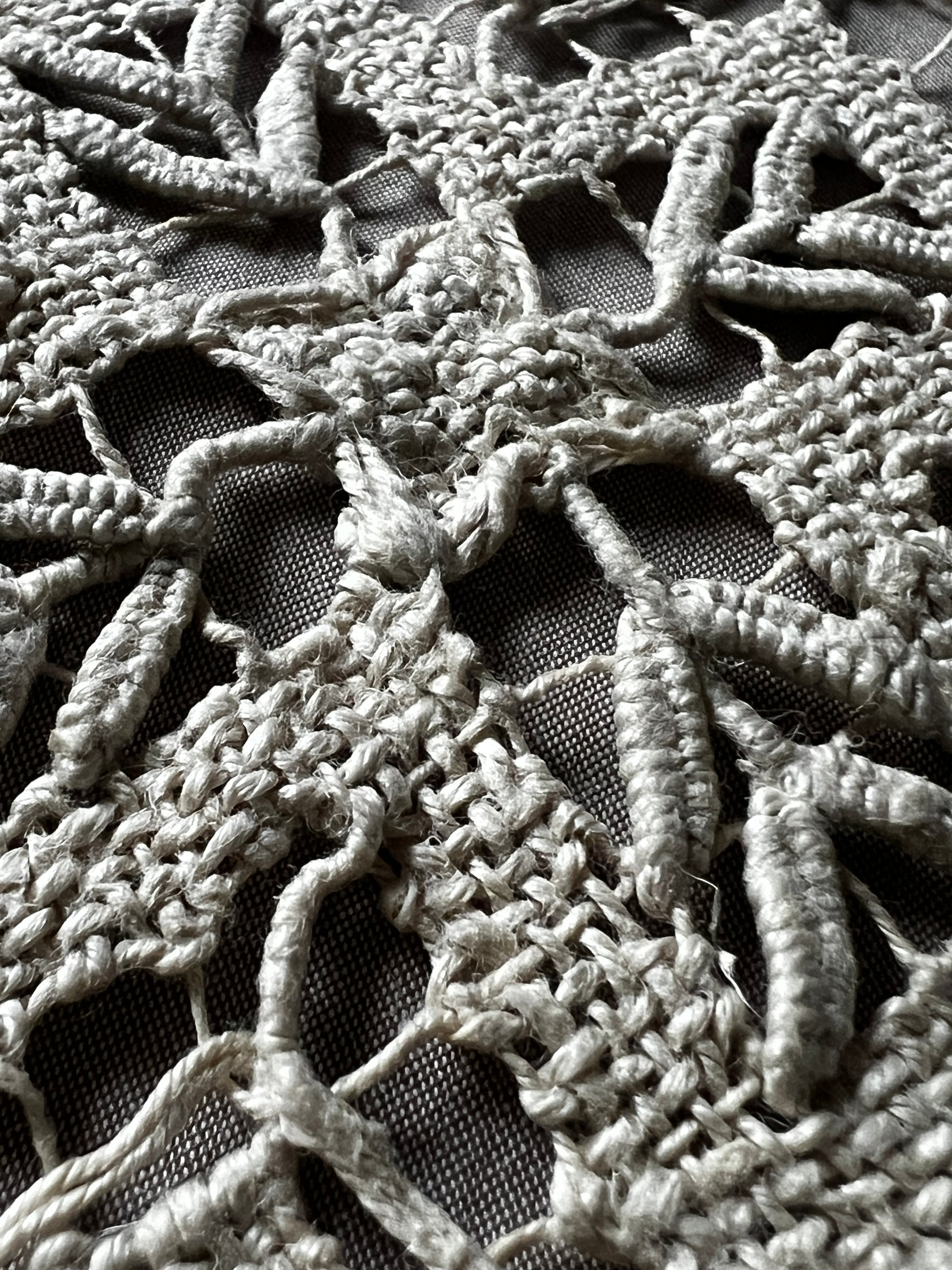ほんのりとしたカフェオレ色が優しい印象のフィレレースモチーフを12枚つないだお品です