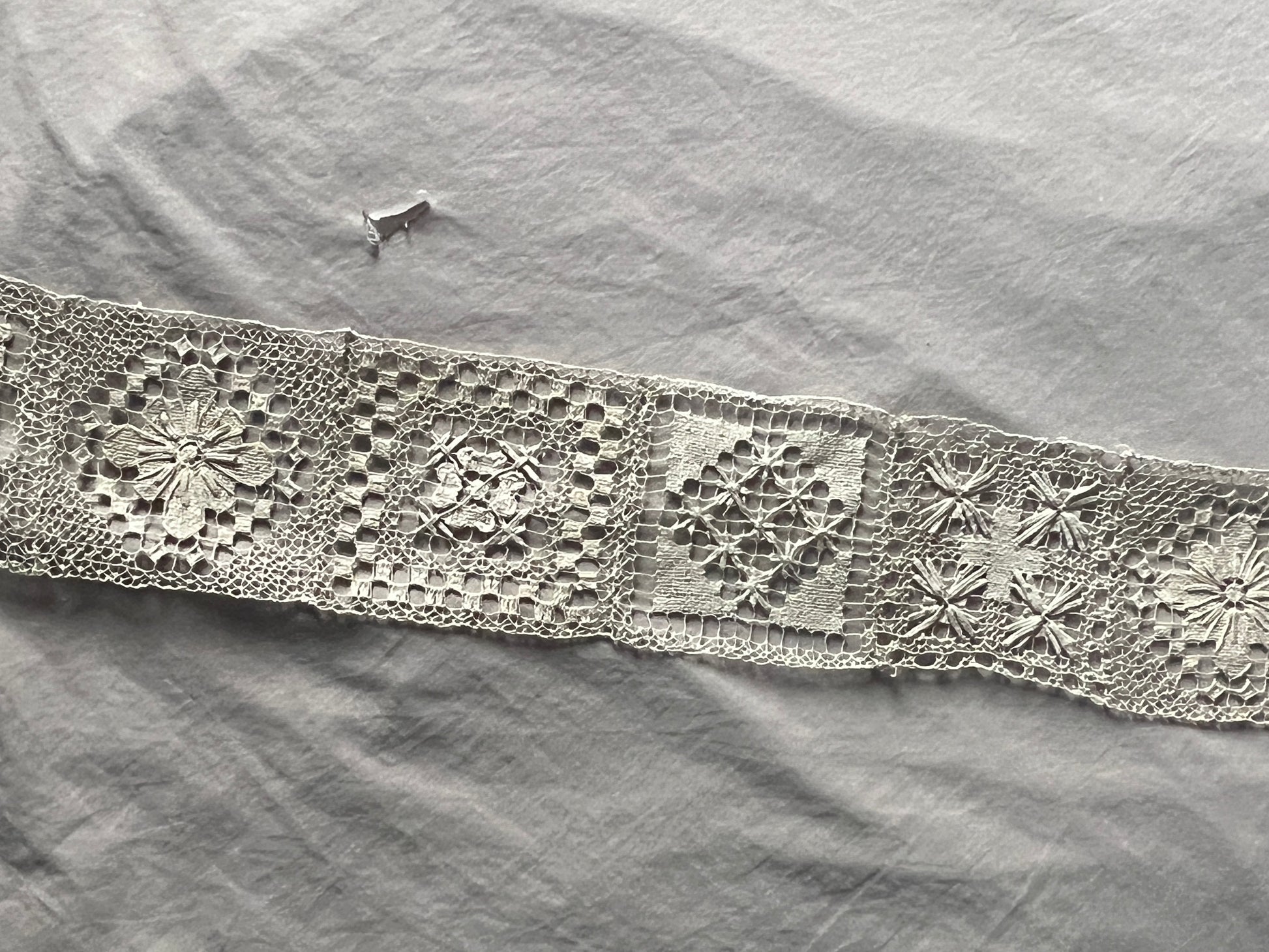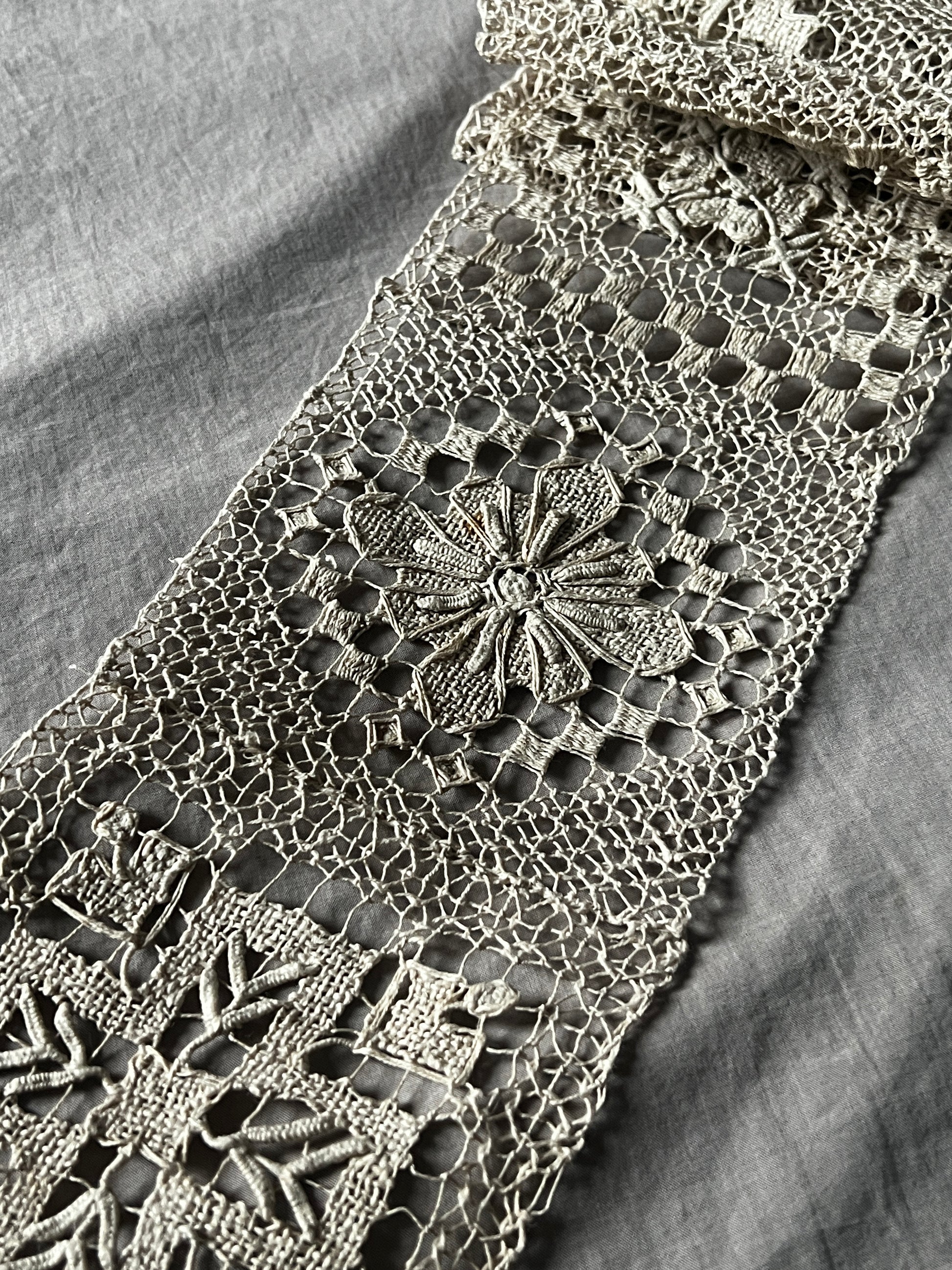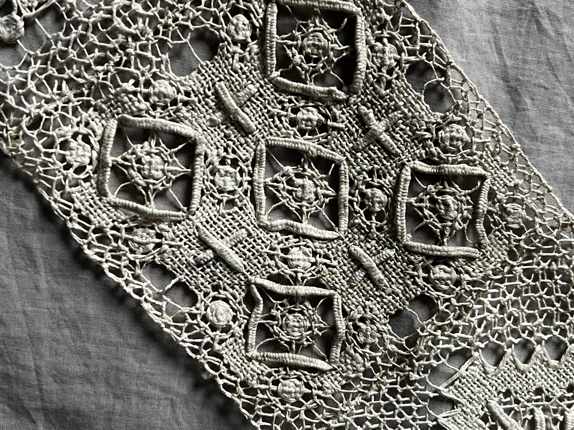 ほんのりとしたカフェオレ色が優しい印象のフィレレースモチーフを12枚つないだお品です