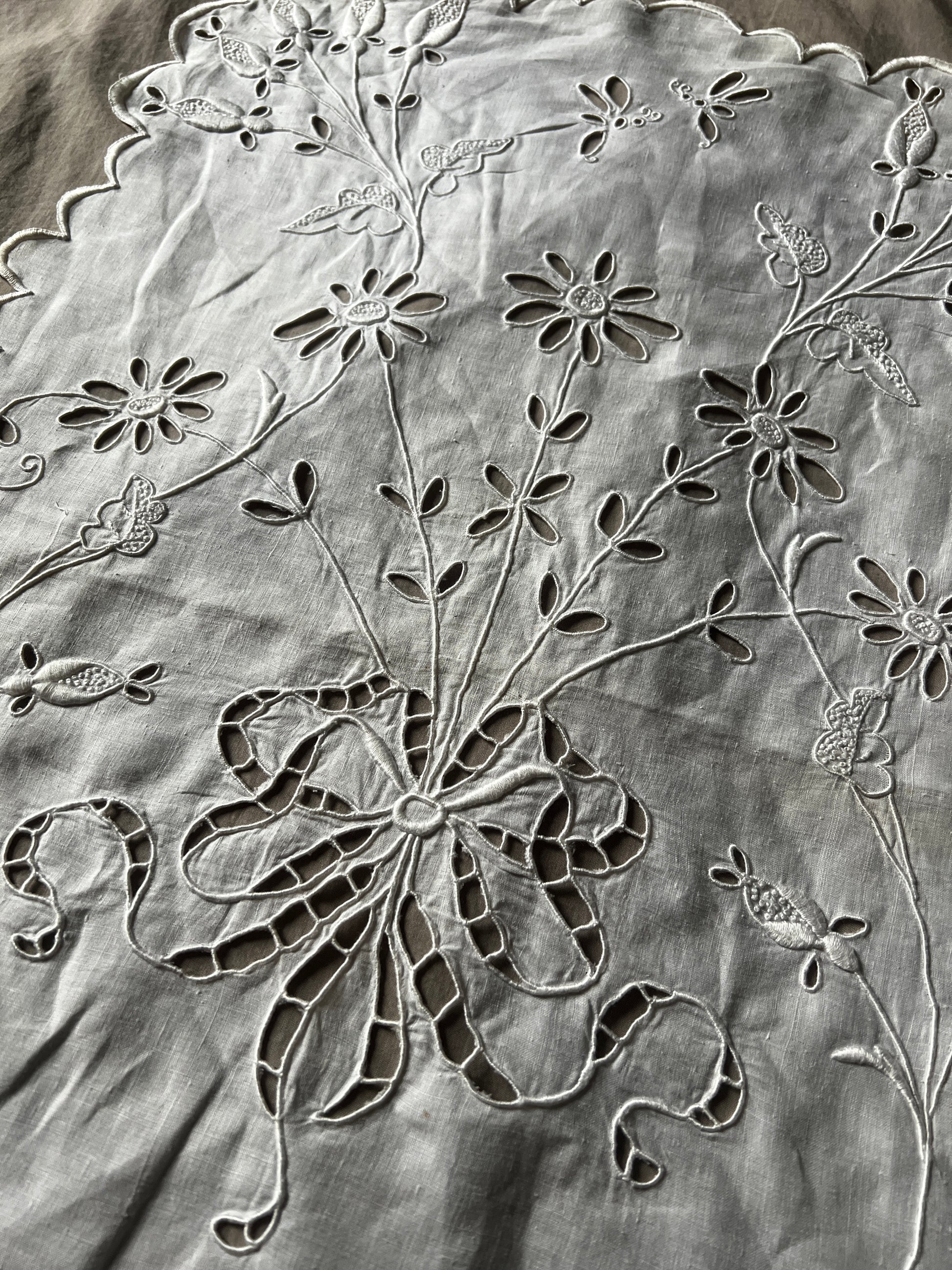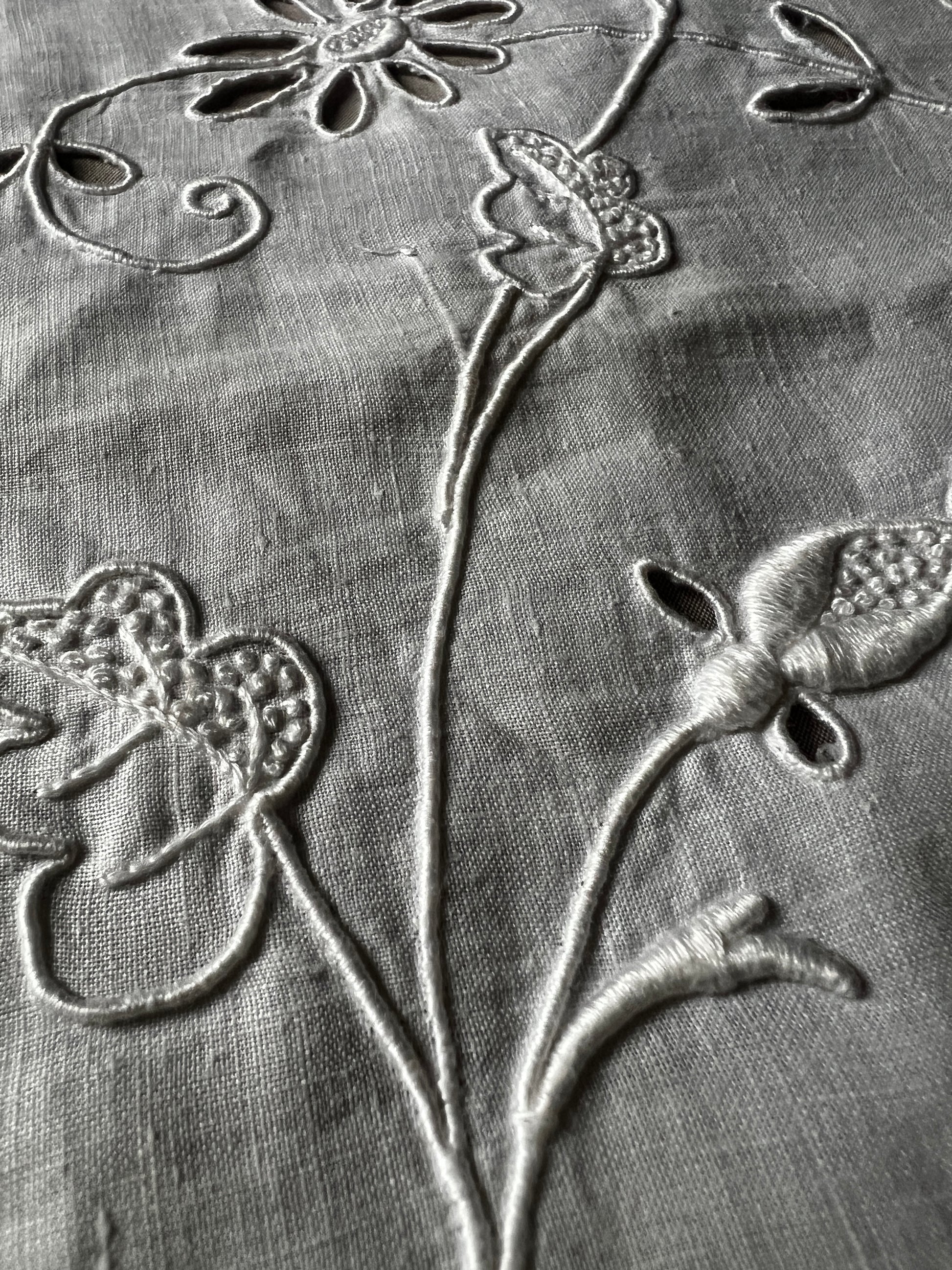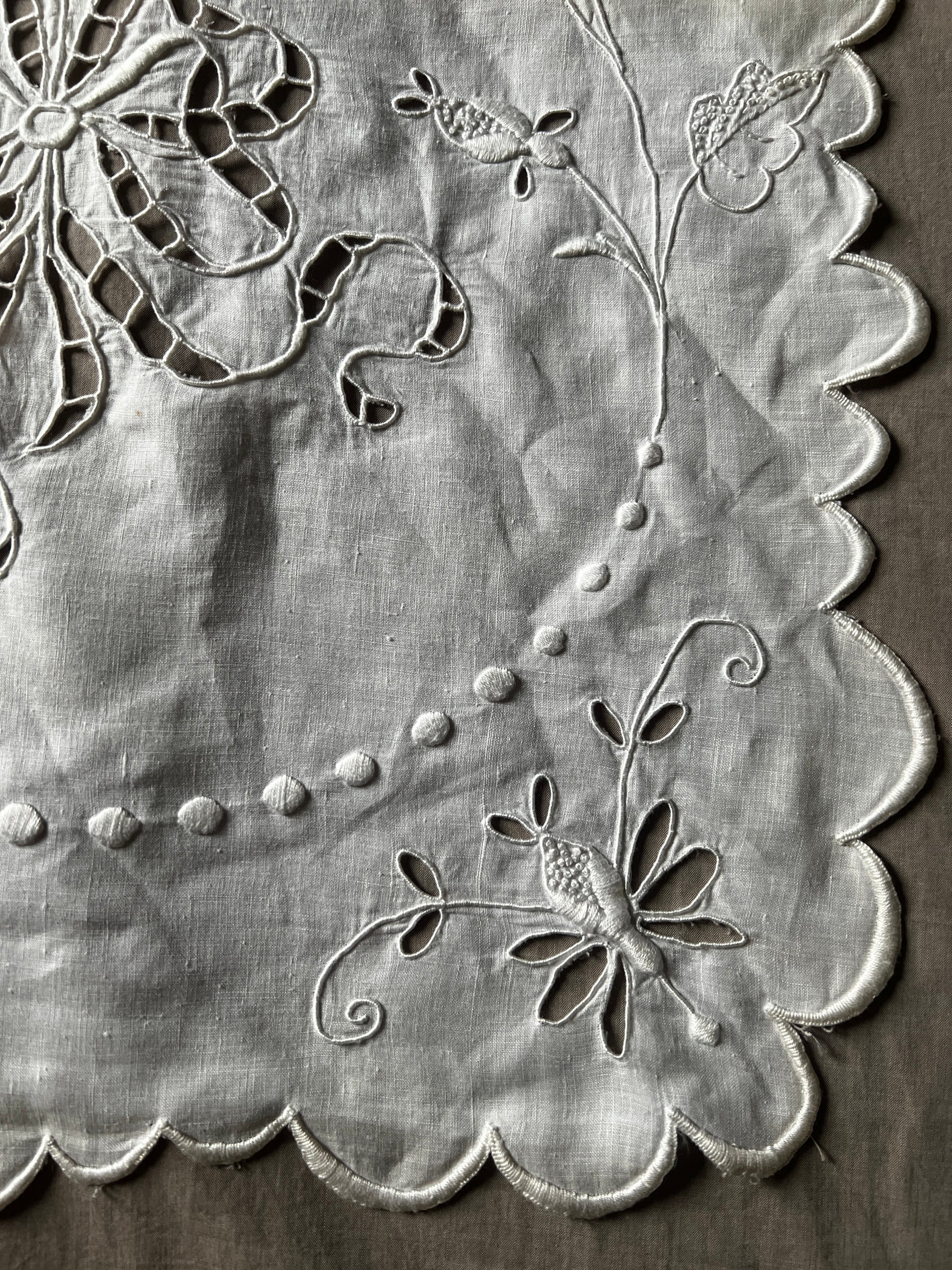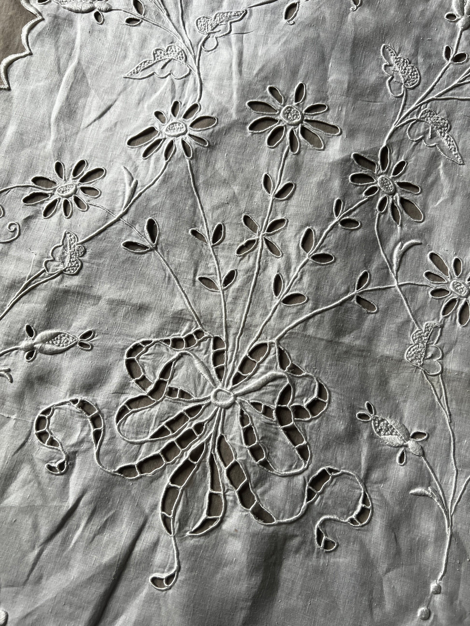リボンに彩られたブーケや舞う蝶々が繊細に刺繍された、美麗なクロスです