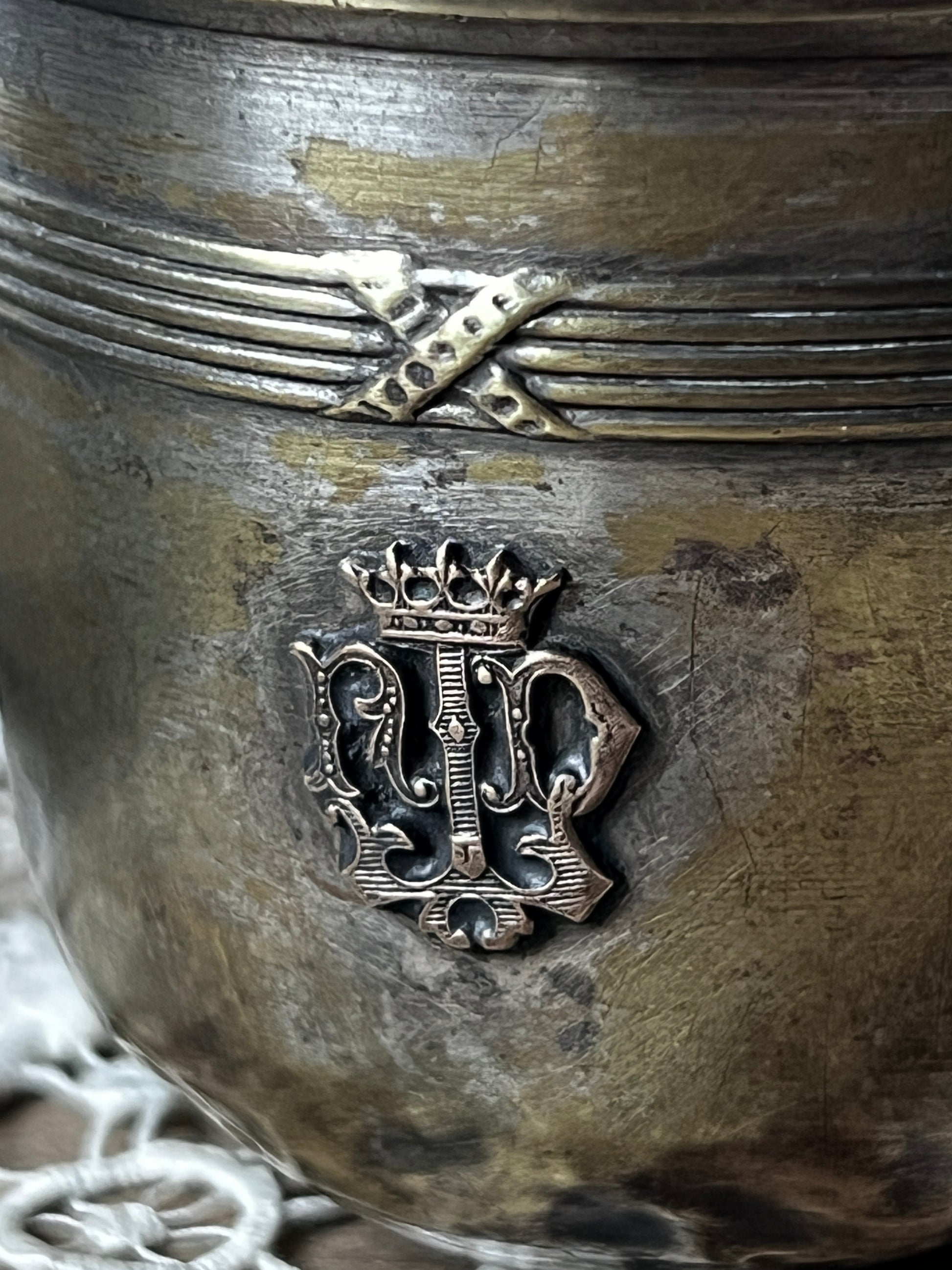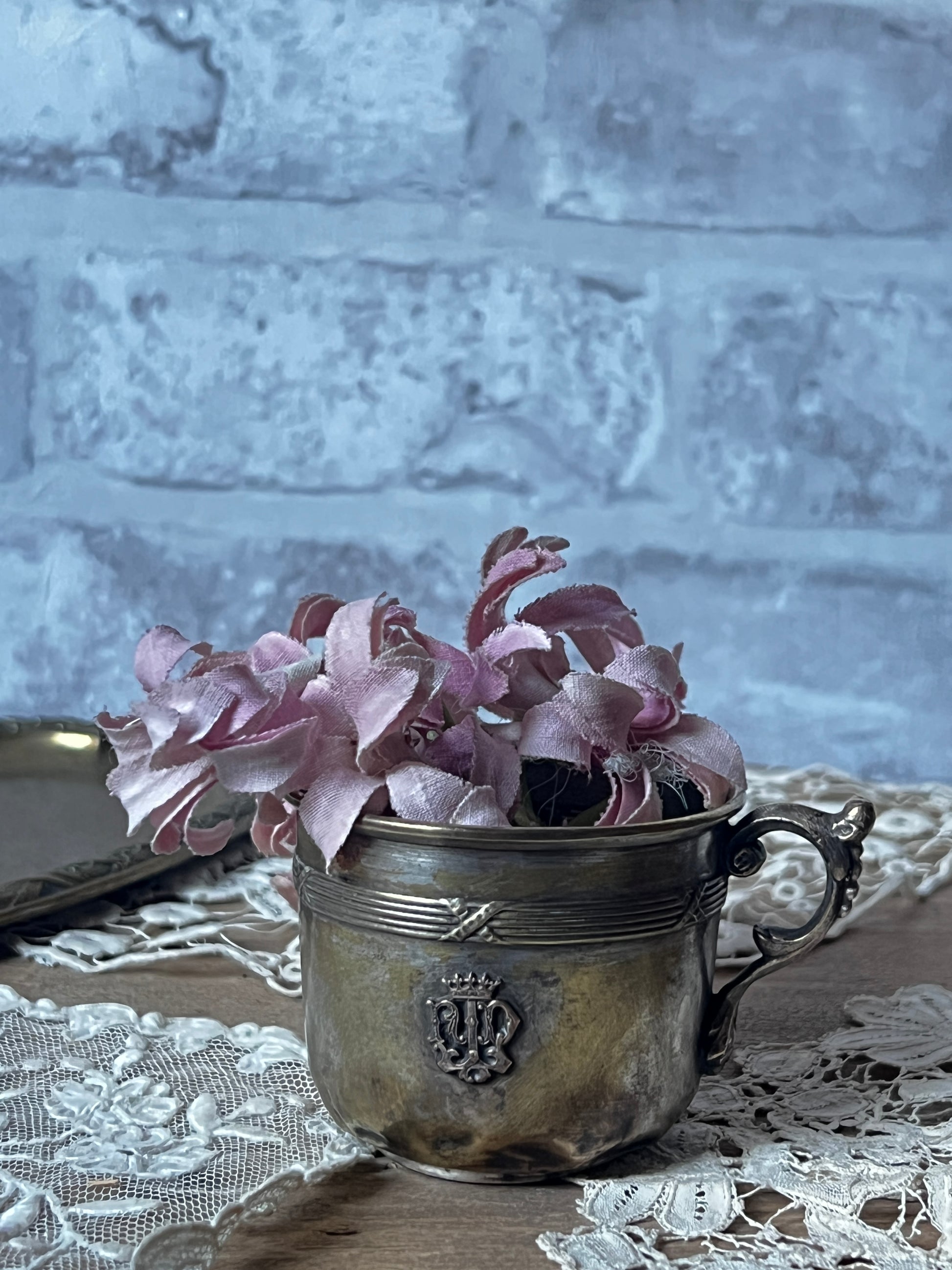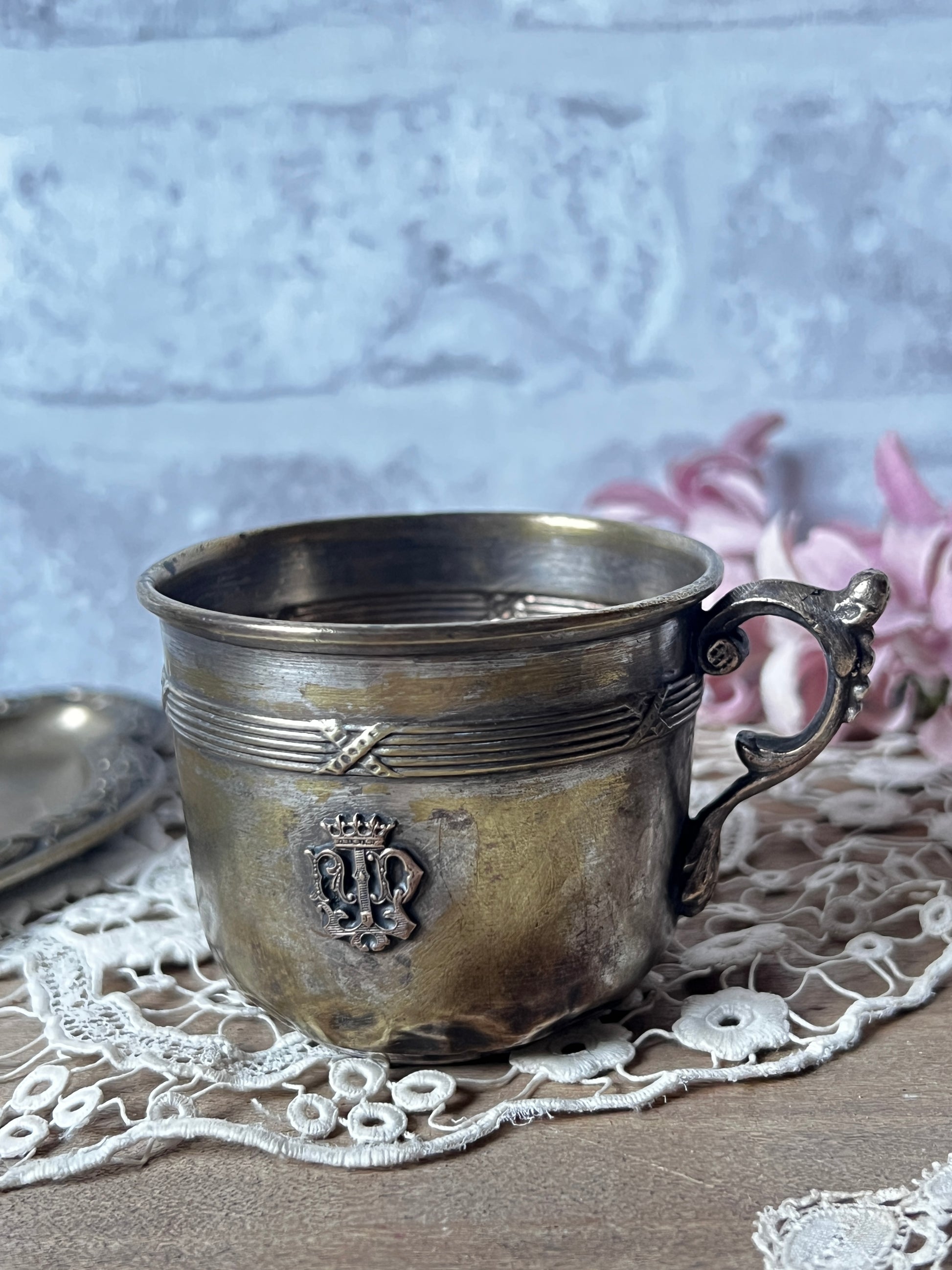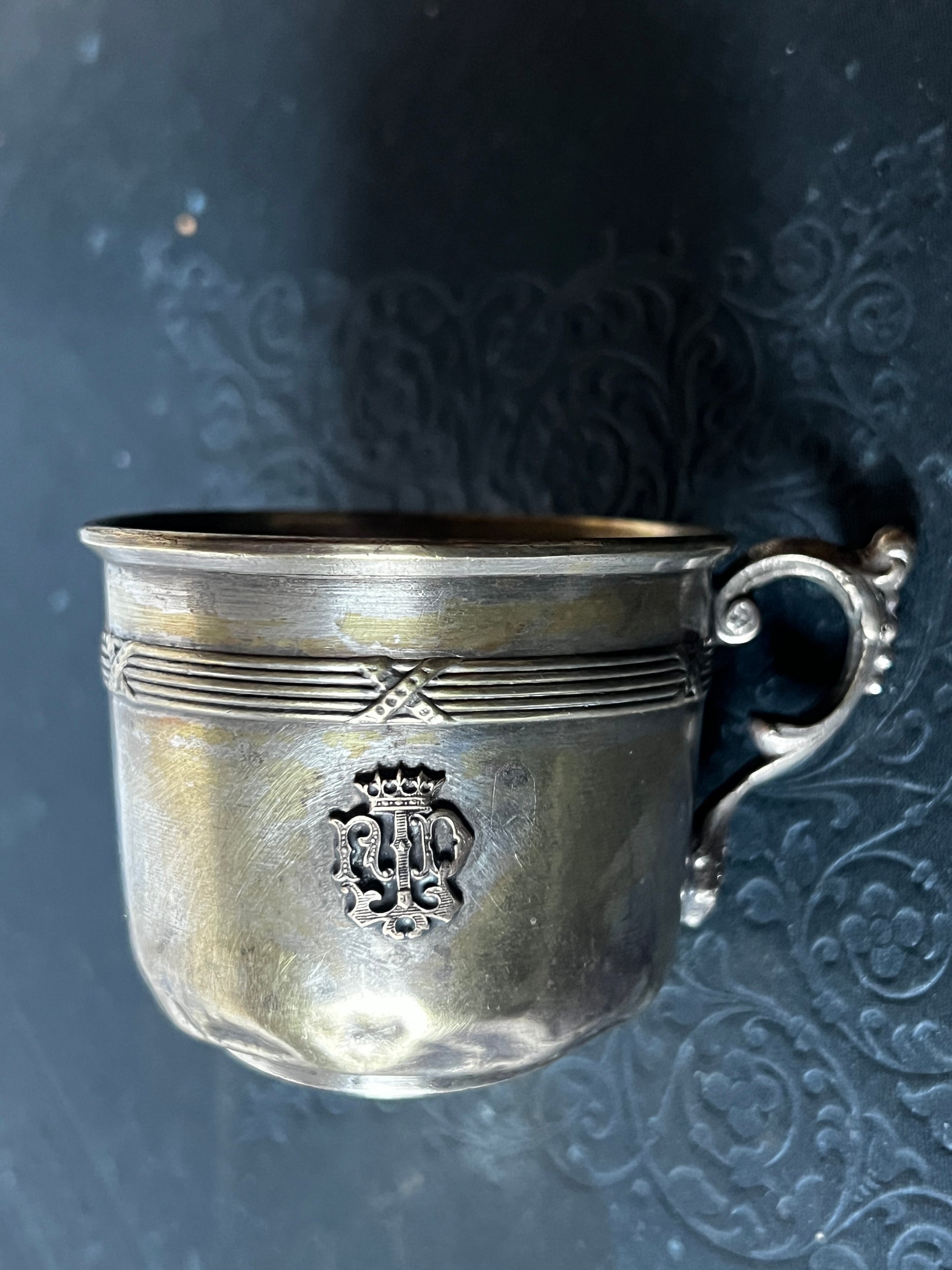 王冠の紋章が刻まれた、気品漂う銀メッキ製の古いカップです