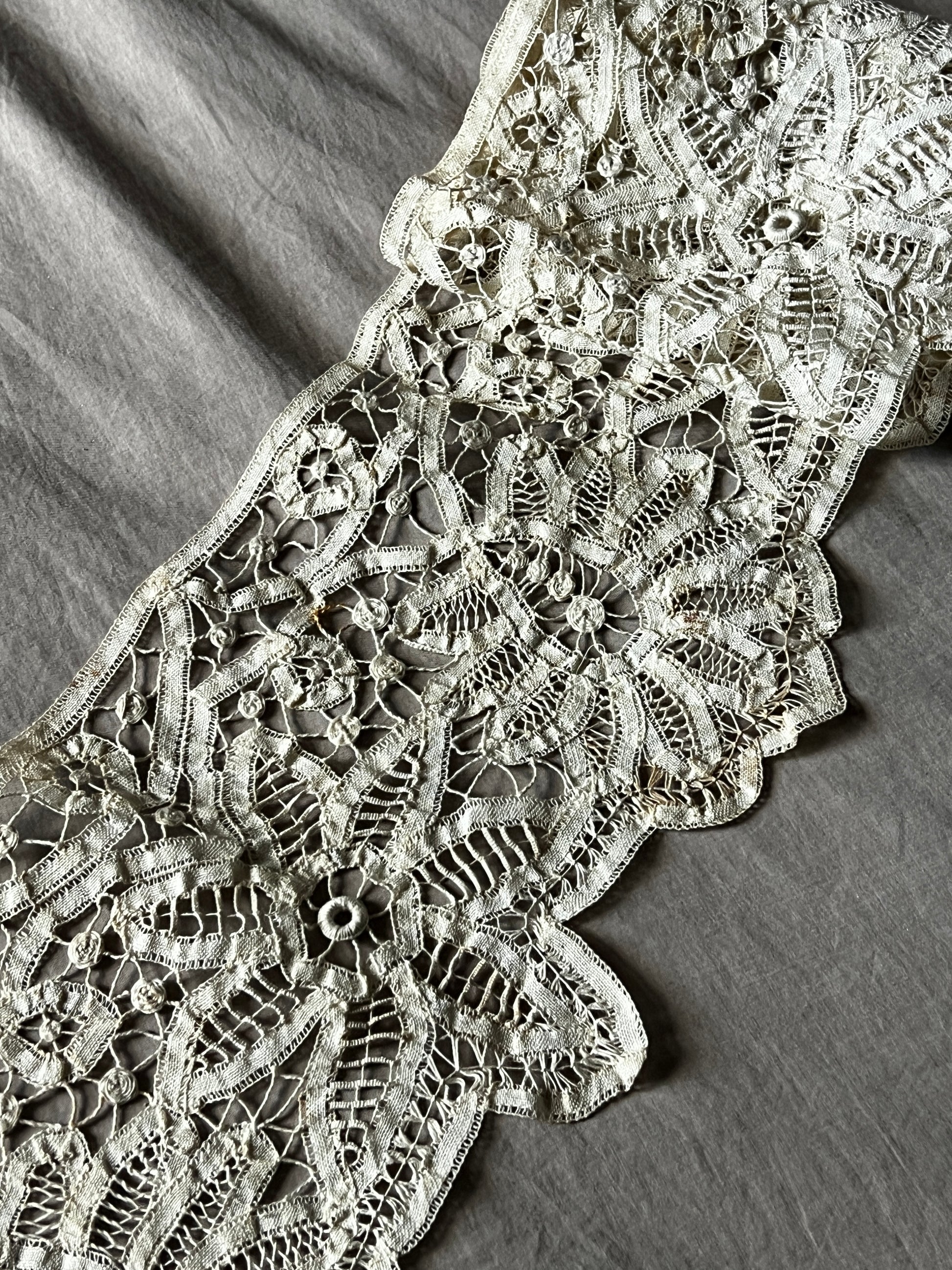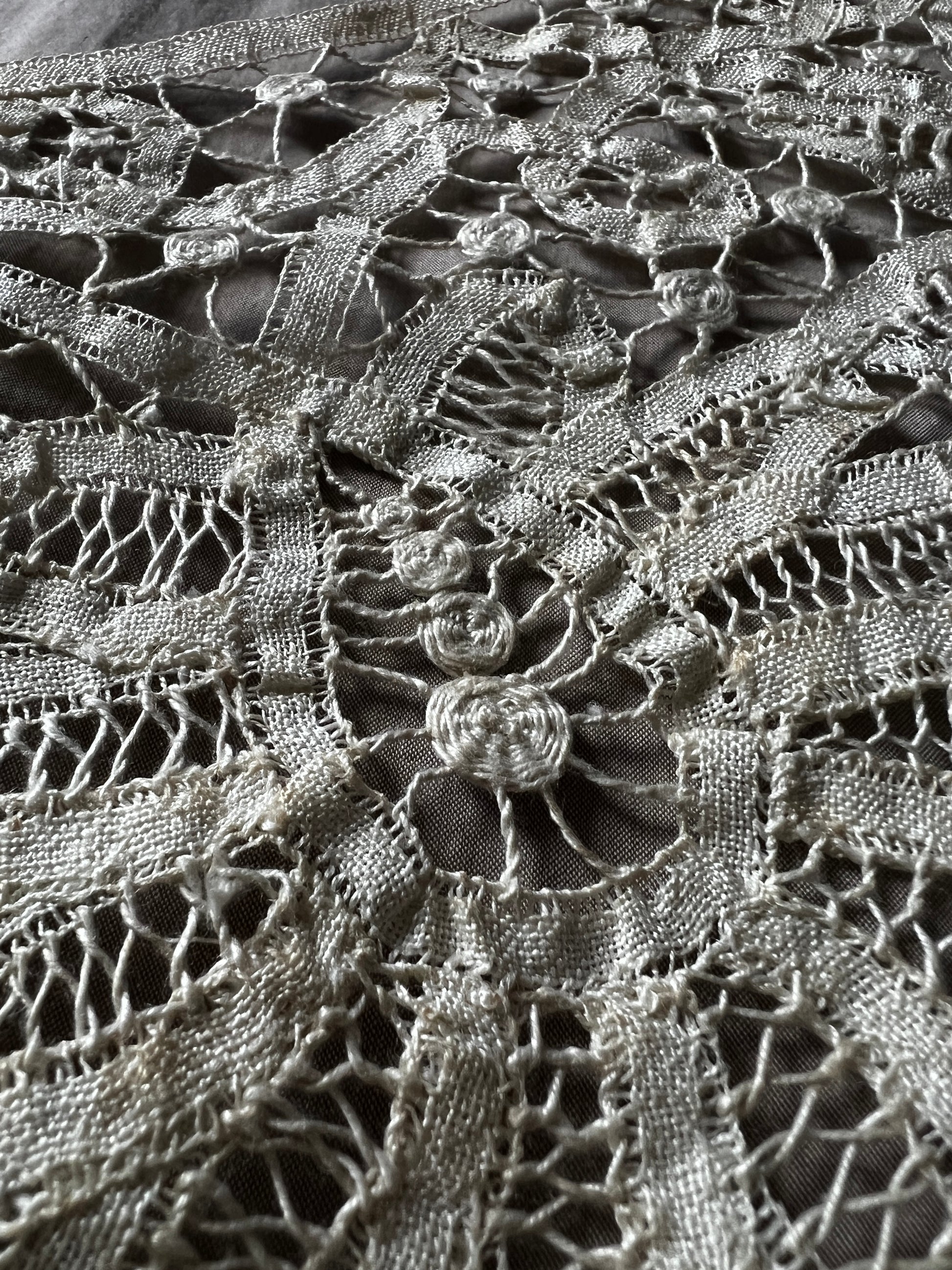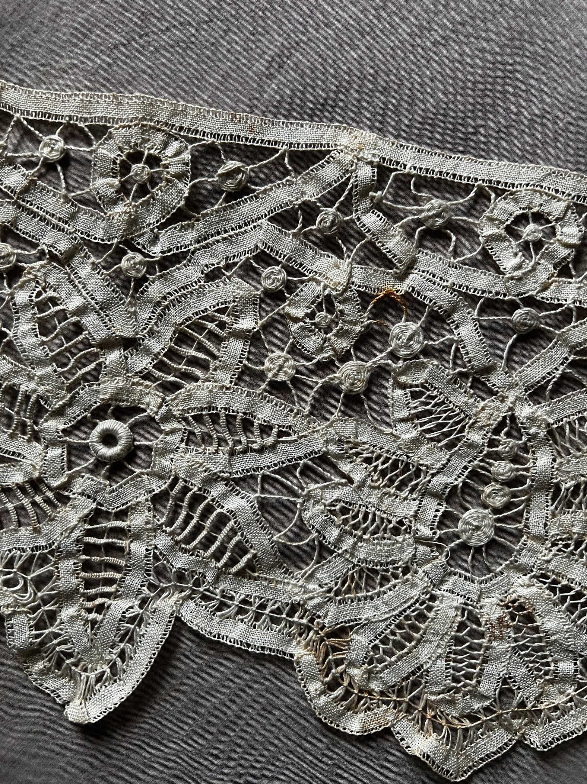 テープを組み合わせて模様を作るバテンレースの技法が用いられており、100年以上前の解説書にも「ルネッサンスレース」として記載されている歴史ある手法です