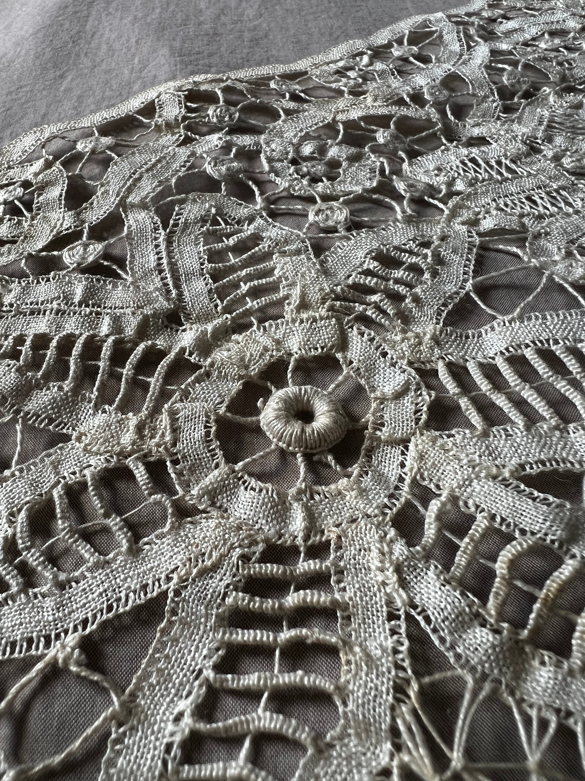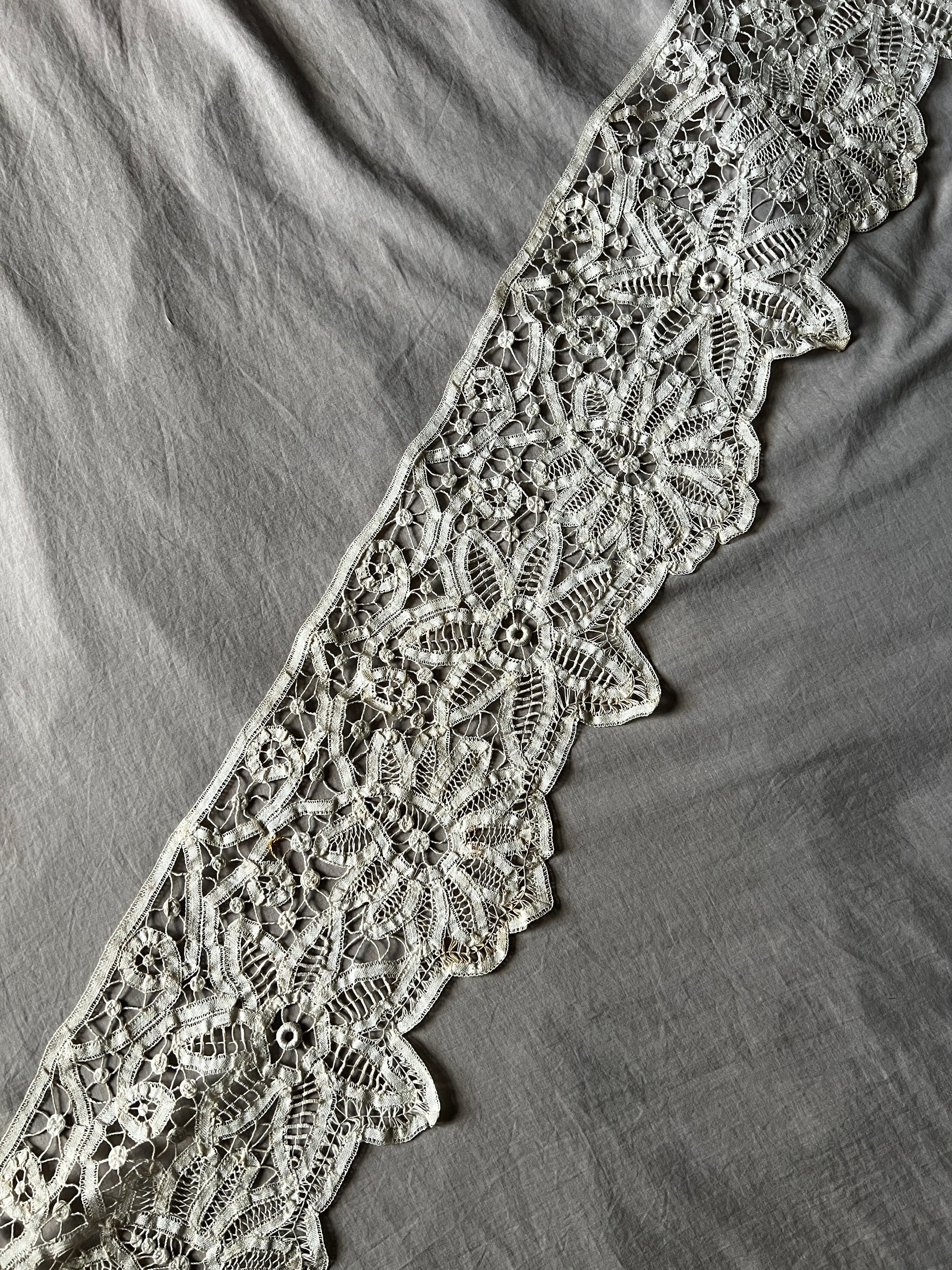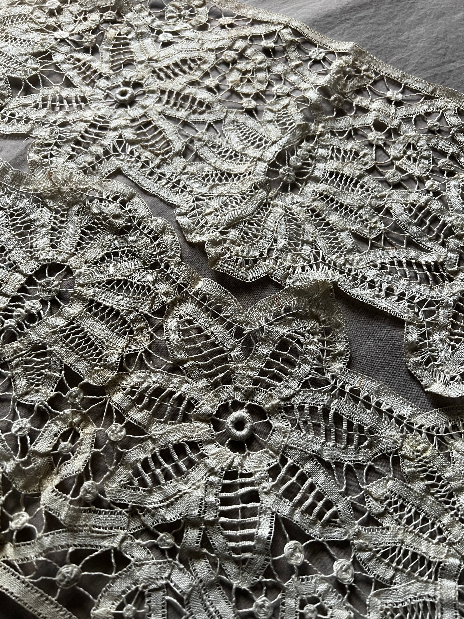 テープを組み合わせて模様を作るバテンレースの技法が用いられており、100年以上前の解説書にも「ルネッサンスレース」として記載されている歴史ある手法です