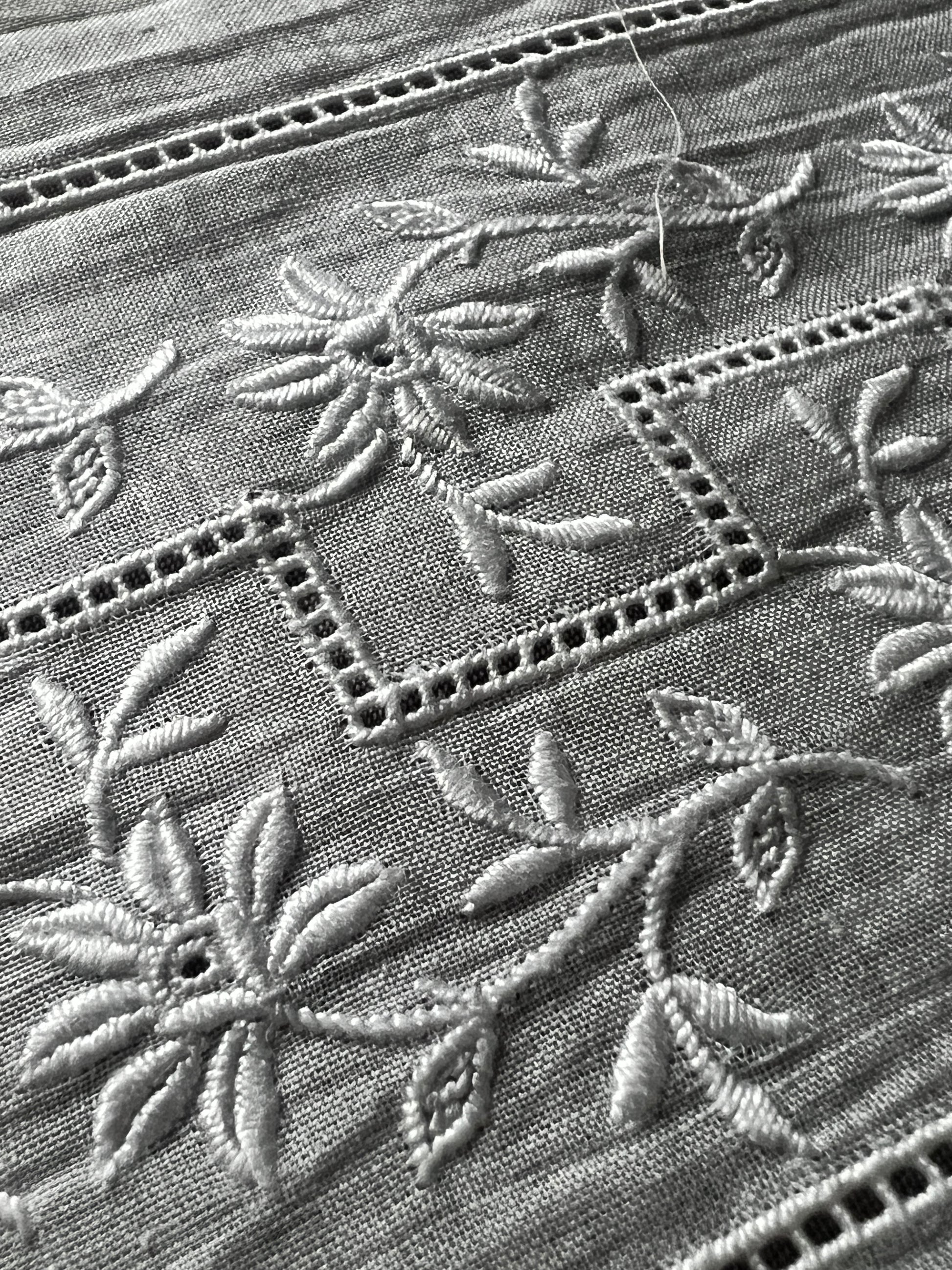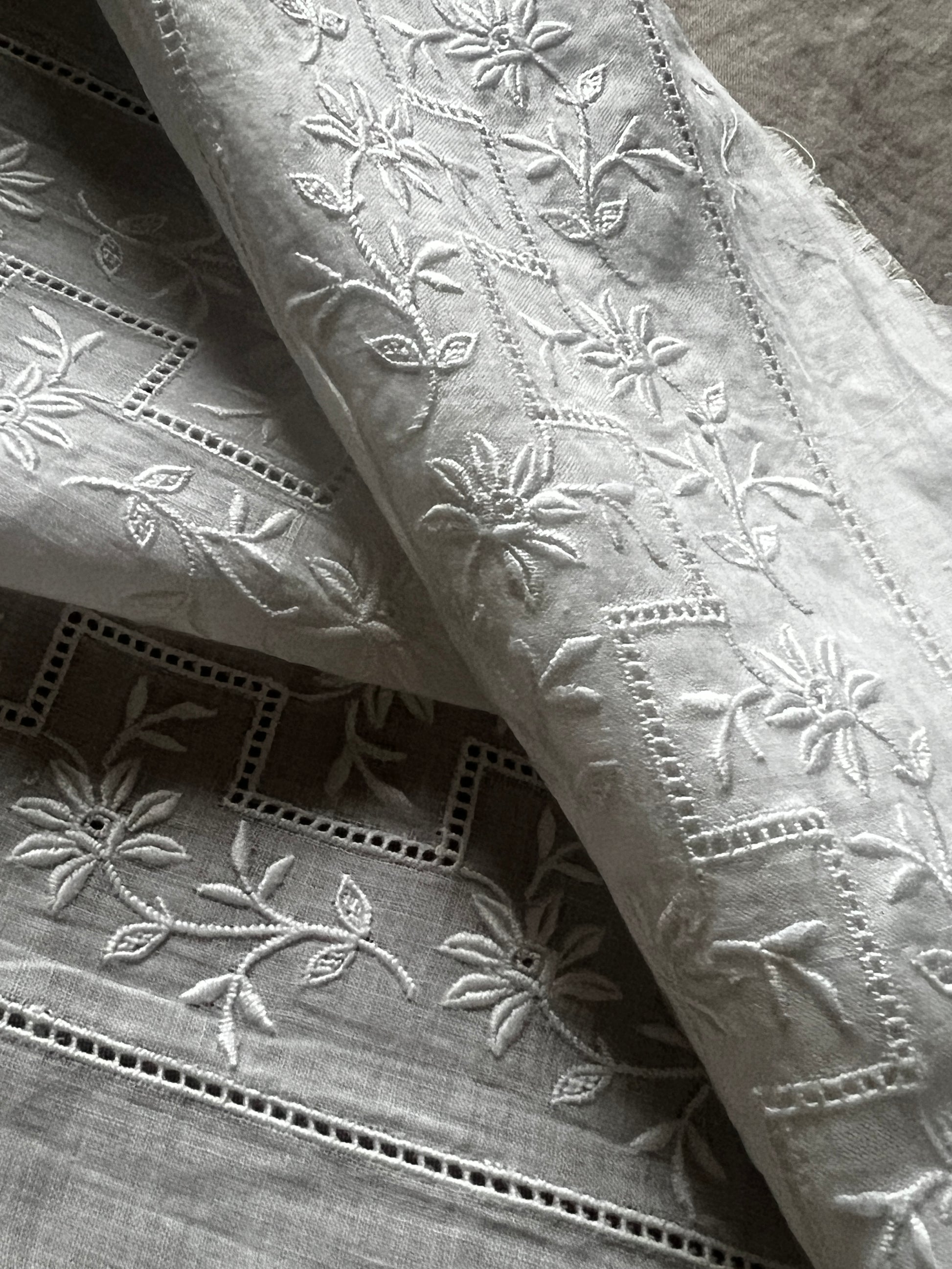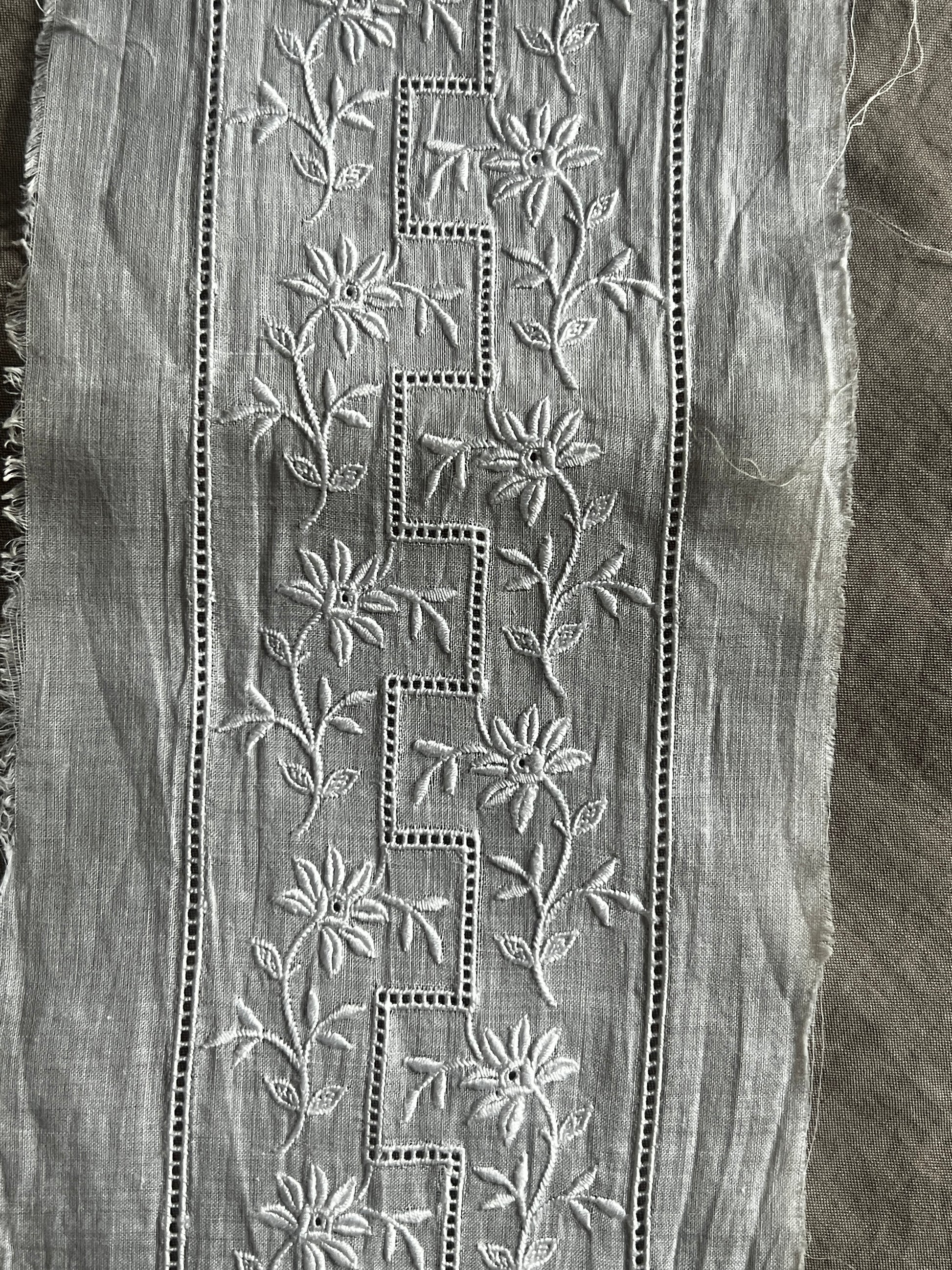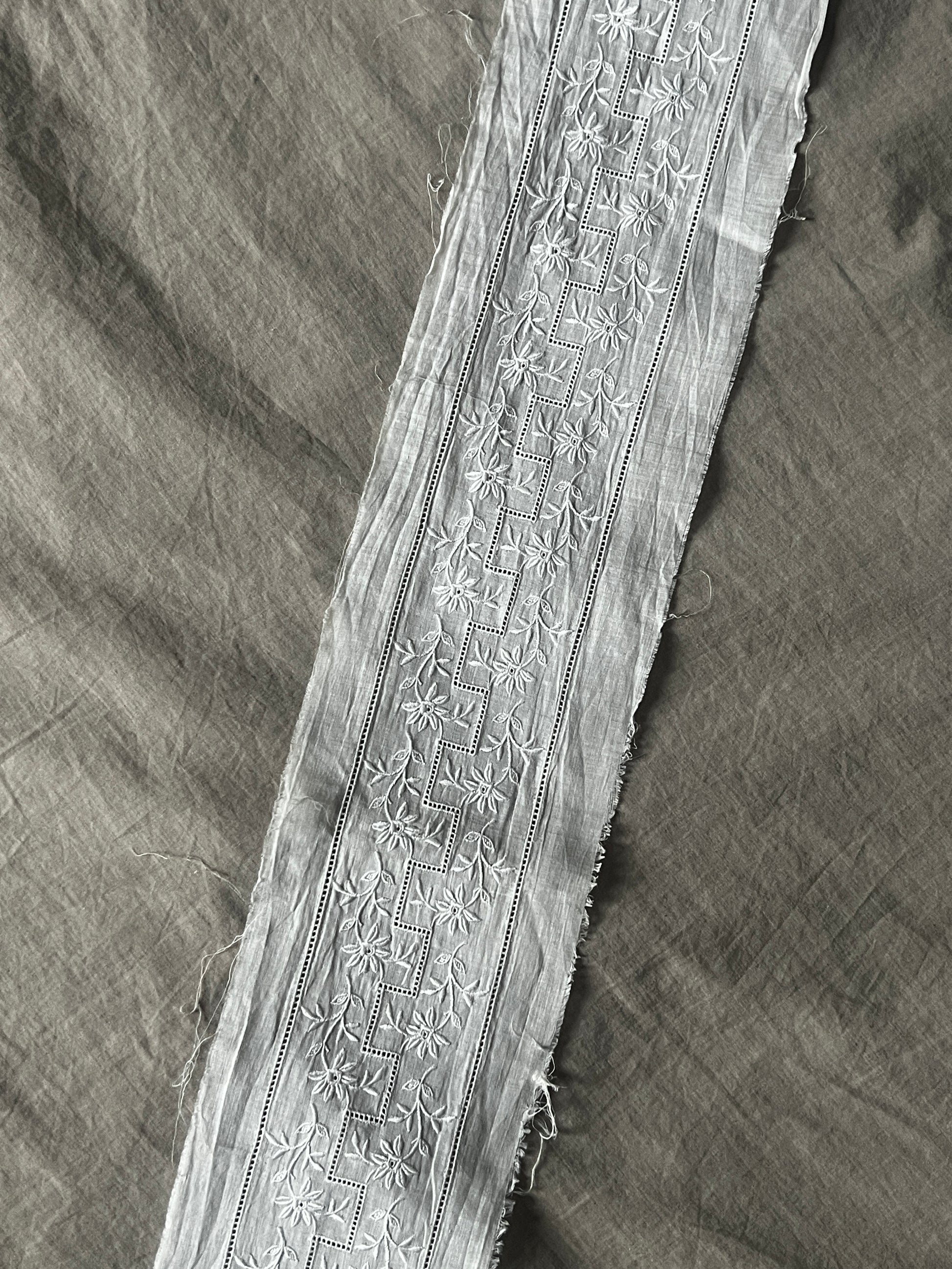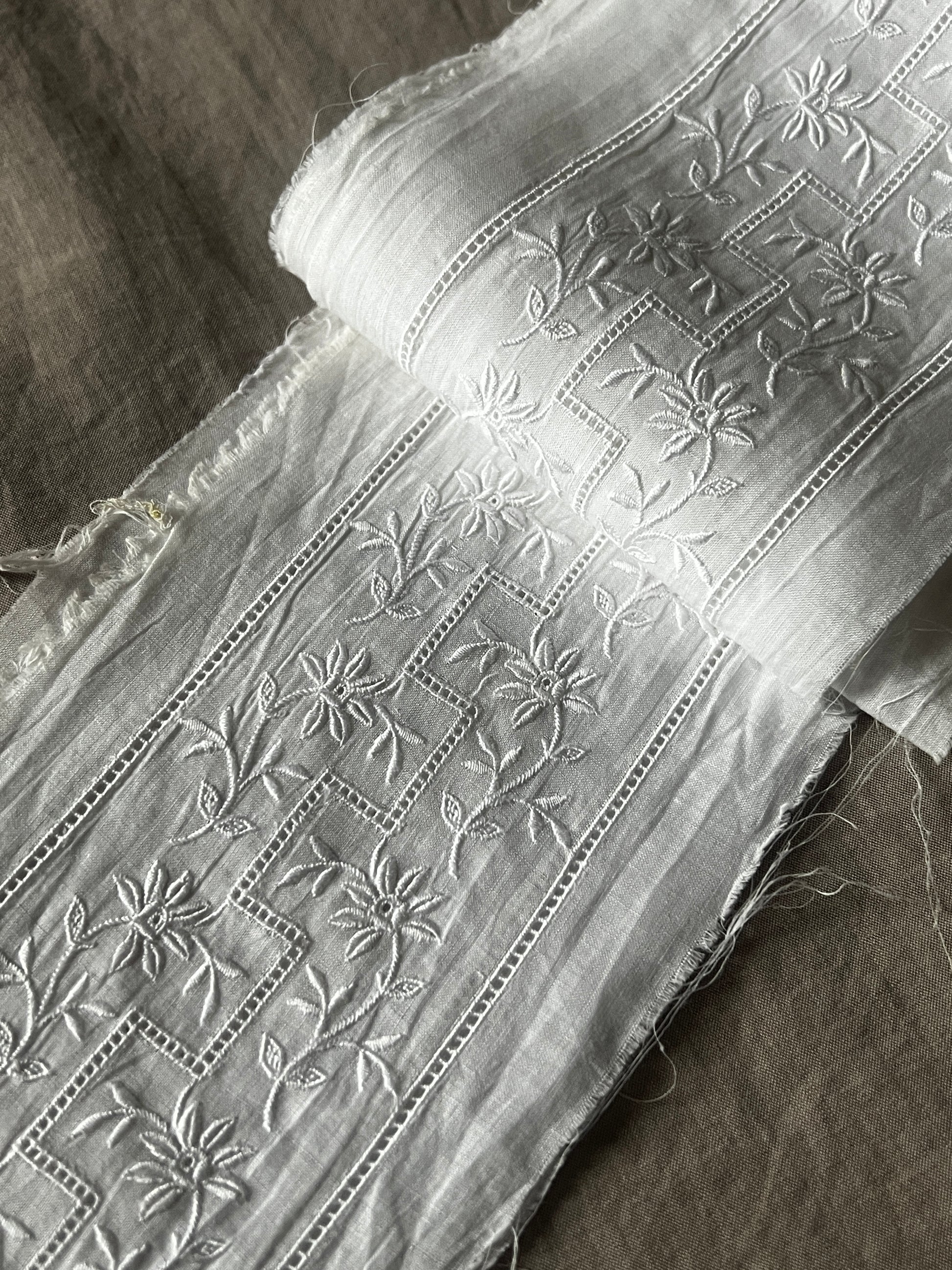 薄く軽やかなコットンローン地に白刺繍が施されたトリムです