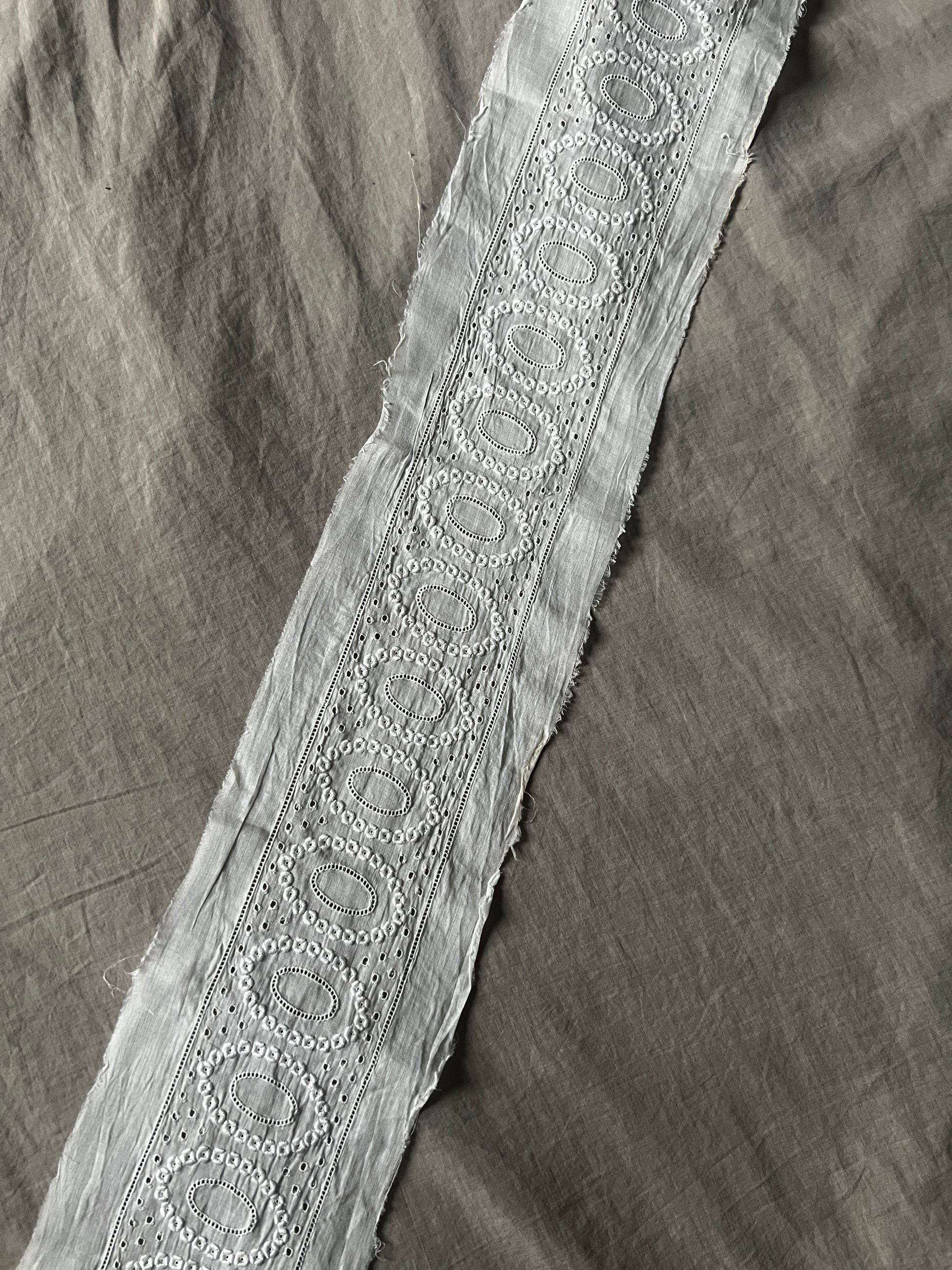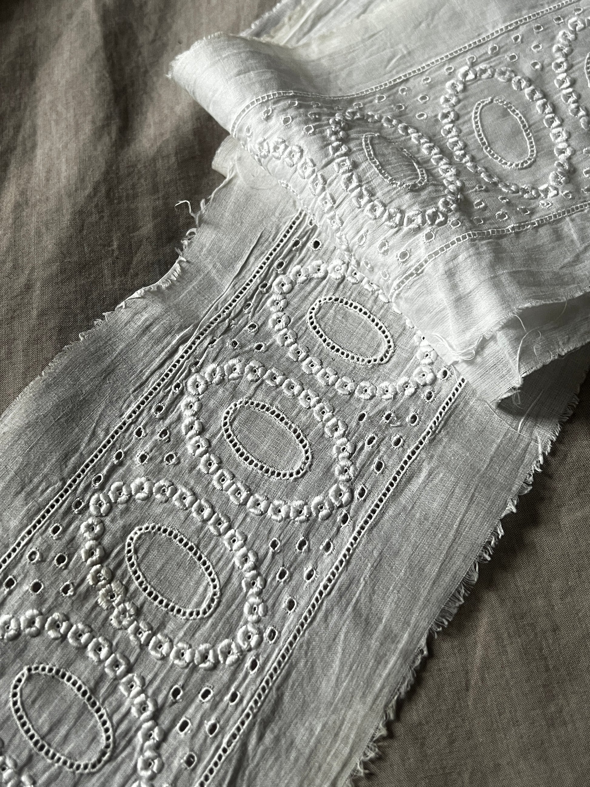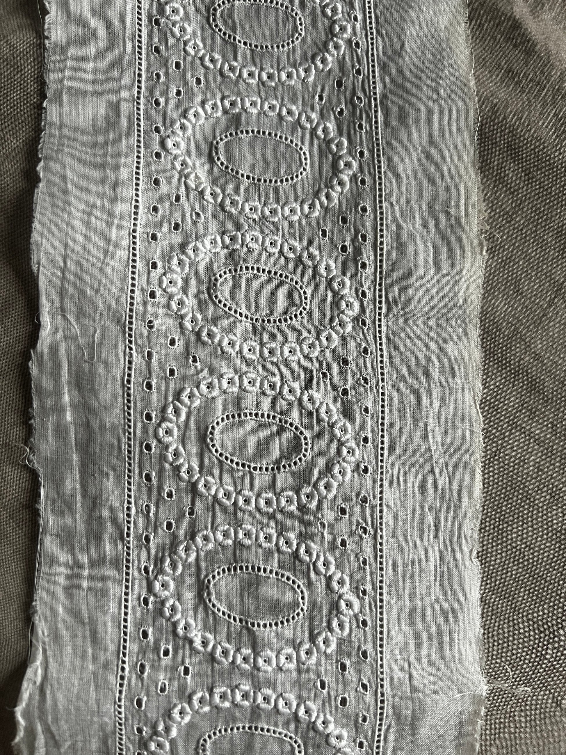 薄く軽やかなコットンローン地に白刺繍が施されたトリムです
