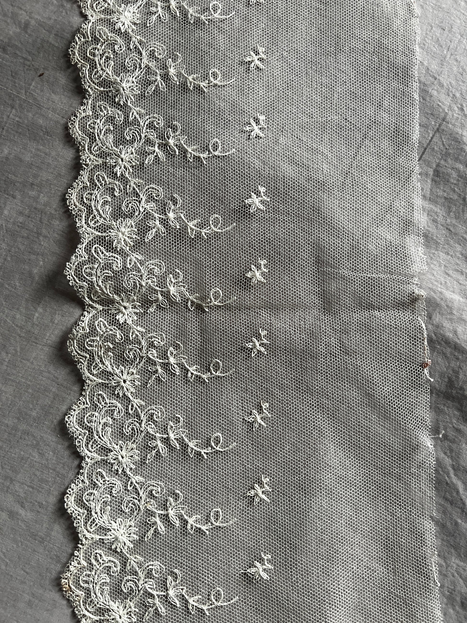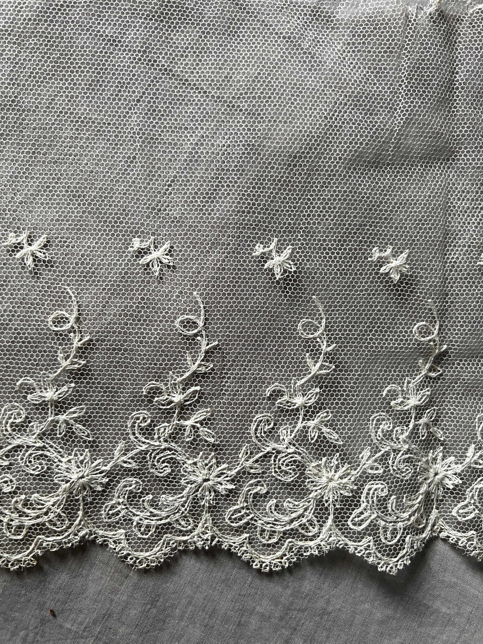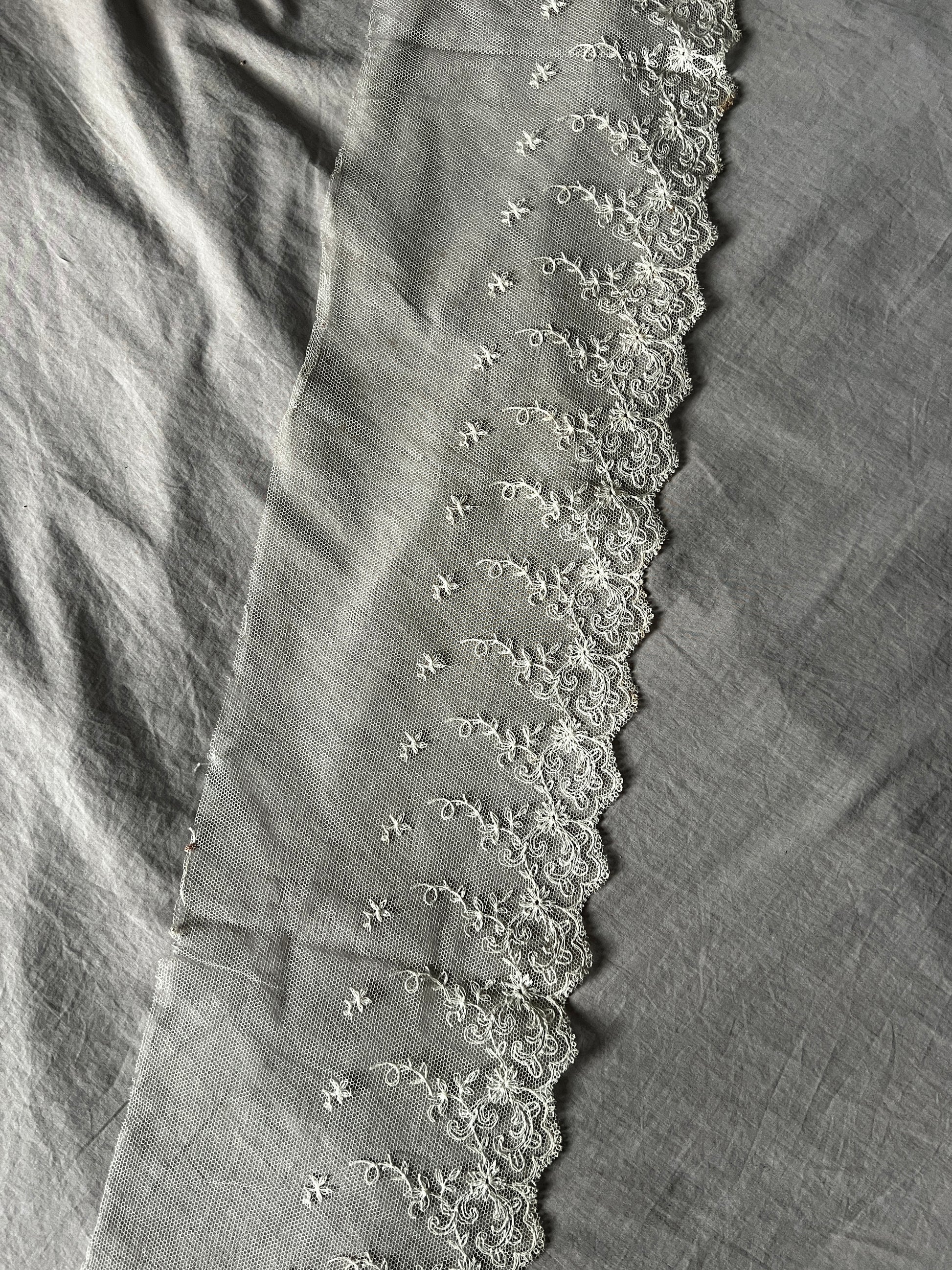 やや生成りがかった柔らかなチュールレースに、エレガントな花の刺繍モチーフが丁寧に施された上品な一品です
