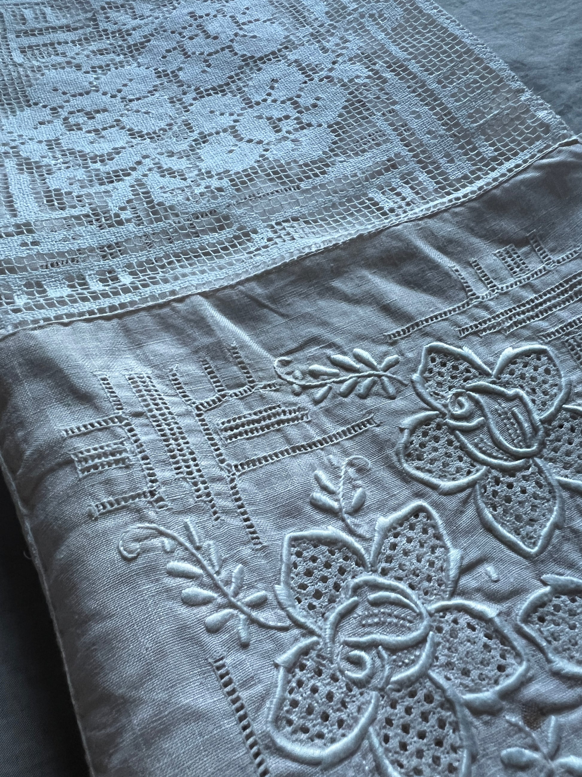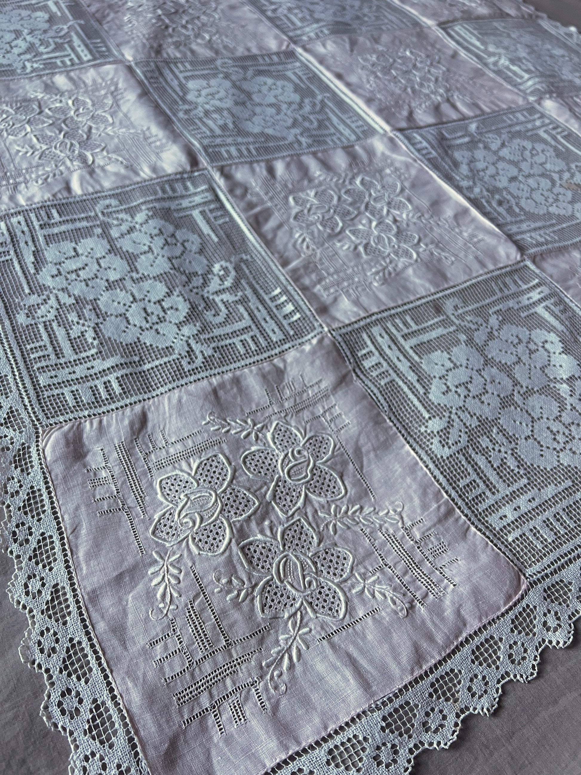 淡い桃色のクロス地に白糸の刺繍が丁寧に施されたパーツとフィレレースでデザインされた正方形のクロスです