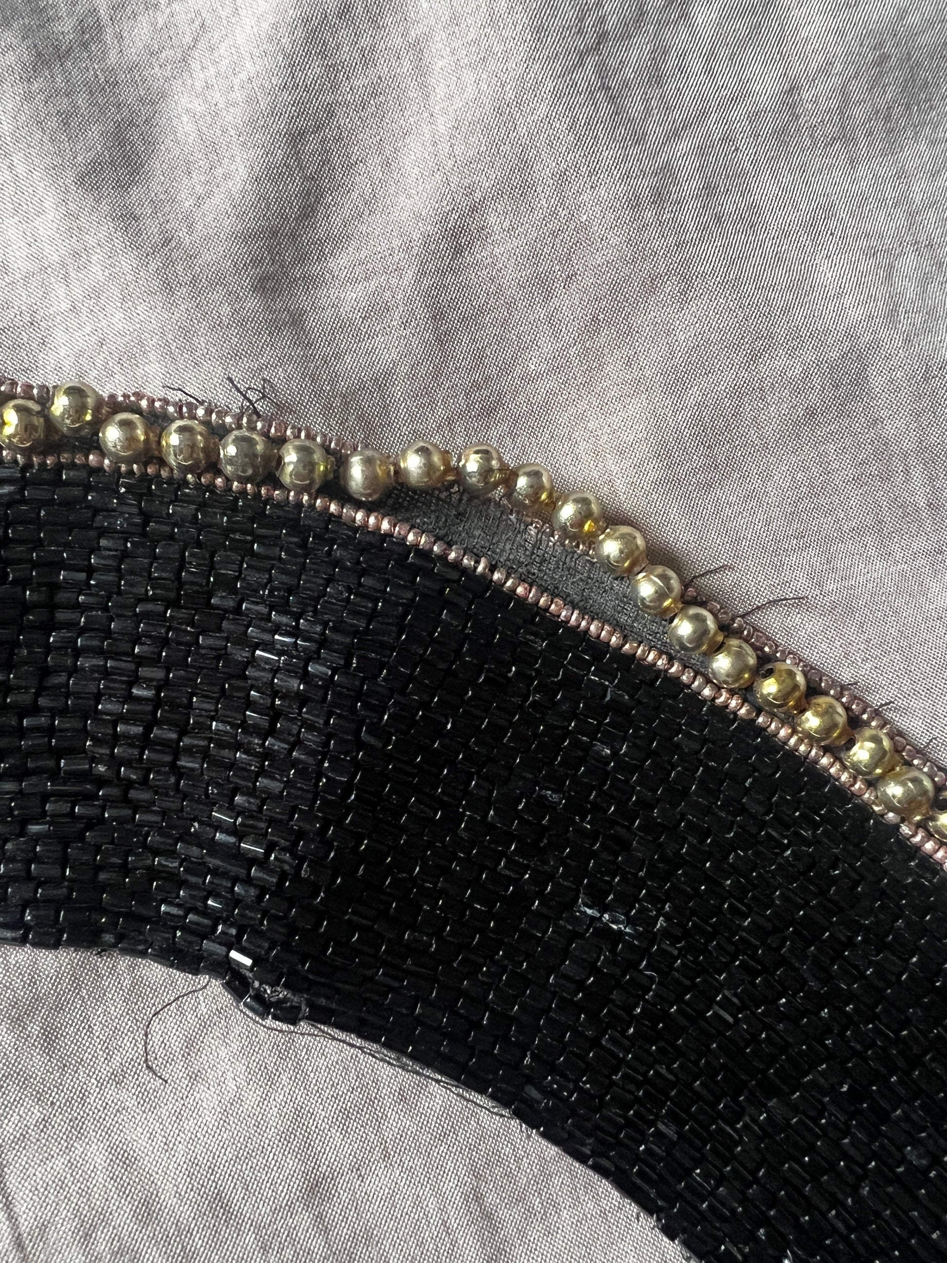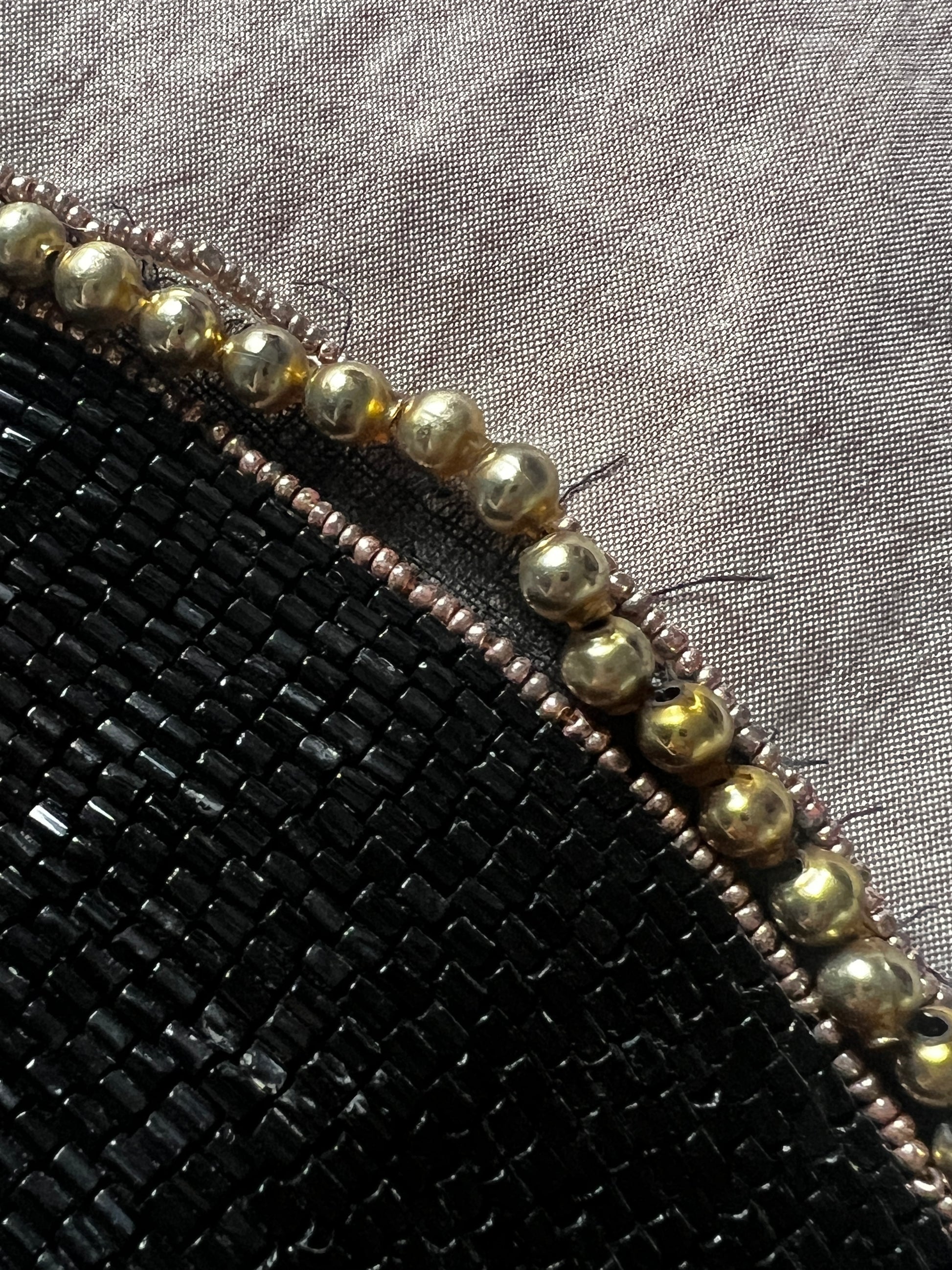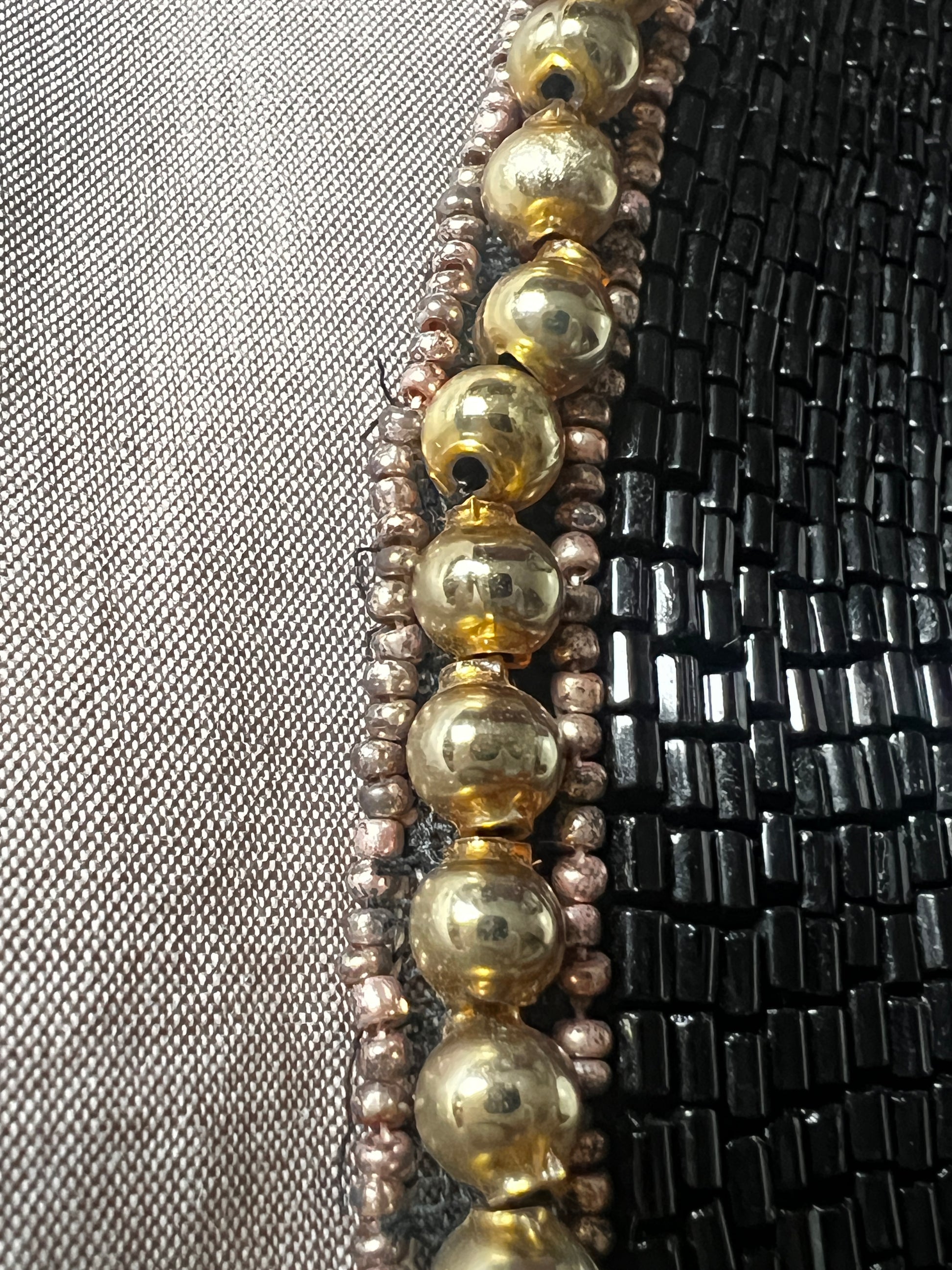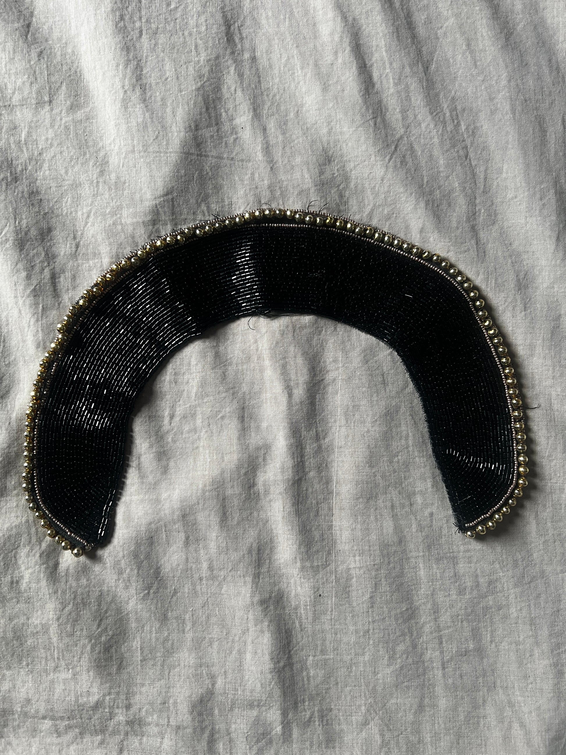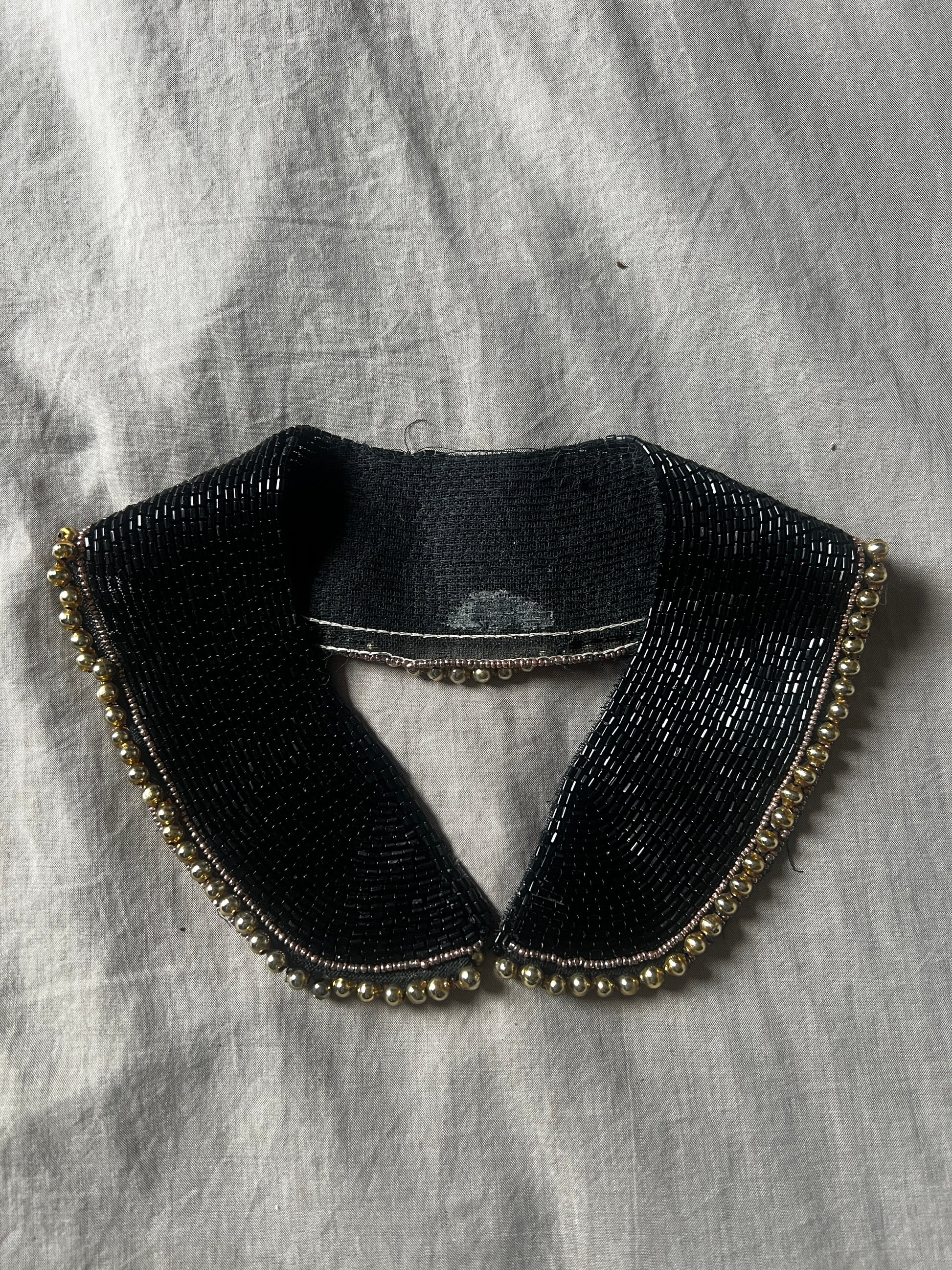黒ビーズとゴールドカラーのパーツ、そしてくすみトーンの極細ビーズを組み合わせてデザインされたビーズ飾り襟です