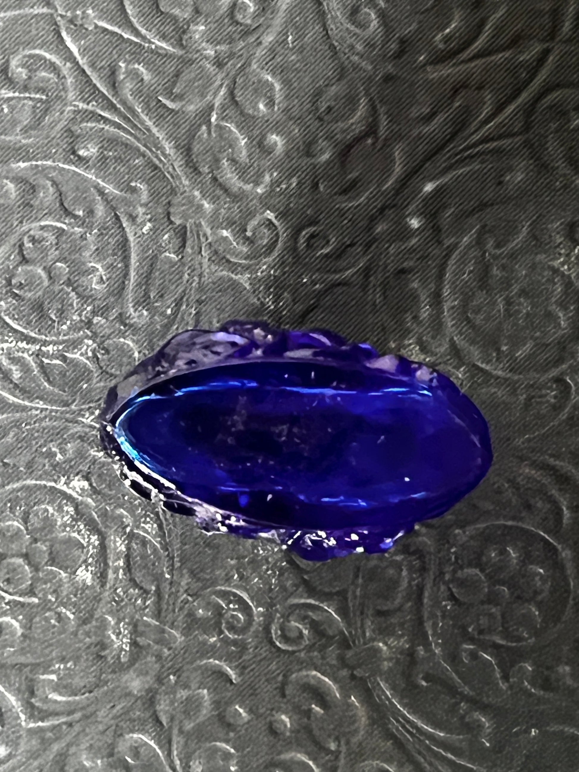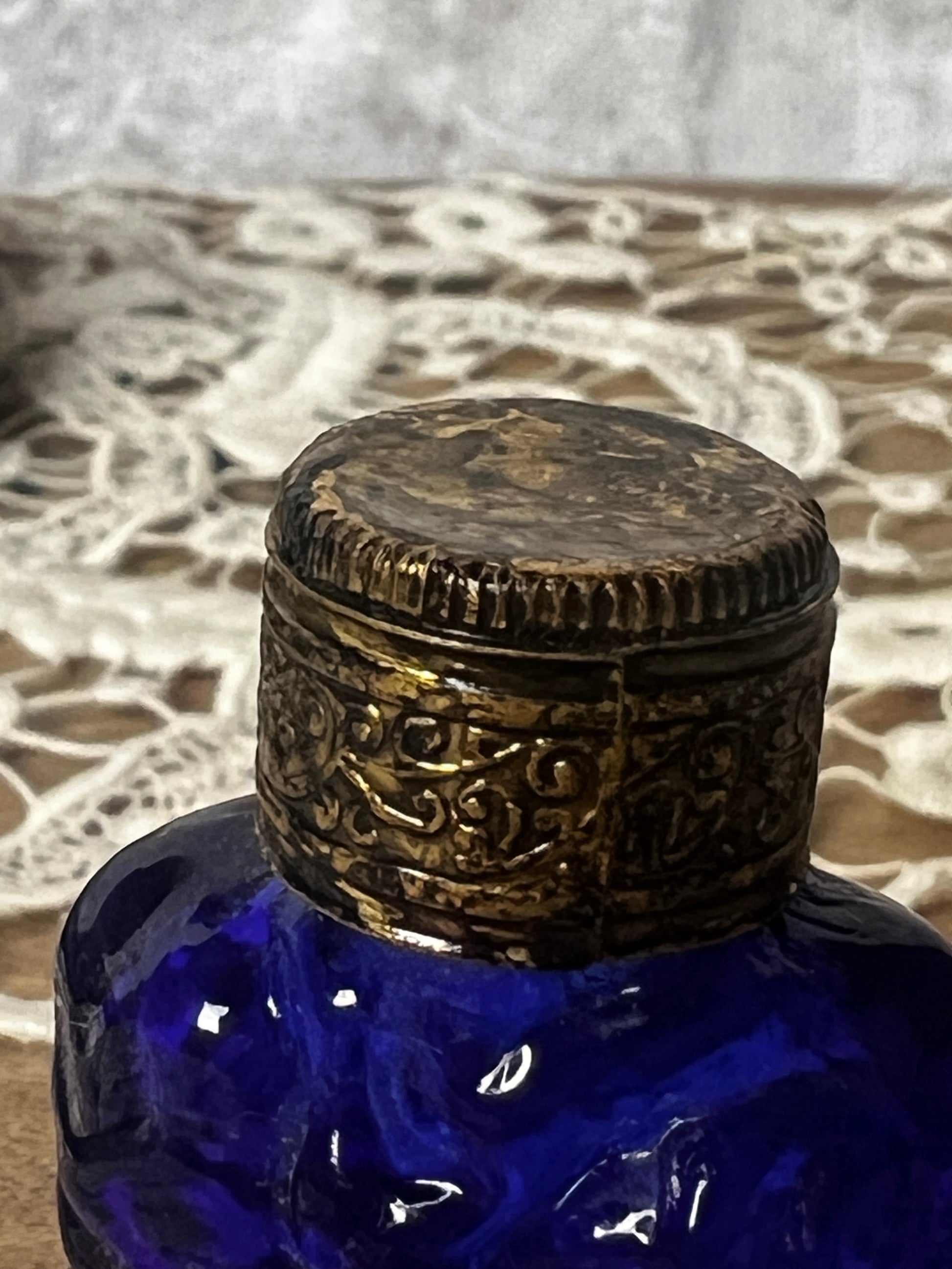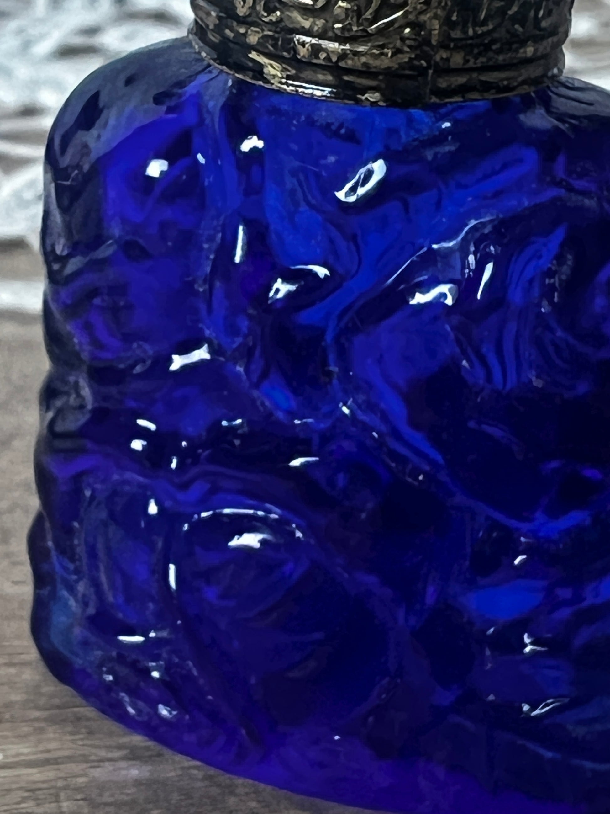 さわやかなブルーのガラスの表面全体に施された細工模様が美しく蓋の装飾も印象的
